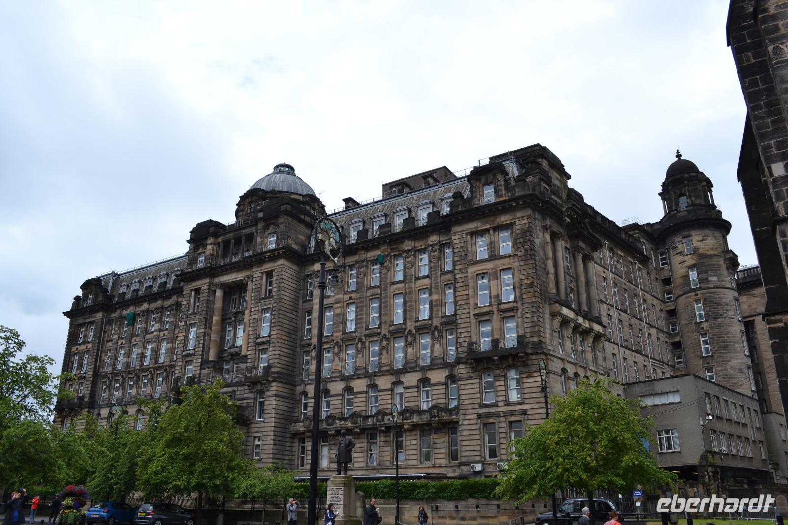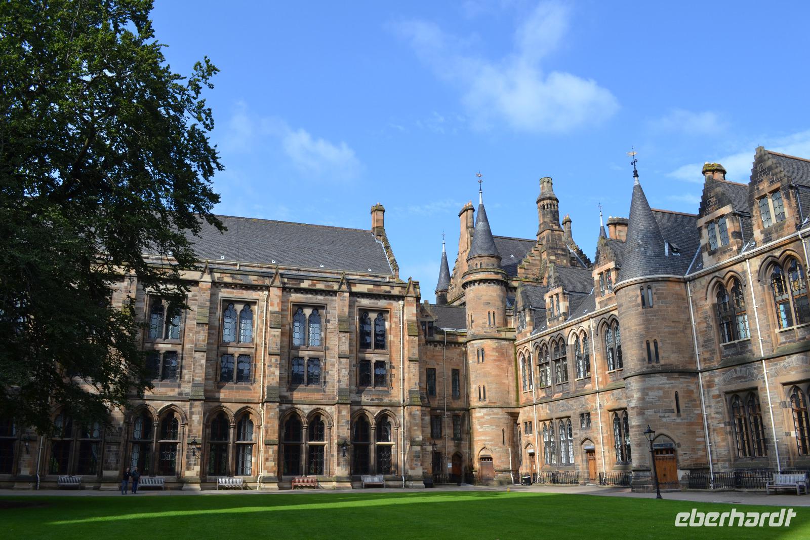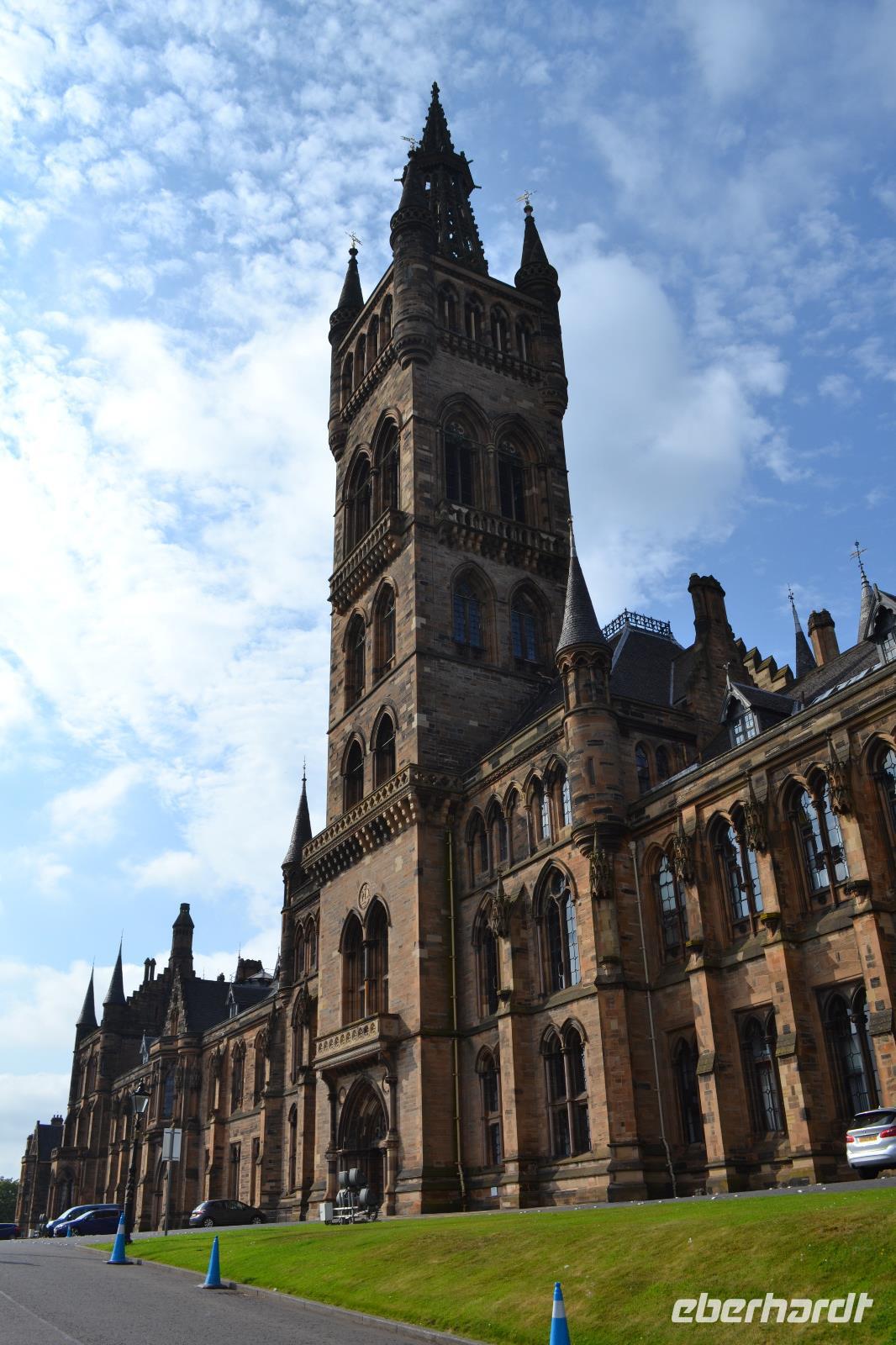 Unsere Rundreise beginnt und endet auf dem Flughafen von Glasgow, der größten schottischen Stadt. Schon seit einiger Zeit ist die Metropole am Clyde dabei, sich von einer armen Arbeiter- und Industriestadt zu einem Zentrum für Dienstleistungen und Kultur zu wandeln. 1990 konnte sie sogar den Titel als Kulturhauptstadt Europas ergattern und steht seitdem auch bei Touristen immer höher im Kurs. Neben Kunst- und Gemäldegalerien ziehen vor allem auch die kostenlosen (!) Museen jede Menge Besucher an. Am modernen Riverside Museum, entworfen von der Star-Architektin Zaha Hadid, in dem vor allem alte Fahrzeuge und Lokomotiven ausgestellt sind, machen wir einen ersten Fotostopp. In der mondänen Kelvingrove Art Gallery gewähre ich meinen Gästen einen längeren Aufenthalt, damit sie sich von der Anreise erfrischen, eine Kleinigkeit essen und natürlich die sehr vielfältigen und abwechslungsreichen Ausstellungsräume bewundern können. Wir kommen sogar genau zur rechten Zeit und werden mit einem kleinen Orgelkonzert begrüßt. Nach der Besichtigung des größten Glasgower Museums schlendern wir hinüber zur renommierten University of Glasgow, deren Hauptkomplex eher an ein Märchenschloss erinnert. Völlig untypisch für das schottische Wetter werden wir sogar von den warmen Strahlen der Abendsonne liebkost. Mit der viertältesten (und vielleicht knuffigsten) U-Bahn der Welt fahren wir zurück in die Innenstadt, wo wir durch die Fußgängerzone bis zum Rathaus (den City Chambers) am George Square bummeln, hinter dem sich unser Hotel befindet.