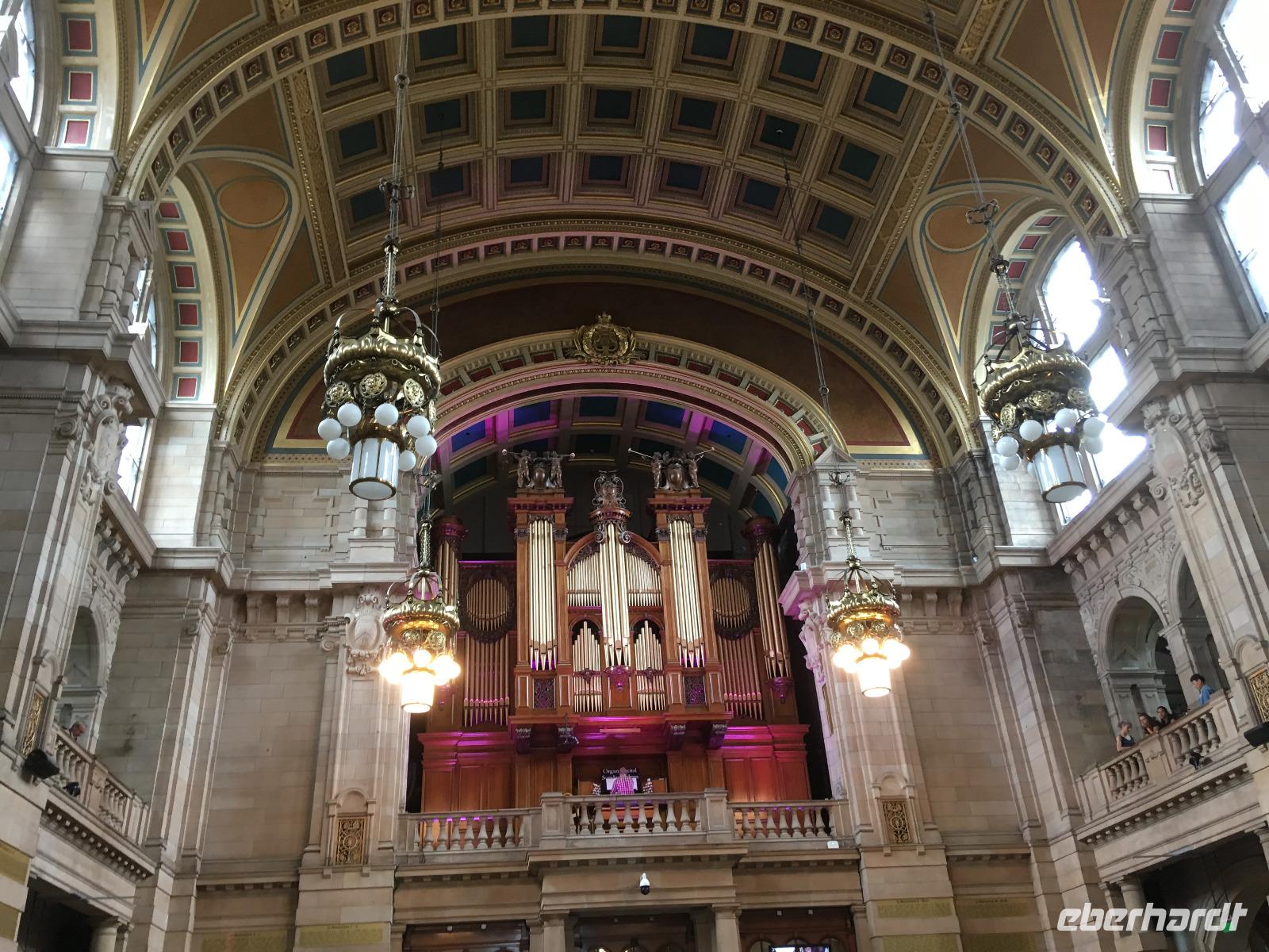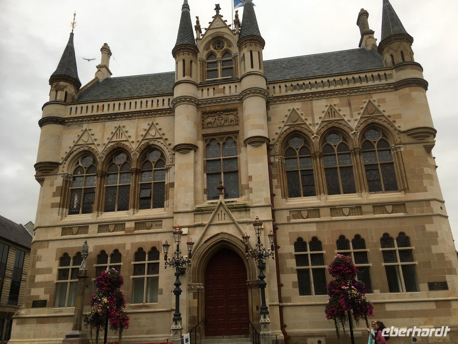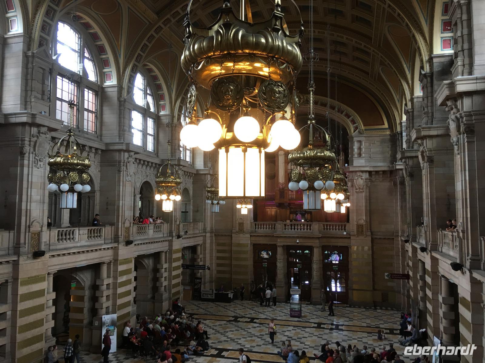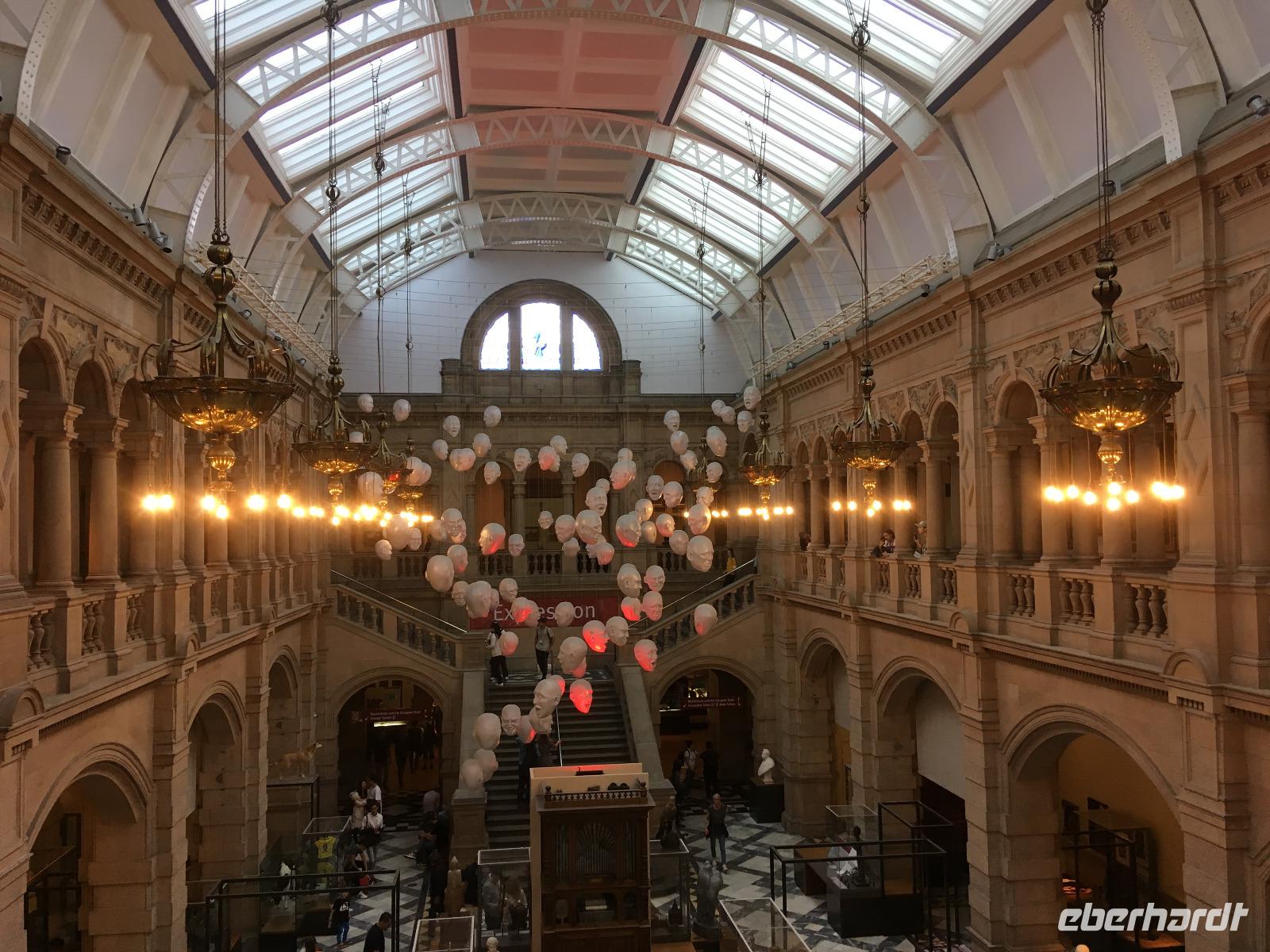 Unsere Rundreise beginnt und endet auf dem Flughafen von Glasgow, der größten schottischen Stadt. Schon seit einiger Zeit ist die Metropole am Clyde dabei, sich von einer armen Arbeiter- und Industriestadt zu einem Zentrum für Dienstleistungen und Kultur zu wandeln. 1990 konnte sie sogar den Titel als Kulturhauptstadt Europas ergattern und steht seitdem auch bei Touristen immer höher im Kurs. Neben Kunst- und Gemäldegalerien ziehen vor allem auch die kostenlosen (!) Museen jede Menge Besucher an. Am modernen Riverside Museum, entworfen von der Star-Architektin Zaha Hadid, in dem vor allem alte Fahrzeuge und Lokomotiven ausgestellt sind, machen wir einen ersten Fotostopp. In der mondänen Kelvingrove Art Gallery gewähre ich meinen Gästen einen längeren Aufenthalt, damit sie sich von der Anreise erfrischen, eine Kleinigkeit essen und natürlich die sehr vielfältigen und abwechslungsreichen Ausstellungsräume bewundern können. Wir kommen sogar genau zur rechten Zeit und werden mit einem kleinen Orgelkonzert begrüßt. Nach der Besichtigung des größten Glasgower Museums schlendern wir hinüber zur renommierten University of Glasgow, deren Hauptkomplex eher an ein Märchenschloss erinnert. Völlig untypisch für das schottische Wetter werden wir sogar von den warmen Strahlen der Abendsonne liebkost. Mit der viertältesten (und vielleicht knuffigsten) U-Bahn der Welt fahren wir zurück in die Innenstadt, wo wir durch die Fußgängerzone bis zum Rathaus (den City Chambers) am George Square bummeln, hinter dem sich unser Hotel befindet.