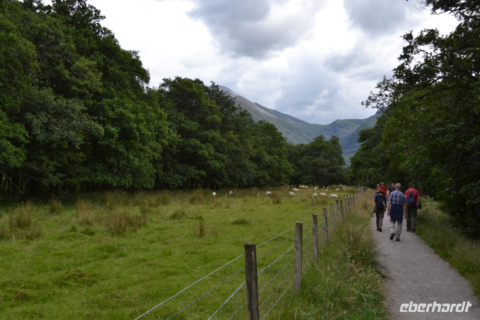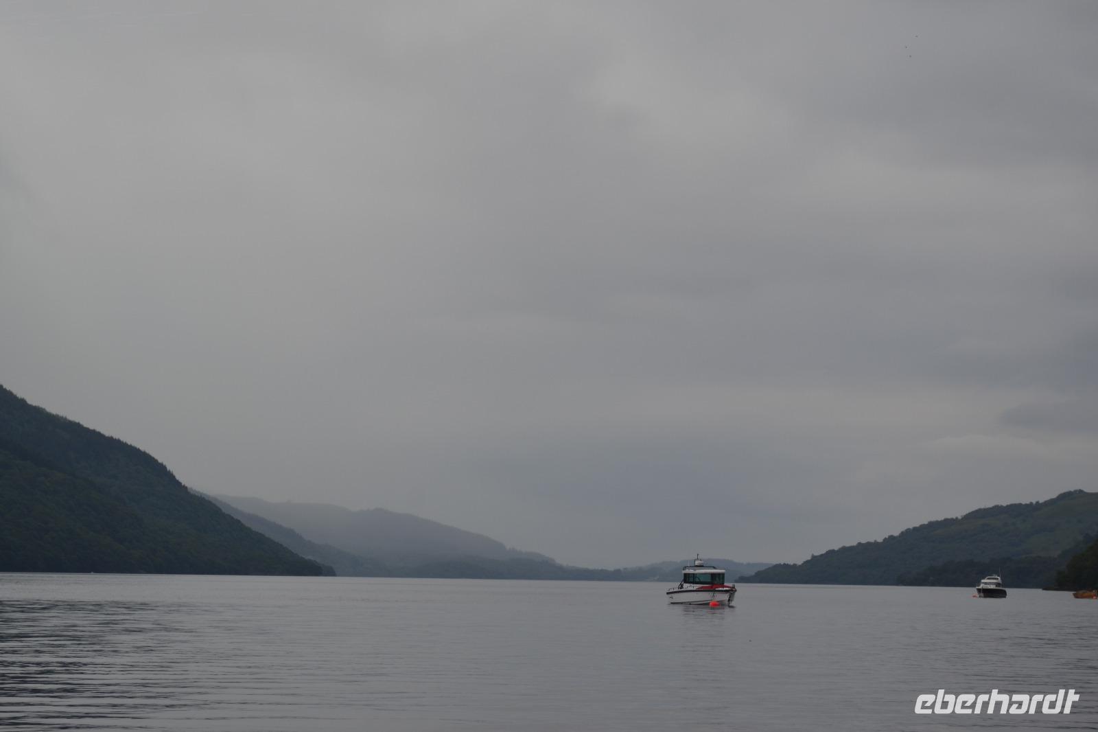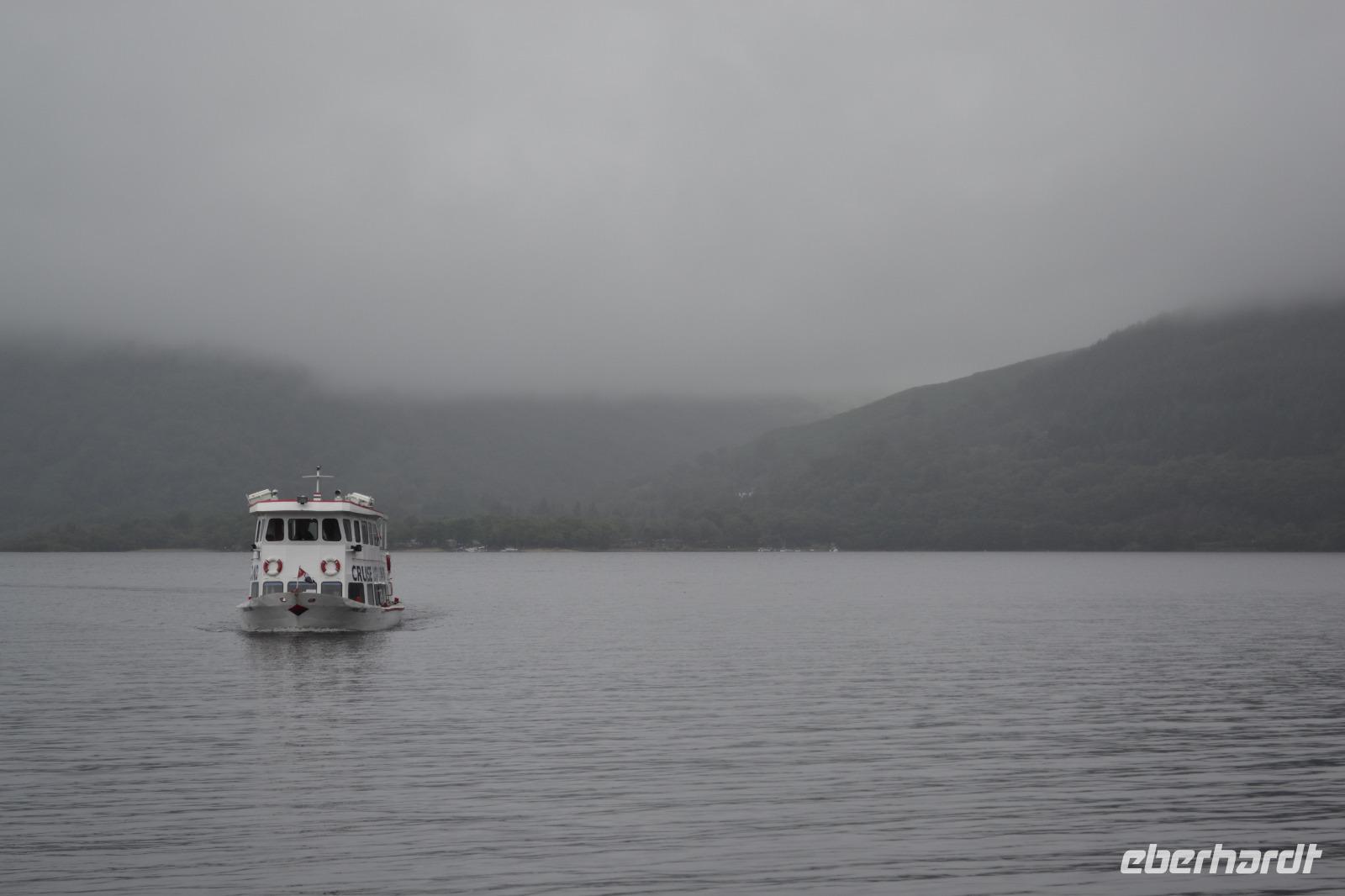 Vielleicht dämmert es meinen Gästen heute, dass sie sich auf eine echte Abenteuerreise eingelassen haben. Zumindest wird ihre Konstitution einem ersten Belastungstest unterzogen, denn die 12 Kilometer lange Wanderung auf dem West Highland Way, dem beliebtesten Fernwanderweg Schottlands, ist durchaus anspruchsvoll. Zeit haben wir aber genug für die Strecke, nachdem uns die Fähre am Inversnaid Hotel am Ostufer des Loch Lomond abgesetzt hat. Doch wir müssen auch vorsichtig sein, denn wir befinden uns in den Landen des Clans MacGregor, dessen berühmtester Vertreter, Rob Roy, ein berüchtigter Viehdieb und Gesetzloser war. Räuber lassen sich aber nicht blicken, während wir auf dem Weg in südlicher Richtung laufen, nur andere Wanderer, die freundlich grüßen und sich fast ausschließlich ebenfalls als Germanen entpuppen. In einer verlassenen Schutzhütte legen wir unsere Mittagspause ein und blättern neugierig im Gästebuch. Zwischendurch werden wir immer mal wieder von einem leichten Regen heimgesucht, aber nie wirklich nass. Die meiste Zeit über verläuft der Weg parallel zum Seeufer, streift mehrere kleine Wasserfälle, entführt uns gelegentlich in den Wald, nur um uns dann wieder neue Perspektiven auf den Loch Lomond und die umliegenden Hügel und Berge zu eröffnen. Wir liegen gut in der Zeit, als wir am Nachmittag die Jugendherberge in Rowardennan erreichen, von der wir später mit der Fähre wieder abgeholt werden. So können wir uns einen Abstecher in den örtlichen Pub gönnen, wo wir uns mit einem Kaffee, Bier oder Eis belohnen, und vor dem nun doch heftiger werdenen Regen in Sicherheit sind. Bei einer Tasse Kakao tuckern wir dann gemütlich über den flächenmäßig größten Süßwassersee Schottlands, der besonders im Süden mit vielen kleinen malerischen Inseln gesprenkelt ist. In Tarbet erwartet uns unser Fahrer Jim mit seinem blitzblank geputzten silbergrauen Bus und fährt uns sicher zurück nach Glasgow.