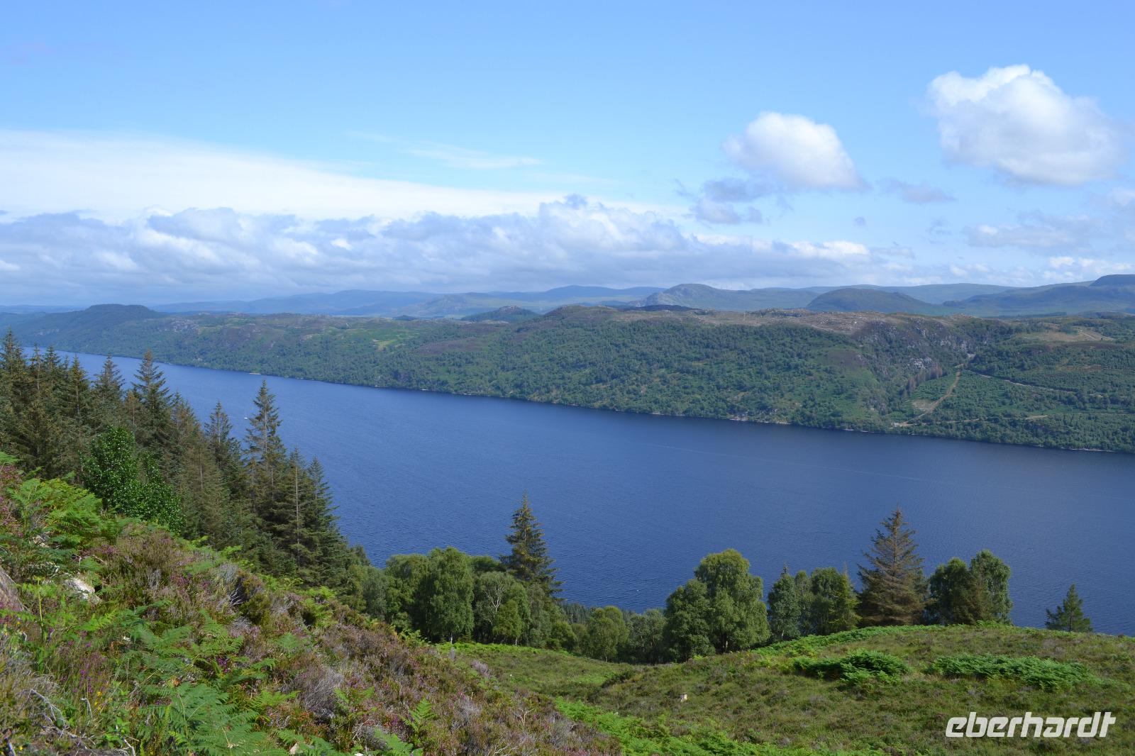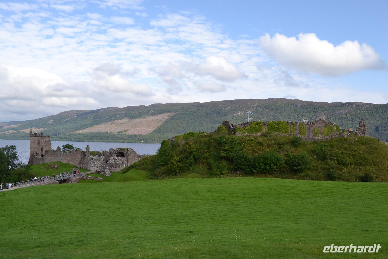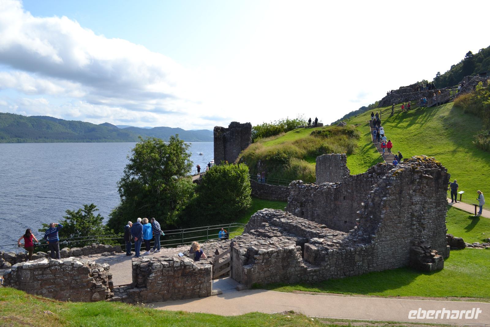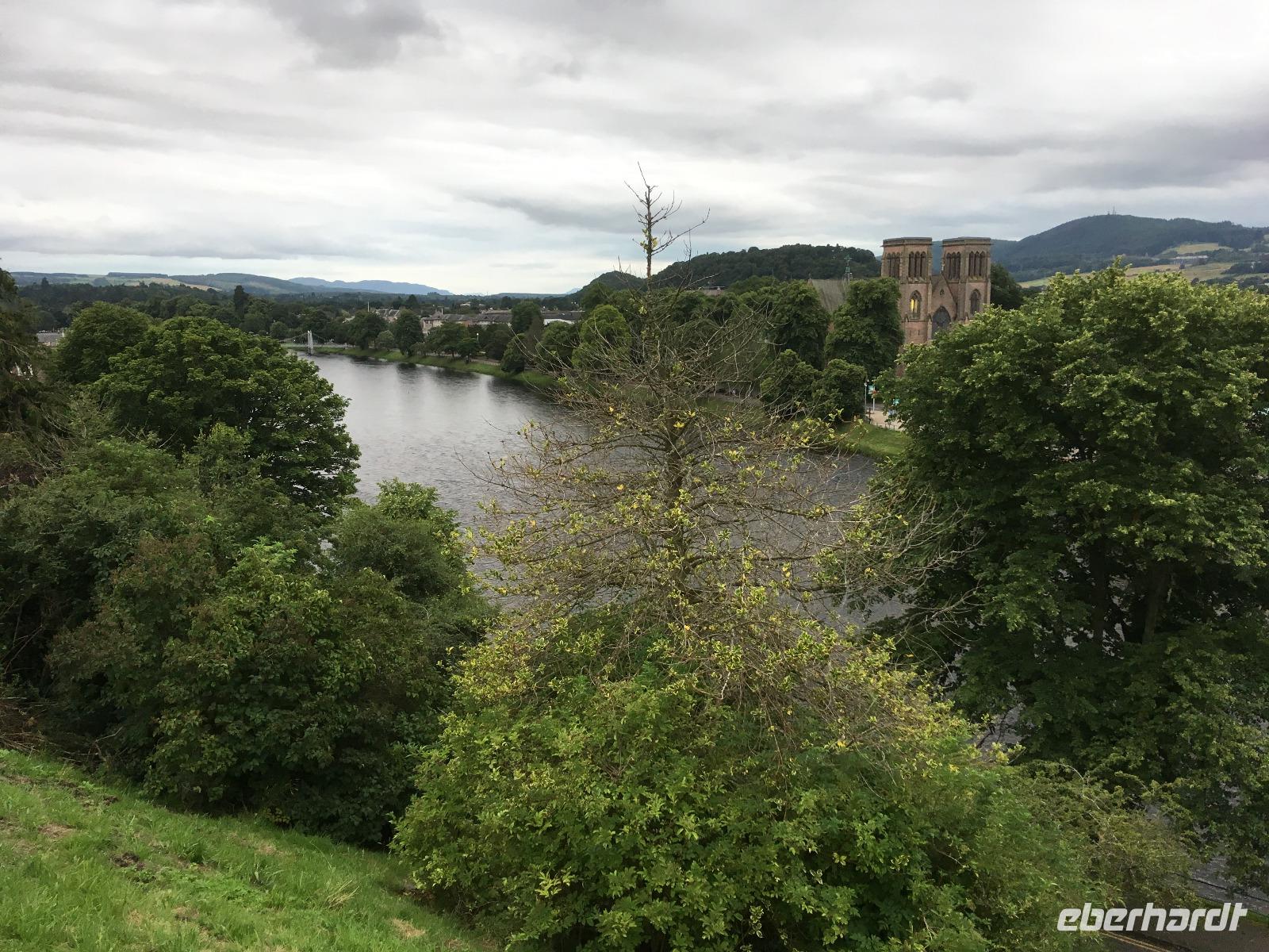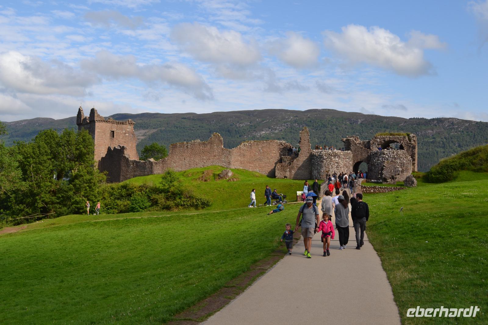 Auf unserer Reise nähern wir uns heute immer mehr der Hauptstadt der Highlands, Inverness. Theoretisch könnten wir auch das Boot nehmen, um den Great Glen zu durchqueren, denn Fort William und Inverness sind seit 1822 durch den Caledonian Canal verbunden. Den Beginn des Kanals markiert die Schleusentreppe Neptune's Staircase mit acht Schleusen. Bei einem Fotostopp beobachten wir, wie eine Familie mit Kind und Hund ihr kleines Segelboot nach und nach durch die einzelnen Kammern schleust. Der ganze Prozess dauert 90 Minuten. So viel Zeit haben wir dann aber doch nicht eingeplant, denn wir wollen lieber wieder wandern und die tolle Landschaft genießen! Die Gelegenheit dafür bietet sich uns auf der Wanderung von Fort Augustus bis nach Invermoriston auf einem Teilabschnitt des Great Glen Way. Nachdem wir uns im hübschen kleinen Örtchen am Westende des Loch Ness, in dessen Mitte sich ebenfalls eine Schleusentreppe befindet, etwas umgesehen und die nötigen Besorgungen erledigt haben, brechen wir auf und entscheiden uns dann am Abzweig nach einer kurzen Beratung für den oberen Weg, der zwar dank des Aufstiegs etwas beschwerlicher ist, uns aber dafür mit einer traumhaften Aussicht über Fort Augustus, den Great Glen und den gesamten Loch Ness entschädigt. Das Wetter spielt auch mit; sogar die Sonnencreme muss heute zum Einsatz kommen! Paul und Bus warten in Invermoriston auf uns und ganz geschwind geht es dann weiter zum Urquhart Castle. Nachdem sich der Vorhang nach der einleitenden Videopräsentation geöffnet hat, dürfen wir die Ruine der einst stolzen Burg erkunden und am Ufer des Loch Ness nach Nessie Ausschau halten. Doch das scheue Monster lässt sich leider nicht blicken. Wäre ja auch zu schön gewesen. Bis nach Inverness sind es nun nur noch 40 Minuten mit dem Bus. Nach dem Abendessen im Royal Highland Hotel (dessen majestätische Lobby sehr beeindruckend ist) biete ich meinen Gästen noch einen Abendspaziergang zum Inverness Castle und entlang des River Ness an. Auf dem Rückweg stolpern wir sogar über eine Veranstaltung mit Livemusik und Tanz vor dem Theater, bei der wir eine Weile zuschauen, bevor wir dann doch erschöpft aber glücklich in unsere Hotelbetten fallen.