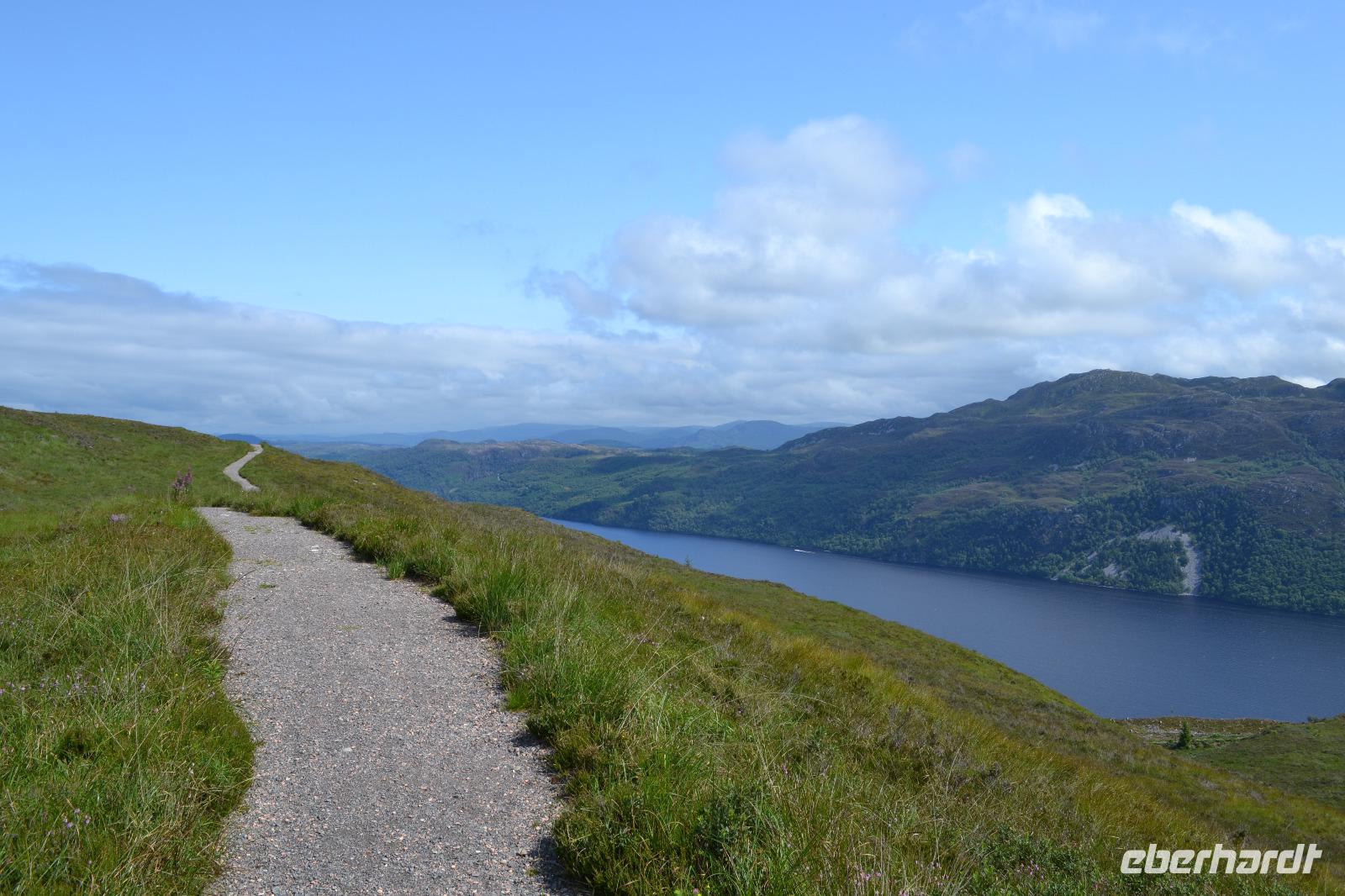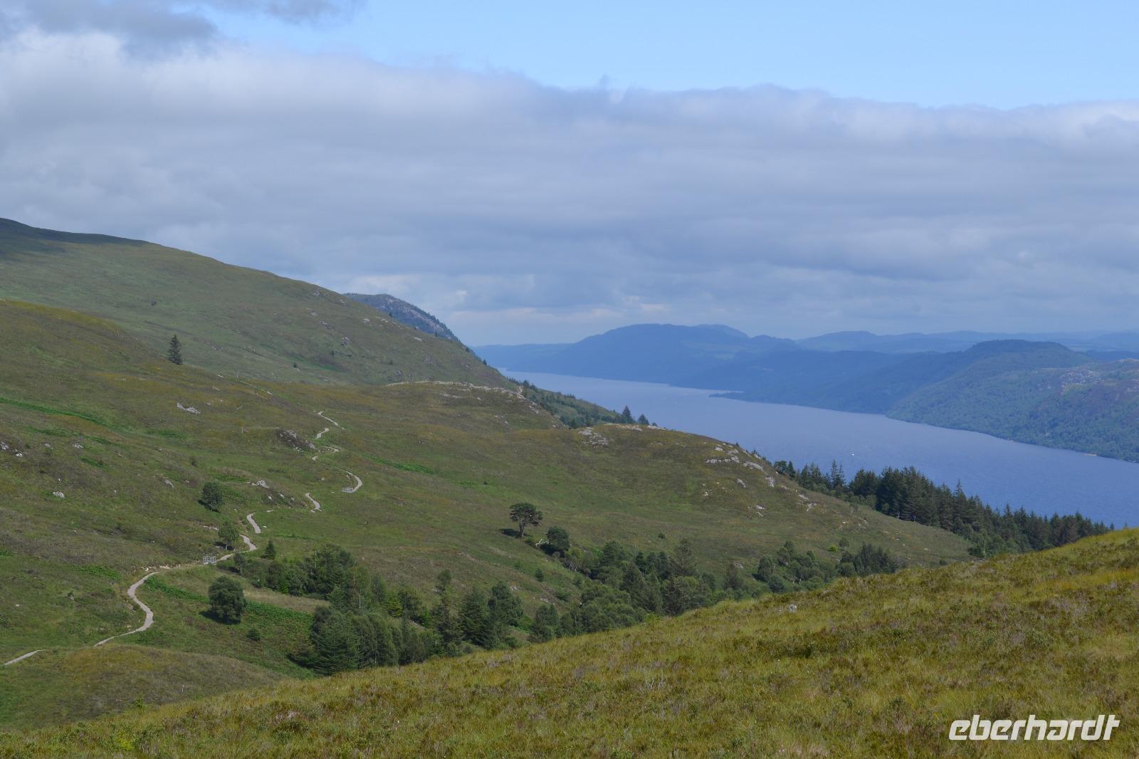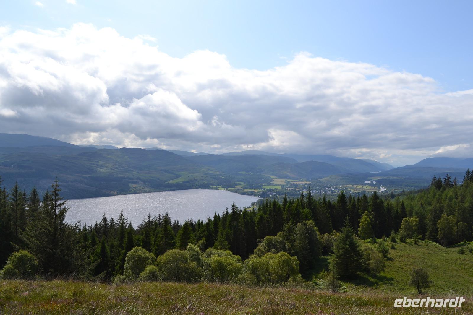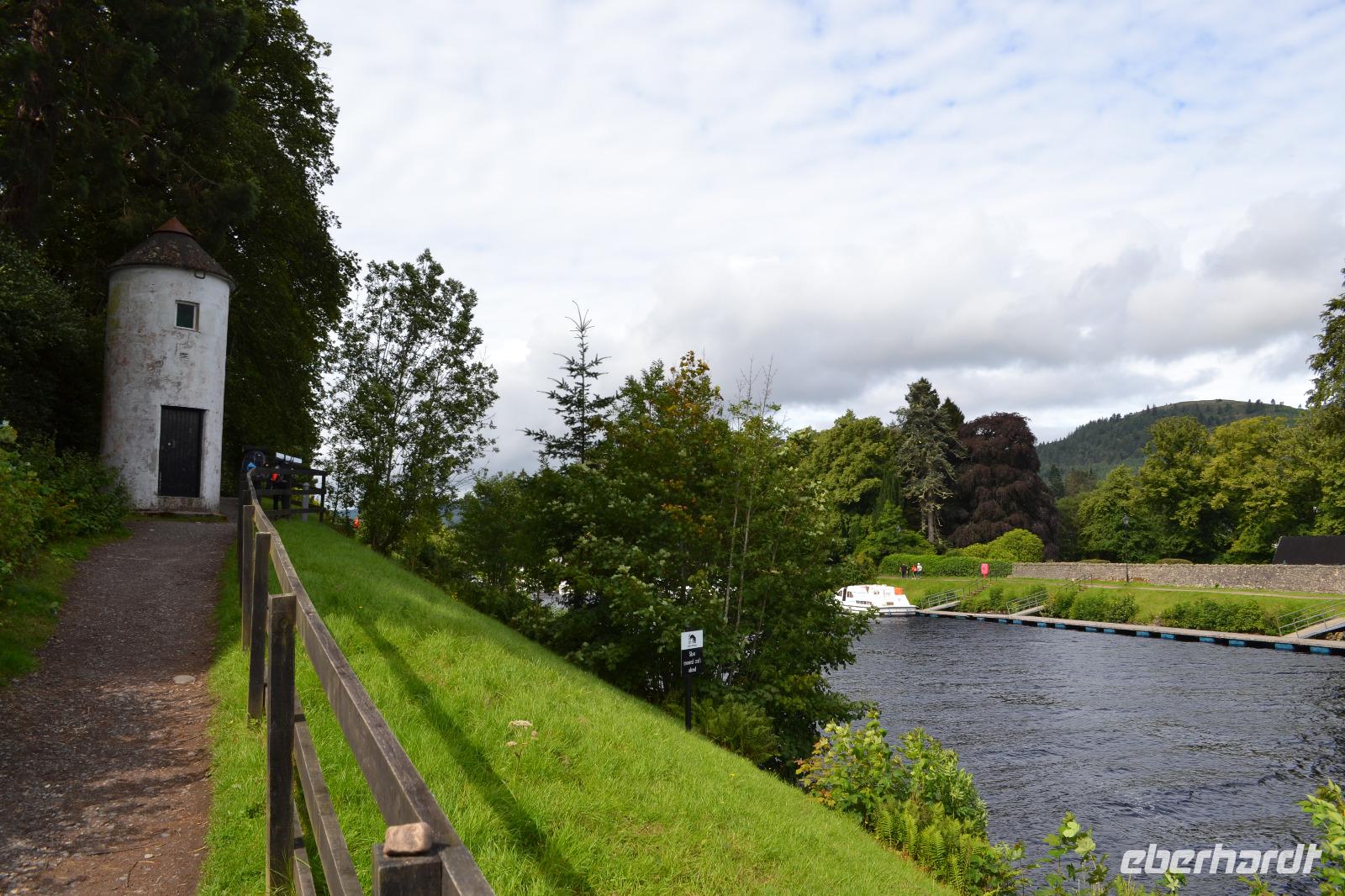 Auf unserer Reise nähern wir uns heute immer mehr der Hauptstadt der Highlands, Inverness. Theoretisch könnten wir auch das Boot nehmen, um den Great Glen zu durchqueren, denn Fort William und Inverness sind seit 1822 durch den Caledonian Canal verbunden. Den Beginn des Kanals markiert die Schleusentreppe Neptune's Staircase mit acht Schleusen. Bei einem Fotostopp beobachten wir, wie eine Familie mit Kind und Hund ihr kleines Segelboot nach und nach durch die einzelnen Kammern schleust. Der ganze Prozess dauert 90 Minuten. So viel Zeit haben wir dann aber doch nicht eingeplant, denn wir wollen lieber wieder wandern und die tolle Landschaft genießen! Die Gelegenheit dafür bietet sich uns auf der Wanderung von Fort Augustus bis nach Invermoriston auf einem Teilabschnitt des Great Glen Way. Nachdem wir uns im hübschen kleinen Örtchen am Westende des Loch Ness, in dessen Mitte sich ebenfalls eine Schleusentreppe befindet, etwas umgesehen und die nötigen Besorgungen erledigt haben, brechen wir auf und entscheiden uns dann am Abzweig nach einer kurzen Beratung für den oberen Weg, der zwar dank des Aufstiegs etwas beschwerlicher ist, uns aber dafür mit einer traumhaften Aussicht über Fort Augustus, den Great Glen und den gesamten Loch Ness entschädigt. Das Wetter spielt auch mit; sogar die Sonnencreme muss heute zum Einsatz kommen! Paul und Bus warten in Invermoriston auf uns und ganz geschwind geht es dann weiter zum Urquhart Castle. Nachdem sich der Vorhang nach der einleitenden Videopräsentation geöffnet hat, dürfen wir die Ruine der einst stolzen Burg erkunden und am Ufer des Loch Ness nach Nessie Ausschau halten. Doch das scheue Monster lässt sich leider nicht blicken. Wäre ja auch zu schön gewesen. Bis nach Inverness sind es nun nur noch 40 Minuten mit dem Bus. Nach dem Abendessen im Royal Highland Hotel (dessen majestätische Lobby sehr beeindruckend ist) biete ich meinen Gästen noch einen Abendspaziergang zum Inverness Castle und entlang des River Ness an. Auf dem Rückweg stolpern wir sogar über eine Veranstaltung mit Livemusik und Tanz vor dem Theater, bei der wir eine Weile zuschauen, bevor wir dann doch erschöpft aber glücklich in unsere Hotelbetten fallen.