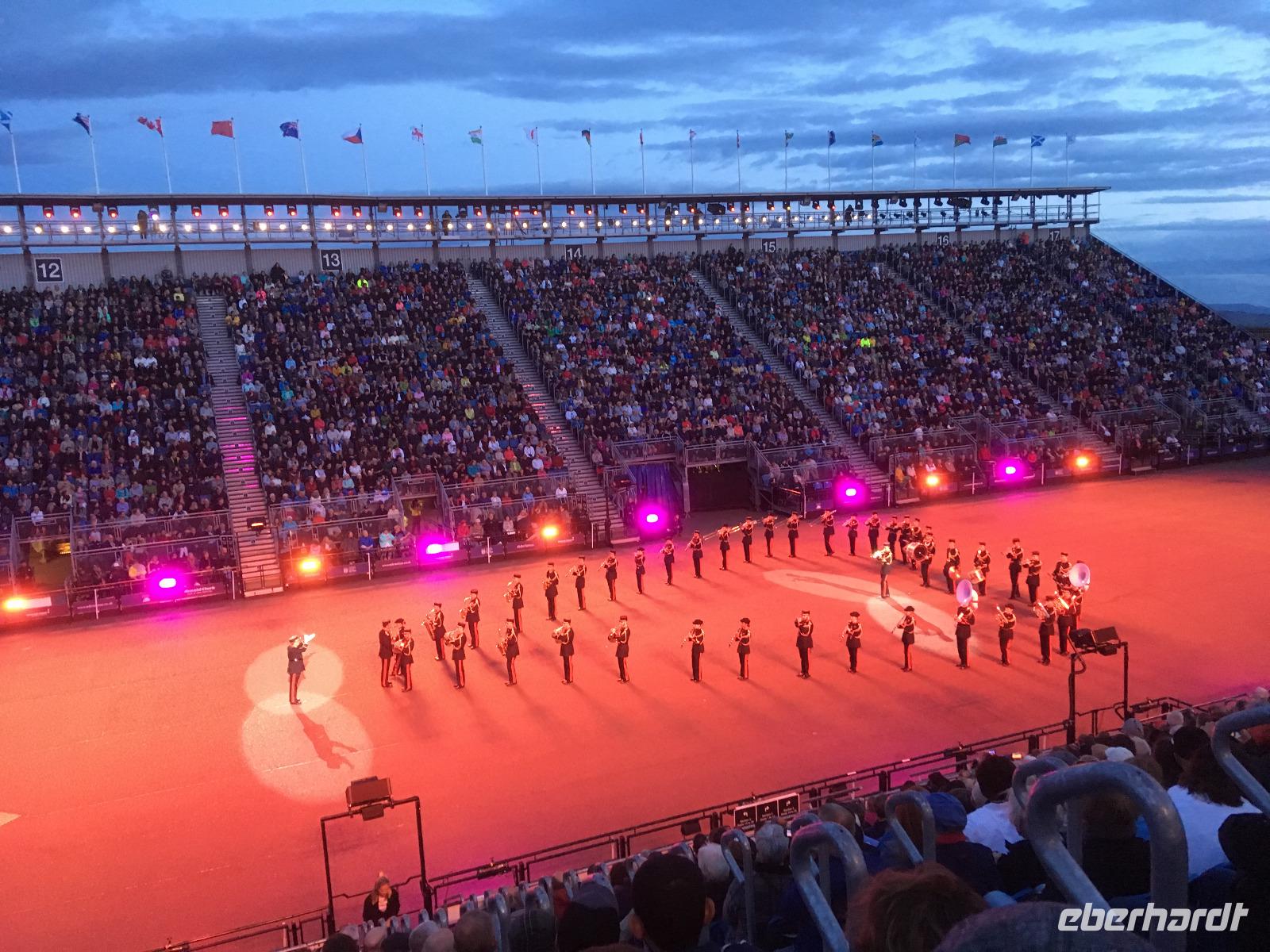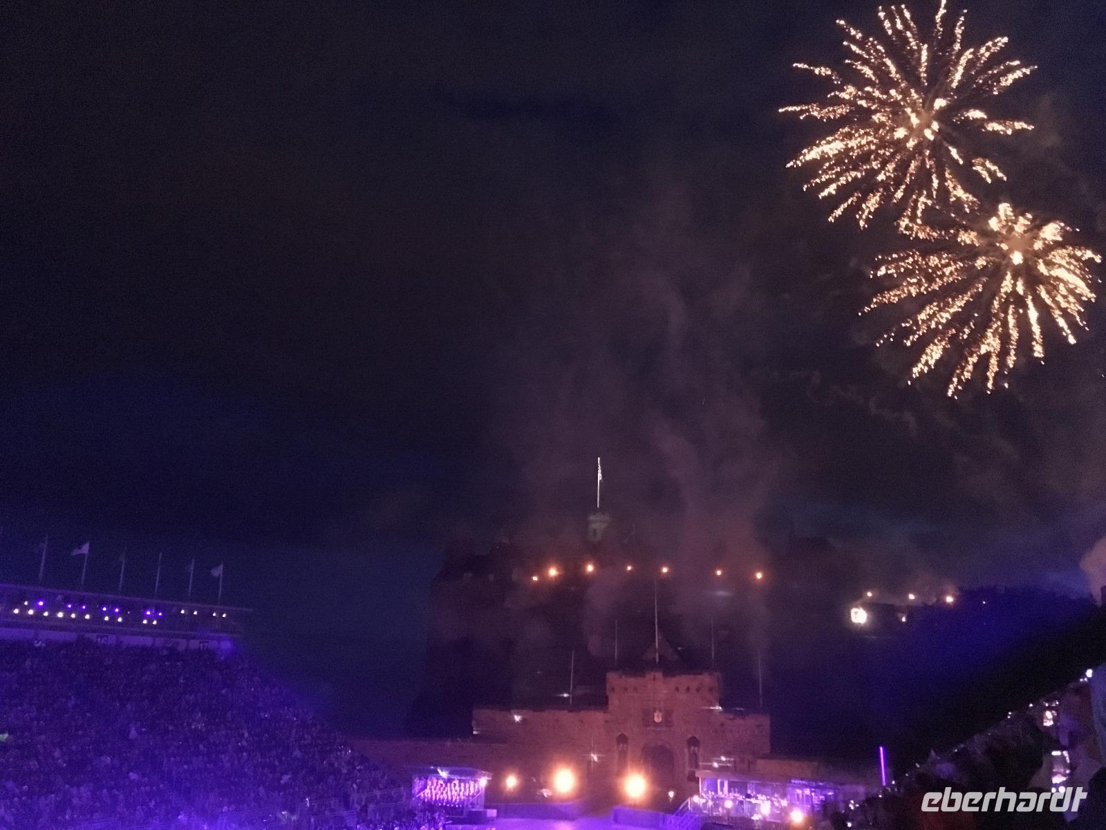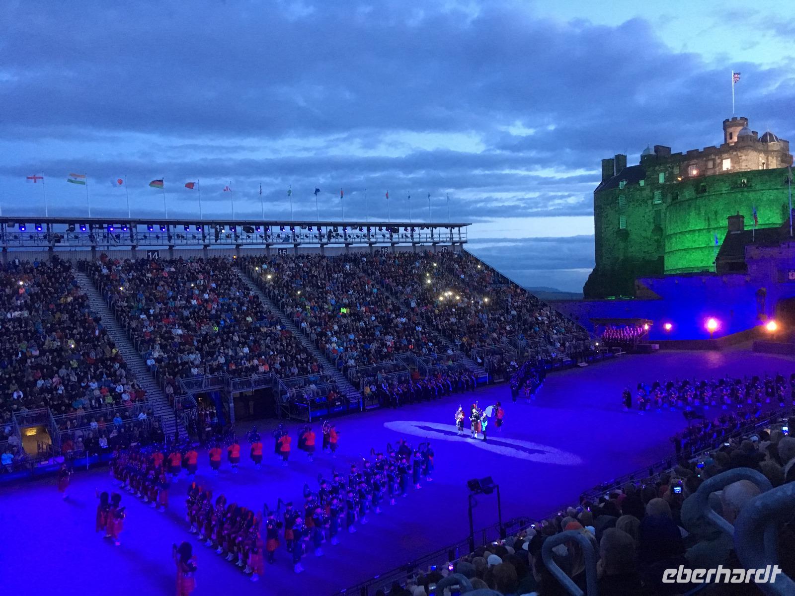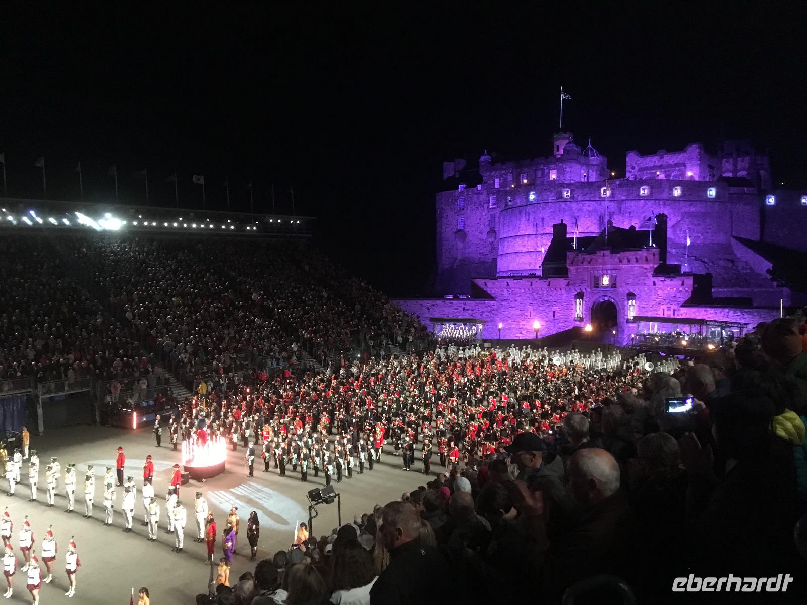 Zwischen Inverness und Edinburgh liegt der Cairngorms National Park, der zweite Nationalpark Schottlands. Auch ihm statten wir einen Besuch ab und absolvieren eine Wanderung. Sie führt uns um den malerisch gelegenen Loch Morlich herum und eröffnet uns verschiedene Perspektiven auf die umliegenden Hügel und Berge. Nicht weit von hier liegt eines der beliebtesten Skigebiete und die gesamte Gegend ist sehr beliebt bei Familien, Sportbegeisterten und Outdoorfans. Am Nachmittag folgt gleich die zweite Wanderung - zu den von Robert Burns besungenen Birks of Aberfeldy. Die berühmten Birken befinden sich in einer tiefen Schlucht, und wir müssen auf der einen Seite hinauf und auf der anderen Seite, nach der Überquerung eines Wasserfalls, wieder herunter. Nachdem wir uns gleich zu Beginn der Wanderung noch über eine schottische Familie amüsiert haben, die im eiskalten Wasser des Baches badeten, und neben einer Statue des Dichters höchstselbst sitzend den Anblick genossen haben, werden wir auf dem Rückweg zur Strafe selbst von einem plötzlich einsetzenden Wolkenbruch bis auf die Haut durchnässt. Da müssen wir uns in Aberfeldy erstmal bei einem Kaffee, Tee oder Bier im Pub aufwärmen bzw. notdürftig die Klamotten trocknen, bevor wir zurück in den Bus steigen. Im hübschen Städtchen Dunkeld am River Tay statten wir nun der Kathedrale einen Besuch ab, in der ab dem 9. Jahrhundert die sterblichen Überreste des Missionars Columban von Iona aufbewahrt wurden. Der erste schottische König Kenneth MacAlpin machte Dunkeld damit zum religiösen Zentrum seines Reiches. Auf dem Weg nach Edinburgh müssen wir nun aufgrund eines schweren Verkehrsunfalls auf der A9 eine Umleitung fahren und kommen dadurch vielleicht 30 Minuten später im Hotel an als geplant. Kurz vor Erreichen der schottischen Hauptstadt überqueren wir den Firth of Forth auf einer von drei beeindruckend großen Brücken. Rechts von uns sehen wir auch die berühmte Forth Bridge, die erste vollständig aus Stahl gefertigte Brücke der Welt. Vor dem Hotel angekommen müssen wir uns von unserem Fahrer Paul verabschieden, der sein Pensum an Tagen erreicht hat, uns aber trotz einiger dialektbedingter Verständigungsschwierigkeiten dank seiner freundlichen Art sehr ans Herz gewachsen ist. Nach dem Abendessen gehen dann fast alle Gäste mit mir zum Royal Edinburgh Military Tattoo. Wir erleben eine faszinierende Darbietung von Militärmusikkapellen aus aller Welt, die in einem großen Finale mündet, bei dem hunderte Dudelsackspieler, weitere Musiker und Tänzerinnen gleichzeitig auftreten. Was für ein toller Höhepunkt des heutigen Tages und der bisherigen Reise!