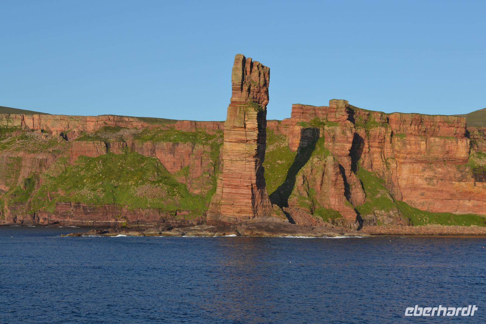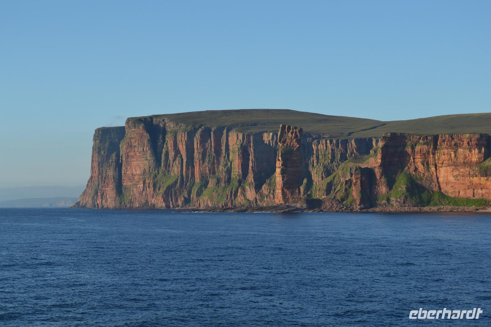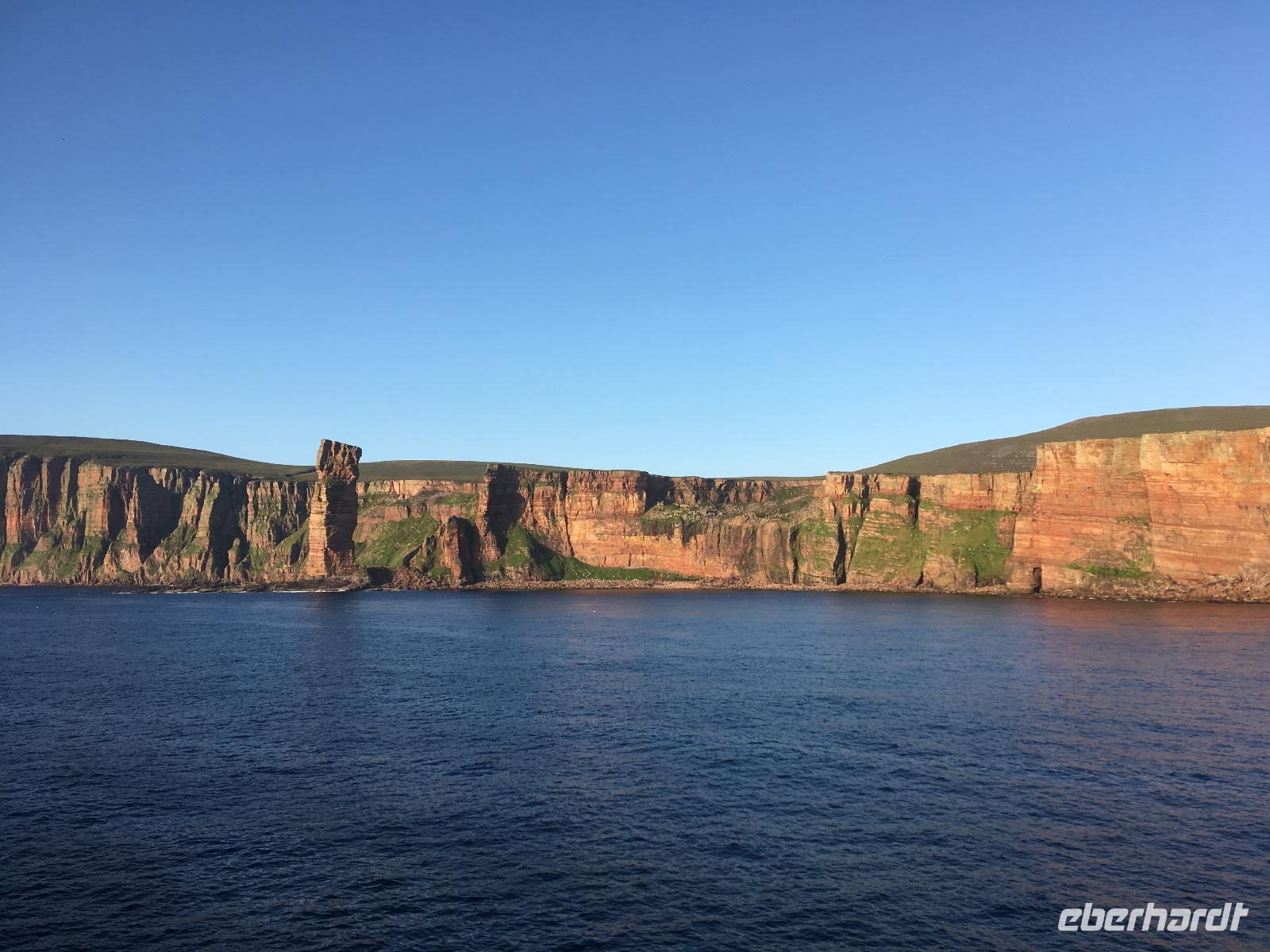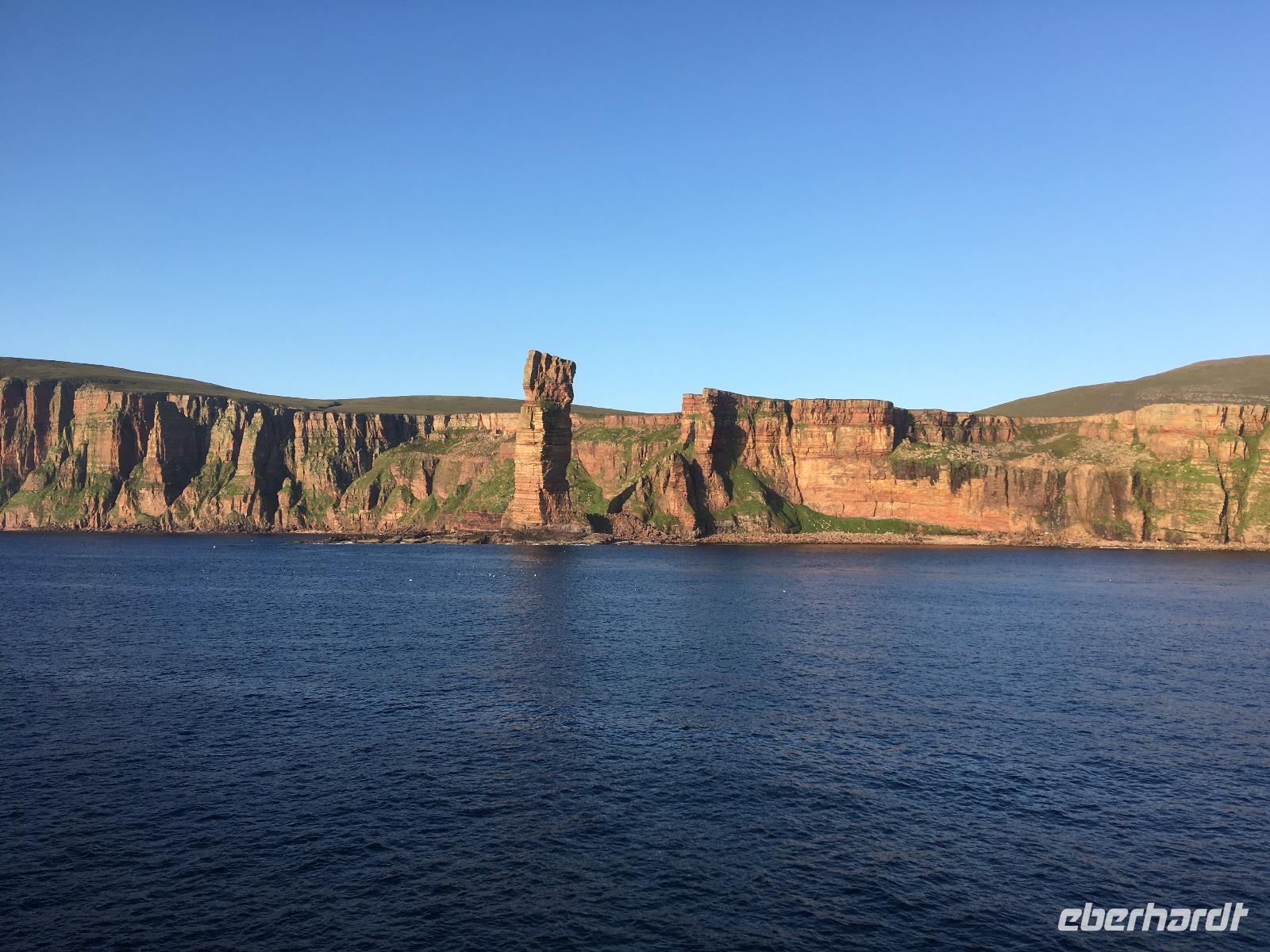 Wir verlassen die Haupttouristenroute und beginnen mit unserem Abstecher nach Norden, der uns bis auf die Orkney-Inseln führen soll. Für den heutigen Tag könnte man auch sagen: wir schauen uns mal an, womit die Schotten ihr Geld verdienen. Uns fällt zunächst auf, dass an der Ostküste viel Landwirtschaft betrieben wird; es regnet hier weniger und die Temperaturen sind stabiler. Nördlich von Inverness fahren wir dann an einigen Ölplattformen vorbei. Im weiteren Verlauf des Tages sehen wir auch einige Offshore-Windparks. Ungefähr acht Prozent aller Erwerbstätigen sind in der Whisky-Industrie beschäftigt. Sowohl im In- als auch Ausland ganz besonders beliebt ist der Whisky aus der Glenmorangie Distillery, weshalb wir der Brennerei einen Besuch abstatten und an einer Führung teilnehmen, die natürlich mit einer Kostprobe endet. Ganz besonders fallen uns die hohen Brennblasen auf, die höchsten in Schottland. Sie sollen angeblich für das ganz besonders milde Aroma des Whiskys verantwortlich sein. Unseren Whisky-Rausch können wir dann auf der Weiterfahrt nach John O'Groats ausschlafen, wo wir bereits zum Mittagessen erwartet werden. Typisch britisch gibt es Suppe und ein Sandwich - ein ganz gewaltig großes Sandwich, um genau zu sein. So sind wir auf jeden Fall gestärkt für unsere Wanderung entlang der Küste zu den Stacks of Duncansby. Auch heute ist wieder das Auftragen von Sonnencreme angebracht. Von den vielen Schafen und ein paar Seehunden neugierig beäugt spazieren wir oberhalb des Strandes entlang bis zum Leuchtturm und dann weiter Richtung Süden, bis sich die imposanten Felsnadeln von vielen Seevögeln umschwärmt majestätisch vor uns erheben. Tolle Fotos sind da garantiert. Doch der eigentliche Höhepunkt des heutigen Tages ist die Überfahrt von Scrabster nach Stromness auf der Orkney-Insel Mainland, die an den über 400 Meter hohen Klippen der Insel Hoy vorbeiführt. Unter den wachsamen Augen des Old Man of Hoy passieren wir die Sandsteinfelsen, die rotgolden in der Abendsonne glänzen. Nach der Ankunft in Stromness fahren wir noch eine halbe Stunde quer über die größte Insel des Orkney-Archipels bis zu unserem Hotel in Kirkwall.