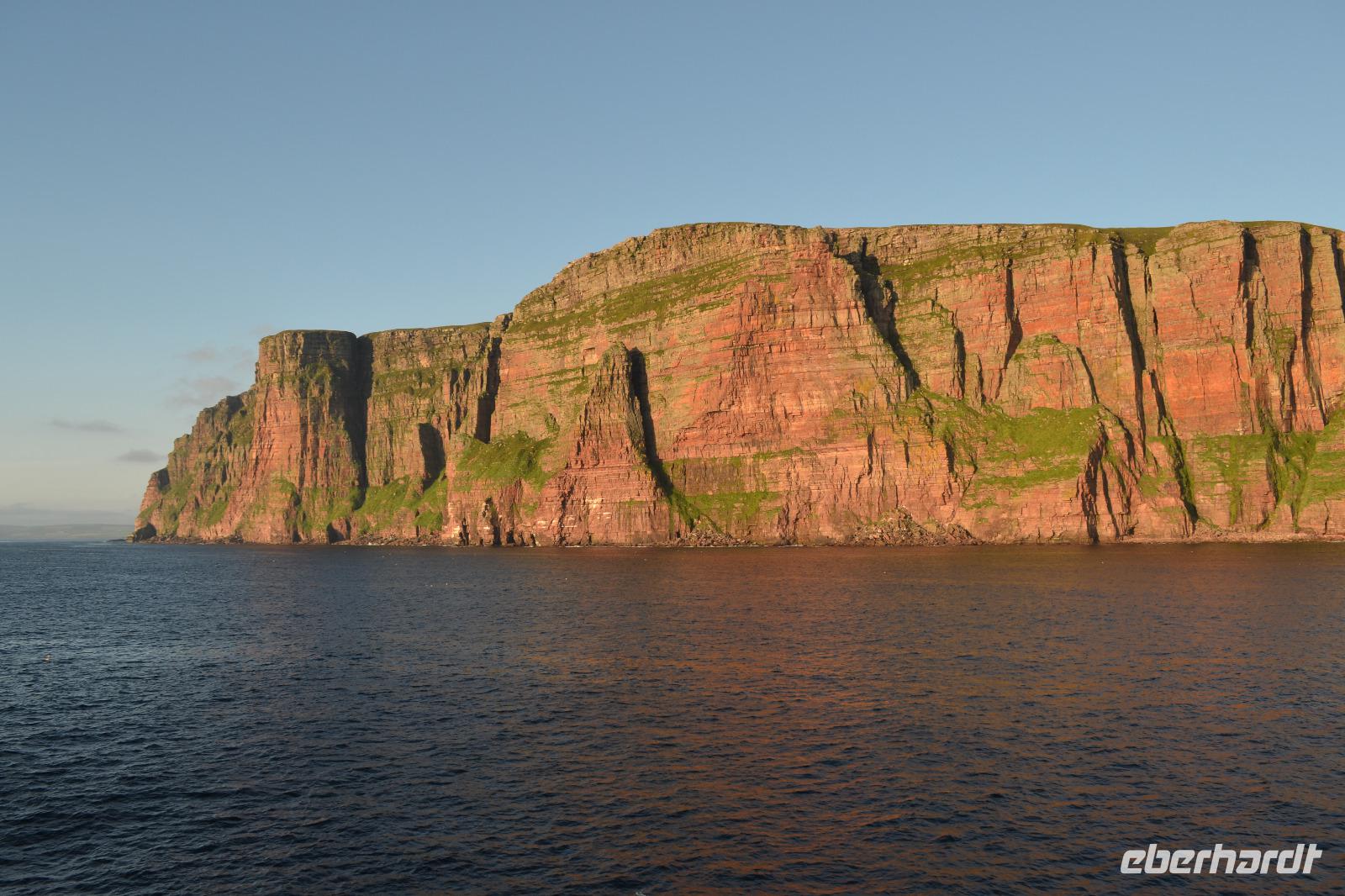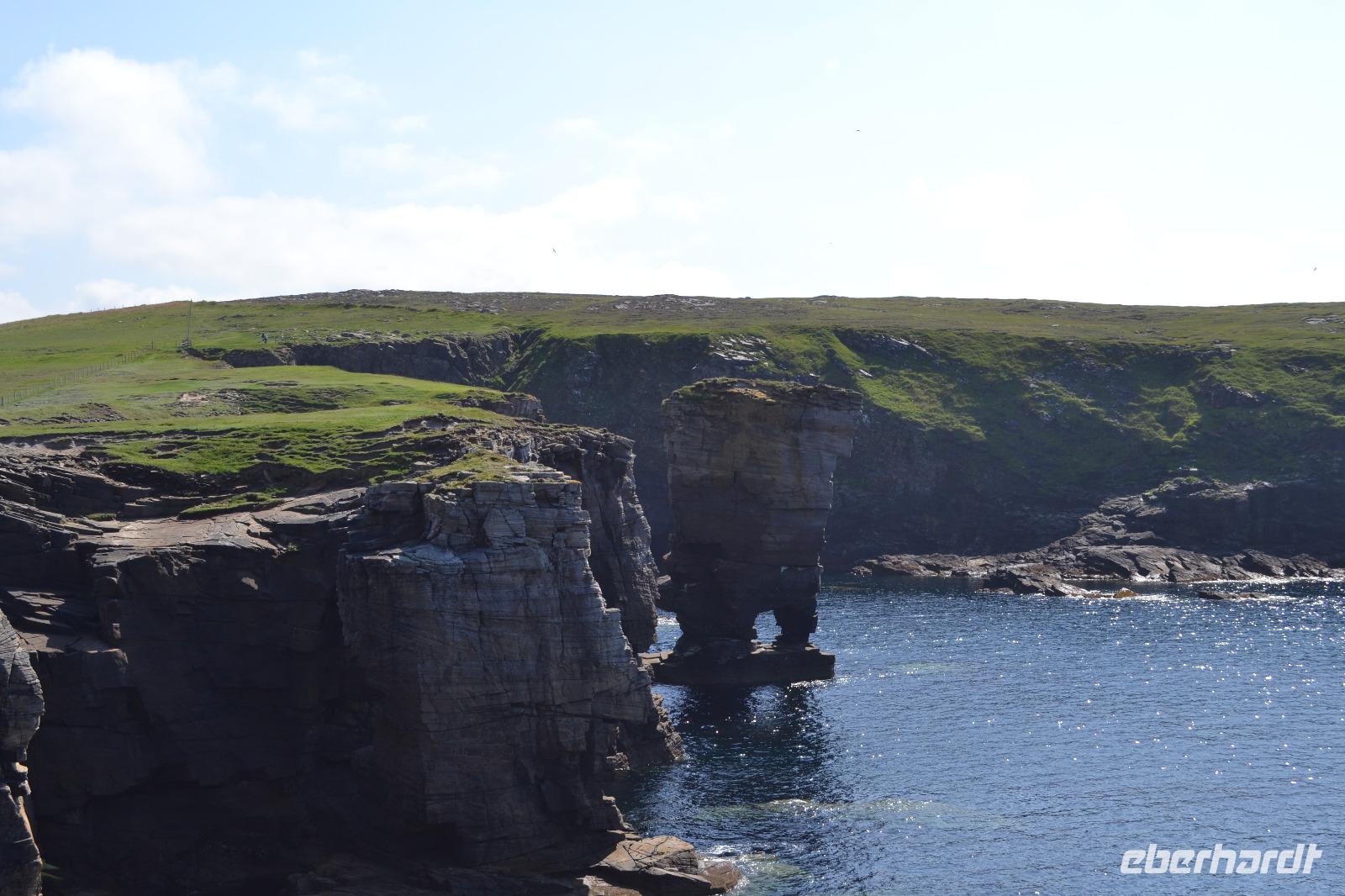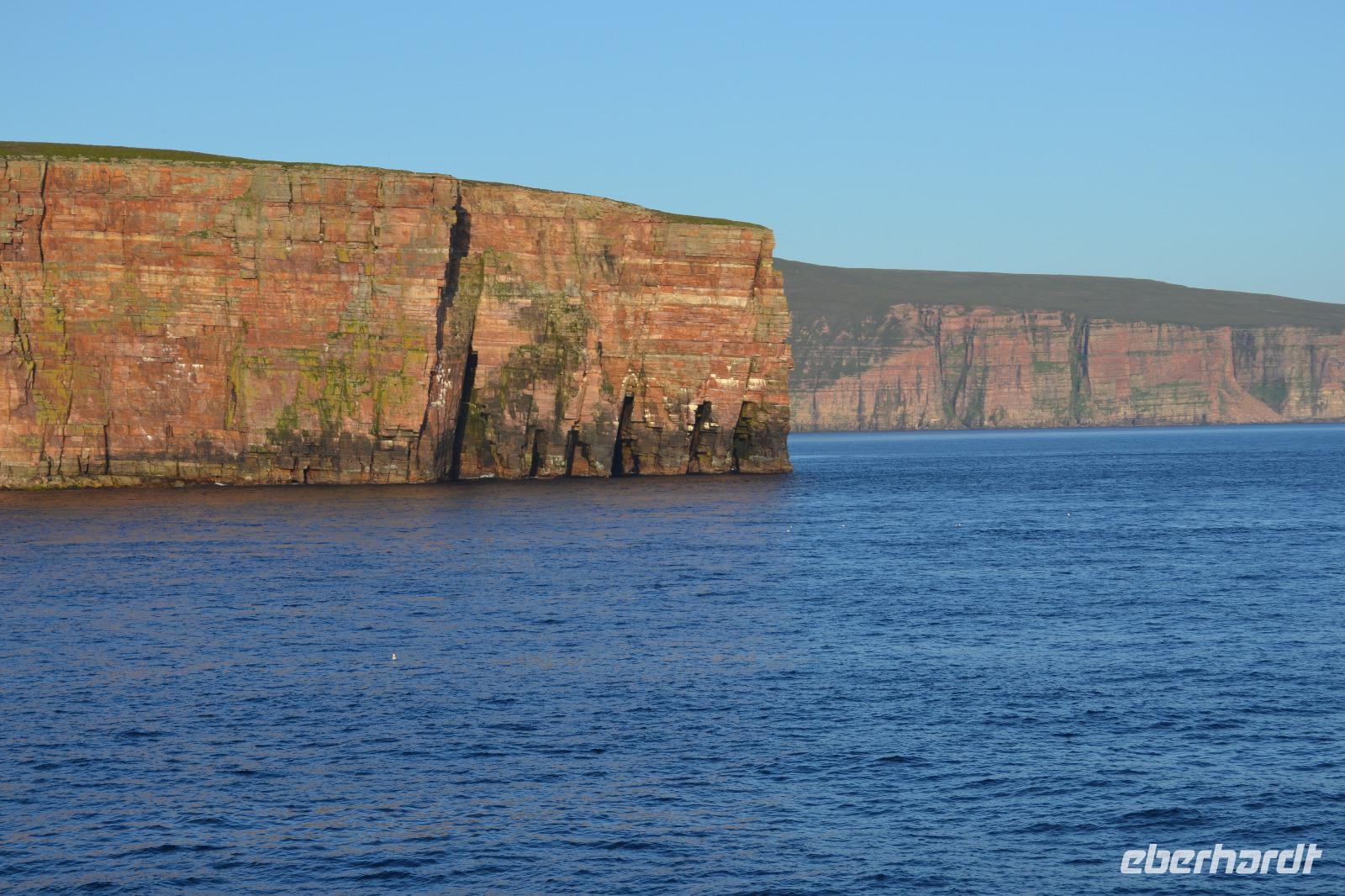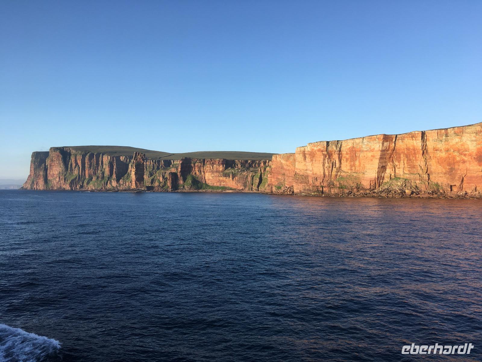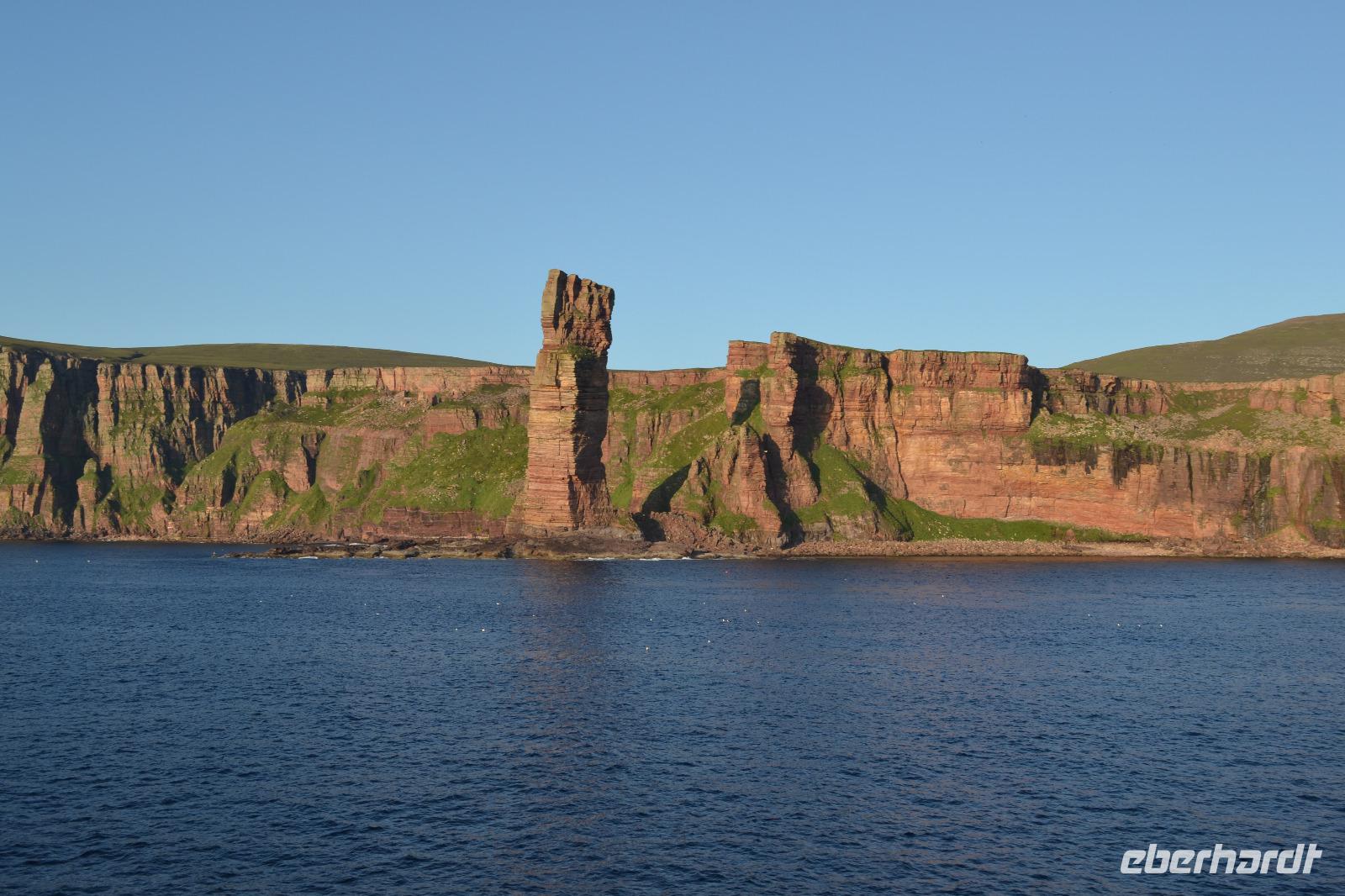 Wir verlassen die Haupttouristenroute und beginnen mit unserem Abstecher nach Norden, der uns bis auf die Orkney-Inseln führen soll. Für den heutigen Tag könnte man auch sagen: wir schauen uns mal an, womit die Schotten ihr Geld verdienen. Uns fällt zunächst auf, dass an der Ostküste viel Landwirtschaft betrieben wird; es regnet hier weniger und die Temperaturen sind stabiler. Nördlich von Inverness fahren wir dann an einigen Ölplattformen vorbei. Im weiteren Verlauf des Tages sehen wir auch einige Offshore-Windparks. Ungefähr acht Prozent aller Erwerbstätigen sind in der Whisky-Industrie beschäftigt. Sowohl im In- als auch Ausland ganz besonders beliebt ist der Whisky aus der Glenmorangie Distillery, weshalb wir der Brennerei einen Besuch abstatten und an einer Führung teilnehmen, die natürlich mit einer Kostprobe endet. Ganz besonders fallen uns die hohen Brennblasen auf, die höchsten in Schottland. Sie sollen angeblich für das ganz besonders milde Aroma des Whiskys verantwortlich sein. Unseren Whisky-Rausch können wir dann auf der Weiterfahrt nach John O'Groats ausschlafen, wo wir bereits zum Mittagessen erwartet werden. Typisch britisch gibt es Suppe und ein Sandwich - ein ganz gewaltig großes Sandwich, um genau zu sein. So sind wir auf jeden Fall gestärkt für unsere Wanderung entlang der Küste zu den Stacks of Duncansby. Auch heute ist wieder das Auftragen von Sonnencreme angebracht. Von den vielen Schafen und ein paar Seehunden neugierig beäugt spazieren wir oberhalb des Strandes entlang bis zum Leuchtturm und dann weiter Richtung Süden, bis sich die imposanten Felsnadeln von vielen Seevögeln umschwärmt majestätisch vor uns erheben. Tolle Fotos sind da garantiert. Doch der eigentliche Höhepunkt des heutigen Tages ist die Überfahrt von Scrabster nach Stromness auf der Orkney-Insel Mainland, die an den über 400 Meter hohen Klippen der Insel Hoy vorbeiführt. Unter den wachsamen Augen des Old Man of Hoy passieren wir die Sandsteinfelsen, die rotgolden in der Abendsonne glänzen. Nach der Ankunft in Stromness fahren wir noch eine halbe Stunde quer über die größte Insel des Orkney-Archipels bis zu unserem Hotel in Kirkwall.