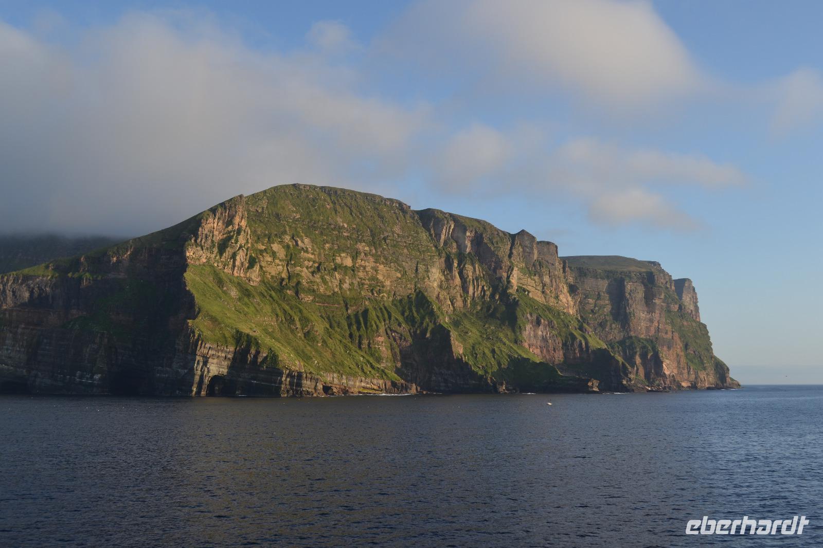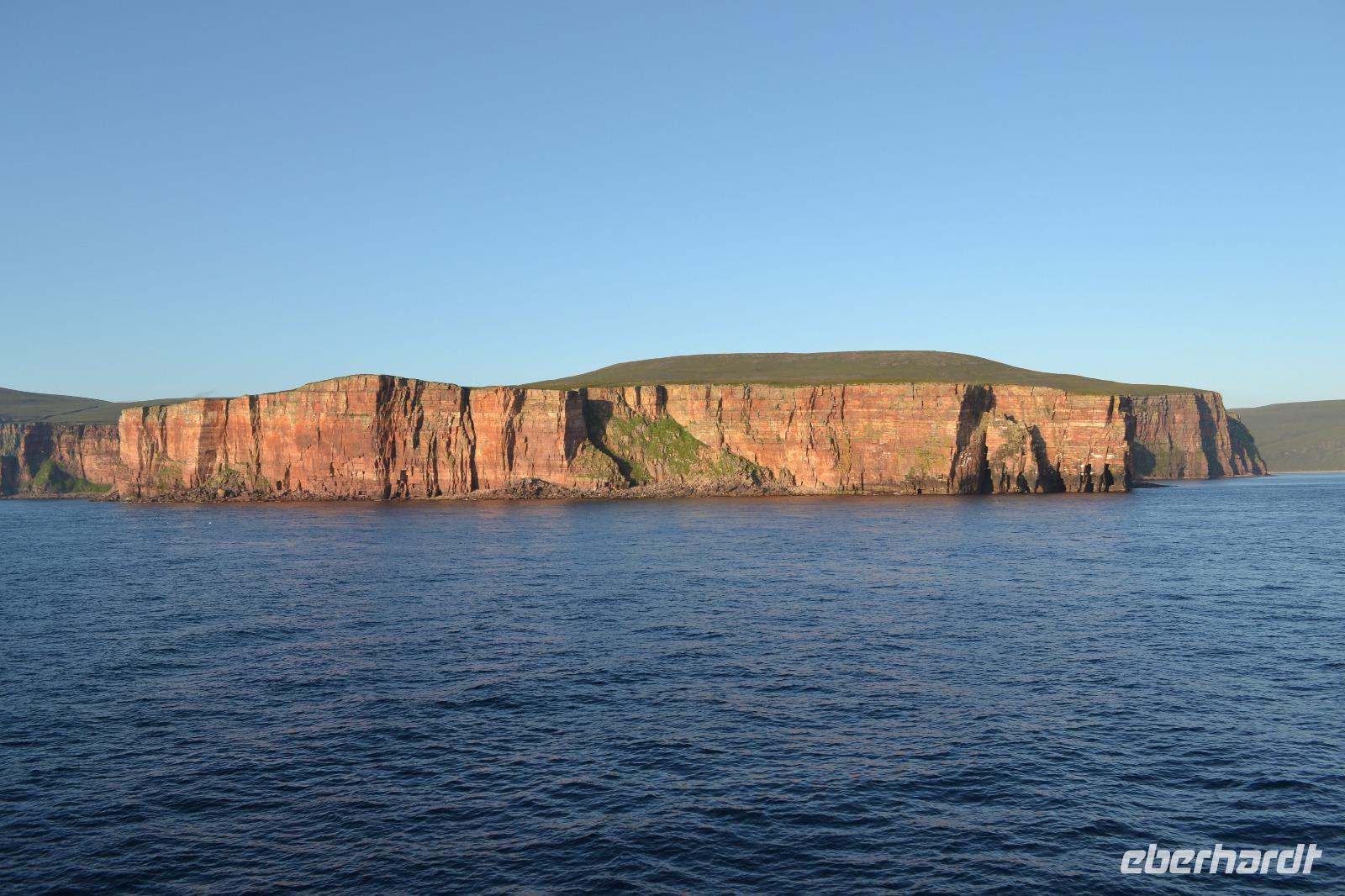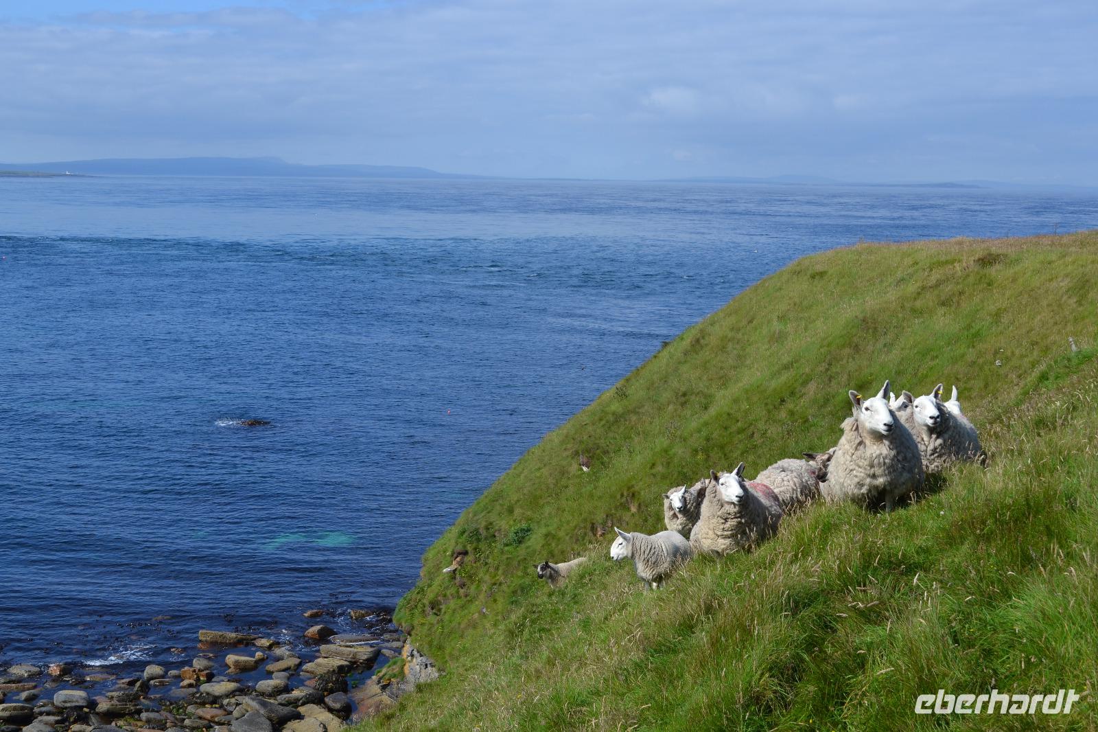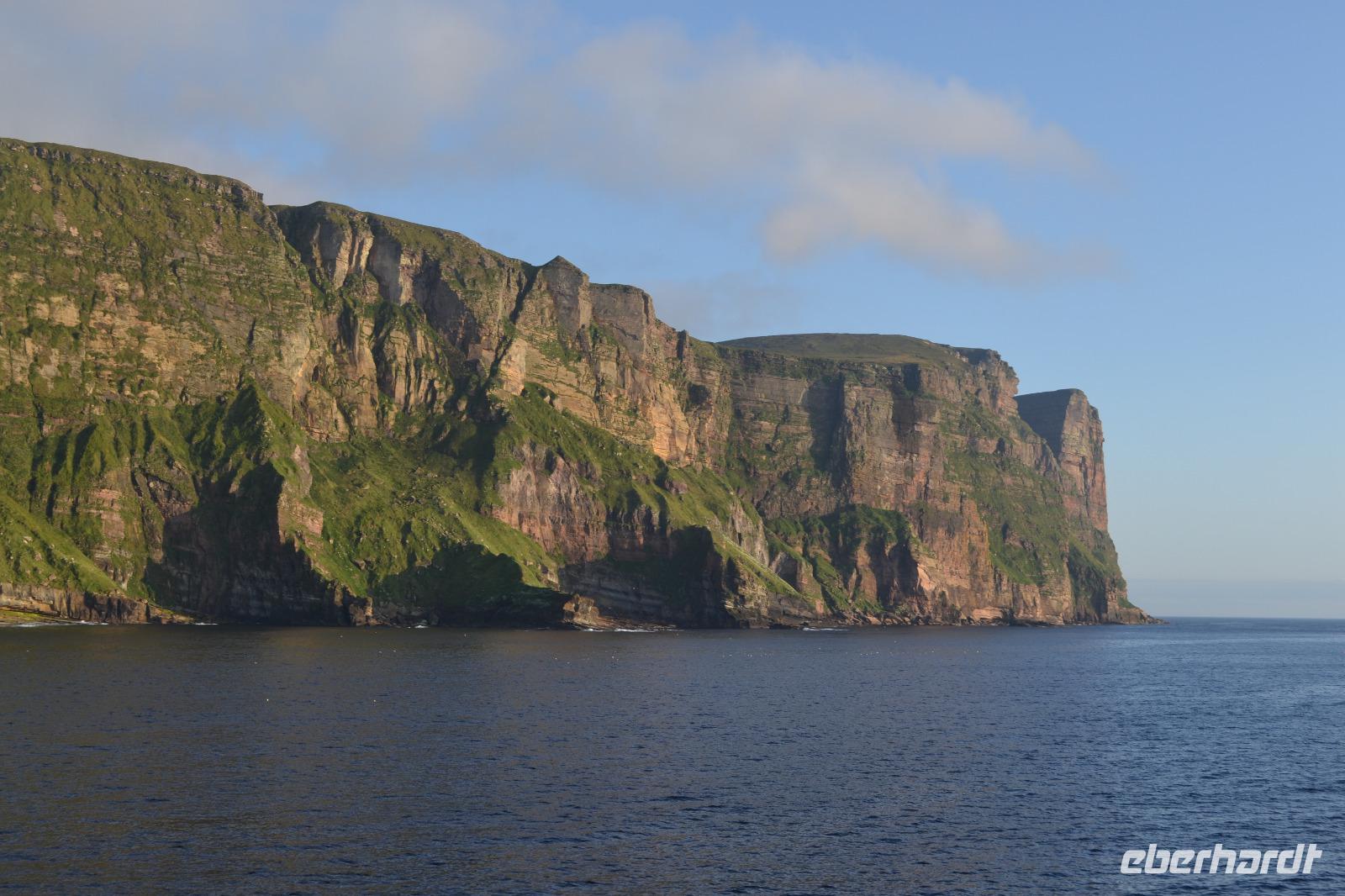 Wir verlassen die Haupttouristenroute und beginnen mit unserem Abstecher nach Norden, der uns bis auf die Orkney-Inseln führen soll. Für den heutigen Tag könnte man auch sagen: wir schauen uns mal an, womit die Schotten ihr Geld verdienen. Uns fällt zunächst auf, dass an der Ostküste viel Landwirtschaft betrieben wird; es regnet hier weniger und die Temperaturen sind stabiler. Nördlich von Inverness fahren wir dann an einigen Ölplattformen vorbei. Im weiteren Verlauf des Tages sehen wir auch einige Offshore-Windparks. Ungefähr acht Prozent aller Erwerbstätigen sind in der Whisky-Industrie beschäftigt. Sowohl im In- als auch Ausland ganz besonders beliebt ist der Whisky aus der Glenmorangie Distillery, weshalb wir der Brennerei einen Besuch abstatten und an einer Führung teilnehmen, die natürlich mit einer Kostprobe endet. Ganz besonders fallen uns die hohen Brennblasen auf, die höchsten in Schottland. Sie sollen angeblich für das ganz besonders milde Aroma des Whiskys verantwortlich sein. Unseren Whisky-Rausch können wir dann auf der Weiterfahrt nach John O'Groats ausschlafen, wo wir bereits zum Mittagessen erwartet werden. Typisch britisch gibt es Suppe und ein Sandwich - ein ganz gewaltig großes Sandwich, um genau zu sein. So sind wir auf jeden Fall gestärkt für unsere Wanderung entlang der Küste zu den Stacks of Duncansby. Auch heute ist wieder das Auftragen von Sonnencreme angebracht. Von den vielen Schafen und ein paar Seehunden neugierig beäugt spazieren wir oberhalb des Strandes entlang bis zum Leuchtturm und dann weiter Richtung Süden, bis sich die imposanten Felsnadeln von vielen Seevögeln umschwärmt majestätisch vor uns erheben. Tolle Fotos sind da garantiert. Doch der eigentliche Höhepunkt des heutigen Tages ist die Überfahrt von Scrabster nach Stromness auf der Orkney-Insel Mainland, die an den über 400 Meter hohen Klippen der Insel Hoy vorbeiführt. Unter den wachsamen Augen des Old Man of Hoy passieren wir die Sandsteinfelsen, die rotgolden in der Abendsonne glänzen. Nach der Ankunft in Stromness fahren wir noch eine halbe Stunde quer über die größte Insel des Orkney-Archipels bis zu unserem Hotel in Kirkwall.