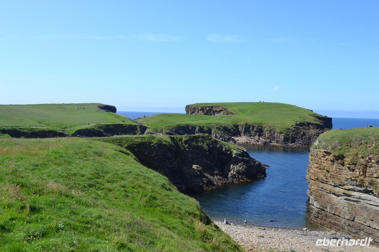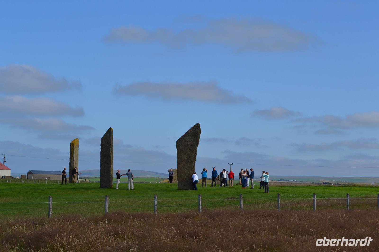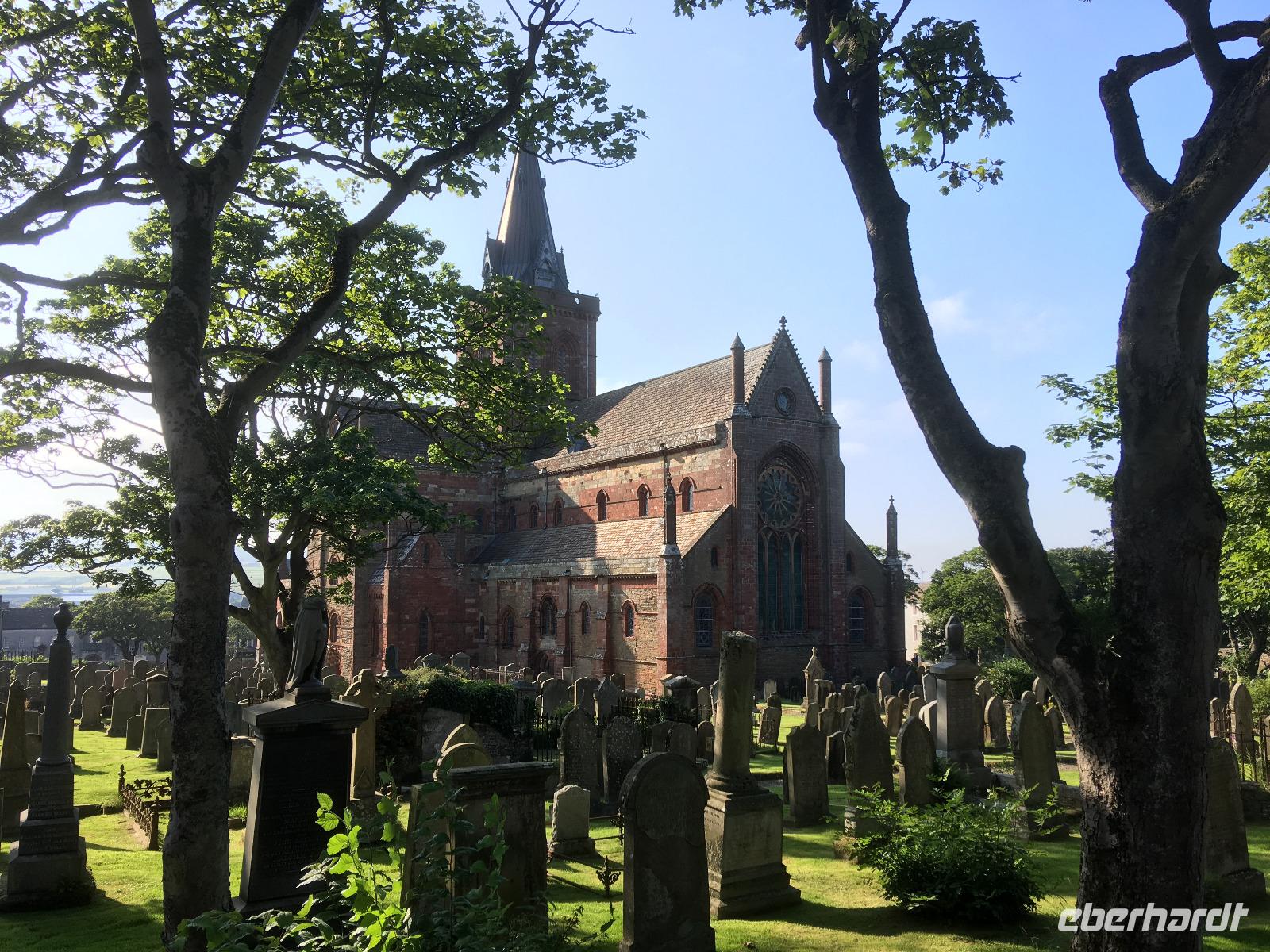 Trotz ihrer abgeschiedenen Lage gibt es auf den Orkney-Inseln viel zu entdecken - und zu lernen. Die vielen bedeutenden Fundstätten aus der Steinzeit haben einige Wissenschaftler sogar zu der These verleitet, dass die größte Orkney-Insel Mainland vor 5.000 Jahren das kulturelle und geistige Zentrum der Britischen Inseln und Hauptstadt einer großen Zivilisation war. Zu den stummen Zeitzeugen aus jener Epoche zählen die Standing Stones of Stennes und der Ring of Brodgar, zwei Steinkreise, die vielleicht einmal Tempel oder Observatorien waren. Der Ring of Brodgar bestand ursprünglich aus 60 aufgerichteten Steinen und ist vom Durchmesser her größer als das viel bekanntere Stonehenge. Eine Zeitreise in die Vergangenheit wie in der Outlander-Saga ist damit jedoch nicht möglich (zum Bedauern einiger Reisegäste). So fahren wir alle weiter und besichtigen die Steinzeitsiedlung Skara Brae, auf die man 1850 gestoßen ist, nachdem ein mächtiger Sturm einen Teil der Dünen weggeweht hatte. Die zehn Häuser der kleinen Siedlung waren alle durch ein Labyrinth von Tunneln miteinander verbunden und faszinieren durch ihr Steinmobiliar. Warum die Menschen die Siedlung damals verlassen haben, wird wohl für immer ein Rätsel bleiben. Der Wettergott ist uns auch heute gewogen, weshalb wir im Anschluss einen spontanen Spaziergang auf den Klippen von Yesnaby wagen, um Sonne zu tanken und uns die bekannte Felsnadel mit dem Loch anzuschauen. Ein Relikt aus einer viel späteren Epoche der Menschheitsgeschichte sind die Churchill Barriers, die während des Zweiten Weltkriegs von italienischen Kriegsgefangenen errichtet wurden, nachdem es U47 gelang, in Scapa Flow das britische Schlachtschiff Royal Oak zu versenken. Die Barrieren blockierten einige der Zufahrten zum britischen Hauptmarinestützpunkt und dienen heute als wichtige Verbindungsstraßen zwischen den südöstlichen Inseln des Orkney-Archipels. Nach unserer Fahrt über die Barrieren mit zwei Fotostopps können wir dann auch behaupten, auf mehreren der Orkney-Inseln gewesen zu sein. Den Nachmittag verbringen wir in der Hauptstadt Kirkwall. Der erste Versuch, die gewaltige, noch von den Wikingern erbaute St.-Magnus-Kathedrale zu besuchen, scheitert an einer Hochzeit, weshalb wir zunächst die benachbarten Ruinen des Earl's Palace besichtigen. Das herrliche Wetter verlockt außerdem zu einem Bummel durch die Fußgängerzone zum Hafen. Und natürlich gibt es auch viele kleine Cafés mit leckerem Kuchen. Zum Abendessen treffen wir uns alle wieder im Hotel und tauschen uns über unsere Erlebnisse aus.