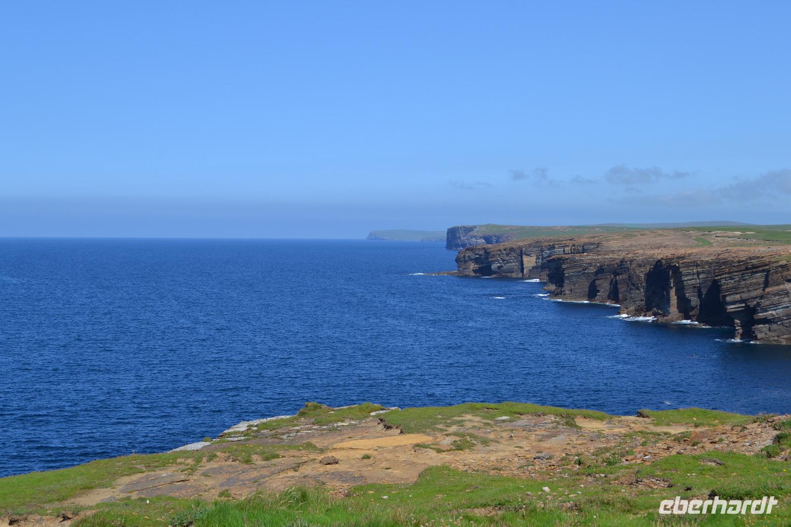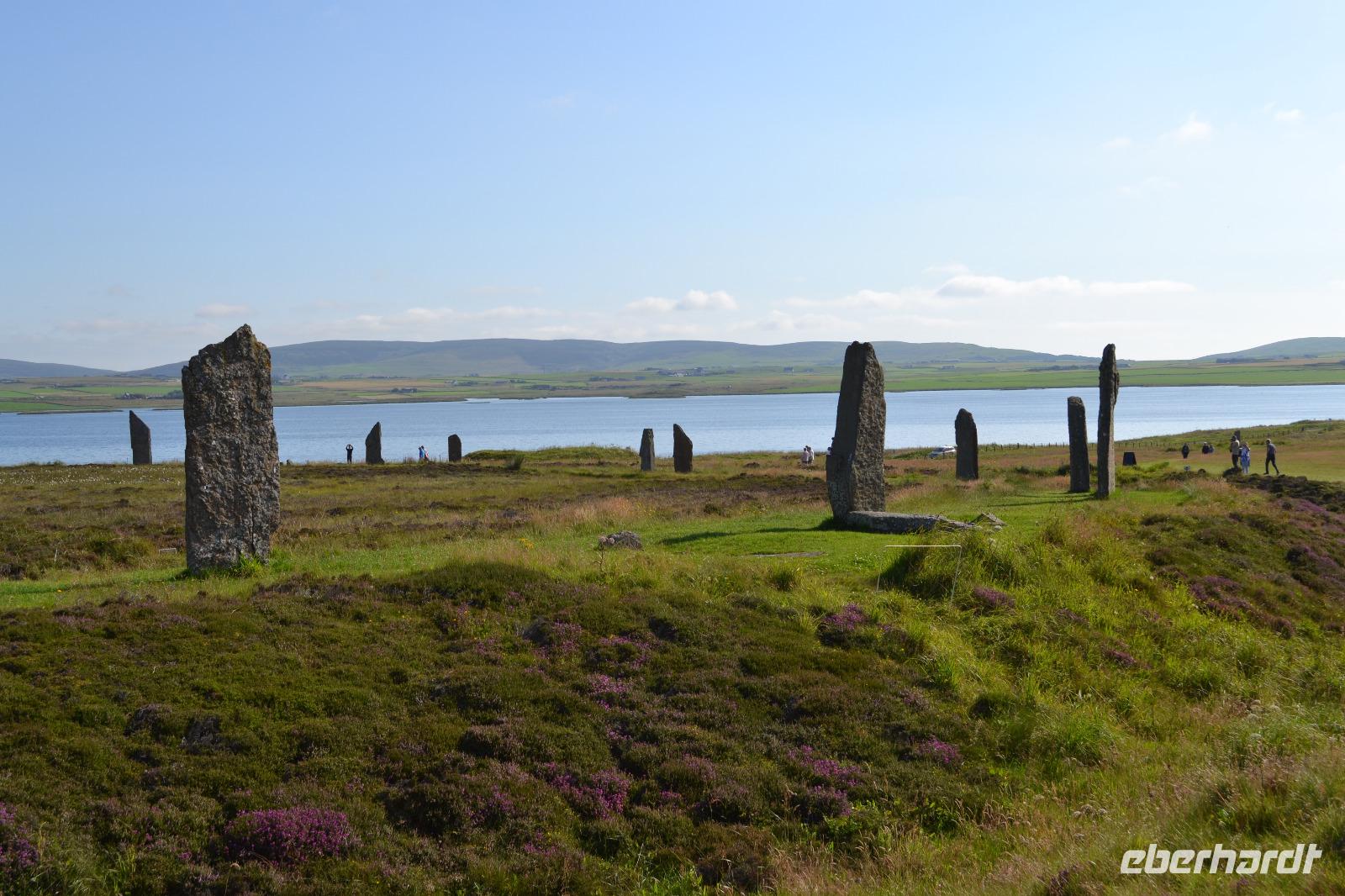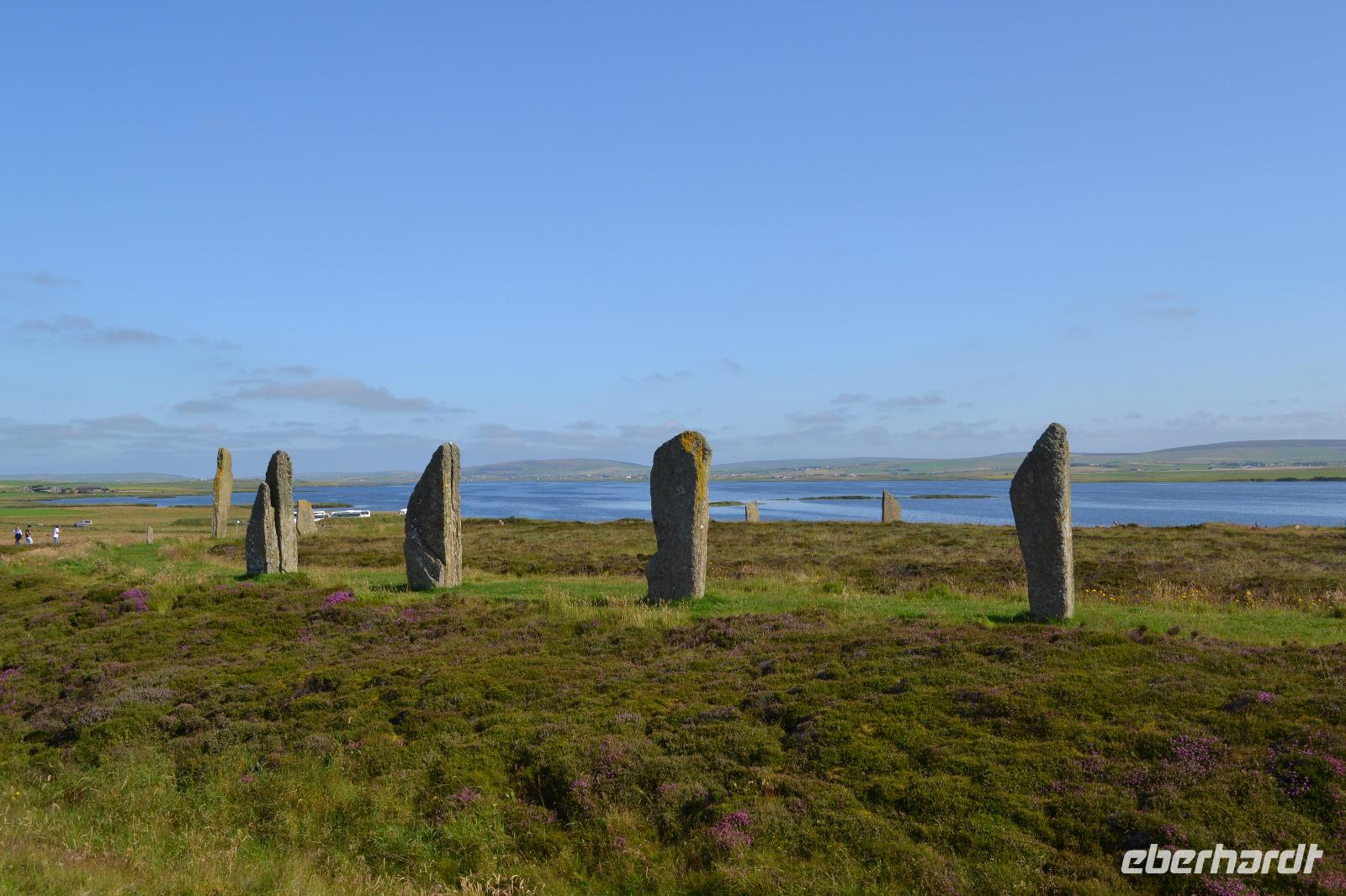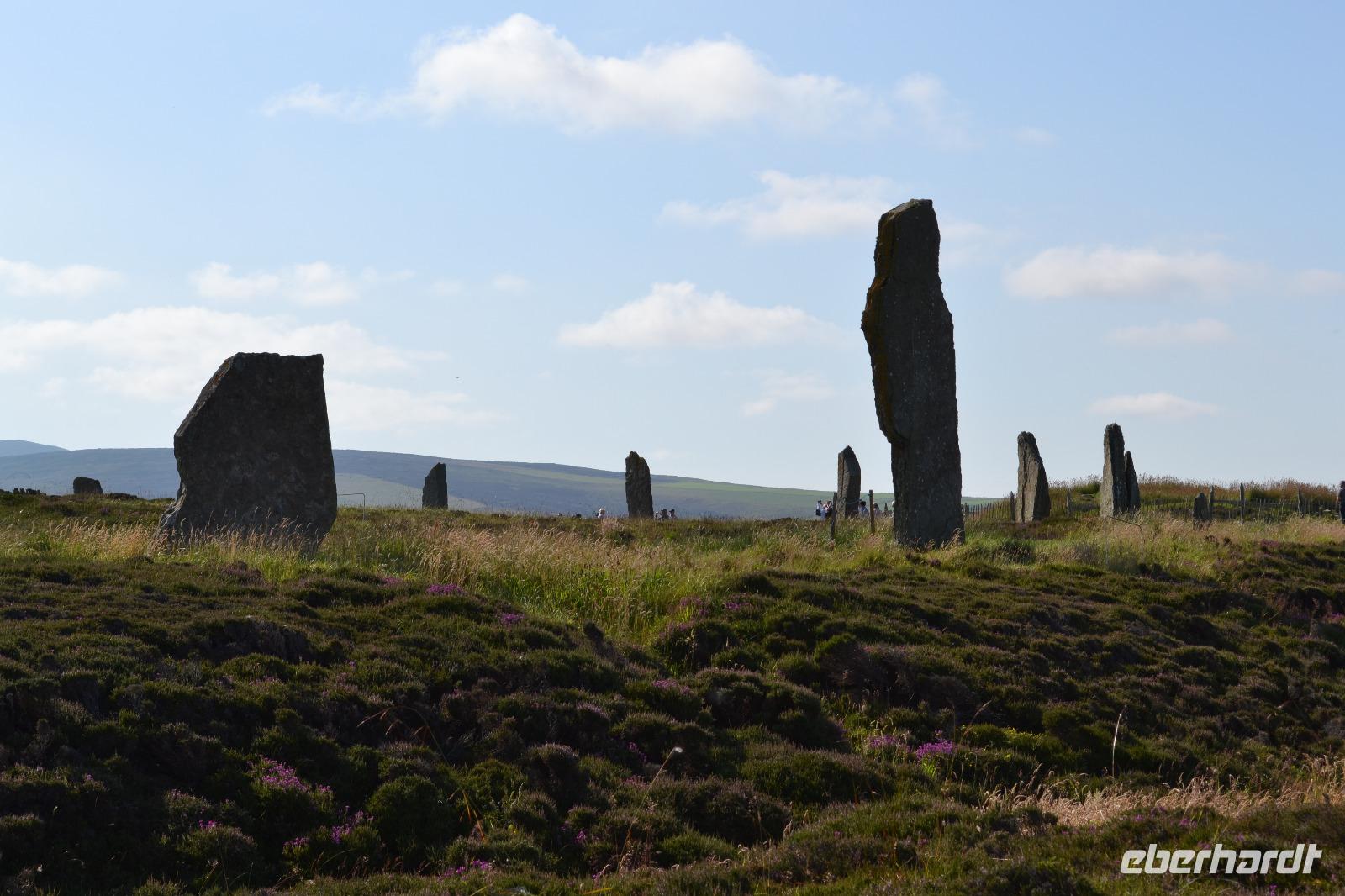 Trotz ihrer abgeschiedenen Lage gibt es auf den Orkney-Inseln viel zu entdecken - und zu lernen. Die vielen bedeutenden Fundstätten aus der Steinzeit haben einige Wissenschaftler sogar zu der These verleitet, dass die größte Orkney-Insel Mainland vor 5.000 Jahren das kulturelle und geistige Zentrum der Britischen Inseln und Hauptstadt einer großen Zivilisation war. Zu den stummen Zeitzeugen aus jener Epoche zählen die Standing Stones of Stennes und der Ring of Brodgar, zwei Steinkreise, die vielleicht einmal Tempel oder Observatorien waren. Der Ring of Brodgar bestand ursprünglich aus 60 aufgerichteten Steinen und ist vom Durchmesser her größer als das viel bekanntere Stonehenge. Eine Zeitreise in die Vergangenheit wie in der Outlander-Saga ist damit jedoch nicht möglich (zum Bedauern einiger Reisegäste). So fahren wir alle weiter und besichtigen die Steinzeitsiedlung Skara Brae, auf die man 1850 gestoßen ist, nachdem ein mächtiger Sturm einen Teil der Dünen weggeweht hatte. Die zehn Häuser der kleinen Siedlung waren alle durch ein Labyrinth von Tunneln miteinander verbunden und faszinieren durch ihr Steinmobiliar. Warum die Menschen die Siedlung damals verlassen haben, wird wohl für immer ein Rätsel bleiben. Der Wettergott ist uns auch heute gewogen, weshalb wir im Anschluss einen spontanen Spaziergang auf den Klippen von Yesnaby wagen, um Sonne zu tanken und uns die bekannte Felsnadel mit dem Loch anzuschauen. Ein Relikt aus einer viel späteren Epoche der Menschheitsgeschichte sind die Churchill Barriers, die während des Zweiten Weltkriegs von italienischen Kriegsgefangenen errichtet wurden, nachdem es U47 gelang, in Scapa Flow das britische Schlachtschiff Royal Oak zu versenken. Die Barrieren blockierten einige der Zufahrten zum britischen Hauptmarinestützpunkt und dienen heute als wichtige Verbindungsstraßen zwischen den südöstlichen Inseln des Orkney-Archipels. Nach unserer Fahrt über die Barrieren mit zwei Fotostopps können wir dann auch behaupten, auf mehreren der Orkney-Inseln gewesen zu sein. Den Nachmittag verbringen wir in der Hauptstadt Kirkwall. Der erste Versuch, die gewaltige, noch von den Wikingern erbaute St.-Magnus-Kathedrale zu besuchen, scheitert an einer Hochzeit, weshalb wir zunächst die benachbarten Ruinen des Earl's Palace besichtigen. Das herrliche Wetter verlockt außerdem zu einem Bummel durch die Fußgängerzone zum Hafen. Und natürlich gibt es auch viele kleine Cafés mit leckerem Kuchen. Zum Abendessen treffen wir uns alle wieder im Hotel und tauschen uns über unsere Erlebnisse aus.