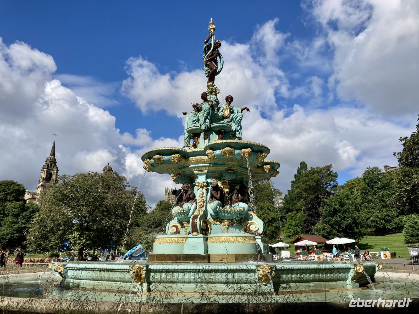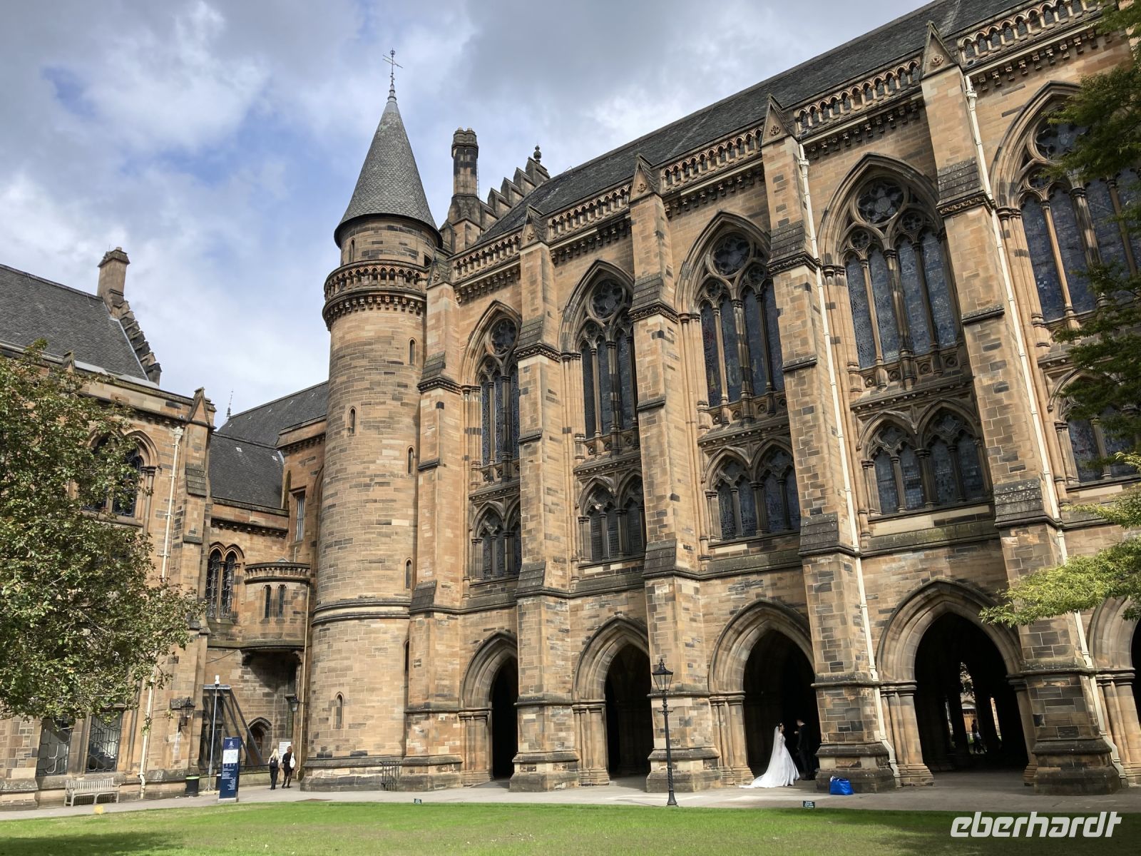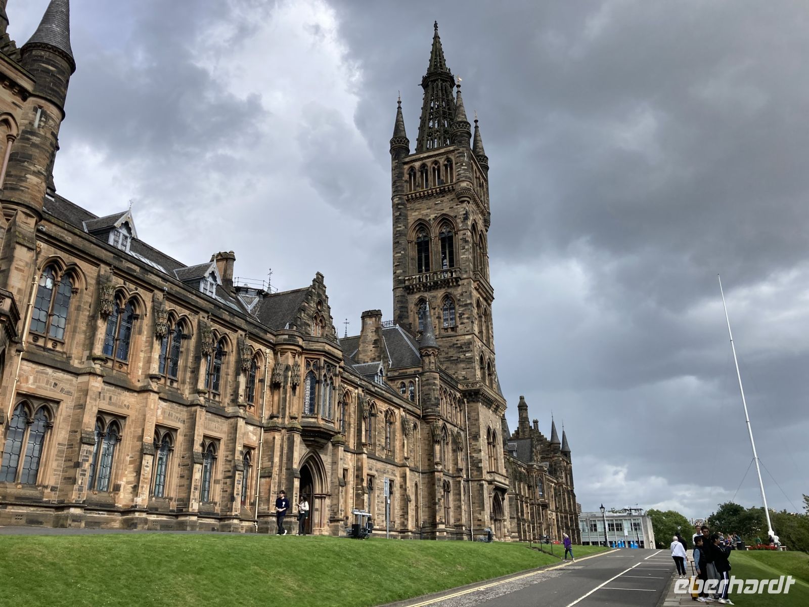 Es ist noch sehr zeitig am Morgen, eigentlich viel zu zeitig für eine Nachteule wie mich, als ich mich auf dem Flughafen von Dresden mit den ersten Gästen meiner Schottlandreise treffe. Diesmal fliegen wir mit der Lufthansa über Frankfurt nach Glasgow; in Frankfurt trifft die zweite Hälfte der Reisegruppe zu uns. Der (Weiter-)Flug nach Glasgow ist fast pünktlich. Auch unser Gepäck kommt heil an und unser Chauffeur Neil fährt mit seinem großen grauen Bus auf Abruf vor und sammelt uns ein. Bis hierhin alles prima also. Schauen wir mal, wie weit wir heute in Glasgow kommen, denn die internationale Radrenn-WM sorgt mit Straßensperren und riesigem Besucherandrang für mächtig Chaos in der größten schottischen Stadt. Wir fahren erstmal so nah wie möglich an unser Hotel heran — in die Parallelstraße — und stellen unsere Koffer bis zum Abend unter. Dann wird Neil für heute in den Feierabend verabschiedet, denn den Rest des Programms bestreiten wir lieber zu Fuß und mit der U-Bahn. Bis zur Kelvingrove Art Gallery & Museum sind es auch nur ein paar hundert Meter. Das prächtige rote Gebäude im spanischen Barockstil beherbergt eine bunte Sammlung an Gemälden und Ausstellungsstücken, weitestgehend mit Bezug zur schottischen Geschichte, darunter auch eine Sammlung von Highlander-Waffen und eine Spitfire. Außerdem findet jeden Sonntag ein öffentliches Orgelkonzert statt, das wir auch noch „mitnehmen“ können, während draußen die Radprofis vorbeizischen. Nicht nur für jene ist das Wetter heute ideal; auch wir erfreuen uns an angenehmen Temperaturen und einem Mix aus Sonne und Wolken, als wir uns den Gilmore Hill hinauf zum Hauptgebäude der University of Glasgow „quälen“. Es erinnert eher an ein Märchenschloss oder eine Zauberschule und stimmt damit ideal auf den weiteren Verlauf der Reise ein. Unweit davon befindet sich die Ashton Lane mit ihren vielen Kneipen, die wir jetzt zügigst durchqueren, bevor doch noch ein Gast auf die Idee kommt, die mehr als 20 Sorten Craft Beer vom Zapfhahn zu verkosten. Wir wollen erstmal zur U-Bahnstation Hillhead und von dort aus in die Innenstadt fahren. Die drittälteste U-Bahn-Strecke der Welt ist mit ihren niedrigen Waggons eine Sehenswürdigkeit für sich und bringt uns in wenigen Minuten zur Fußgängerzone und Haupteinkaufsstraße Buchanan Street. Gleich um die Ecke liegt der George Square mit dem Rathaus, der leider aufgrund des Radrennens abgesperrt und kaum einsehbar ist. Lediglich den Turm der City Chambers können wir über den Zaun hinweg sehen. Immerhin erhalten wir durch die umliegenden Gebäude einen guten Eindruck von den prächtigen Handelshöfen der Kaufleute aus der Blütezeit der Stadt. Weiter die Buchanan Street hinunter kommen wir heute leider nicht mehr, da alles abgesperrt ist und wir sogar für 10–15 Minuten regelrecht zwischen zwei Straßen eingesperrt sind, da gerade der Zieleinlauf der Radfahrer stattfindet. Großer Jubel, großer Trommelwirbel um uns herum, viele begeistere Zuschauer — und wir mittendrin. Das kann auch nicht jeder von sich behaupten! Irgendwann wird der Weg zur U-Bahn-Station wieder freigegeben, sodass wir die Rückfahrt zum Hotel antreten können. Von der Station Kelvinhall marschieren wir strammen Schrittes in Richtung Unterkunft. Die Dusche ruft, der Magen knurrt, es war ein langer Tag für die meisten von uns. Deshalb fallen wir nach dem Abendessen schließlich erschöpft aber glücklich in unsere Hotelbetten.