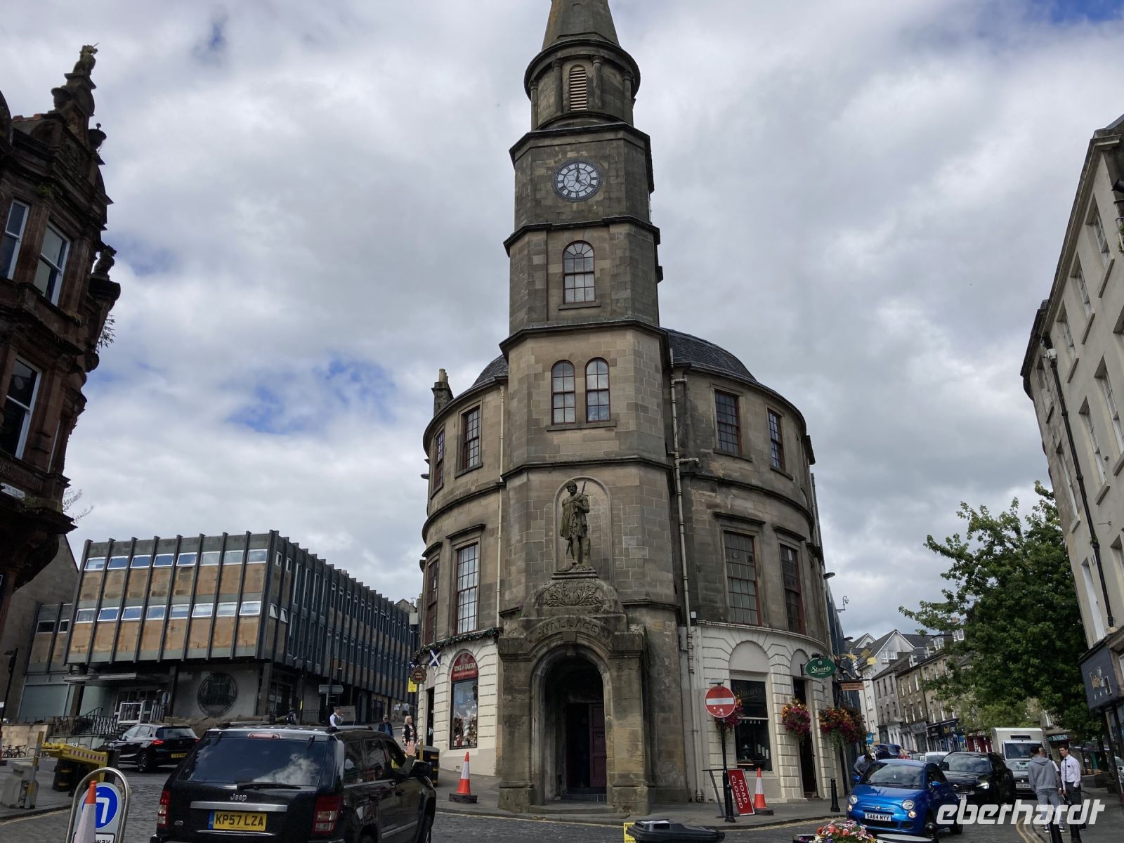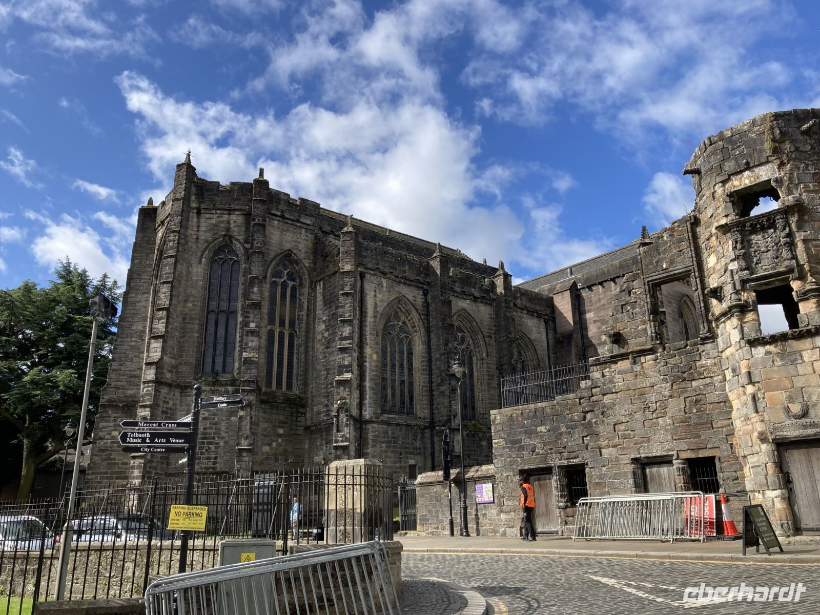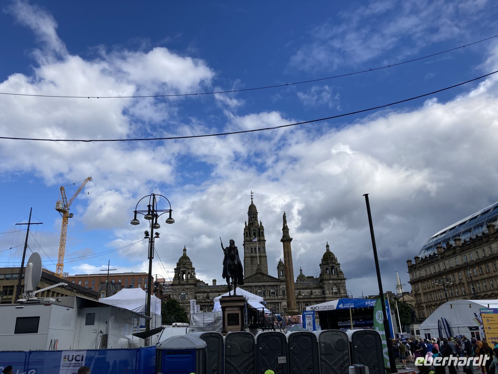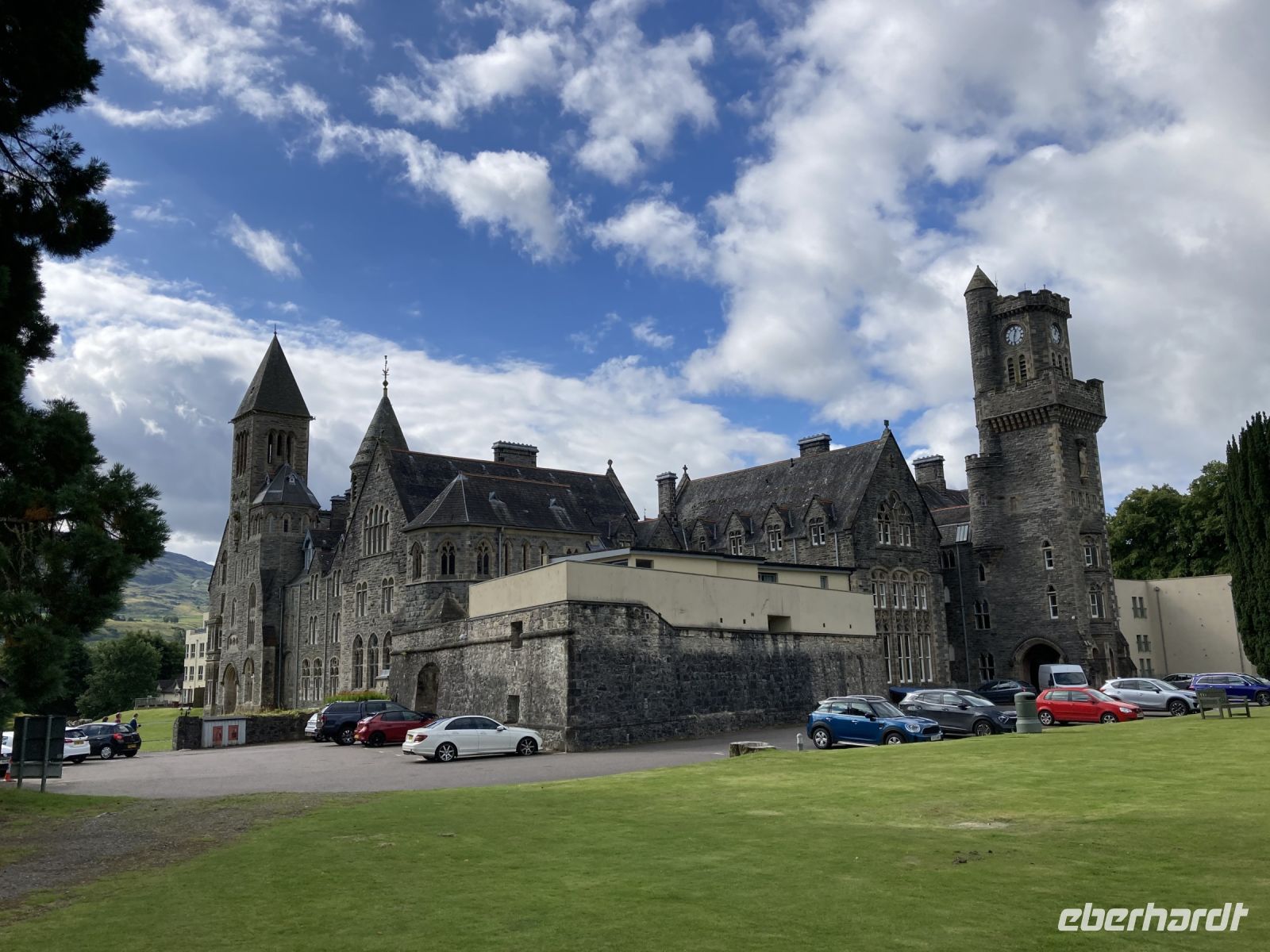 Es ist noch sehr zeitig am Morgen, eigentlich viel zu zeitig für eine Nachteule wie mich, als ich mich auf dem Flughafen von Dresden mit den ersten Gästen meiner Schottlandreise treffe. Diesmal fliegen wir mit der Lufthansa über Frankfurt nach Glasgow; in Frankfurt trifft die zweite Hälfte der Reisegruppe zu uns. Der (Weiter-)Flug nach Glasgow ist fast pünktlich. Auch unser Gepäck kommt heil an und unser Chauffeur Neil fährt mit seinem großen grauen Bus auf Abruf vor und sammelt uns ein. Bis hierhin alles prima also. Schauen wir mal, wie weit wir heute in Glasgow kommen, denn die internationale Radrenn-WM sorgt mit Straßensperren und riesigem Besucherandrang für mächtig Chaos in der größten schottischen Stadt. Wir fahren erstmal so nah wie möglich an unser Hotel heran — in die Parallelstraße — und stellen unsere Koffer bis zum Abend unter. Dann wird Neil für heute in den Feierabend verabschiedet, denn den Rest des Programms bestreiten wir lieber zu Fuß und mit der U-Bahn. Bis zur Kelvingrove Art Gallery & Museum sind es auch nur ein paar hundert Meter. Das prächtige rote Gebäude im spanischen Barockstil beherbergt eine bunte Sammlung an Gemälden und Ausstellungsstücken, weitestgehend mit Bezug zur schottischen Geschichte, darunter auch eine Sammlung von Highlander-Waffen und eine Spitfire. Außerdem findet jeden Sonntag ein öffentliches Orgelkonzert statt, das wir auch noch „mitnehmen“ können, während draußen die Radprofis vorbeizischen. Nicht nur für jene ist das Wetter heute ideal; auch wir erfreuen uns an angenehmen Temperaturen und einem Mix aus Sonne und Wolken, als wir uns den Gilmore Hill hinauf zum Hauptgebäude der University of Glasgow „quälen“. Es erinnert eher an ein Märchenschloss oder eine Zauberschule und stimmt damit ideal auf den weiteren Verlauf der Reise ein. Unweit davon befindet sich die Ashton Lane mit ihren vielen Kneipen, die wir jetzt zügigst durchqueren, bevor doch noch ein Gast auf die Idee kommt, die mehr als 20 Sorten Craft Beer vom Zapfhahn zu verkosten. Wir wollen erstmal zur U-Bahnstation Hillhead und von dort aus in die Innenstadt fahren. Die drittälteste U-Bahn-Strecke der Welt ist mit ihren niedrigen Waggons eine Sehenswürdigkeit für sich und bringt uns in wenigen Minuten zur Fußgängerzone und Haupteinkaufsstraße Buchanan Street. Gleich um die Ecke liegt der George Square mit dem Rathaus, der leider aufgrund des Radrennens abgesperrt und kaum einsehbar ist. Lediglich den Turm der City Chambers können wir über den Zaun hinweg sehen. Immerhin erhalten wir durch die umliegenden Gebäude einen guten Eindruck von den prächtigen Handelshöfen der Kaufleute aus der Blütezeit der Stadt. Weiter die Buchanan Street hinunter kommen wir heute leider nicht mehr, da alles abgesperrt ist und wir sogar für 10–15 Minuten regelrecht zwischen zwei Straßen eingesperrt sind, da gerade der Zieleinlauf der Radfahrer stattfindet. Großer Jubel, großer Trommelwirbel um uns herum, viele begeistere Zuschauer — und wir mittendrin. Das kann auch nicht jeder von sich behaupten! Irgendwann wird der Weg zur U-Bahn-Station wieder freigegeben, sodass wir die Rückfahrt zum Hotel antreten können. Von der Station Kelvinhall marschieren wir strammen Schrittes in Richtung Unterkunft. Die Dusche ruft, der Magen knurrt, es war ein langer Tag für die meisten von uns. Deshalb fallen wir nach dem Abendessen schließlich erschöpft aber glücklich in unsere Hotelbetten.