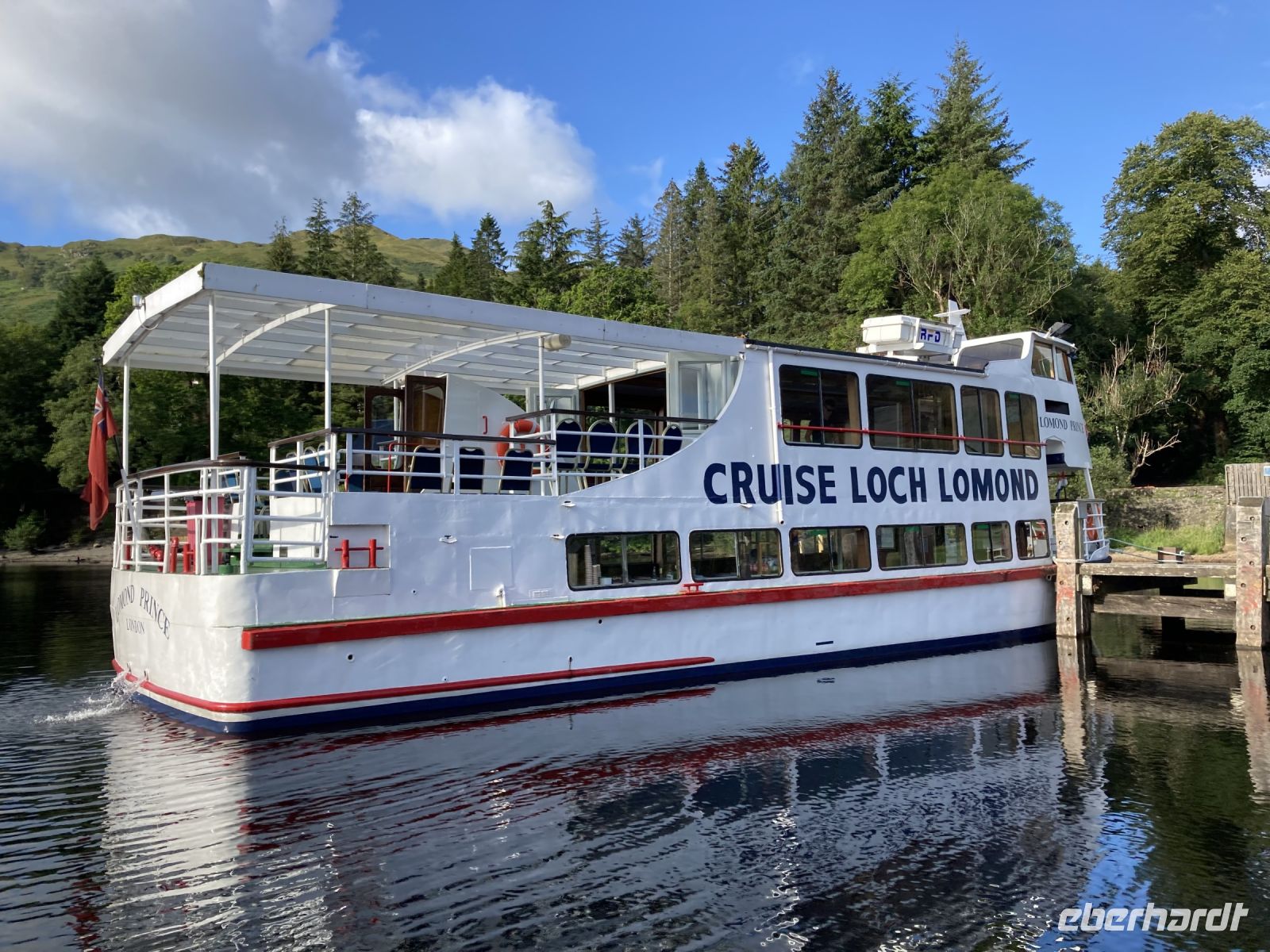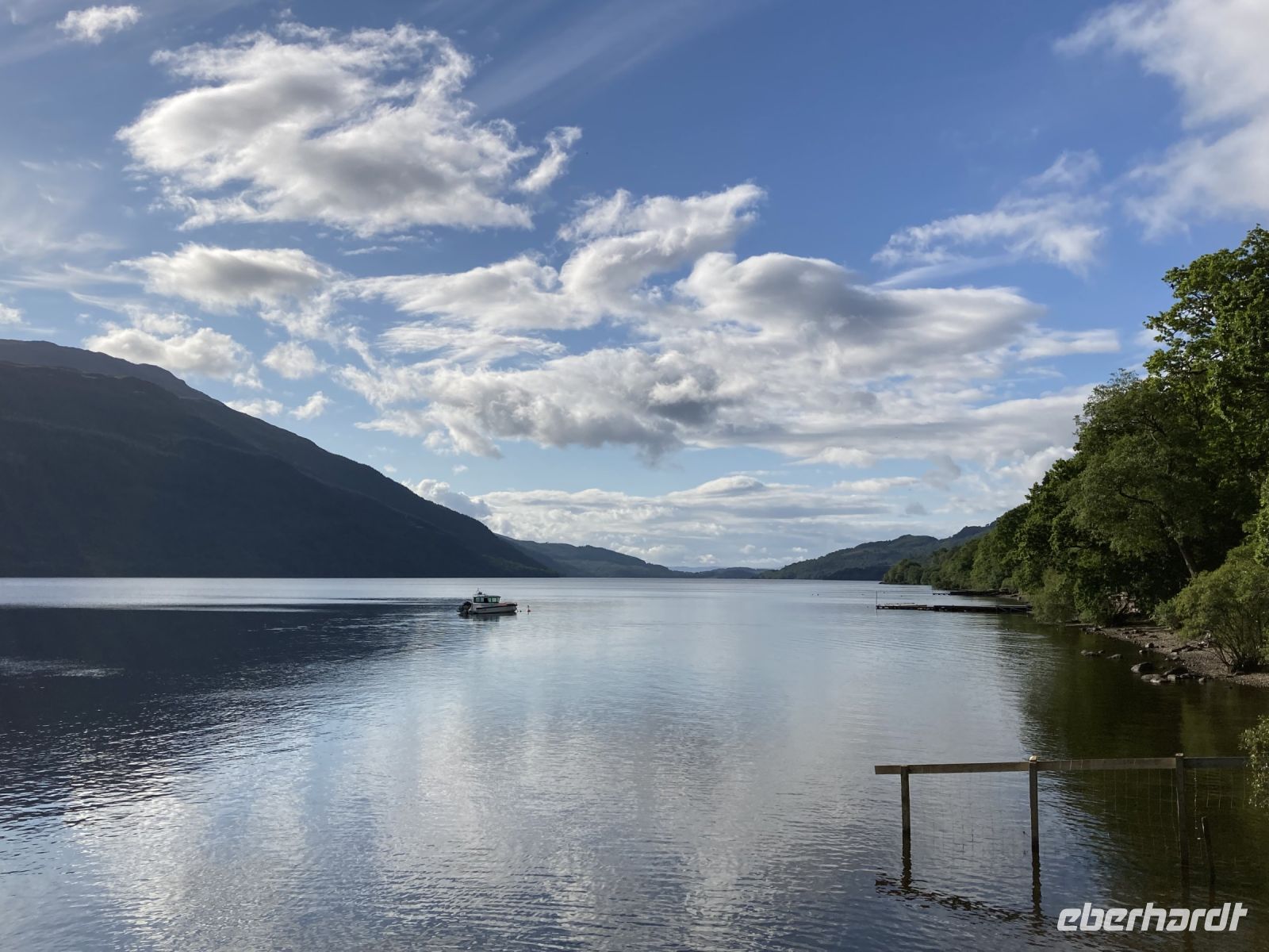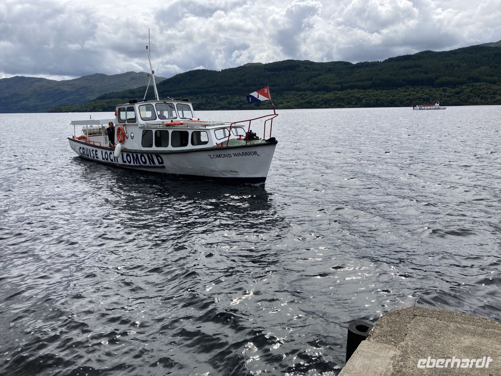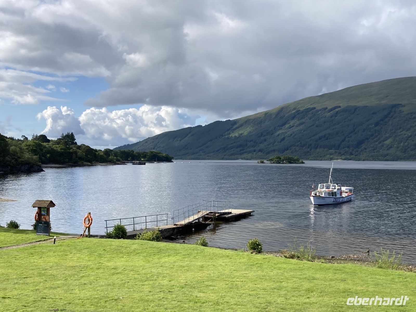 Nach dem Trubel am ersten Tag zieht es uns hinaus in die Natur. Bei einer Wanderung am berühmten Loch Lomond wollen wir den Menschenmassen entfliehen und erste Highland-Luft schnuppern. Nach nur einer Stunde Fahrt stehen wir bereits in Tarbet am Seeufer und freuen uns über das herrliche Wetter an diesem Morgen. So kommt die traumhafte Kulisse der Berge um den See herum, insbesondere der markante Gipfel des Ben Lomond besonders gut zur Geltung. Mit einem kleinen Ausflugsboot nur für uns als Gruppe werden wir zur Jugendherberge von Rowardennan am anderen Ufer gebracht. Unterwegs fischen wir ein großes Stück Plastikmüll aus dem See, das sich als Einstiegstreppe eines anderen Bootes entpuppt. Wie ist die hier mitten in den See gekommen? In Rowardennan sieht der West Highland Way noch ganz breit und harmlos aus, doch die Tagesetappe nach Inversnaid (ca. 12 km offiziell) hat es durchaus in sich. Zwei längere Abschnitte führen auf einem Pfad fast unmittelbar am Seeufer entlang über Stock und Stein — alles machbar, aber wir müssen schon auf den Weg achten. Das ist nicht immer leicht, denn viel lieber würden wir stattdessen den Wald um uns herum, die Strände uns Buchten am See, die kleinen Bäche und Wasserfälle, die eindrucksvollen Felsen und die wunderschöne Highland-Landschaft am anderen Ufer betrachten. Immer mal wieder regnet es im Verlauf der Wanderung ganz leicht, vor allem in der zweiten Hälfte, doch das Anziehen der Regenjacke lohnt sich kaum, so schnell ist die Wolke wieder über uns hinweggezogen. Auch von den berühmt-berüchtigten schottischen Midges bleiben wir fast vollständig verschont. Nach ca. 5 Stunden (mit mehreren kleineren und größeren Pausen, u. a. an einer Schutzhütte im Wald) haben wir unser Ziel erreicht: das Inversnaid Hotel. Die Freude über ein kühles Bier ist jetzt groß bei meinen Gästen — und das haben sie sich auch redlich verdient. Eine Stunde haben Durst und Hunger jetzt Zeit, bevor wir vom gleichen Boot mit gleicher Crew über den See zurück nach Tarbet gebracht werden. Neil ist mit dem Bus zum Glück noch da und hat uns schon erwartet. Er fährt uns sicher zum Hotel zurück, diesmal über die Erskine Bridge über den Clyde und durch eine Regenhusche. Und er kann uns sogar vor dem Hotel absetzen, obwohl die Straße noch gesperrt sein sollte. Ein glücklicher Abschluss eines zwar auch anstrengenden, aber sehr schönen Tages im Loch-Lomond-and-the-Trossachs-Nationalpark.