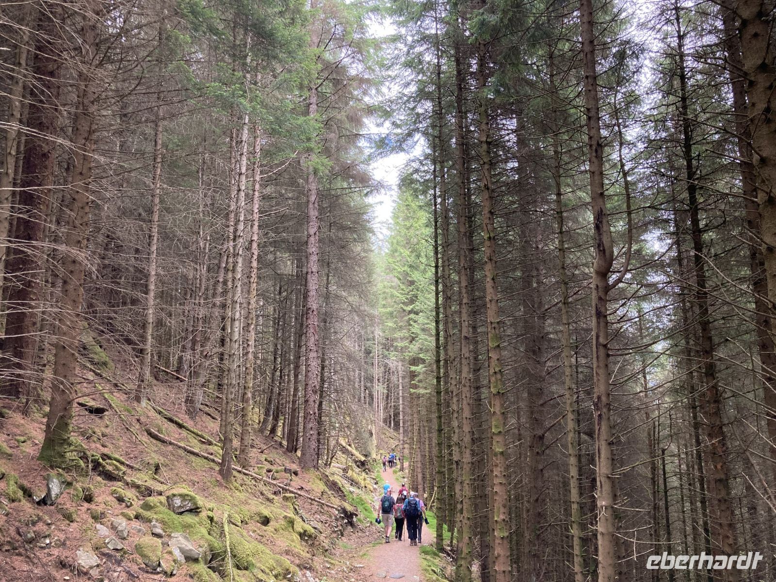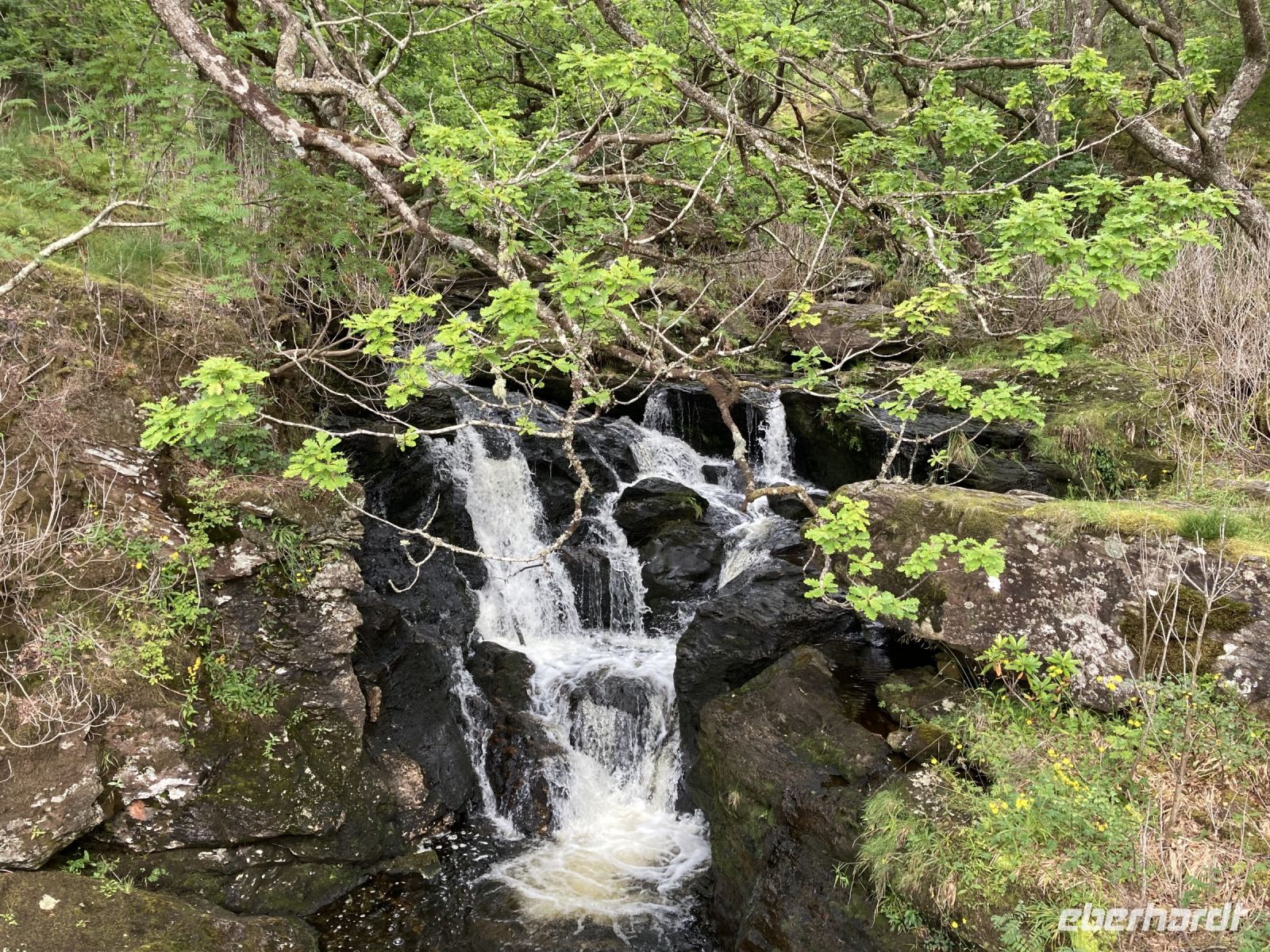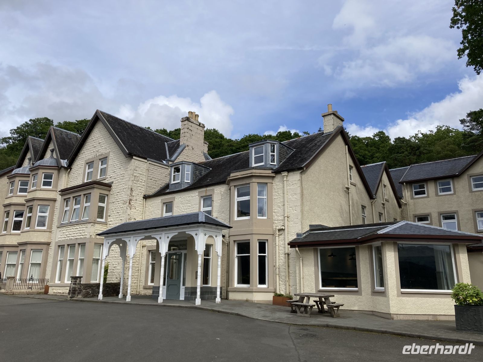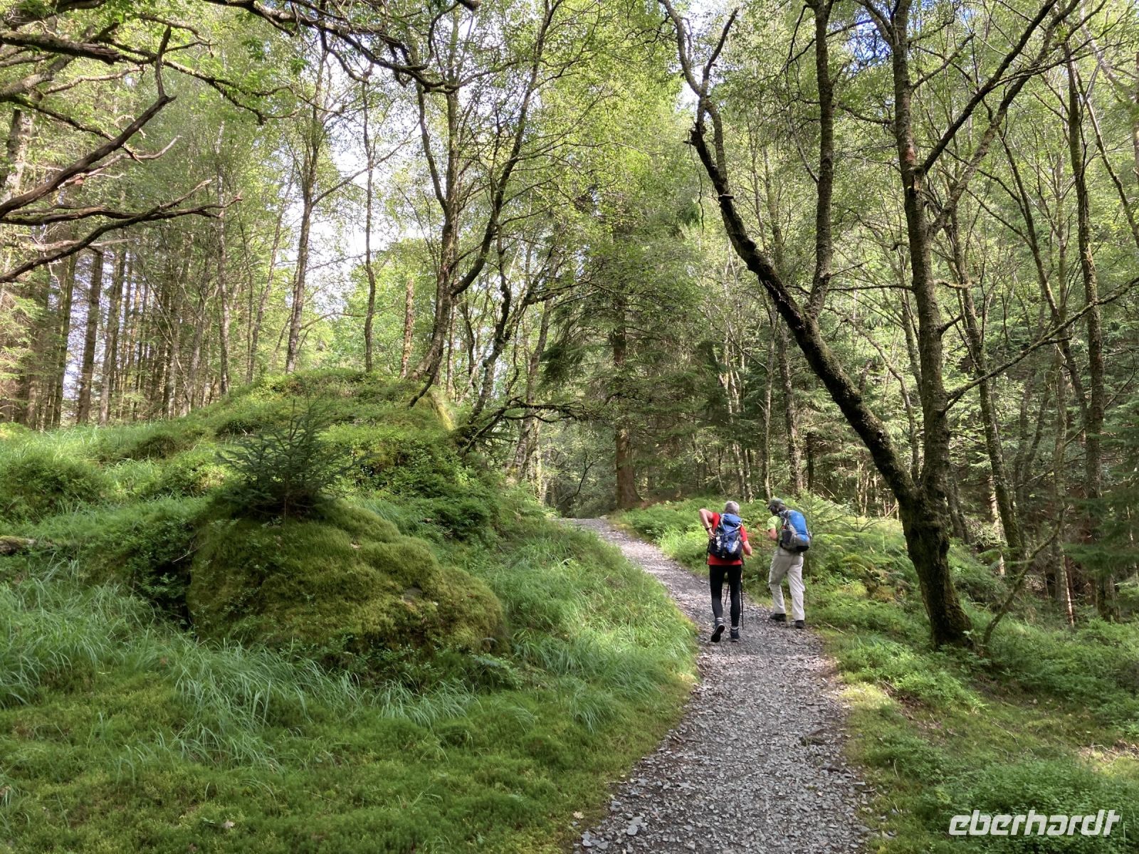 Nach dem Trubel am ersten Tag zieht es uns hinaus in die Natur. Bei einer Wanderung am berühmten Loch Lomond wollen wir den Menschenmassen entfliehen und erste Highland-Luft schnuppern. Nach nur einer Stunde Fahrt stehen wir bereits in Tarbet am Seeufer und freuen uns über das herrliche Wetter an diesem Morgen. So kommt die traumhafte Kulisse der Berge um den See herum, insbesondere der markante Gipfel des Ben Lomond besonders gut zur Geltung. Mit einem kleinen Ausflugsboot nur für uns als Gruppe werden wir zur Jugendherberge von Rowardennan am anderen Ufer gebracht. Unterwegs fischen wir ein großes Stück Plastikmüll aus dem See, das sich als Einstiegstreppe eines anderen Bootes entpuppt. Wie ist die hier mitten in den See gekommen? In Rowardennan sieht der West Highland Way noch ganz breit und harmlos aus, doch die Tagesetappe nach Inversnaid (ca. 12 km offiziell) hat es durchaus in sich. Zwei längere Abschnitte führen auf einem Pfad fast unmittelbar am Seeufer entlang über Stock und Stein — alles machbar, aber wir müssen schon auf den Weg achten. Das ist nicht immer leicht, denn viel lieber würden wir stattdessen den Wald um uns herum, die Strände uns Buchten am See, die kleinen Bäche und Wasserfälle, die eindrucksvollen Felsen und die wunderschöne Highland-Landschaft am anderen Ufer betrachten. Immer mal wieder regnet es im Verlauf der Wanderung ganz leicht, vor allem in der zweiten Hälfte, doch das Anziehen der Regenjacke lohnt sich kaum, so schnell ist die Wolke wieder über uns hinweggezogen. Auch von den berühmt-berüchtigten schottischen Midges bleiben wir fast vollständig verschont. Nach ca. 5 Stunden (mit mehreren kleineren und größeren Pausen, u. a. an einer Schutzhütte im Wald) haben wir unser Ziel erreicht: das Inversnaid Hotel. Die Freude über ein kühles Bier ist jetzt groß bei meinen Gästen — und das haben sie sich auch redlich verdient. Eine Stunde haben Durst und Hunger jetzt Zeit, bevor wir vom gleichen Boot mit gleicher Crew über den See zurück nach Tarbet gebracht werden. Neil ist mit dem Bus zum Glück noch da und hat uns schon erwartet. Er fährt uns sicher zum Hotel zurück, diesmal über die Erskine Bridge über den Clyde und durch eine Regenhusche. Und er kann uns sogar vor dem Hotel absetzen, obwohl die Straße noch gesperrt sein sollte. Ein glücklicher Abschluss eines zwar auch anstrengenden, aber sehr schönen Tages im Loch-Lomond-and-the-Trossachs-Nationalpark.