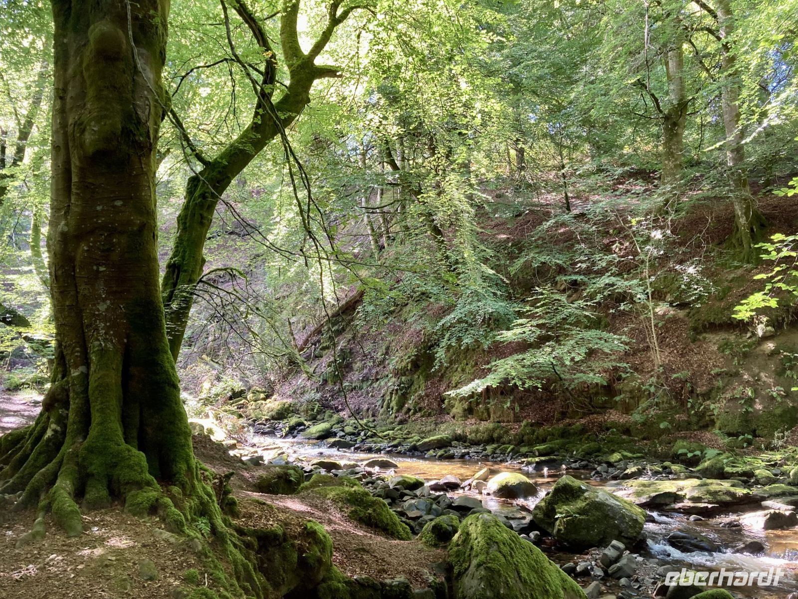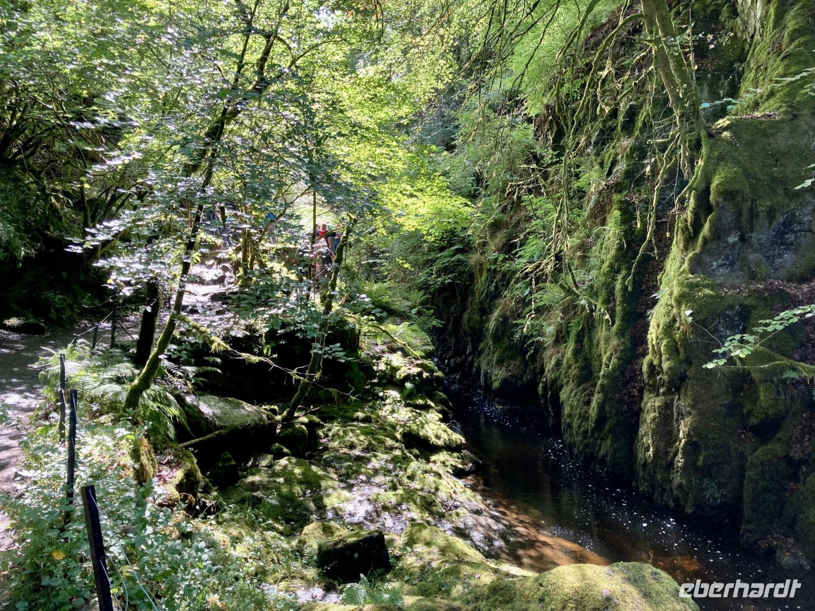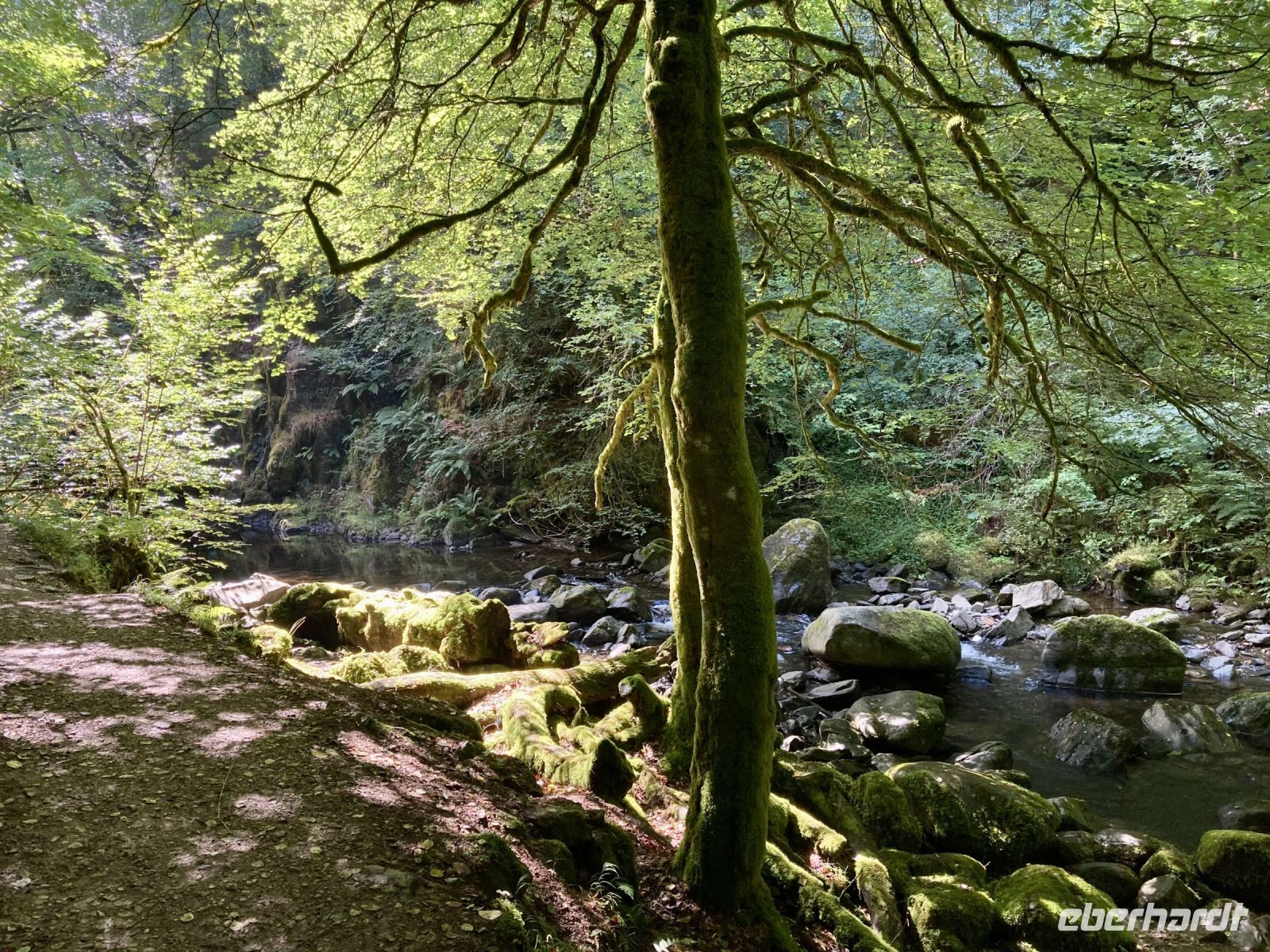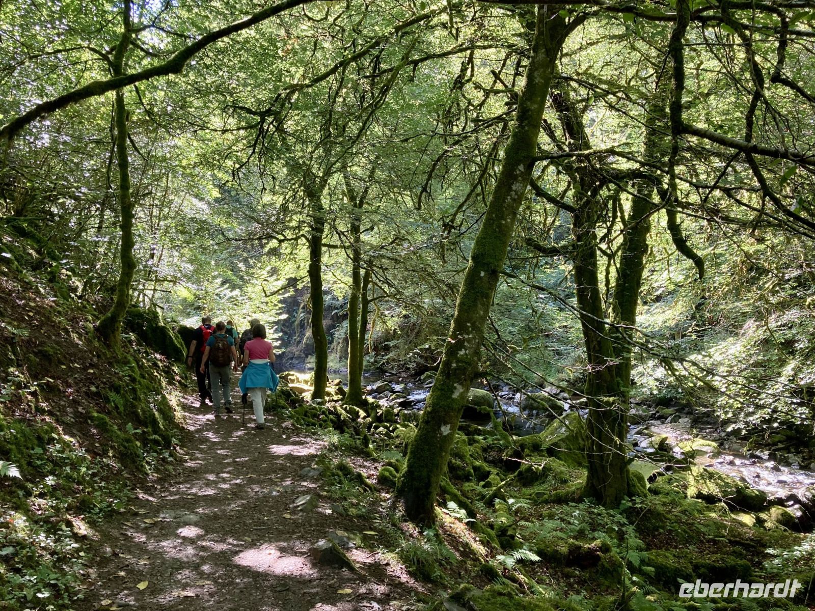 Nach dem Trubel am ersten Tag zieht es uns hinaus in die Natur. Bei einer Wanderung am berühmten Loch Lomond wollen wir den Menschenmassen entfliehen und erste Highland-Luft schnuppern. Nach nur einer Stunde Fahrt stehen wir bereits in Tarbet am Seeufer und freuen uns über das herrliche Wetter an diesem Morgen. So kommt die traumhafte Kulisse der Berge um den See herum, insbesondere der markante Gipfel des Ben Lomond besonders gut zur Geltung. Mit einem kleinen Ausflugsboot nur für uns als Gruppe werden wir zur Jugendherberge von Rowardennan am anderen Ufer gebracht. Unterwegs fischen wir ein großes Stück Plastikmüll aus dem See, das sich als Einstiegstreppe eines anderen Bootes entpuppt. Wie ist die hier mitten in den See gekommen? In Rowardennan sieht der West Highland Way noch ganz breit und harmlos aus, doch die Tagesetappe nach Inversnaid (ca. 12 km offiziell) hat es durchaus in sich. Zwei längere Abschnitte führen auf einem Pfad fast unmittelbar am Seeufer entlang über Stock und Stein — alles machbar, aber wir müssen schon auf den Weg achten. Das ist nicht immer leicht, denn viel lieber würden wir stattdessen den Wald um uns herum, die Strände uns Buchten am See, die kleinen Bäche und Wasserfälle, die eindrucksvollen Felsen und die wunderschöne Highland-Landschaft am anderen Ufer betrachten. Immer mal wieder regnet es im Verlauf der Wanderung ganz leicht, vor allem in der zweiten Hälfte, doch das Anziehen der Regenjacke lohnt sich kaum, so schnell ist die Wolke wieder über uns hinweggezogen. Auch von den berühmt-berüchtigten schottischen Midges bleiben wir fast vollständig verschont. Nach ca. 5 Stunden (mit mehreren kleineren und größeren Pausen, u. a. an einer Schutzhütte im Wald) haben wir unser Ziel erreicht: das Inversnaid Hotel. Die Freude über ein kühles Bier ist jetzt groß bei meinen Gästen — und das haben sie sich auch redlich verdient. Eine Stunde haben Durst und Hunger jetzt Zeit, bevor wir vom gleichen Boot mit gleicher Crew über den See zurück nach Tarbet gebracht werden. Neil ist mit dem Bus zum Glück noch da und hat uns schon erwartet. Er fährt uns sicher zum Hotel zurück, diesmal über die Erskine Bridge über den Clyde und durch eine Regenhusche. Und er kann uns sogar vor dem Hotel absetzen, obwohl die Straße noch gesperrt sein sollte. Ein glücklicher Abschluss eines zwar auch anstrengenden, aber sehr schönen Tages im Loch-Lomond-and-the-Trossachs-Nationalpark.