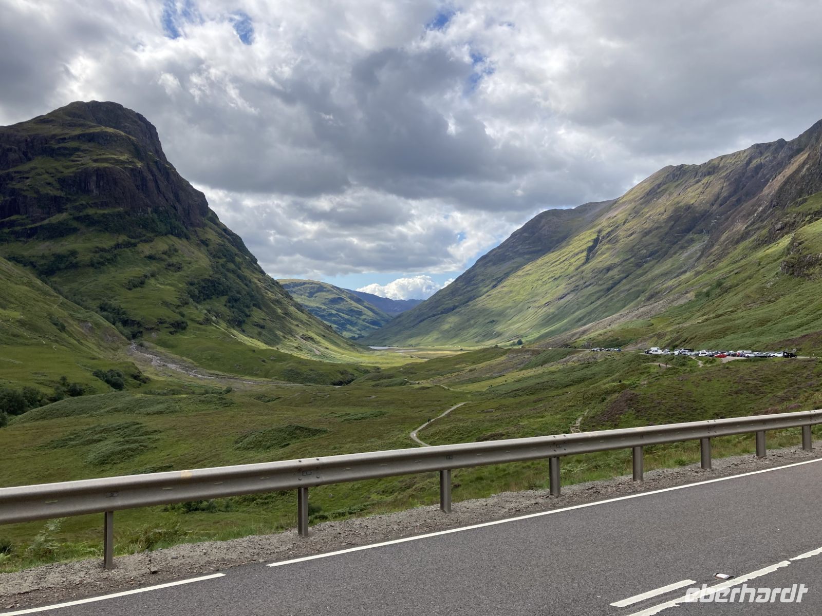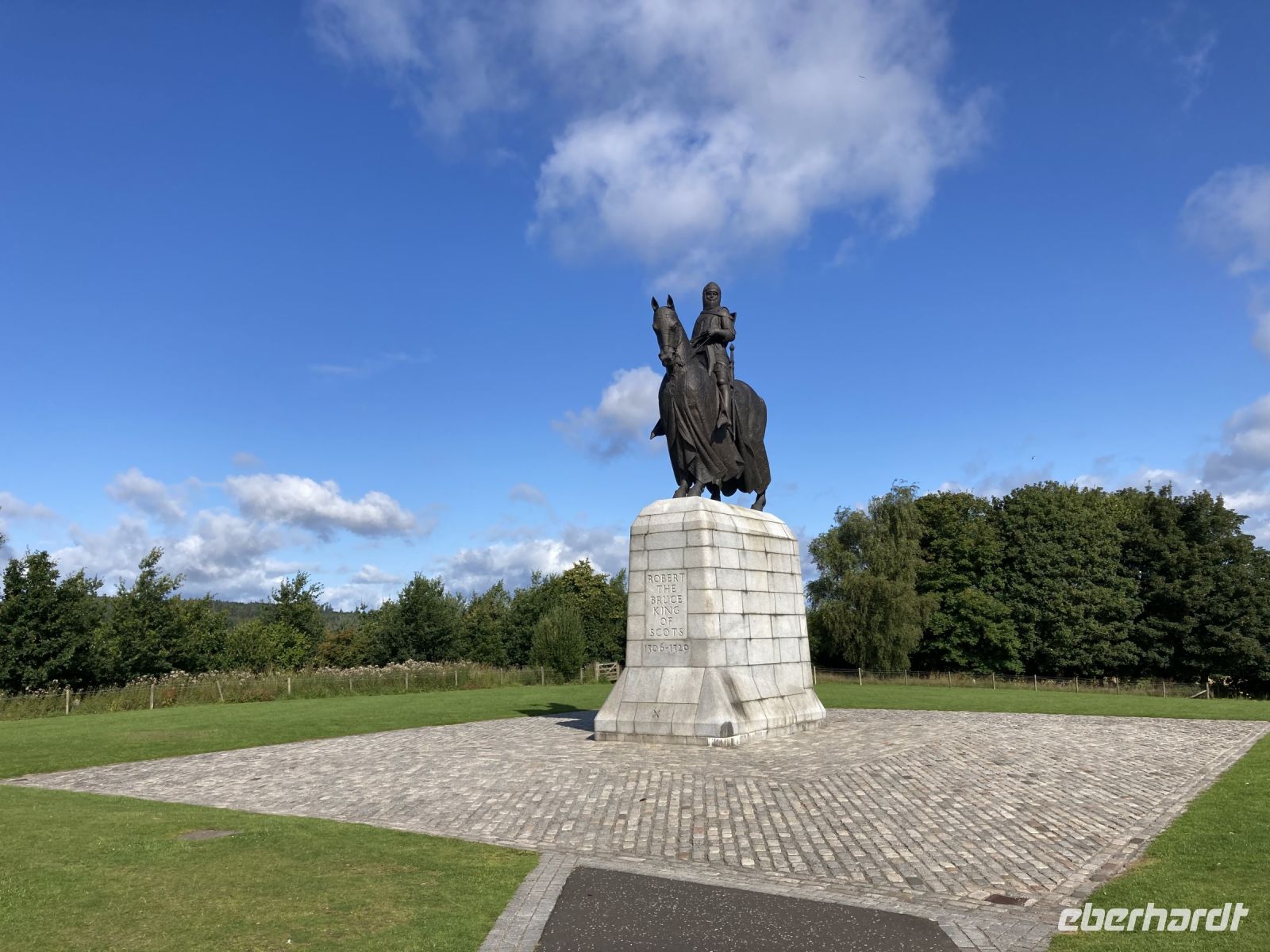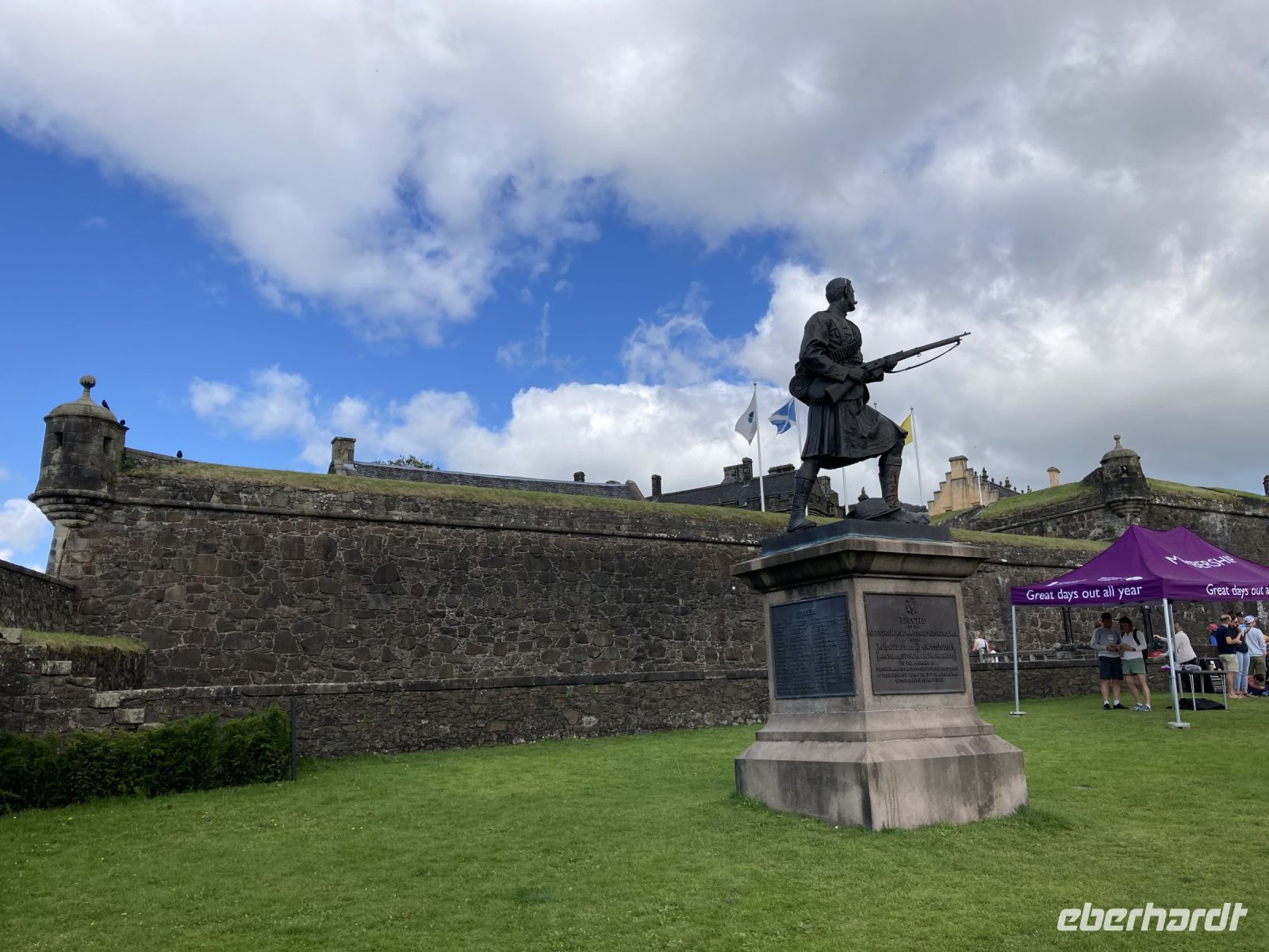 Nach dem gestrigen Tag lasse ich meine Gäste heute etwas länger (aus)schlafen. Erst um 9 Uhr verlassen wir Glasgow. Wie schon im 13. Jahrhundert die Engländer wollen wir uns die Highlands über Stirling erschließen — wir kommen allerdings in friedlicher Absicht und wollen nicht plündern, sondern sogar etwas Geld dalassen. Deshalb werden wir auch nicht aufgehalten, wie es dereinst William Wallace und Robert the Bruce mit den englischen Armeen taten. Beiden Helden der Unabhängigkeitskriege wurden monumentale Denkmäler errichtet; wir besuchen das Reiterdenkmal von Robert the Bruce auf dem Schlachtfeld von Bannockburn. In der Ferne können wir bereits das Stirling Castle auf dem Hügel sehen. Das Wetter ist wieder toll heute morgen und soll laut Vorhersage bis Donnerstag erstmal so bleiben — mit Temperaturen von bis zu 22 Grad. In Stirling holt uns dann die Radrenn-WM noch einmal ein. Obwohl das Rennen erst morgen ist, stehen schon viele Absperrungen und wir werden nicht zum Castle durchgelassen. Wir steigen in der Altstadt an einer Bushaltestelle aus und laufen den Hügel hinauf bis zur Burg. Hier können wir ein paar Fotos machen (soweit es durch die Absperrungen möglich ist), dann laufen wir langsam den Hügel hinunter durch das historische Stadtzentrum und schauen uns u. a. das Old Town Jail an (allerdings lieber nur von außen). Meine Gäste haben noch Zeit für eine Mittagspause und/oder ein paar Besorgungen im Shopping Centre, bevor wir die Stadt verlassen und nun tief in die Highlands vorstoßen — nicht ohne allerdings noch einen letzten Fotostopp unterhalb der Burg einzulegen. Wir durchqueren noch einige Orte, dann sind wir wieder im Loch Lomond and the Trossachs Nationalpark. Die vorbeiziehende weite grüne Landschaft mit ihren großen Hügeln, Lochs und kleinen Wäldchen zieht uns nun schnell in ihren Bann. Richtig spektakulär wird es dann nach der Kaffeepause im Glencoe, weshalb wir uns am Fuße der „Drei Schwestern“ auch die Zeit für zwei Fotostopps nehmen. Bald darauf erreichen wir den Loch Linnhe und nähern uns Fort William am westlichen Ende des Great Glen. Heute fahren wir nur durch den Ort durch, morgen jedoch soll hier vom Bahnhof aus ein weiteres großes Abenteuer für uns alle starten! Hinter Fort William erstreckt sich auch das malerische Glen Nevis am Fuße des höchsten Berges Großbritanniens. In diesem schönen Tal vertreten wir uns nun bei einer kleinen Wanderung die Füße und versuchen, den Gipfel des Ben Nevis auszumachen. Zumindest der serpentinenartige Aufstieg dorthin lässt sich aus unserer Perspektive gut erkennen. Einen viel schöneren Anblick bieten uns aber (meiner Meinung nach) die drei schüchternen zotteligen Highland-Rinder auf einer Weide neben unserem Wanderweg. An unserem Hotel für die nächsten zwei Nächte sind wir auf dem Hinweg schon vorbeigefahren; es liegt ein Stück südlich von Fort William und bietet nicht nur eine große Whisky-Auswahl, sondern auch eine herrliche Aussicht über den Loch Linnhe. Neil bringt uns sicher dorthin und freut sich auf seinen morgigen freien Tag. Sollte das Wetter wieder so sein wie heute, kann es nur toll werden!
