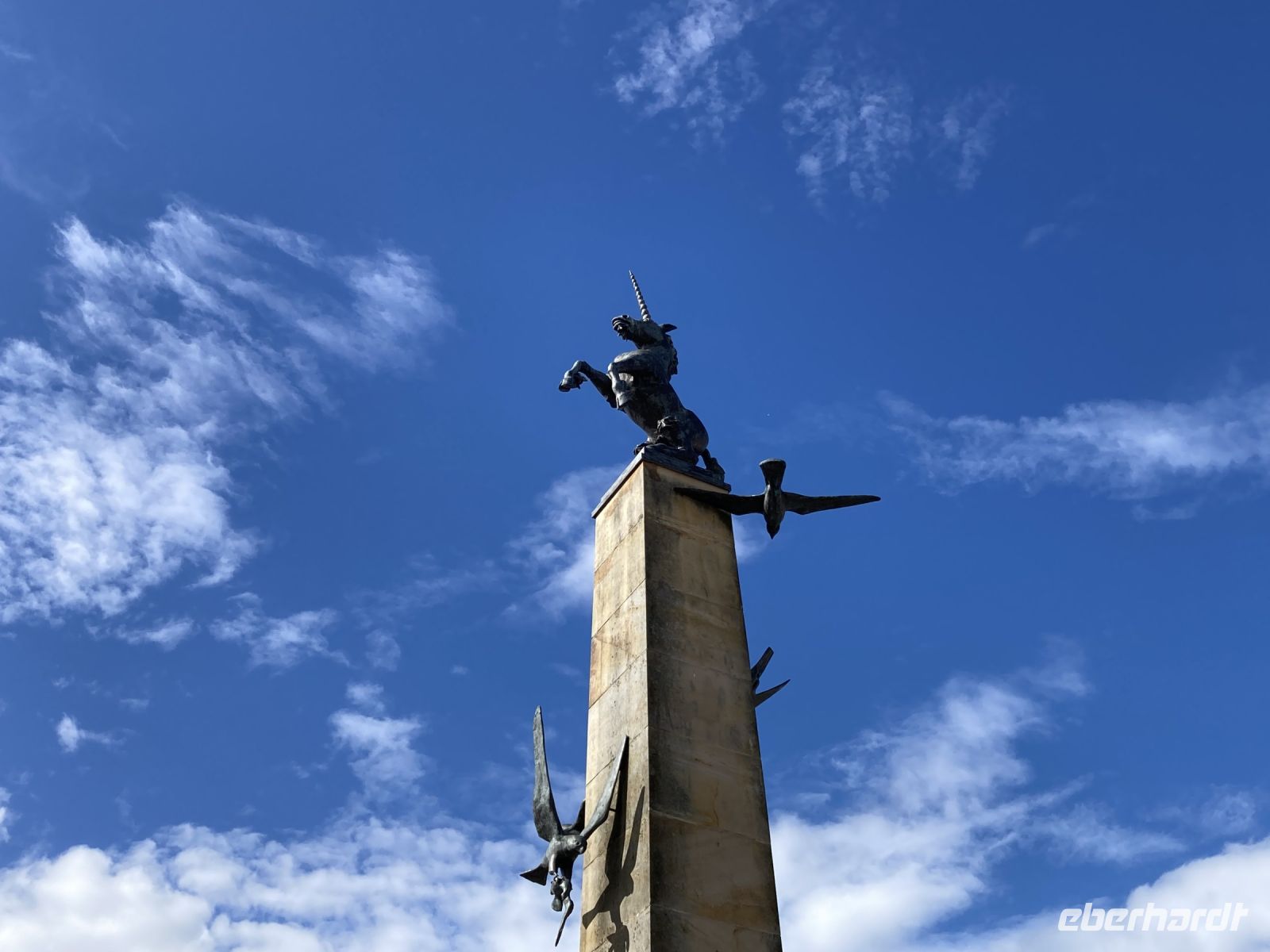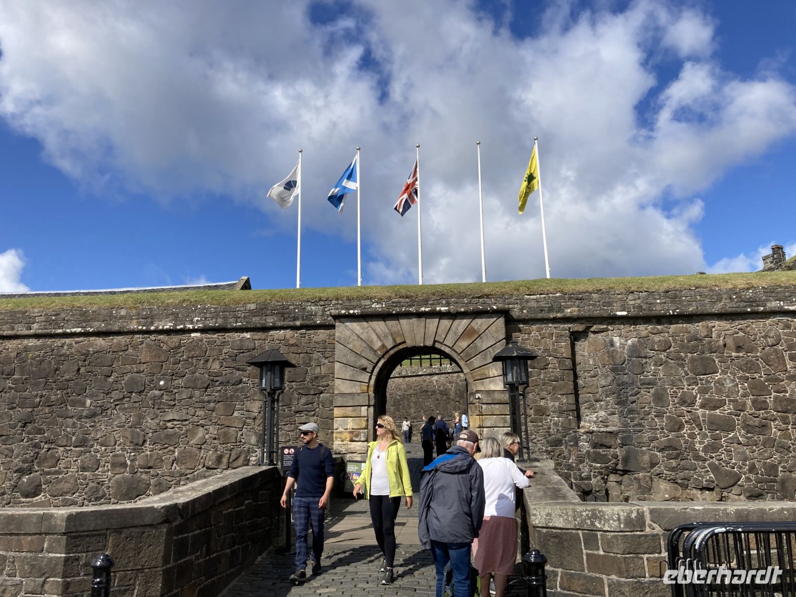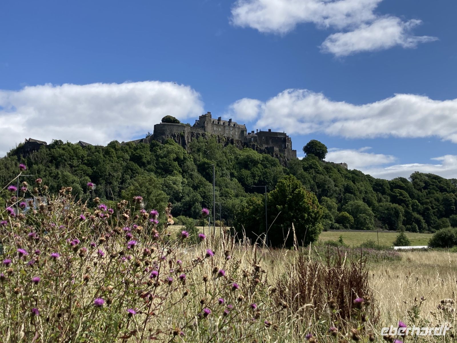 Nach dem gestrigen Tag lasse ich meine Gäste heute etwas länger (aus)schlafen. Erst um 9 Uhr verlassen wir Glasgow. Wie schon im 13. Jahrhundert die Engländer wollen wir uns die Highlands über Stirling erschließen — wir kommen allerdings in friedlicher Absicht und wollen nicht plündern, sondern sogar etwas Geld dalassen. Deshalb werden wir auch nicht aufgehalten, wie es dereinst William Wallace und Robert the Bruce mit den englischen Armeen taten. Beiden Helden der Unabhängigkeitskriege wurden monumentale Denkmäler errichtet; wir besuchen das Reiterdenkmal von Robert the Bruce auf dem Schlachtfeld von Bannockburn. In der Ferne können wir bereits das Stirling Castle auf dem Hügel sehen. Das Wetter ist wieder toll heute morgen und soll laut Vorhersage bis Donnerstag erstmal so bleiben — mit Temperaturen von bis zu 22 Grad. In Stirling holt uns dann die Radrenn-WM noch einmal ein. Obwohl das Rennen erst morgen ist, stehen schon viele Absperrungen und wir werden nicht zum Castle durchgelassen. Wir steigen in der Altstadt an einer Bushaltestelle aus und laufen den Hügel hinauf bis zur Burg. Hier können wir ein paar Fotos machen (soweit es durch die Absperrungen möglich ist), dann laufen wir langsam den Hügel hinunter durch das historische Stadtzentrum und schauen uns u. a. das Old Town Jail an (allerdings lieber nur von außen). Meine Gäste haben noch Zeit für eine Mittagspause und/oder ein paar Besorgungen im Shopping Centre, bevor wir die Stadt verlassen und nun tief in die Highlands vorstoßen — nicht ohne allerdings noch einen letzten Fotostopp unterhalb der Burg einzulegen. Wir durchqueren noch einige Orte, dann sind wir wieder im Loch Lomond and the Trossachs Nationalpark. Die vorbeiziehende weite grüne Landschaft mit ihren großen Hügeln, Lochs und kleinen Wäldchen zieht uns nun schnell in ihren Bann. Richtig spektakulär wird es dann nach der Kaffeepause im Glencoe, weshalb wir uns am Fuße der „Drei Schwestern“ auch die Zeit für zwei Fotostopps nehmen. Bald darauf erreichen wir den Loch Linnhe und nähern uns Fort William am westlichen Ende des Great Glen. Heute fahren wir nur durch den Ort durch, morgen jedoch soll hier vom Bahnhof aus ein weiteres großes Abenteuer für uns alle starten! Hinter Fort William erstreckt sich auch das malerische Glen Nevis am Fuße des höchsten Berges Großbritanniens. In diesem schönen Tal vertreten wir uns nun bei einer kleinen Wanderung die Füße und versuchen, den Gipfel des Ben Nevis auszumachen. Zumindest der serpentinenartige Aufstieg dorthin lässt sich aus unserer Perspektive gut erkennen. Einen viel schöneren Anblick bieten uns aber (meiner Meinung nach) die drei schüchternen zotteligen Highland-Rinder auf einer Weide neben unserem Wanderweg. An unserem Hotel für die nächsten zwei Nächte sind wir auf dem Hinweg schon vorbeigefahren; es liegt ein Stück südlich von Fort William und bietet nicht nur eine große Whisky-Auswahl, sondern auch eine herrliche Aussicht über den Loch Linnhe. Neil bringt uns sicher dorthin und freut sich auf seinen morgigen freien Tag. Sollte das Wetter wieder so sein wie heute, kann es nur toll werden!