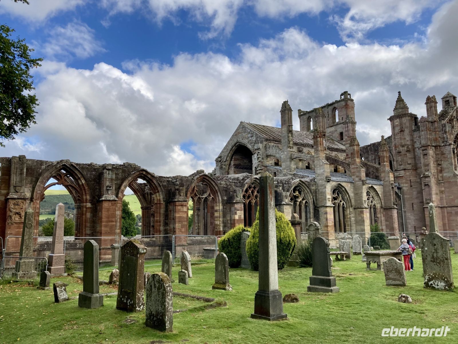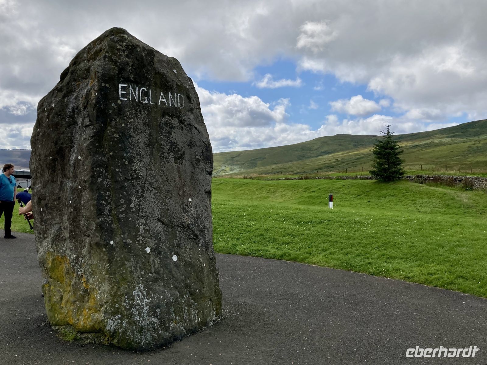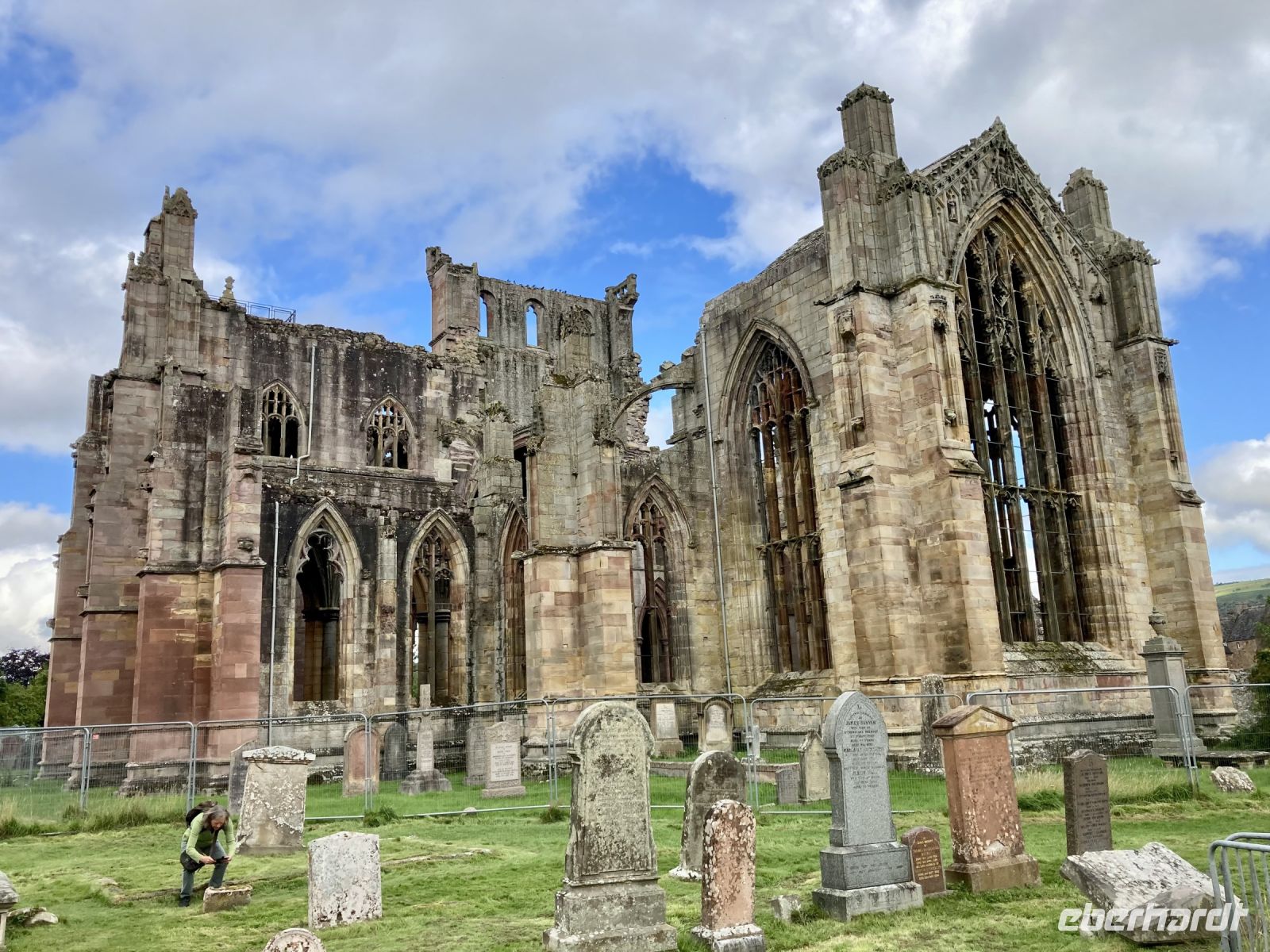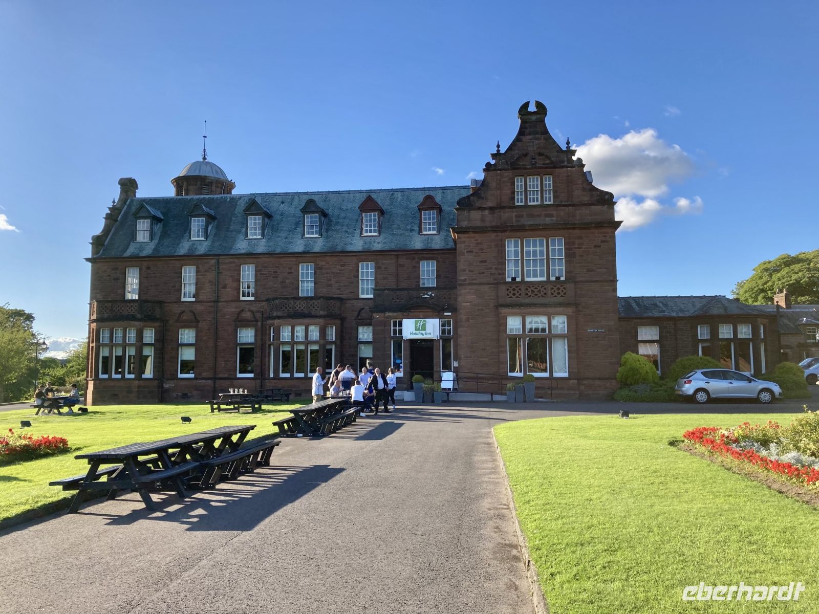 Nach dem großen Spektakel am gestrigen Abend verlassen wir die Hauptstadt noch etwas müde, aber innerlich sehr beschwingt, und ziehen gen Süden in ruhigere Regionen weiter. Schon im sehr hübschen kleinen Örtchen Melrose geht es deutlich beschaulicher zu als in Edinburgh. In den Fußstapfen von Theodor Fontane besichtigen wir — zudem zur selben Tageszeit — die Ruinen der Melrose Abbey, einer der drei großen historischen Abteien in den Scottish Borders. Hier ruht (angeblich) auch das Herz von Robert the Bruce unter einem Gedenkstein. Die Tatsache, dass es sich (nur noch) um eine Ruine handelt, macht das Bauwerk in meinen Augen nur imposanter und interessanter, da sich der innere Aufbau an vielen Stellen besser erkennen lässt. Gedanklich versuchen wir, die Reste zu erweitern und die Abtei vor unserem inneren Auge wieder zum Leben zu erwecken. Wenig später erreichen wir die Grenze zu England und machen am wuchtigen Grenzstein natürlich einen Fotostopp mit tollem Blick zurück nach Norden. Nun wird die Landschaft ziemlich hügelig und wir fühlen uns im Bus an manchen Stellen wie in einer Achterbahn. Der gute Les gibt sein Bestes und lenkt uns sicher bis an den Hadrianswall. Das Mittagspicknick gibt uns Kraft für den Aufstieg zum Museum und den Ruinen von Vercovicium, des einst größten Kastells am Wall. Eine beeindruckende Anlage, in der es vor fast 2.000 Jahren schon öffentliche Latrinen und eine Fußbodenheizung gab. Wir wollen nachempfinden, wie sich dereinst die patroullierenden römischen Soldaten gefühlt haben mussten, und brechen zu einer kleinen Wanderung entlang des Walls auf. Rechts von uns fällt die Schichtstufenlandschaft in einer Abbruchkante teils sehr steil ab — so gut wie unmöglich für die Pikten, die Grenze an dieser Stelle zu überwinden. Ziel unserer Wanderung über einige Hügel ist ein ganz bestimmter Baum, der im Kevin-Costner-Film „Robin Hood — König der Diebe“ relativ am Anfang eine prominente Rolle spielte. Wenig später verlassen wir den Wall und lassen uns vom Kaffeeduft zurück zur Hauptstraße und zu einem Besucherzentrum leiten, bei dem neben Kaffee und leckerem Eis glücklicherweise auch Les mit unserem Bus wartet. Da wir im Herzen alle Romantiker sind (ganz tief verborgen zumindest), darf auf der Weiterfahrt nach Dumfries ein kleiner Stopp in Gretna Green nicht fehlen. Und tatsächlich scheint sich gerade ein Paar am Amboss der Schmiede das Jawort gegeben zu haben und posiert nun für Fotos. Hach … Wir wünschen nur das Beste! Zumindest sahen sie nicht minderjährig aus, wie viele Paare, die hier in der Vergangenheit heirateten. Unser Hotel in Dumfries liegt sehr idyllisch im Grünen auf einem Uni-Campus, sodass wir abends noch draußen eine Runde drehen oder in der Abendsonne auf den Holzbänken vor der schicken Fassade ein Bierchen genießen können.