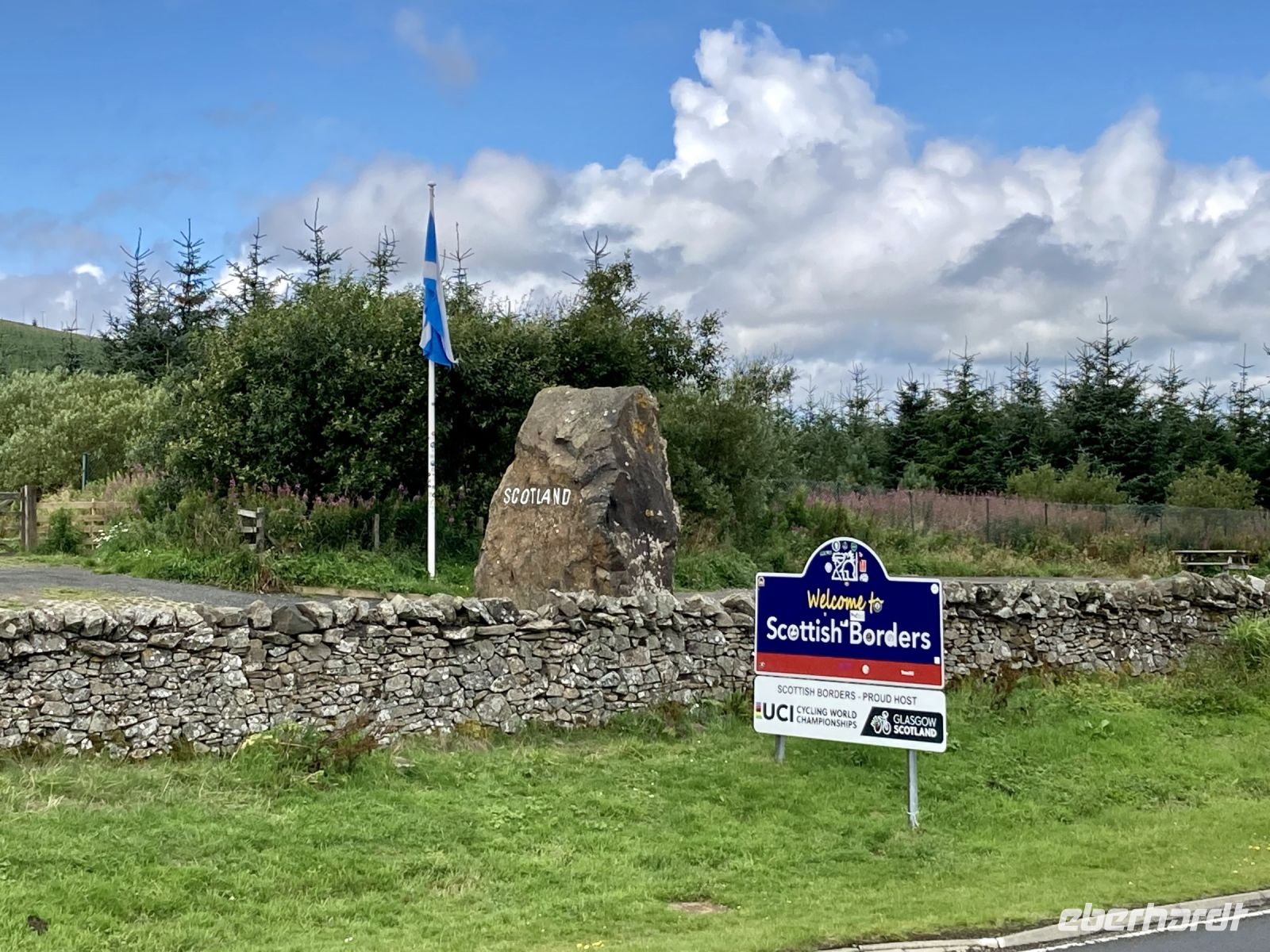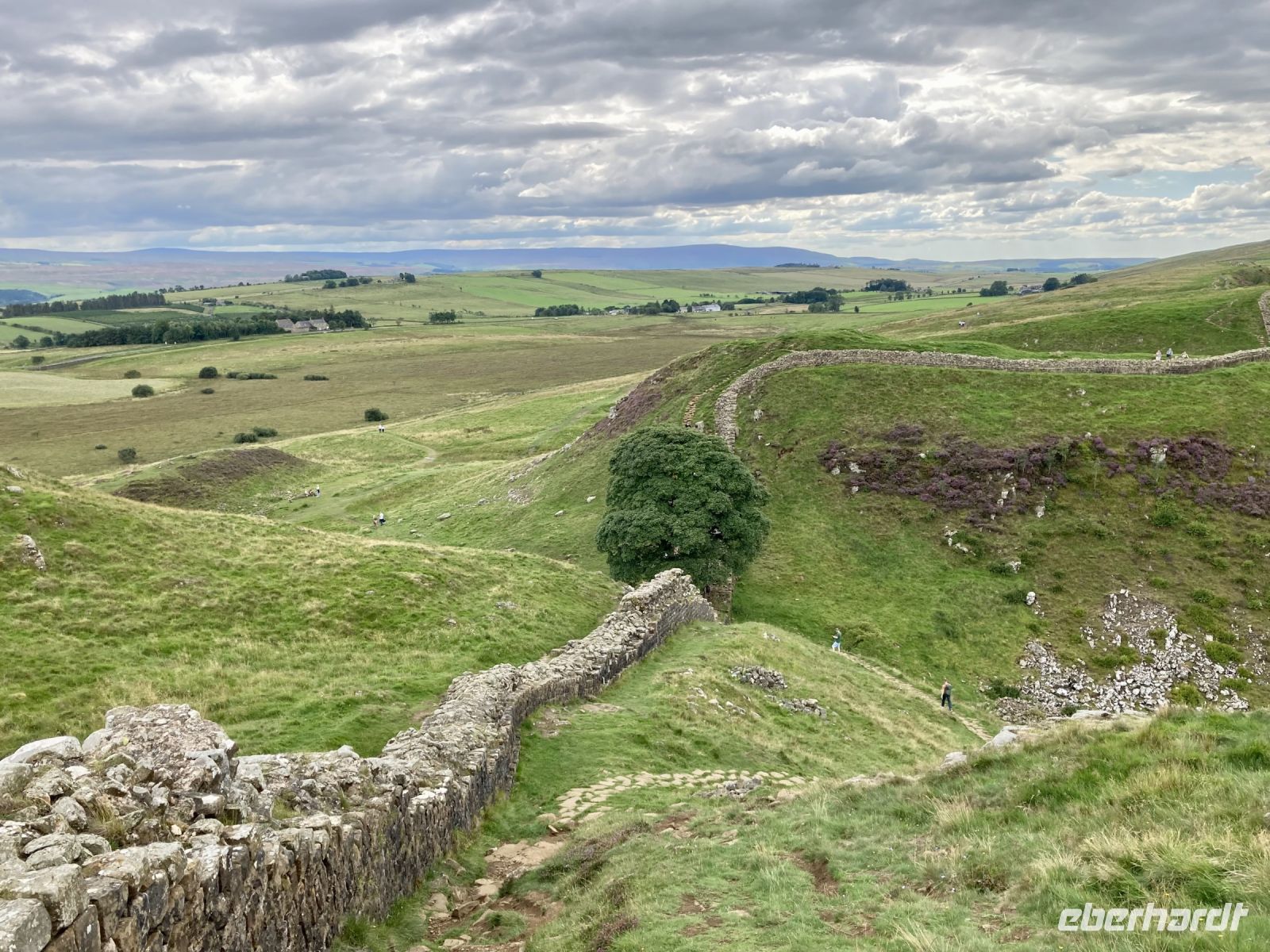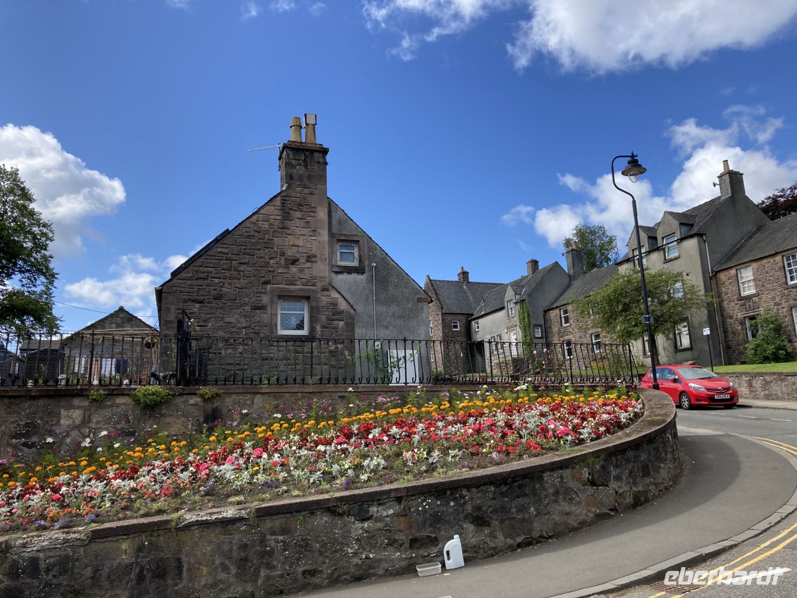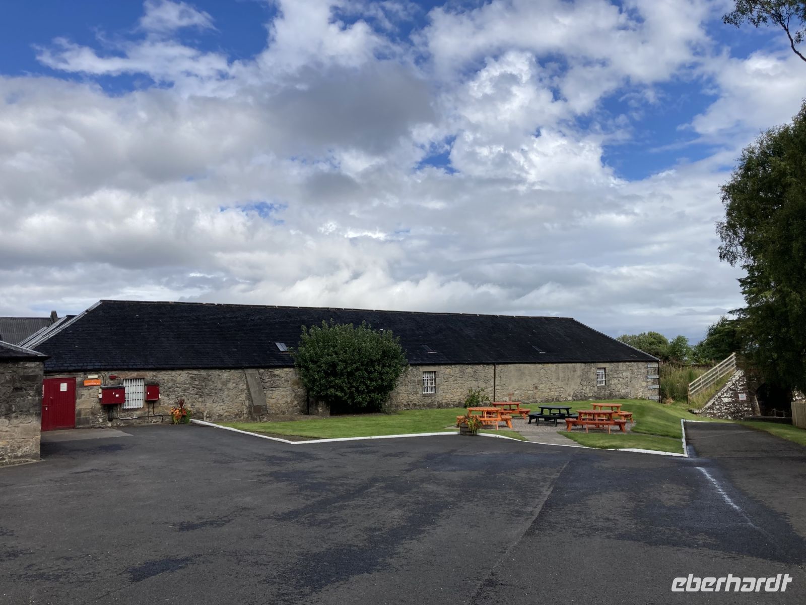 Nach dem großen Spektakel am gestrigen Abend verlassen wir die Hauptstadt noch etwas müde, aber innerlich sehr beschwingt, und ziehen gen Süden in ruhigere Regionen weiter. Schon im sehr hübschen kleinen Örtchen Melrose geht es deutlich beschaulicher zu als in Edinburgh. In den Fußstapfen von Theodor Fontane besichtigen wir — zudem zur selben Tageszeit — die Ruinen der Melrose Abbey, einer der drei großen historischen Abteien in den Scottish Borders. Hier ruht (angeblich) auch das Herz von Robert the Bruce unter einem Gedenkstein. Die Tatsache, dass es sich (nur noch) um eine Ruine handelt, macht das Bauwerk in meinen Augen nur imposanter und interessanter, da sich der innere Aufbau an vielen Stellen besser erkennen lässt. Gedanklich versuchen wir, die Reste zu erweitern und die Abtei vor unserem inneren Auge wieder zum Leben zu erwecken. Wenig später erreichen wir die Grenze zu England und machen am wuchtigen Grenzstein natürlich einen Fotostopp mit tollem Blick zurück nach Norden. Nun wird die Landschaft ziemlich hügelig und wir fühlen uns im Bus an manchen Stellen wie in einer Achterbahn. Der gute Les gibt sein Bestes und lenkt uns sicher bis an den Hadrianswall. Das Mittagspicknick gibt uns Kraft für den Aufstieg zum Museum und den Ruinen von Vercovicium, des einst größten Kastells am Wall. Eine beeindruckende Anlage, in der es vor fast 2.000 Jahren schon öffentliche Latrinen und eine Fußbodenheizung gab. Wir wollen nachempfinden, wie sich dereinst die patroullierenden römischen Soldaten gefühlt haben mussten, und brechen zu einer kleinen Wanderung entlang des Walls auf. Rechts von uns fällt die Schichtstufenlandschaft in einer Abbruchkante teils sehr steil ab — so gut wie unmöglich für die Pikten, die Grenze an dieser Stelle zu überwinden. Ziel unserer Wanderung über einige Hügel ist ein ganz bestimmter Baum, der im Kevin-Costner-Film „Robin Hood — König der Diebe“ relativ am Anfang eine prominente Rolle spielte. Wenig später verlassen wir den Wall und lassen uns vom Kaffeeduft zurück zur Hauptstraße und zu einem Besucherzentrum leiten, bei dem neben Kaffee und leckerem Eis glücklicherweise auch Les mit unserem Bus wartet. Da wir im Herzen alle Romantiker sind (ganz tief verborgen zumindest), darf auf der Weiterfahrt nach Dumfries ein kleiner Stopp in Gretna Green nicht fehlen. Und tatsächlich scheint sich gerade ein Paar am Amboss der Schmiede das Jawort gegeben zu haben und posiert nun für Fotos. Hach … Wir wünschen nur das Beste! Zumindest sahen sie nicht minderjährig aus, wie viele Paare, die hier in der Vergangenheit heirateten. Unser Hotel in Dumfries liegt sehr idyllisch im Grünen auf einem Uni-Campus, sodass wir abends noch draußen eine Runde drehen oder in der Abendsonne auf den Holzbänken vor der schicken Fassade ein Bierchen genießen können.