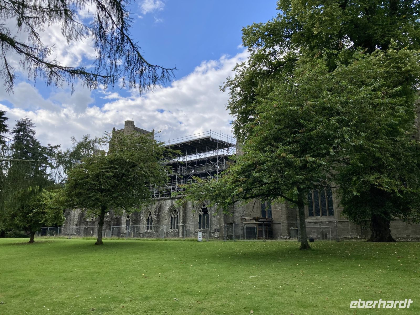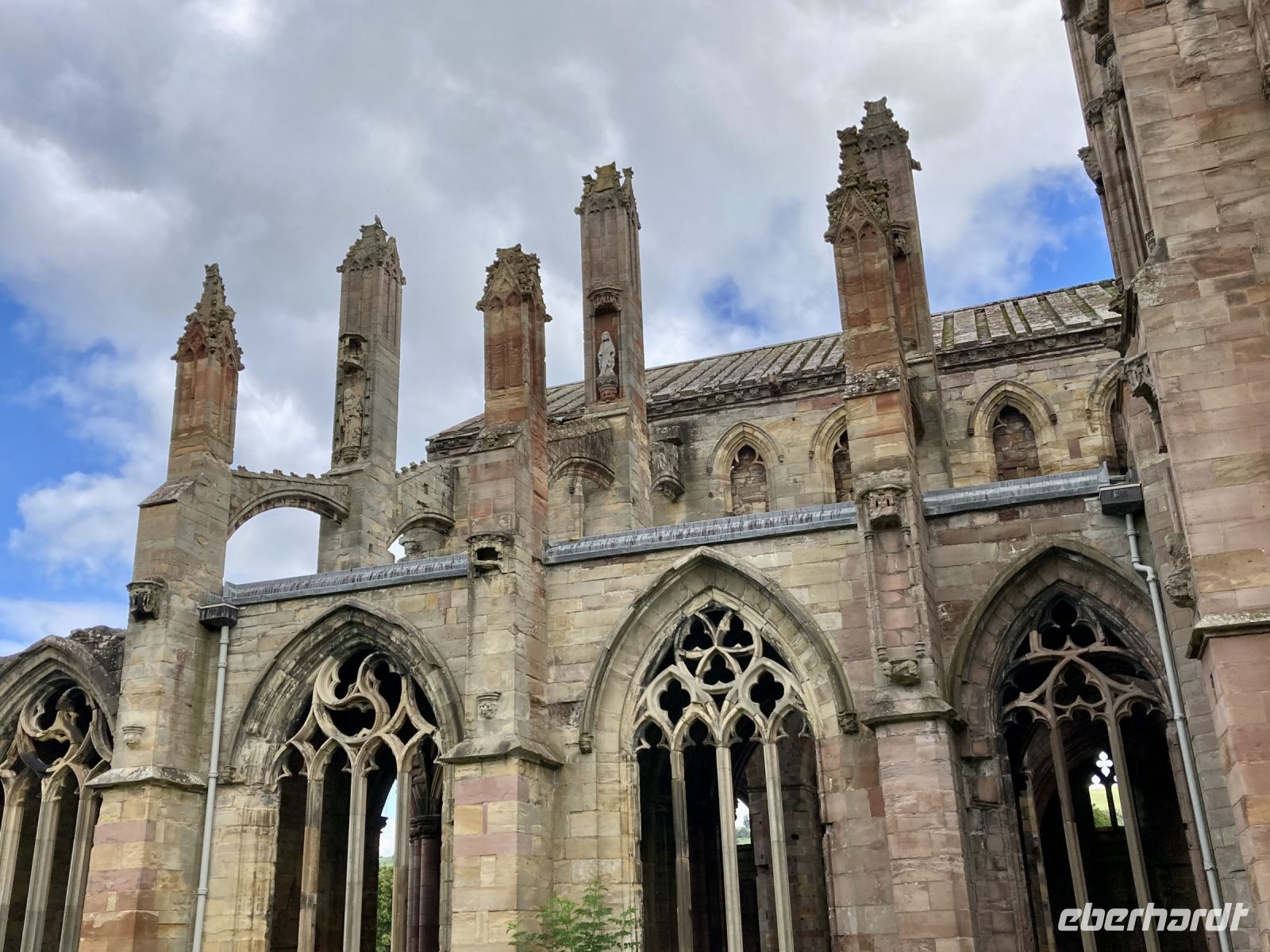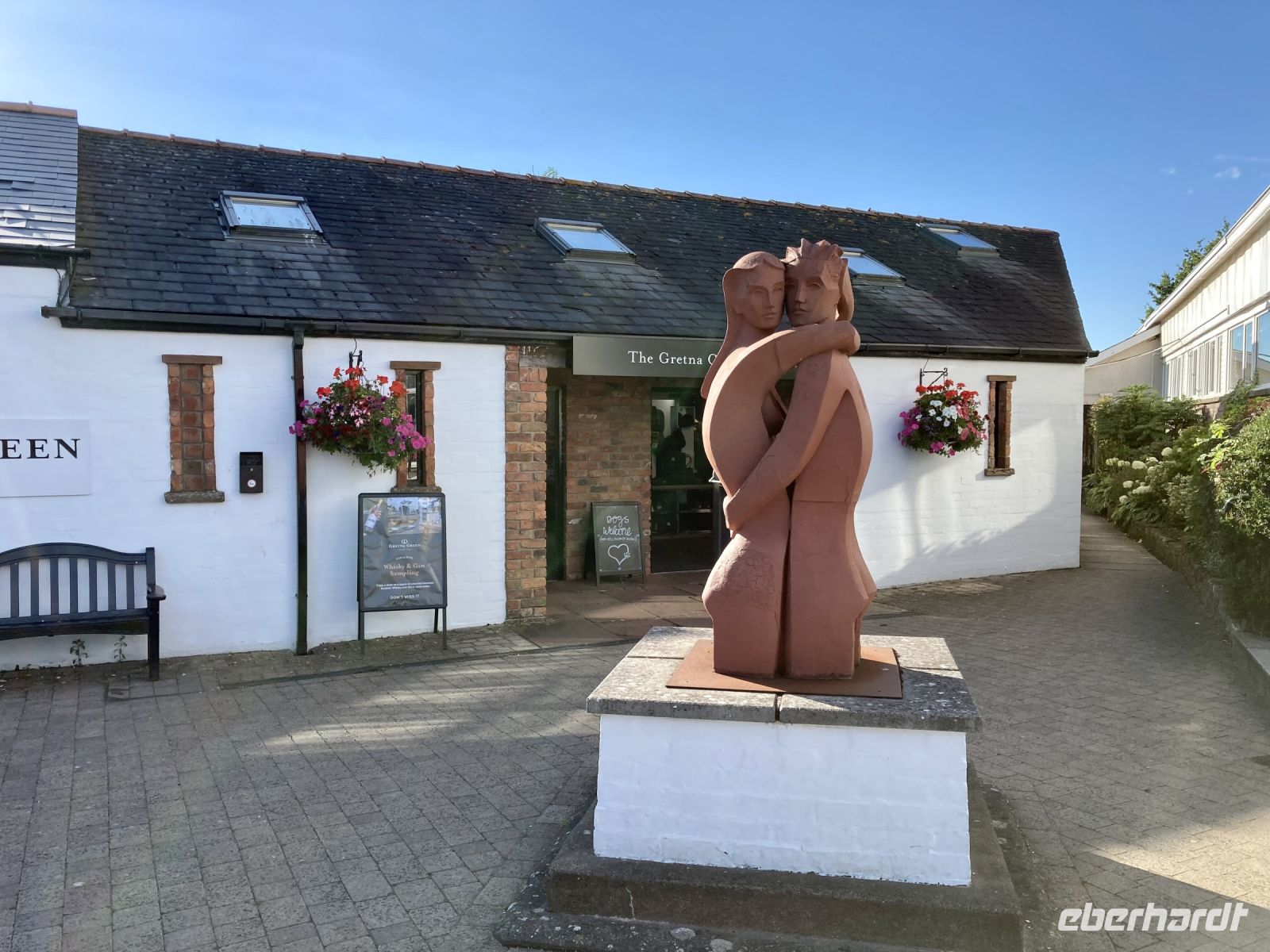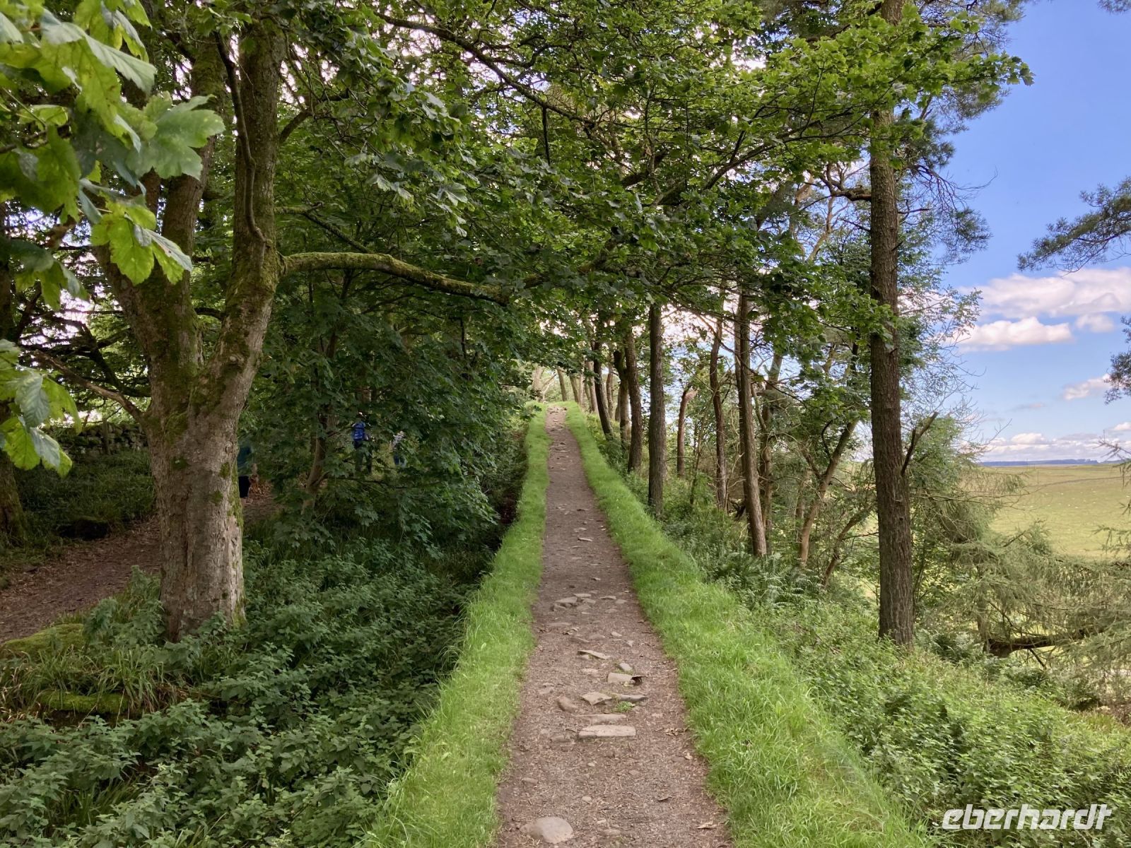 Nach dem großen Spektakel am gestrigen Abend verlassen wir die Hauptstadt noch etwas müde, aber innerlich sehr beschwingt, und ziehen gen Süden in ruhigere Regionen weiter. Schon im sehr hübschen kleinen Örtchen Melrose geht es deutlich beschaulicher zu als in Edinburgh. In den Fußstapfen von Theodor Fontane besichtigen wir — zudem zur selben Tageszeit — die Ruinen der Melrose Abbey, einer der drei großen historischen Abteien in den Scottish Borders. Hier ruht (angeblich) auch das Herz von Robert the Bruce unter einem Gedenkstein. Die Tatsache, dass es sich (nur noch) um eine Ruine handelt, macht das Bauwerk in meinen Augen nur imposanter und interessanter, da sich der innere Aufbau an vielen Stellen besser erkennen lässt. Gedanklich versuchen wir, die Reste zu erweitern und die Abtei vor unserem inneren Auge wieder zum Leben zu erwecken. Wenig später erreichen wir die Grenze zu England und machen am wuchtigen Grenzstein natürlich einen Fotostopp mit tollem Blick zurück nach Norden. Nun wird die Landschaft ziemlich hügelig und wir fühlen uns im Bus an manchen Stellen wie in einer Achterbahn. Der gute Les gibt sein Bestes und lenkt uns sicher bis an den Hadrianswall. Das Mittagspicknick gibt uns Kraft für den Aufstieg zum Museum und den Ruinen von Vercovicium, des einst größten Kastells am Wall. Eine beeindruckende Anlage, in der es vor fast 2.000 Jahren schon öffentliche Latrinen und eine Fußbodenheizung gab. Wir wollen nachempfinden, wie sich dereinst die patroullierenden römischen Soldaten gefühlt haben mussten, und brechen zu einer kleinen Wanderung entlang des Walls auf. Rechts von uns fällt die Schichtstufenlandschaft in einer Abbruchkante teils sehr steil ab — so gut wie unmöglich für die Pikten, die Grenze an dieser Stelle zu überwinden. Ziel unserer Wanderung über einige Hügel ist ein ganz bestimmter Baum, der im Kevin-Costner-Film „Robin Hood — König der Diebe“ relativ am Anfang eine prominente Rolle spielte. Wenig später verlassen wir den Wall und lassen uns vom Kaffeeduft zurück zur Hauptstraße und zu einem Besucherzentrum leiten, bei dem neben Kaffee und leckerem Eis glücklicherweise auch Les mit unserem Bus wartet. Da wir im Herzen alle Romantiker sind (ganz tief verborgen zumindest), darf auf der Weiterfahrt nach Dumfries ein kleiner Stopp in Gretna Green nicht fehlen. Und tatsächlich scheint sich gerade ein Paar am Amboss der Schmiede das Jawort gegeben zu haben und posiert nun für Fotos. Hach … Wir wünschen nur das Beste! Zumindest sahen sie nicht minderjährig aus, wie viele Paare, die hier in der Vergangenheit heirateten. Unser Hotel in Dumfries liegt sehr idyllisch im Grünen auf einem Uni-Campus, sodass wir abends noch draußen eine Runde drehen oder in der Abendsonne auf den Holzbänken vor der schicken Fassade ein Bierchen genießen können.