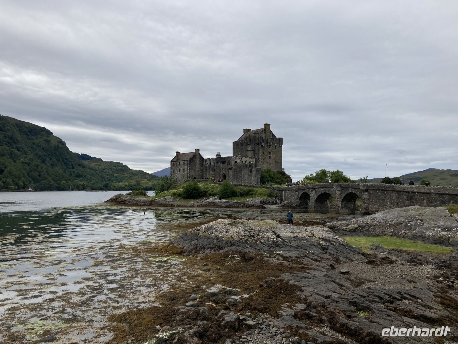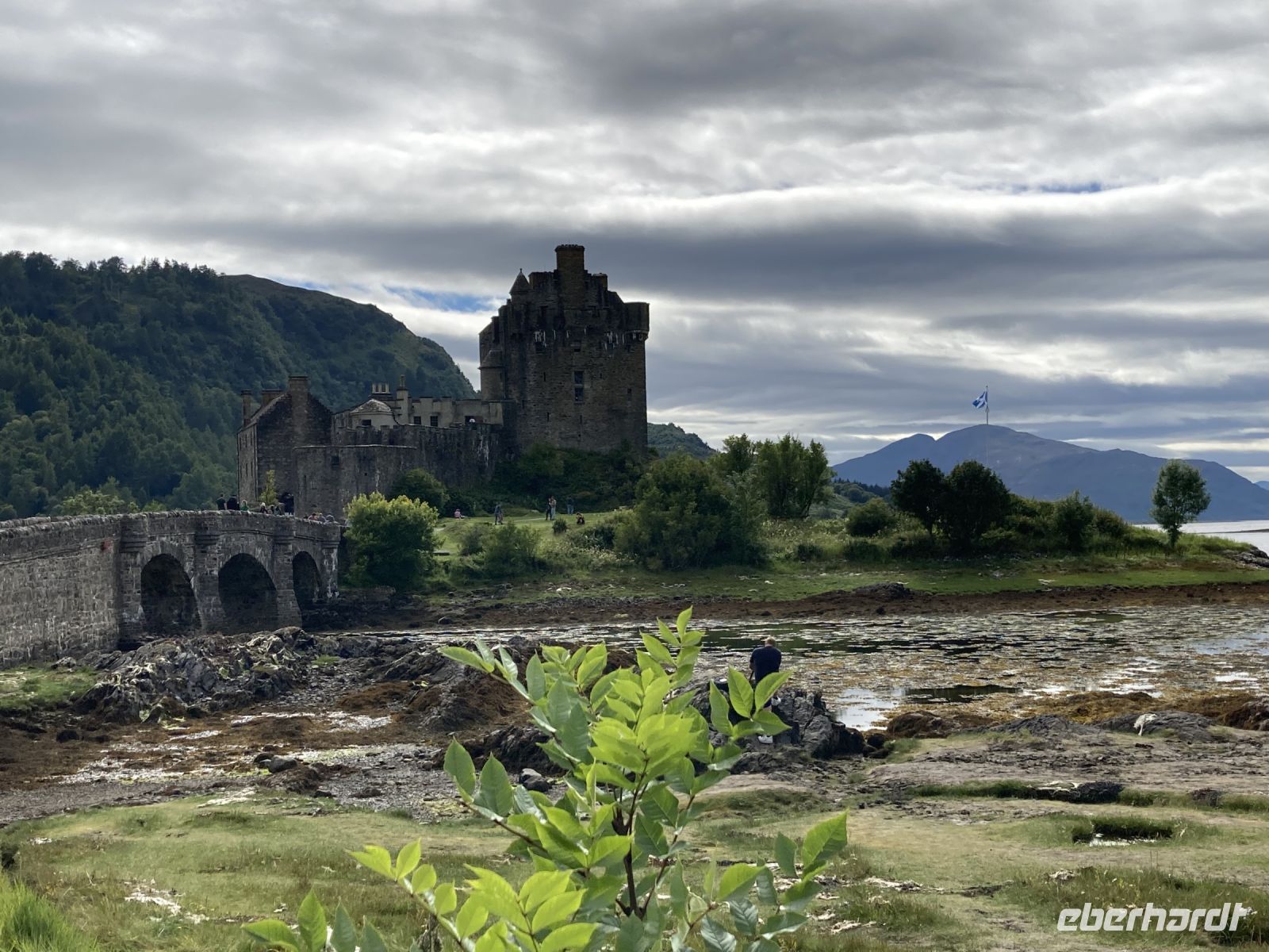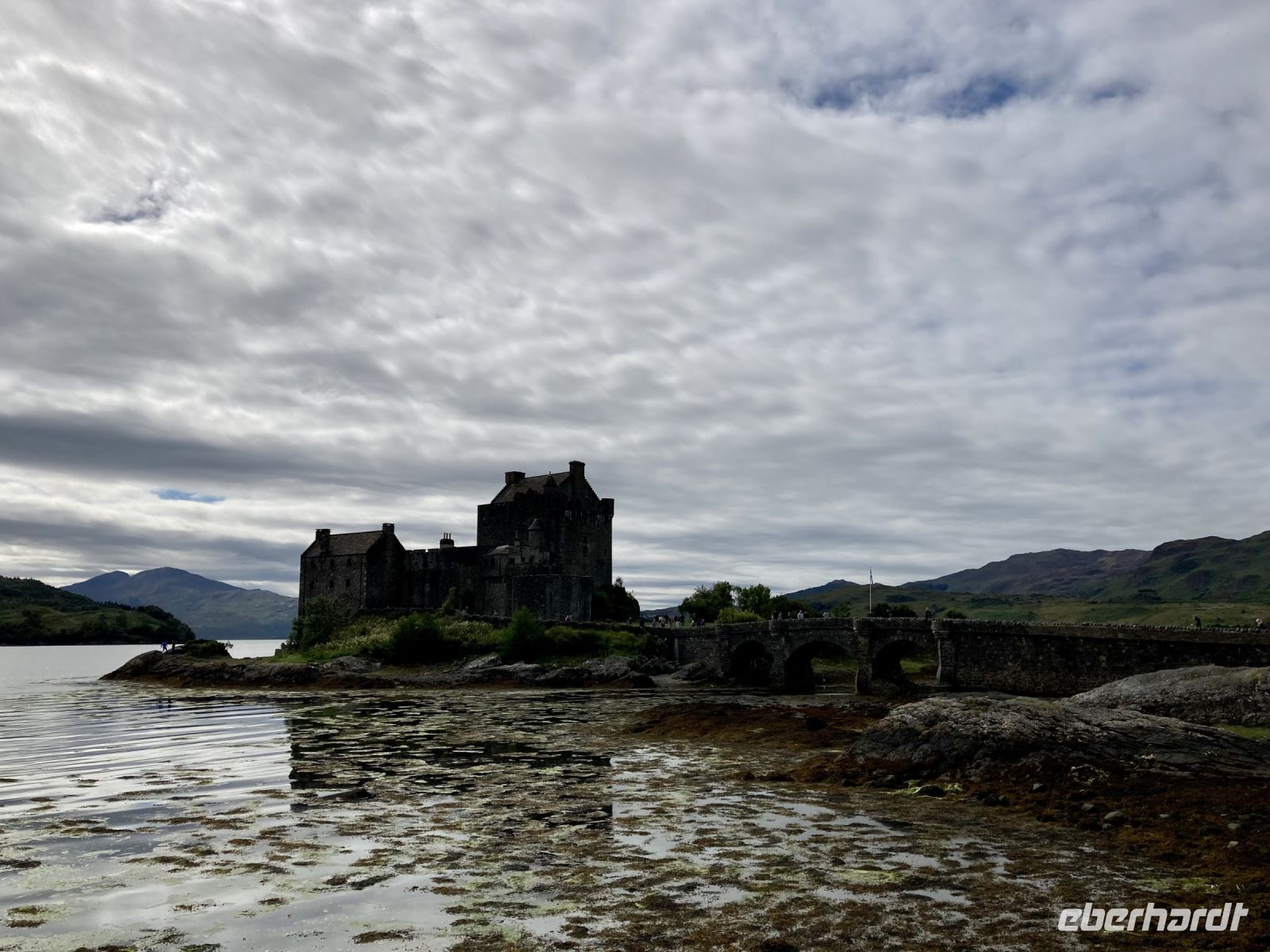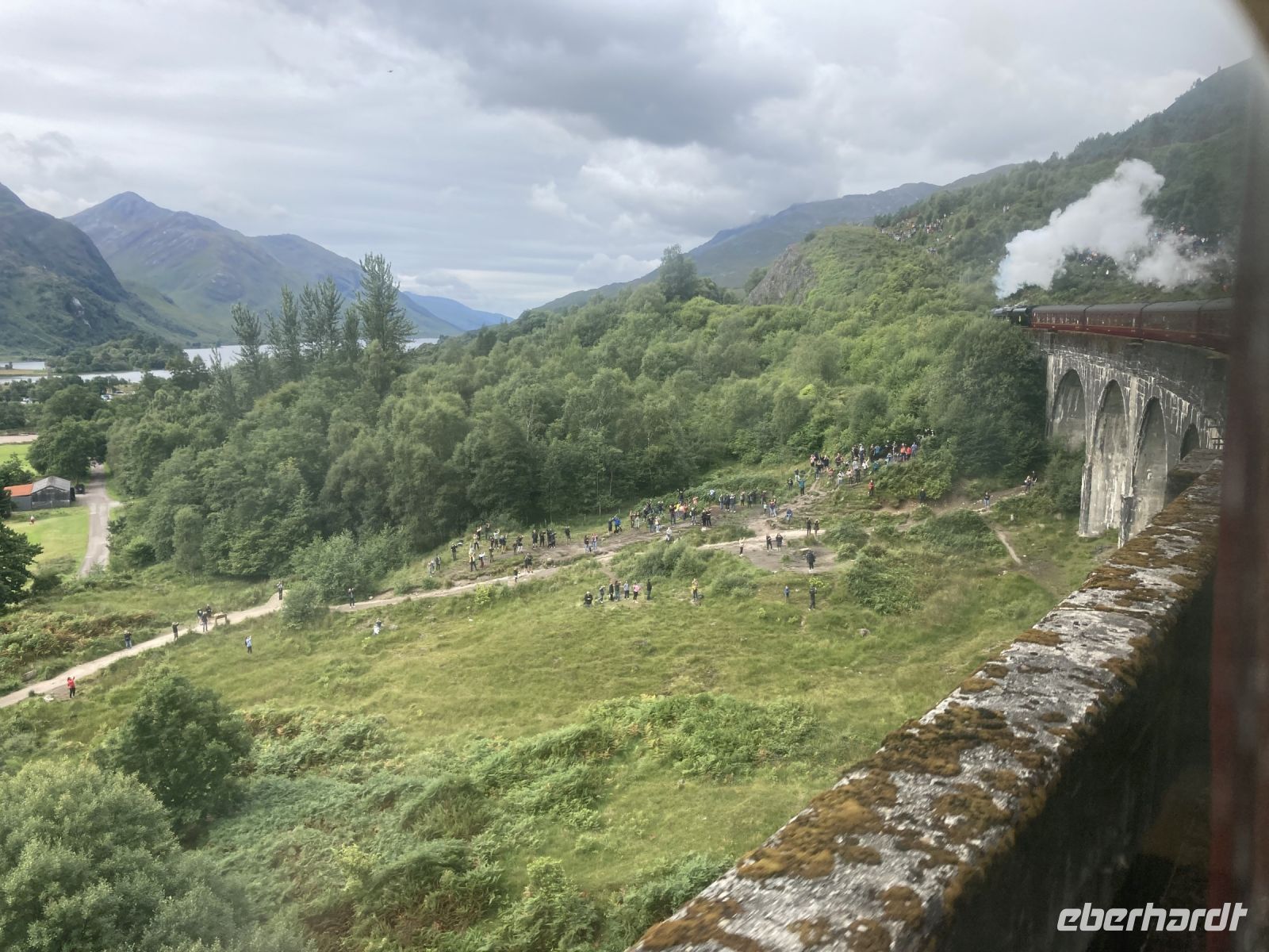 Wir haben auf unserer Reise bisher tatsächlich nicht nur Glück mit dem schottischen Wetter, sondern auch in Bezug auf den nächsten Programmpunkt: die Fahrt mit dem Jacobite Steam Train. Heute ist nämlich der allererste Tag, an dem er nach einer behördlich verordneten Zwangspause wieder fahren darf. Und nicht nur die Harry-Potter-Fans unter uns haben sich sehr auf die Fahrt gefreut. Die Strecke folgt der „Road to the Isles“ zur Küste mit Blick auf die Hebriden. Höhepunkt ist stets die Fahrt über das Glenfinnan Viaduct. Um das Viadukt herum haben sich schon viele Fans postiert und warten mit ihren Kameras auf die Ankunft des „Hogwarts Express“. Wir sitzen sehr weit hinten im Zug, was dank der Biegung der Brücke den Vorteil hat, dass wir die Dampflokomotive an der Spitze während der Fahrt über das Viadukt fotografieren können. Nach der Pause in Glenfinnan wird die Strecke fast noch schöner, da sie näher an der Küste vorbeiführt. Einen Teil davon dürfen wir sogar 3x bewundern, da es der Zug im ersten Anlauf nicht über den letzten großen Hügel vor Mallaig schafft und einige Minuten zurücksetzen muss. So etwas habe ich auch noch nicht erlebt! Zum Glück erwischen wir in Mallaig trotzdem noch die Fähre nach Armadale, auch wenn unser Bus schon ohne uns auf die Fähre drauffahren muss. Nach der Überfahrt gönnen wir uns eine kleine Kaffeepause. In Armadale residierte übrigens der berüchtigte Clan der MacDonalds, die Lords of the Isles. Auch sie finden sich – wie viele Ereignisse der schottischen Geschichte – in abgewandelter Form und Gestalt in Game of Thrones wieder. Wir fahren ein kleines Stück über die Isle of Skye, die größte Insel der Hebriden, zu unserem nächsten Ziel: dem Eilean Donan Castle. Die rekonstruierte Burg taucht in fast jedem Kalender und Bildband über Schottland auf, war in vielen Filmen zu sehen und ist ein weiteres kleines Highlight der Reise. Sie befindet sich noch heute im Privatbesitz des Clan Macrae (verwaltet von einer Stiftung) und kann mit Audioguides besichtigt werden. Sie hat alles zu bieten, was ein Burgherr in den Highlands so braucht: eine große Halle für Gelage, Wände mit Ohren und eine große Küche, in der gerade unter Aufsicht der Hausherrin ein wahres Festmahl zubereitet wird. Beim Schreiben dieser Zeilen läuft mir gleich wieder das Wasser im Mund zusammen. Die Wolkendecke könnte heute zwar gern etwas weniger dick sein, aber es regnet nach wie vor nicht und wir können trotzdem schöne Fotos machen. Zur Musik der bekannten schottischen Band Runrig fahren wir durch die imposante Highland-Landschaft zurück nach Fort William und unserem Hotel am Loch.
