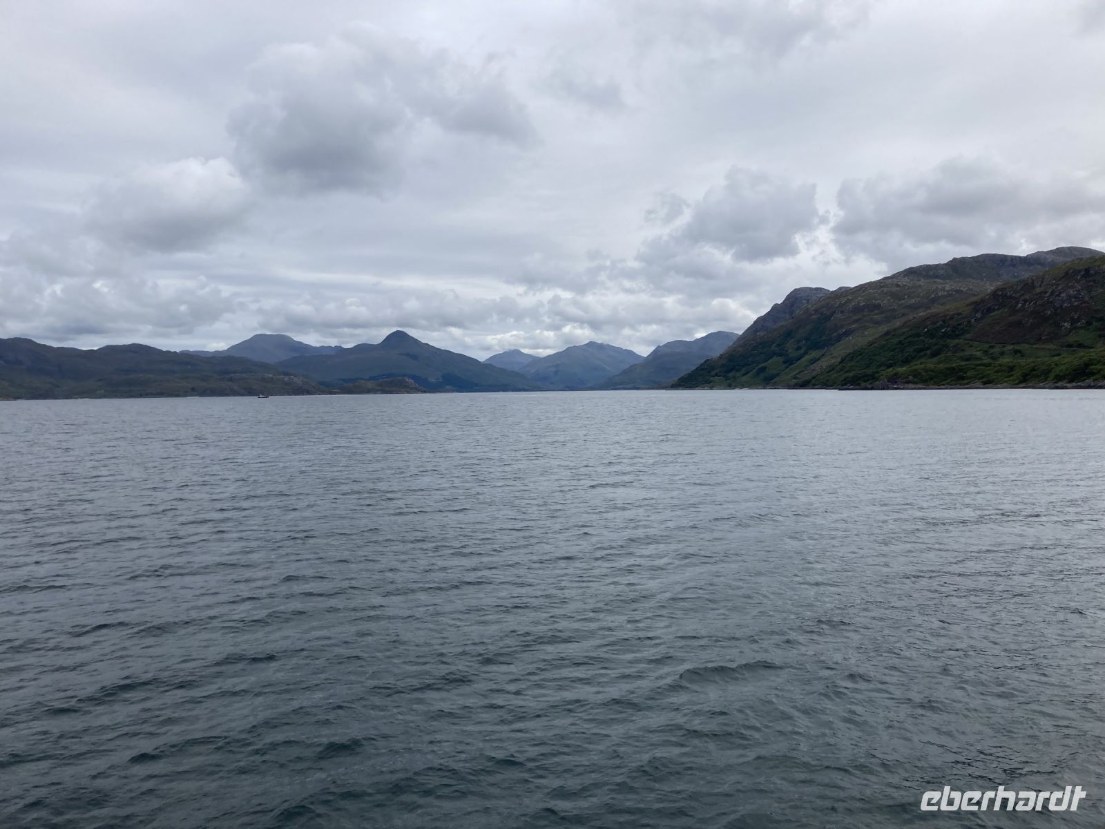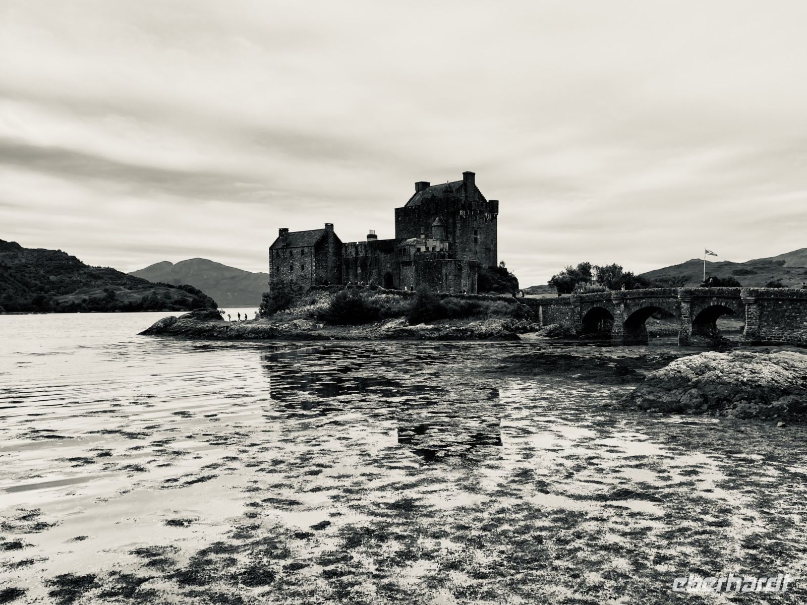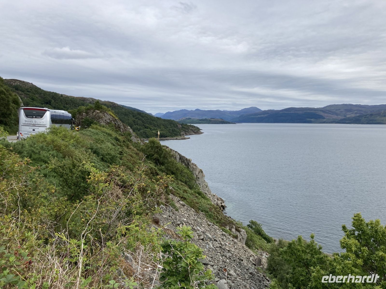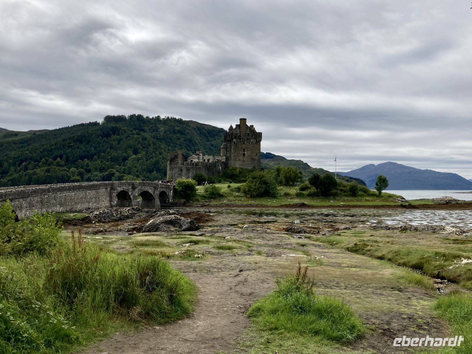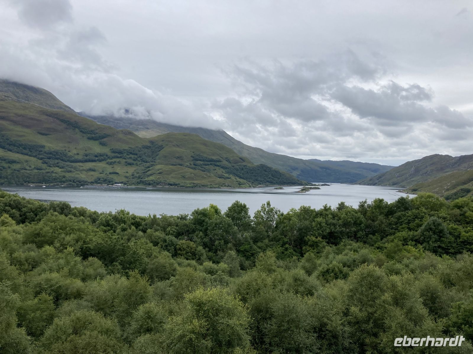 Wir haben auf unserer Reise bisher tatsächlich nicht nur Glück mit dem schottischen Wetter, sondern auch in Bezug auf den nächsten Programmpunkt: die Fahrt mit dem Jacobite Steam Train. Heute ist nämlich der allererste Tag, an dem er nach einer behördlich verordneten Zwangspause wieder fahren darf. Und nicht nur die Harry-Potter-Fans unter uns haben sich sehr auf die Fahrt gefreut. Die Strecke folgt der „Road to the Isles“ zur Küste mit Blick auf die Hebriden. Höhepunkt ist stets die Fahrt über das Glenfinnan Viaduct. Um das Viadukt herum haben sich schon viele Fans postiert und warten mit ihren Kameras auf die Ankunft des „Hogwarts Express“. Wir sitzen sehr weit hinten im Zug, was dank der Biegung der Brücke den Vorteil hat, dass wir die Dampflokomotive an der Spitze während der Fahrt über das Viadukt fotografieren können. Nach der Pause in Glenfinnan wird die Strecke fast noch schöner, da sie näher an der Küste vorbeiführt. Einen Teil davon dürfen wir sogar 3x bewundern, da es der Zug im ersten Anlauf nicht über den letzten großen Hügel vor Mallaig schafft und einige Minuten zurücksetzen muss. So etwas habe ich auch noch nicht erlebt! Zum Glück erwischen wir in Mallaig trotzdem noch die Fähre nach Armadale, auch wenn unser Bus schon ohne uns auf die Fähre drauffahren muss. Nach der Überfahrt gönnen wir uns eine kleine Kaffeepause. In Armadale residierte übrigens der berüchtigte Clan der MacDonalds, die Lords of the Isles. Auch sie finden sich – wie viele Ereignisse der schottischen Geschichte – in abgewandelter Form und Gestalt in Game of Thrones wieder. Wir fahren ein kleines Stück über die Isle of Skye, die größte Insel der Hebriden, zu unserem nächsten Ziel: dem Eilean Donan Castle. Die rekonstruierte Burg taucht in fast jedem Kalender und Bildband über Schottland auf, war in vielen Filmen zu sehen und ist ein weiteres kleines Highlight der Reise. Sie befindet sich noch heute im Privatbesitz des Clan Macrae (verwaltet von einer Stiftung) und kann mit Audioguides besichtigt werden. Sie hat alles zu bieten, was ein Burgherr in den Highlands so braucht: eine große Halle für Gelage, Wände mit Ohren und eine große Küche, in der gerade unter Aufsicht der Hausherrin ein wahres Festmahl zubereitet wird. Beim Schreiben dieser Zeilen läuft mir gleich wieder das Wasser im Mund zusammen. Die Wolkendecke könnte heute zwar gern etwas weniger dick sein, aber es regnet nach wie vor nicht und wir können trotzdem schöne Fotos machen. Zur Musik der bekannten schottischen Band Runrig fahren wir durch die imposante Highland-Landschaft zurück nach Fort William und unserem Hotel am Loch.