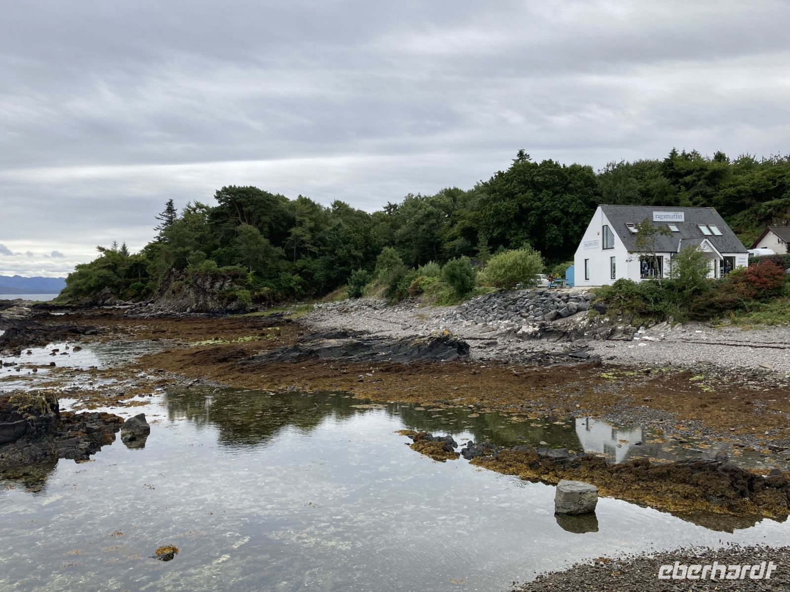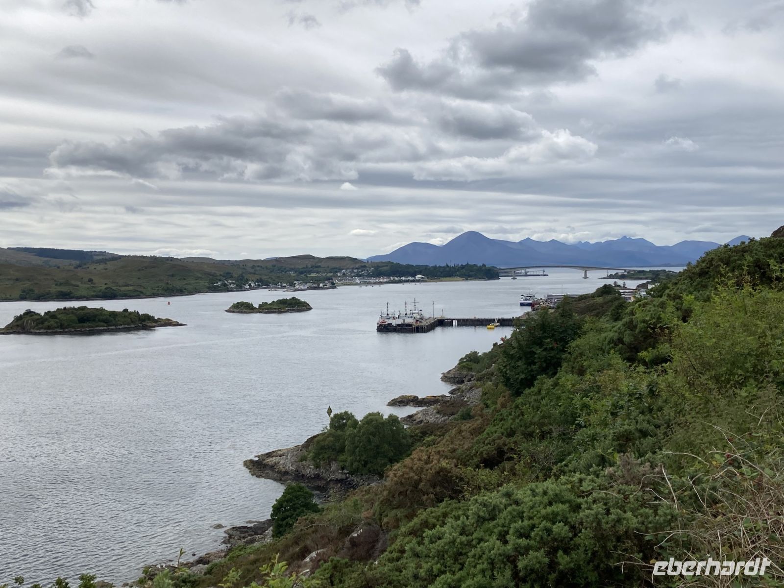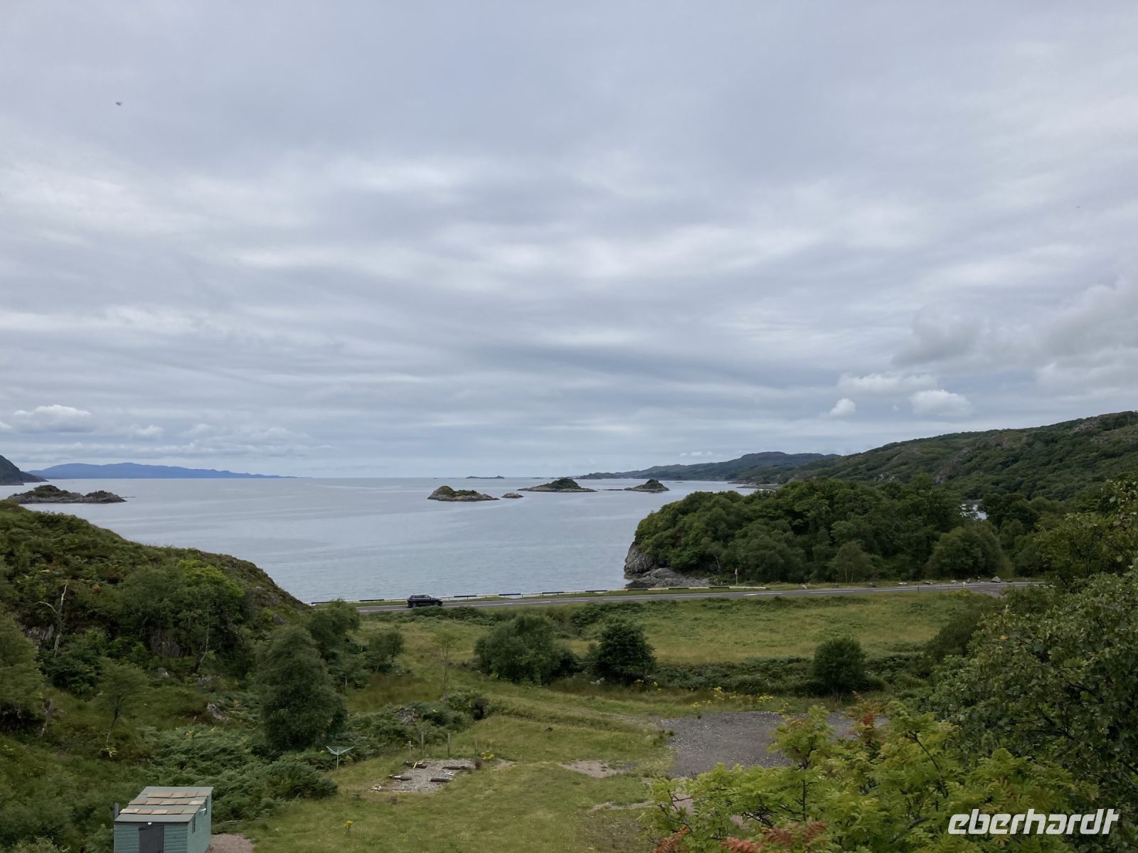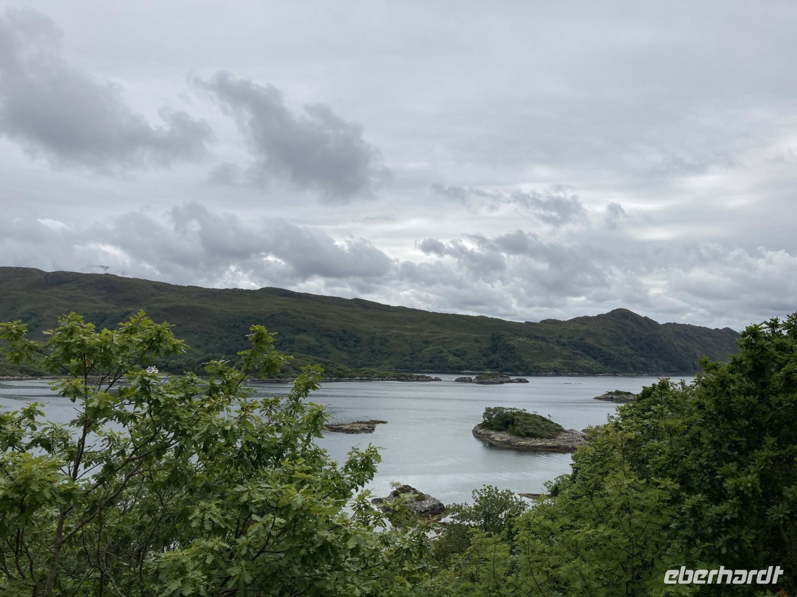 Wir haben auf unserer Reise bisher tatsächlich nicht nur Glück mit dem schottischen Wetter, sondern auch in Bezug auf den nächsten Programmpunkt: die Fahrt mit dem Jacobite Steam Train. Heute ist nämlich der allererste Tag, an dem er nach einer behördlich verordneten Zwangspause wieder fahren darf. Und nicht nur die Harry-Potter-Fans unter uns haben sich sehr auf die Fahrt gefreut. Die Strecke folgt der „Road to the Isles“ zur Küste mit Blick auf die Hebriden. Höhepunkt ist stets die Fahrt über das Glenfinnan Viaduct. Um das Viadukt herum haben sich schon viele Fans postiert und warten mit ihren Kameras auf die Ankunft des „Hogwarts Express“. Wir sitzen sehr weit hinten im Zug, was dank der Biegung der Brücke den Vorteil hat, dass wir die Dampflokomotive an der Spitze während der Fahrt über das Viadukt fotografieren können. Nach der Pause in Glenfinnan wird die Strecke fast noch schöner, da sie näher an der Küste vorbeiführt. Einen Teil davon dürfen wir sogar 3x bewundern, da es der Zug im ersten Anlauf nicht über den letzten großen Hügel vor Mallaig schafft und einige Minuten zurücksetzen muss. So etwas habe ich auch noch nicht erlebt! Zum Glück erwischen wir in Mallaig trotzdem noch die Fähre nach Armadale, auch wenn unser Bus schon ohne uns auf die Fähre drauffahren muss. Nach der Überfahrt gönnen wir uns eine kleine Kaffeepause. In Armadale residierte übrigens der berüchtigte Clan der MacDonalds, die Lords of the Isles. Auch sie finden sich – wie viele Ereignisse der schottischen Geschichte – in abgewandelter Form und Gestalt in Game of Thrones wieder. Wir fahren ein kleines Stück über die Isle of Skye, die größte Insel der Hebriden, zu unserem nächsten Ziel: dem Eilean Donan Castle. Die rekonstruierte Burg taucht in fast jedem Kalender und Bildband über Schottland auf, war in vielen Filmen zu sehen und ist ein weiteres kleines Highlight der Reise. Sie befindet sich noch heute im Privatbesitz des Clan Macrae (verwaltet von einer Stiftung) und kann mit Audioguides besichtigt werden. Sie hat alles zu bieten, was ein Burgherr in den Highlands so braucht: eine große Halle für Gelage, Wände mit Ohren und eine große Küche, in der gerade unter Aufsicht der Hausherrin ein wahres Festmahl zubereitet wird. Beim Schreiben dieser Zeilen läuft mir gleich wieder das Wasser im Mund zusammen. Die Wolkendecke könnte heute zwar gern etwas weniger dick sein, aber es regnet nach wie vor nicht und wir können trotzdem schöne Fotos machen. Zur Musik der bekannten schottischen Band Runrig fahren wir durch die imposante Highland-Landschaft zurück nach Fort William und unserem Hotel am Loch.