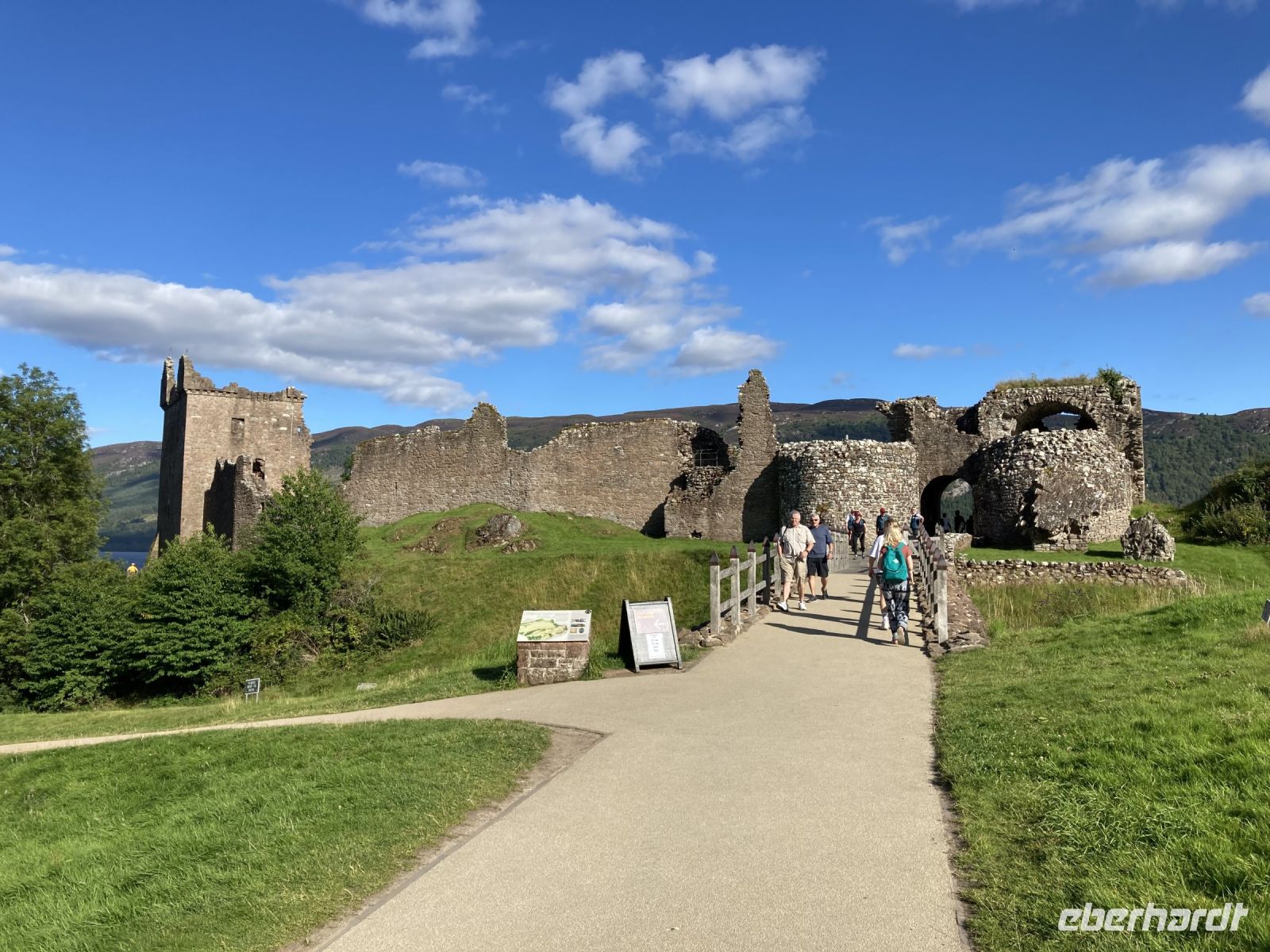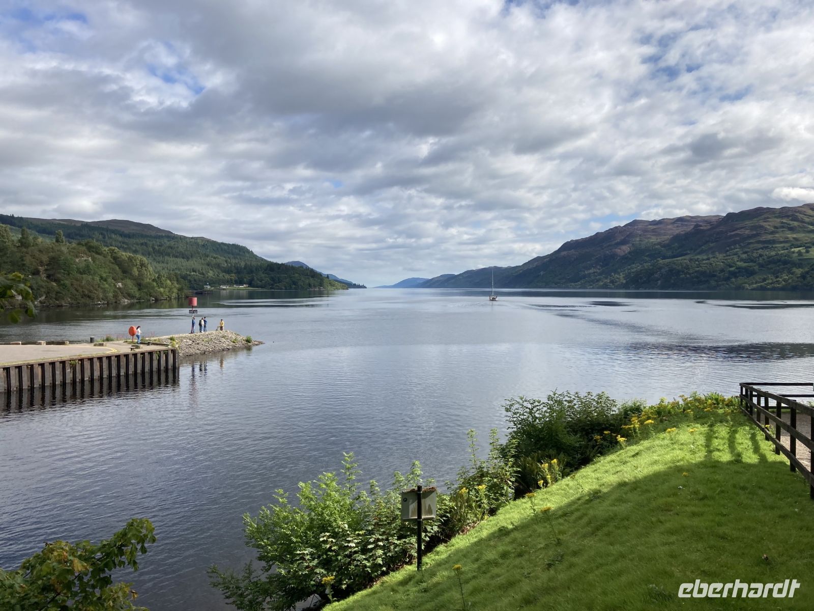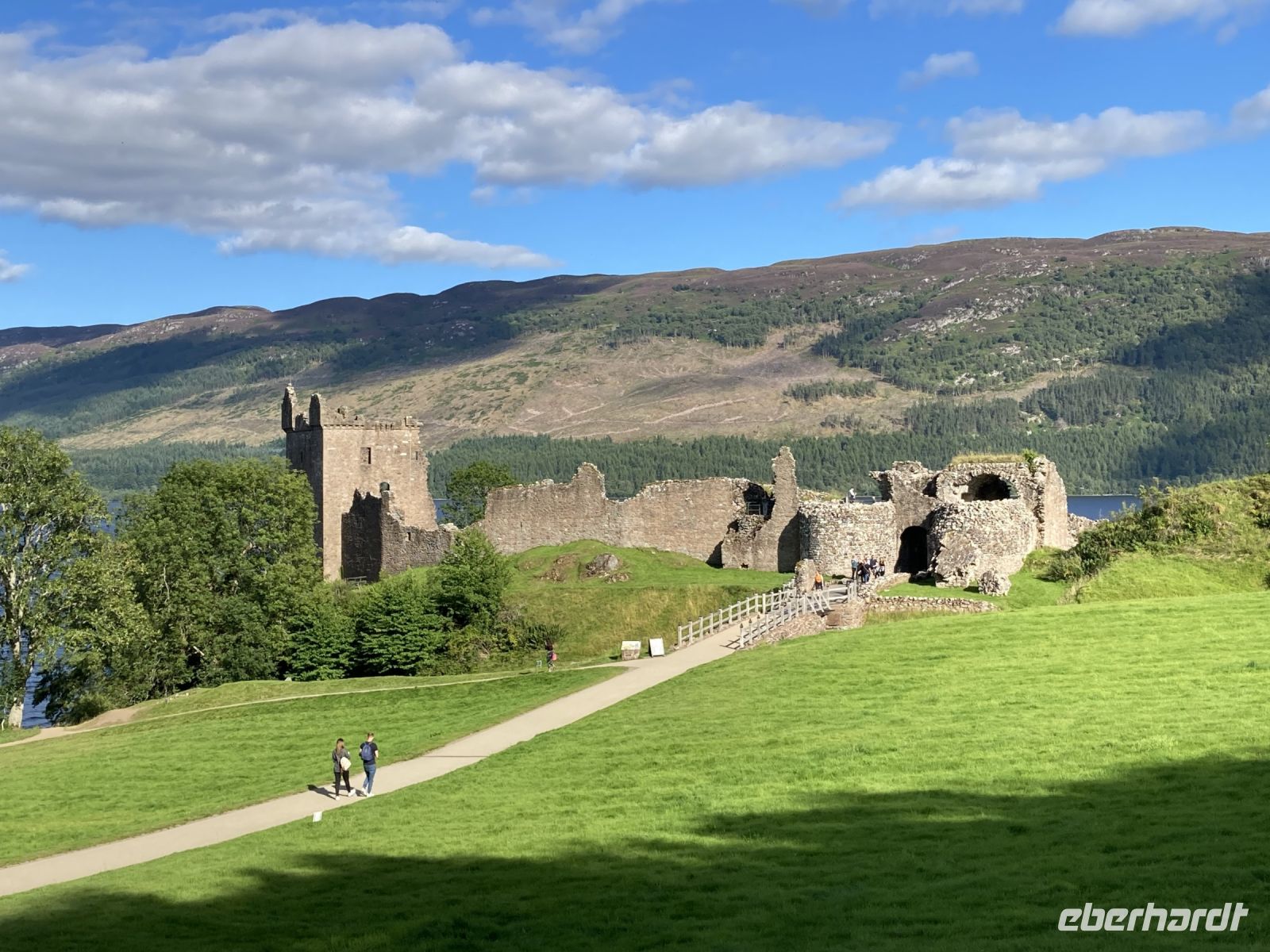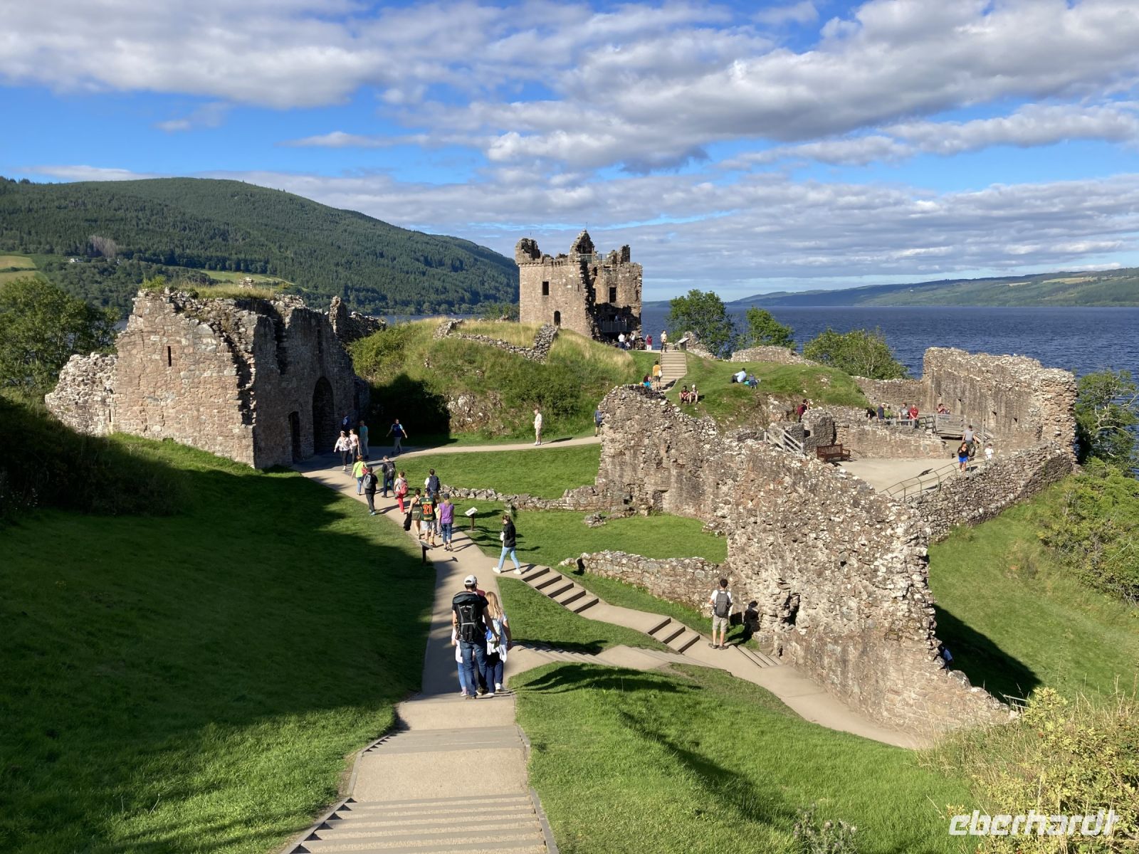 Wir verlassen heute unsere Zimmer mit Aussicht am Loch und ziehen weiter durch das Great Glen in die Hauptstadt der Highlands, Inverness. Durch das langgezogene Trogtal führt nicht nur der Great Glen Way — auf dem wir später noch eine Wanderung absolvieren wollen — sondern auch der Kaledonische Kanal. Um diesen zu durchqueren, müssen die Boote insgesamt 29 Schleusen passieren, darunter die Neptune‘s Staircase, die längste Schleusentreppe Großbritanniens. Wir haben Glück bei unserem Besuch am Morgen: drei Segelboote werden gerade durchgeschleust. Wir schauen dem Treiben eine Weile zu und knipsen Fotos, aber bevor dann die Straßenbrücke aufgemacht wird, fahren wir weiter nach Fort Augustus. Hier beginnt der berühmte Loch Ness und hier begegnen wir auch Nessie in allen Variationen — nur das echte Monster lässt sich auf dem See nicht blicken. Zwei Kanus und ein paar kleine Segelboote begeben sich auf die Suche nach Nessie und sorgen für ein schönes Fotomotiv. Weitere schöne Fotomotive in Fort Augustus bilden die ehemalige Abtei und eine weitere Schleusentreppe mitten im Ort. Außerdem wollen wir uns mit Proviant für unsere Wanderung versorgen, die von hier aus startet. Sie führt uns zunächst durch einen schönen Märchenwald mit riesigen Bäumen, den wir schließlich hinter und unter uns zurücklassen, als wir auf einer Höhe von ca. 300 Metern ankommen und sich uns von hier oben der erste Blick auf den Loch Ness eröffnet. Dafür hat sich die Mühe wirklich gelohnt — und wir machen an Ort und Stelle auch gleich unsere Picknickpause. Tatsächlich wird die Aussicht im weiteren Verlauf der Wanderung noch besser; fast der gesamte Loch Ness lässt sich von hier oben sehen. Nur Nessie lässt sich einfach nicht blicken. Dabei sind wir so eine liebe Gruppe und würden uns wirklich freuen — so, wie wir uns auch über das schöne Wetter freuen, das im Verlaufe des Nachmittags immer besser wird. Der Abstieg führt ebenfalls durch einen Wald und dann sind wir auch schon fast in Invermoriston, wo Neil mit dem Bus auf uns wartet. Am Nachmittag steht dann noch eine Besichtigung des Urquhart Castle auf dem Programm, das zwar schon seit Jahrhunderten nur noch Ruine ist, aber durch seine herrliche Lage am Ufer des Loch Ness besticht. In der Vergangenheit oft vom Clan der MacDonalds überfallen und schließlich von den Eigentümern gesprengt, trotzen die dicken Mauern der recht großen Burganlage nunmehr dem täglichen „Ansturm“ von uns Touristen. In Inverness haben wir dann die erste Übernachtung im Royal Highland Hotel, das mit seiner riesigen Lobby und gutem Essen beeindruckt. Und letzteres haben wir uns nach der längsten Wanderung der Reise und vielen überwundenen Höhenmetern auch wirklich verdient.