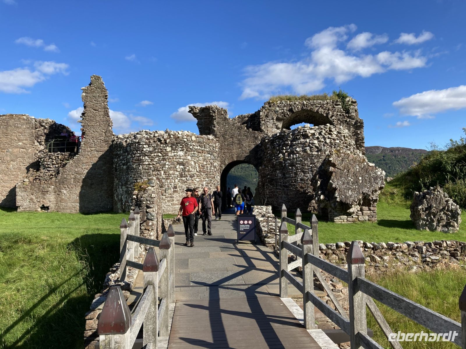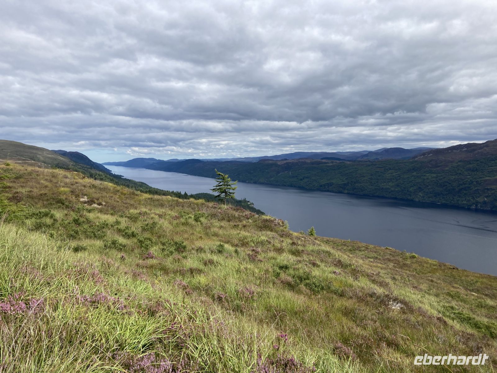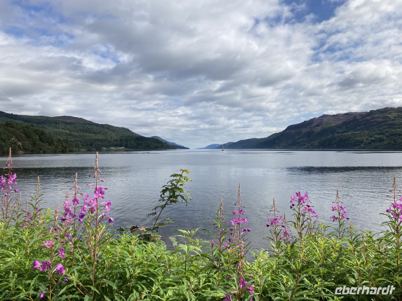 Wir verlassen heute unsere Zimmer mit Aussicht am Loch und ziehen weiter durch das Great Glen in die Hauptstadt der Highlands, Inverness. Durch das langgezogene Trogtal führt nicht nur der Great Glen Way — auf dem wir später noch eine Wanderung absolvieren wollen — sondern auch der Kaledonische Kanal. Um diesen zu durchqueren, müssen die Boote insgesamt 29 Schleusen passieren, darunter die Neptune‘s Staircase, die längste Schleusentreppe Großbritanniens. Wir haben Glück bei unserem Besuch am Morgen: drei Segelboote werden gerade durchgeschleust. Wir schauen dem Treiben eine Weile zu und knipsen Fotos, aber bevor dann die Straßenbrücke aufgemacht wird, fahren wir weiter nach Fort Augustus. Hier beginnt der berühmte Loch Ness und hier begegnen wir auch Nessie in allen Variationen — nur das echte Monster lässt sich auf dem See nicht blicken. Zwei Kanus und ein paar kleine Segelboote begeben sich auf die Suche nach Nessie und sorgen für ein schönes Fotomotiv. Weitere schöne Fotomotive in Fort Augustus bilden die ehemalige Abtei und eine weitere Schleusentreppe mitten im Ort. Außerdem wollen wir uns mit Proviant für unsere Wanderung versorgen, die von hier aus startet. Sie führt uns zunächst durch einen schönen Märchenwald mit riesigen Bäumen, den wir schließlich hinter und unter uns zurücklassen, als wir auf einer Höhe von ca. 300 Metern ankommen und sich uns von hier oben der erste Blick auf den Loch Ness eröffnet. Dafür hat sich die Mühe wirklich gelohnt — und wir machen an Ort und Stelle auch gleich unsere Picknickpause. Tatsächlich wird die Aussicht im weiteren Verlauf der Wanderung noch besser; fast der gesamte Loch Ness lässt sich von hier oben sehen. Nur Nessie lässt sich einfach nicht blicken. Dabei sind wir so eine liebe Gruppe und würden uns wirklich freuen — so, wie wir uns auch über das schöne Wetter freuen, das im Verlaufe des Nachmittags immer besser wird. Der Abstieg führt ebenfalls durch einen Wald und dann sind wir auch schon fast in Invermoriston, wo Neil mit dem Bus auf uns wartet. Am Nachmittag steht dann noch eine Besichtigung des Urquhart Castle auf dem Programm, das zwar schon seit Jahrhunderten nur noch Ruine ist, aber durch seine herrliche Lage am Ufer des Loch Ness besticht. In der Vergangenheit oft vom Clan der MacDonalds überfallen und schließlich von den Eigentümern gesprengt, trotzen die dicken Mauern der recht großen Burganlage nunmehr dem täglichen „Ansturm“ von uns Touristen. In Inverness haben wir dann die erste Übernachtung im Royal Highland Hotel, das mit seiner riesigen Lobby und gutem Essen beeindruckt. Und letzteres haben wir uns nach der längsten Wanderung der Reise und vielen überwundenen Höhenmetern auch wirklich verdient.