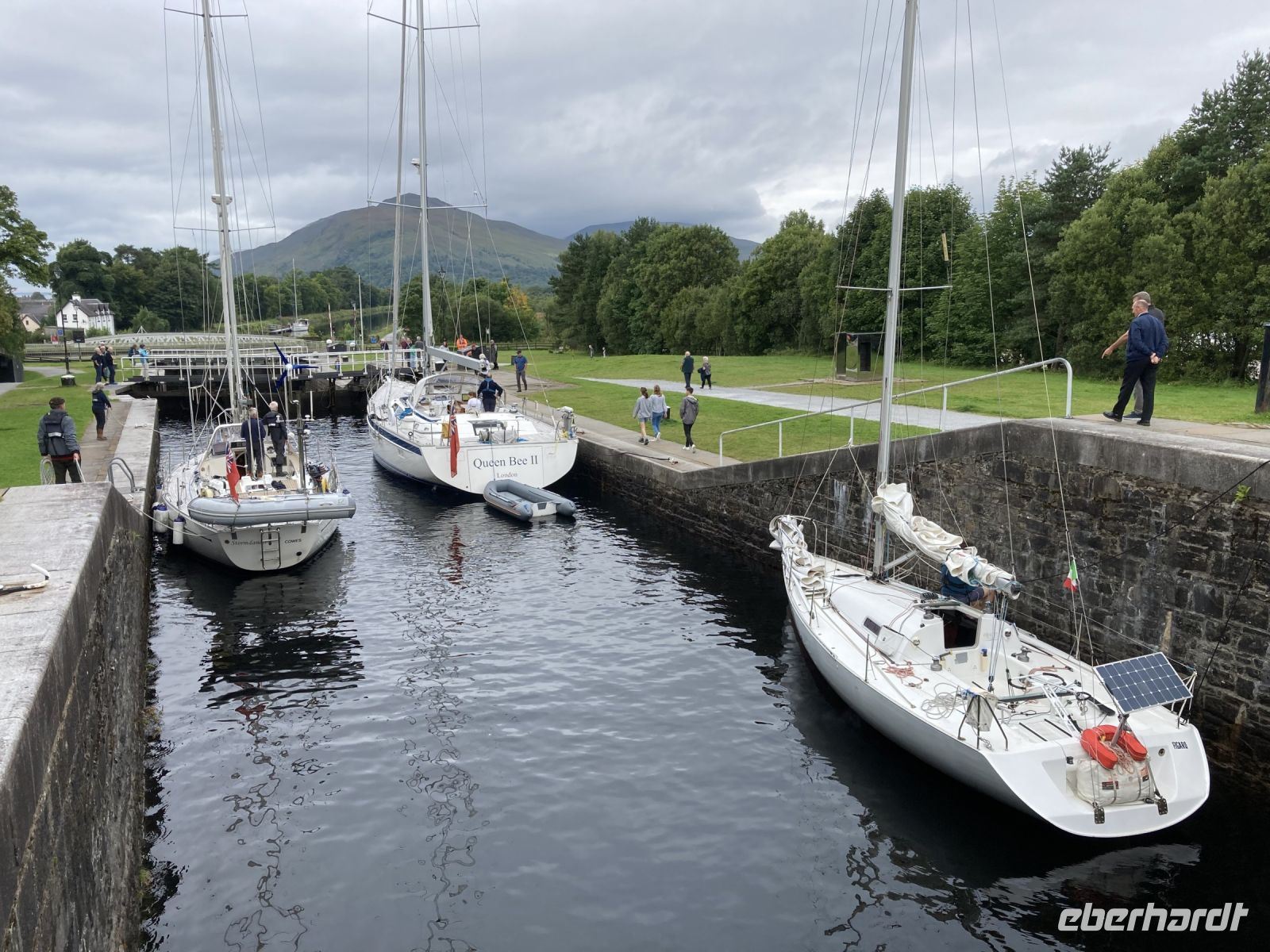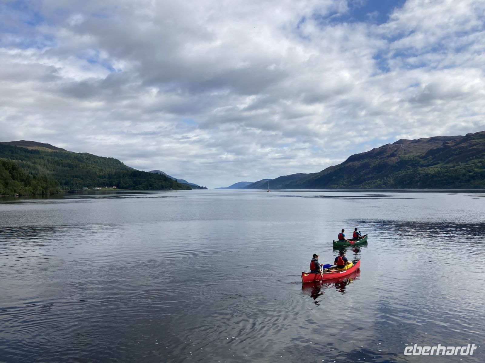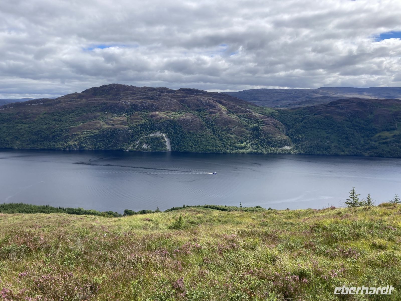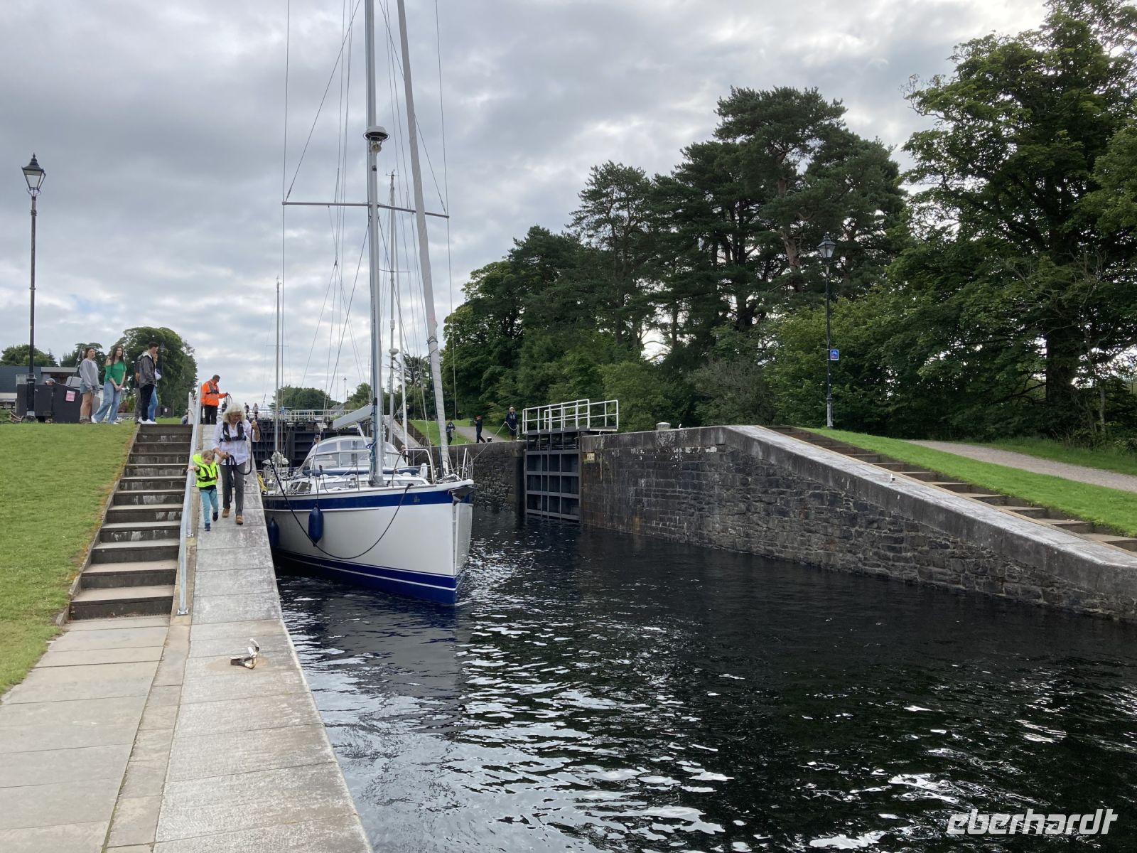 Wir verlassen heute unsere Zimmer mit Aussicht am Loch und ziehen weiter durch das Great Glen in die Hauptstadt der Highlands, Inverness. Durch das langgezogene Trogtal führt nicht nur der Great Glen Way — auf dem wir später noch eine Wanderung absolvieren wollen — sondern auch der Kaledonische Kanal. Um diesen zu durchqueren, müssen die Boote insgesamt 29 Schleusen passieren, darunter die Neptune‘s Staircase, die längste Schleusentreppe Großbritanniens. Wir haben Glück bei unserem Besuch am Morgen: drei Segelboote werden gerade durchgeschleust. Wir schauen dem Treiben eine Weile zu und knipsen Fotos, aber bevor dann die Straßenbrücke aufgemacht wird, fahren wir weiter nach Fort Augustus. Hier beginnt der berühmte Loch Ness und hier begegnen wir auch Nessie in allen Variationen — nur das echte Monster lässt sich auf dem See nicht blicken. Zwei Kanus und ein paar kleine Segelboote begeben sich auf die Suche nach Nessie und sorgen für ein schönes Fotomotiv. Weitere schöne Fotomotive in Fort Augustus bilden die ehemalige Abtei und eine weitere Schleusentreppe mitten im Ort. Außerdem wollen wir uns mit Proviant für unsere Wanderung versorgen, die von hier aus startet. Sie führt uns zunächst durch einen schönen Märchenwald mit riesigen Bäumen, den wir schließlich hinter und unter uns zurücklassen, als wir auf einer Höhe von ca. 300 Metern ankommen und sich uns von hier oben der erste Blick auf den Loch Ness eröffnet. Dafür hat sich die Mühe wirklich gelohnt — und wir machen an Ort und Stelle auch gleich unsere Picknickpause. Tatsächlich wird die Aussicht im weiteren Verlauf der Wanderung noch besser; fast der gesamte Loch Ness lässt sich von hier oben sehen. Nur Nessie lässt sich einfach nicht blicken. Dabei sind wir so eine liebe Gruppe und würden uns wirklich freuen — so, wie wir uns auch über das schöne Wetter freuen, das im Verlaufe des Nachmittags immer besser wird. Der Abstieg führt ebenfalls durch einen Wald und dann sind wir auch schon fast in Invermoriston, wo Neil mit dem Bus auf uns wartet. Am Nachmittag steht dann noch eine Besichtigung des Urquhart Castle auf dem Programm, das zwar schon seit Jahrhunderten nur noch Ruine ist, aber durch seine herrliche Lage am Ufer des Loch Ness besticht. In der Vergangenheit oft vom Clan der MacDonalds überfallen und schließlich von den Eigentümern gesprengt, trotzen die dicken Mauern der recht großen Burganlage nunmehr dem täglichen „Ansturm“ von uns Touristen. In Inverness haben wir dann die erste Übernachtung im Royal Highland Hotel, das mit seiner riesigen Lobby und gutem Essen beeindruckt. Und letzteres haben wir uns nach der längsten Wanderung der Reise und vielen überwundenen Höhenmetern auch wirklich verdient.