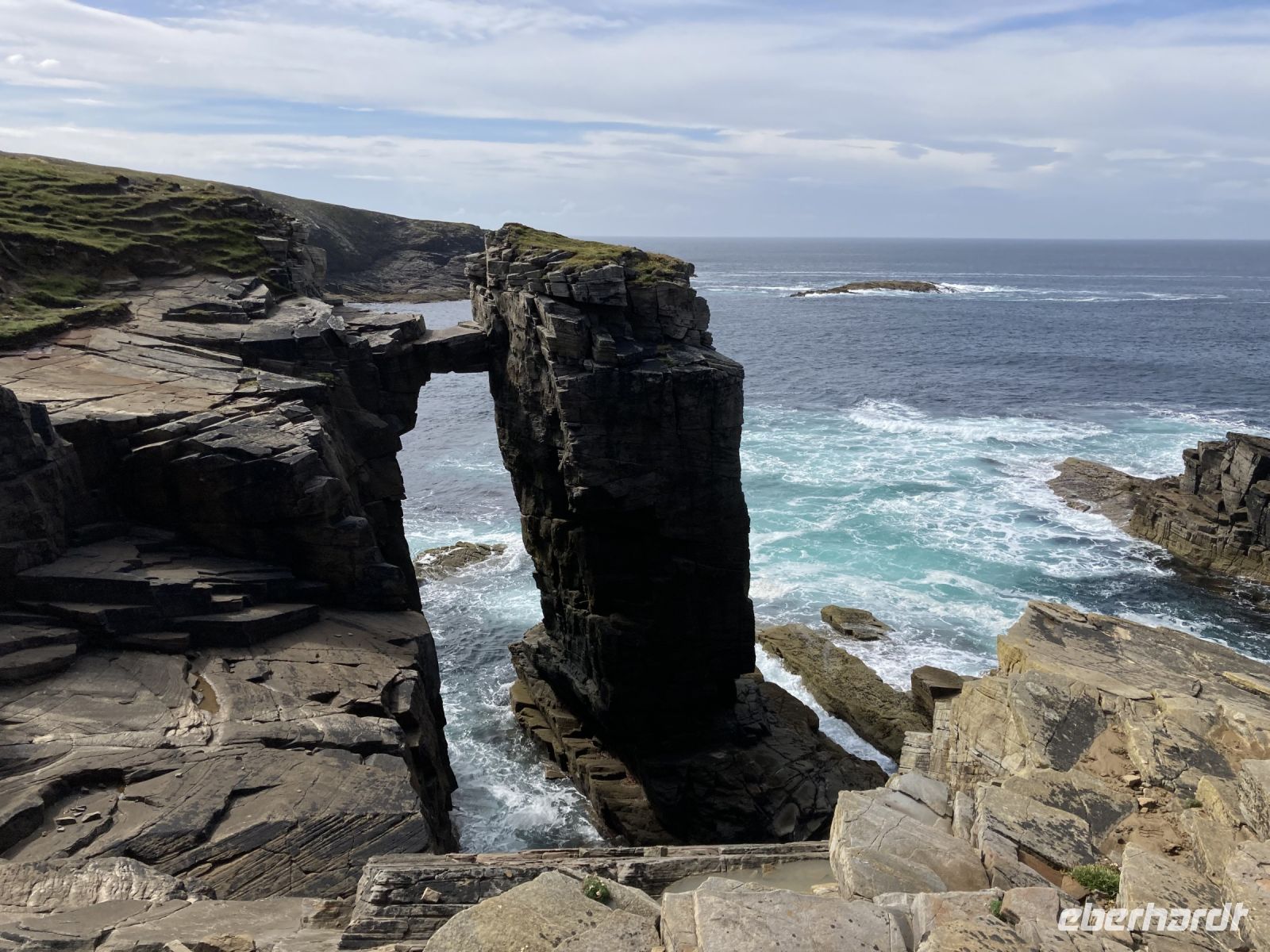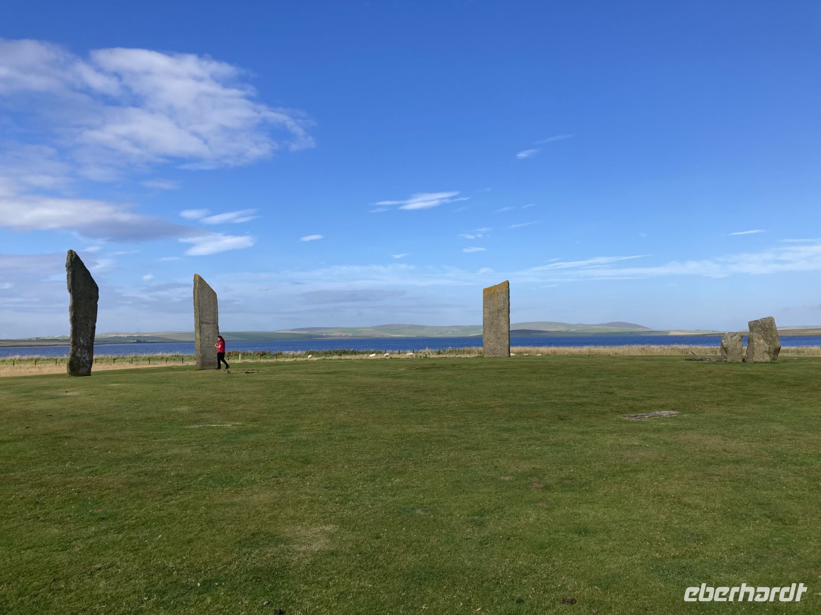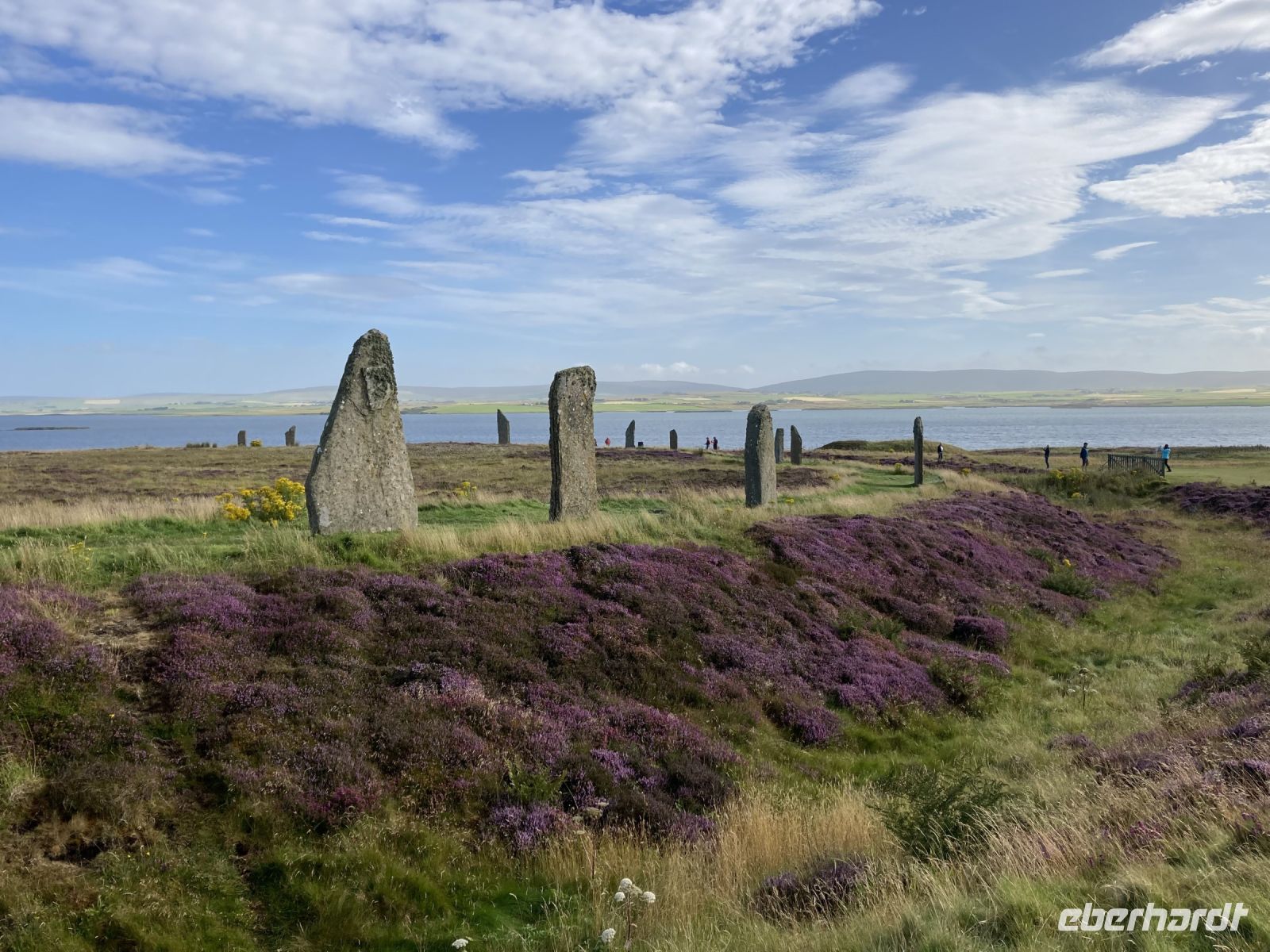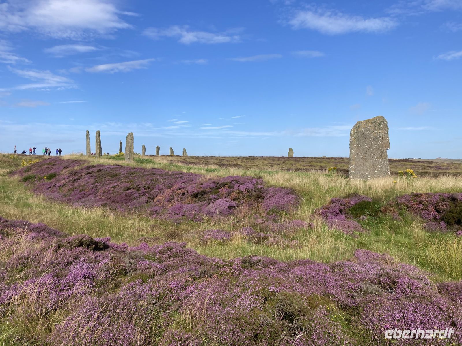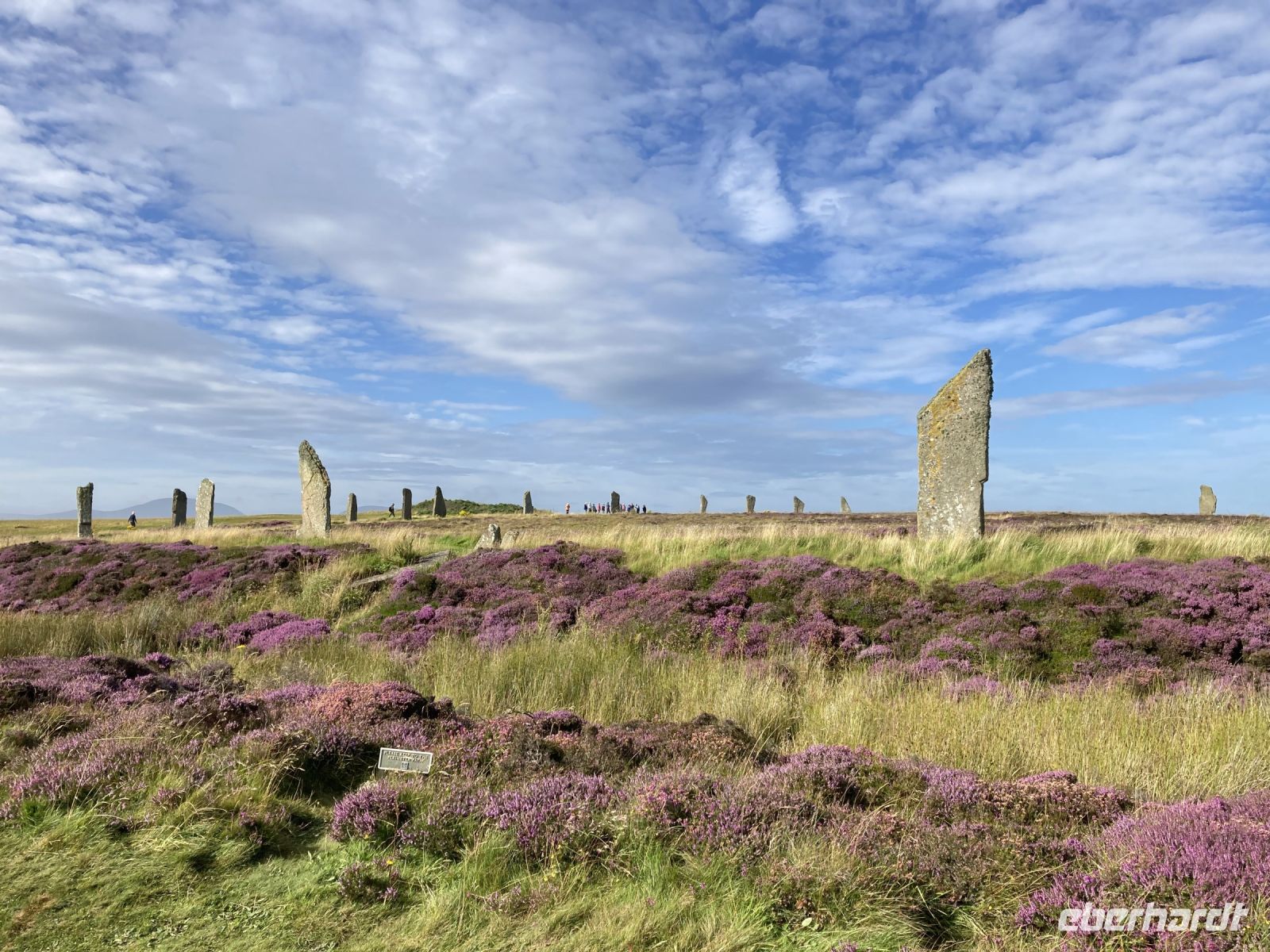 Nach der eindrucksvollen Überfahrt am gestrigen Tag sind wir schon sehr gespannt auf den heutigen Tag auf den Orkney-Inseln. Am Anfang steht ein sehr gutes Frühstücksbuffet im Stromness Hotel – und das macht gleich Freude auf mehr. Die Entfernungen sind zum Glück heute überschaubar, weshalb wir relativ schnell am ersten Ausflugsziel stehen, nämlich den Standing Stones of Stennes. Auch auf die Gefahr hin, 200 Jahre in der Vergangenheit zu landen, schauen wir uns den Steinkreis aus der Nähe an. Noch wesentlich größer und damit beeindruckender ist der Ring of Brodgar, den wir bei einem kleinen Spaziergang umrunden. Dank des tollen Himmels und Lichts sind auch hier wieder wunderschöne Fotos möglich. Beide Steinkreise gehören zum UNESCO-Weltkulturerbe „Heart of Neolithic Orkney“, dessen Zentrum das Steinzeitdorf Skara Brae bildet, in dem wohl auch die Erbauer der Kreise lebten. Bettkasten, Schrankwand, Wohnungstüren – gab es damals alles schon, wie wir uns während unseres Besuchs vergewissern, nur eben aus Stein. Da fühlen wir uns ein bisschen an Familie Feuerstein erinnert. Das benachbarte Skaill House, Wohnsitz der Lairds of Orkney, dürfen wir mit unserem Ticket ebenfalls besichtigen. Es bildet einen harten Kontrast zu den beengten Hütten aus der Jungsteinzeit, holt uns gleichzeitig aber langsam wieder in die Gegenwart zurück. Wir bleiben noch ein bisschen an der Westküste der Hauptinsel Mainland. Aufgrund des herrlichen Sonnenscheins mache ich mit meinen Gästen einen Überraschungsspaziergang zu den Klippen und Felsnadeln von Yesnaby. Auch Neil holt seine Kamera raus und kommt uns begeistert hinterher. Stundenlang könnten wir trotz des stürmischen Windes hier sitzen und zusehen, wie sich die Wellen an den Felsen brechen, doch die Orkneys haben noch viel mehr zu bieten! In Kirkwall, der Hauptstadt, machen wir eine späte Mittagspause im Stadtzentrum, die wir auch für einen Bummel durch die kleine Fußgängerzone mit hübschen Cafés und kleinen Geschäften nutzen können. Vor der großen St.-Magnus-Kathedrale treffen wir uns alle wieder und werfen einen Blick hinein in das „Licht des Nordens“. Die Gebeine des Heiligen, dem die Kirche geweiht ist, sollen sich sogar in einem Pfeiler neben dem Altar befinden. Am Nachmittag steht noch eine Panoramafahrt zu den Churchill Barriers auf dem Programm. Sie wurden während des 2. Weltkriegs auf Befehl Churchills erbaut, nachdem ein deutsches U-Boot in die Bucht von Skapa Flow eingedrungen war und dort die Royal Oak versenkt hatte, deren Schiffglocke wir übrigens eben erst in der Kathedrale gesehen haben. Heute stellen die Dämme eine wichtige Straßenverbindung zu den südlichen Inseln dar. Ganz unabhängig von der historischen Bedeutung gibt es in dieser Ecke der Inseln schöne Buchten und Strände. Mit der Ankündigung eines weiteren Fotostopps in einer Parkbucht auf leicht erhöhter Position mit Blick auf die Bucht von Skapa Flow locke ich meine Gäste aus dem Bus und zücke dann eine Flasche Highland Park Whisky, um mit ihnen unser Bergfest zu feiern, denn die Hälfte der Reise ist leider – wirklich leider – schon um. Anschließend beziehen wir unsere Zimmer im Orkney Hotel unweit der Kathedrale in Kirkwall, sodass wir uns von hier aus vor oder nach dem Dinner auch gut noch einmal die Beine vertreten können. Das Abendessen im Hotel ist wieder mal sehr gut, auch wenn das von mir als Hauptgericht gewählte Curry für meinen Geschmack etwas zu scharf geraten ist, was auch meine Gäste bemerken ...