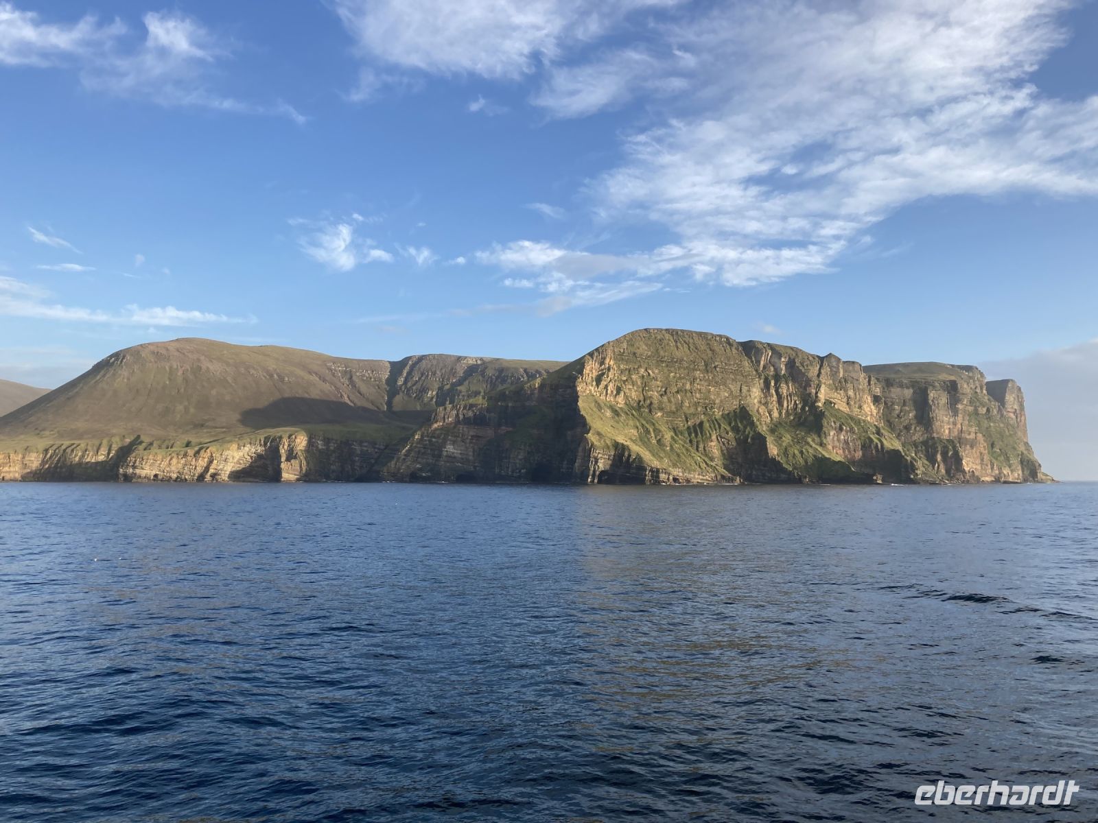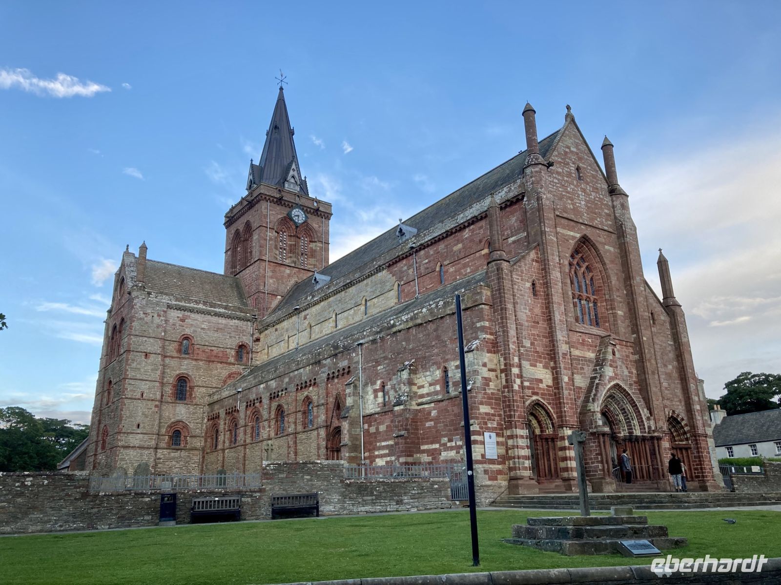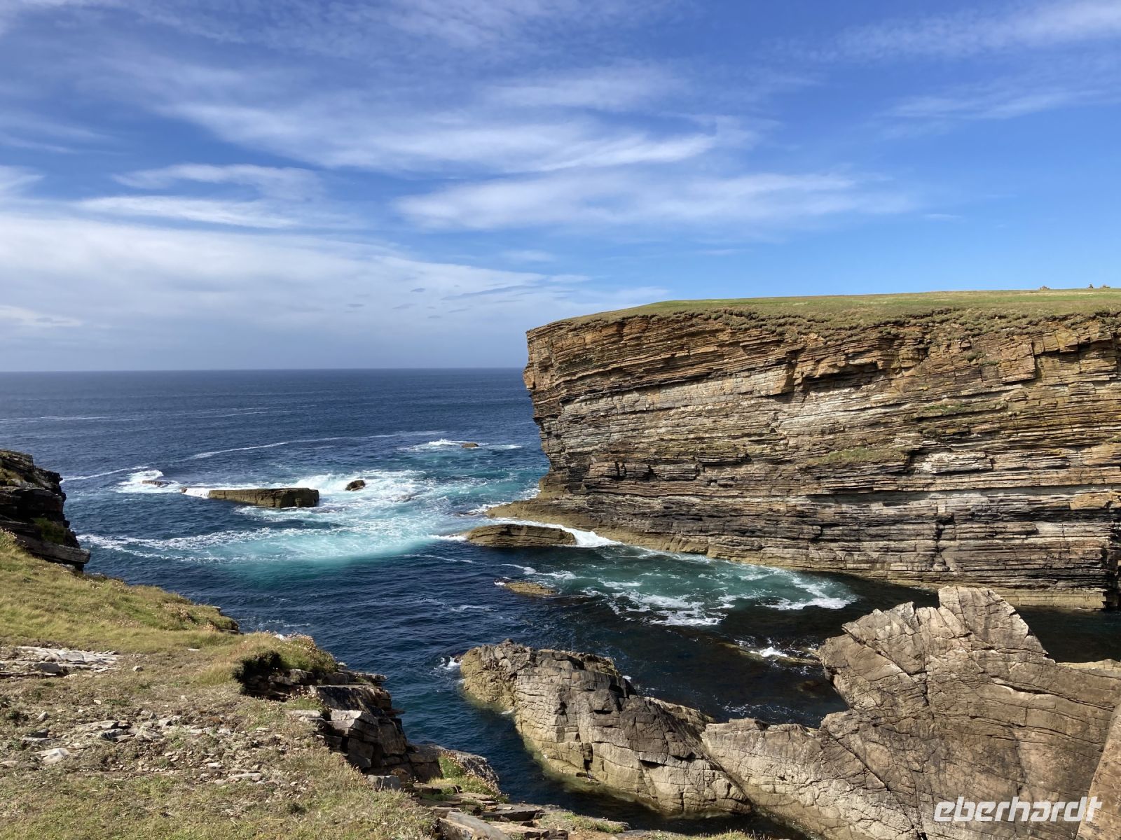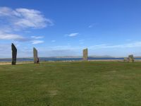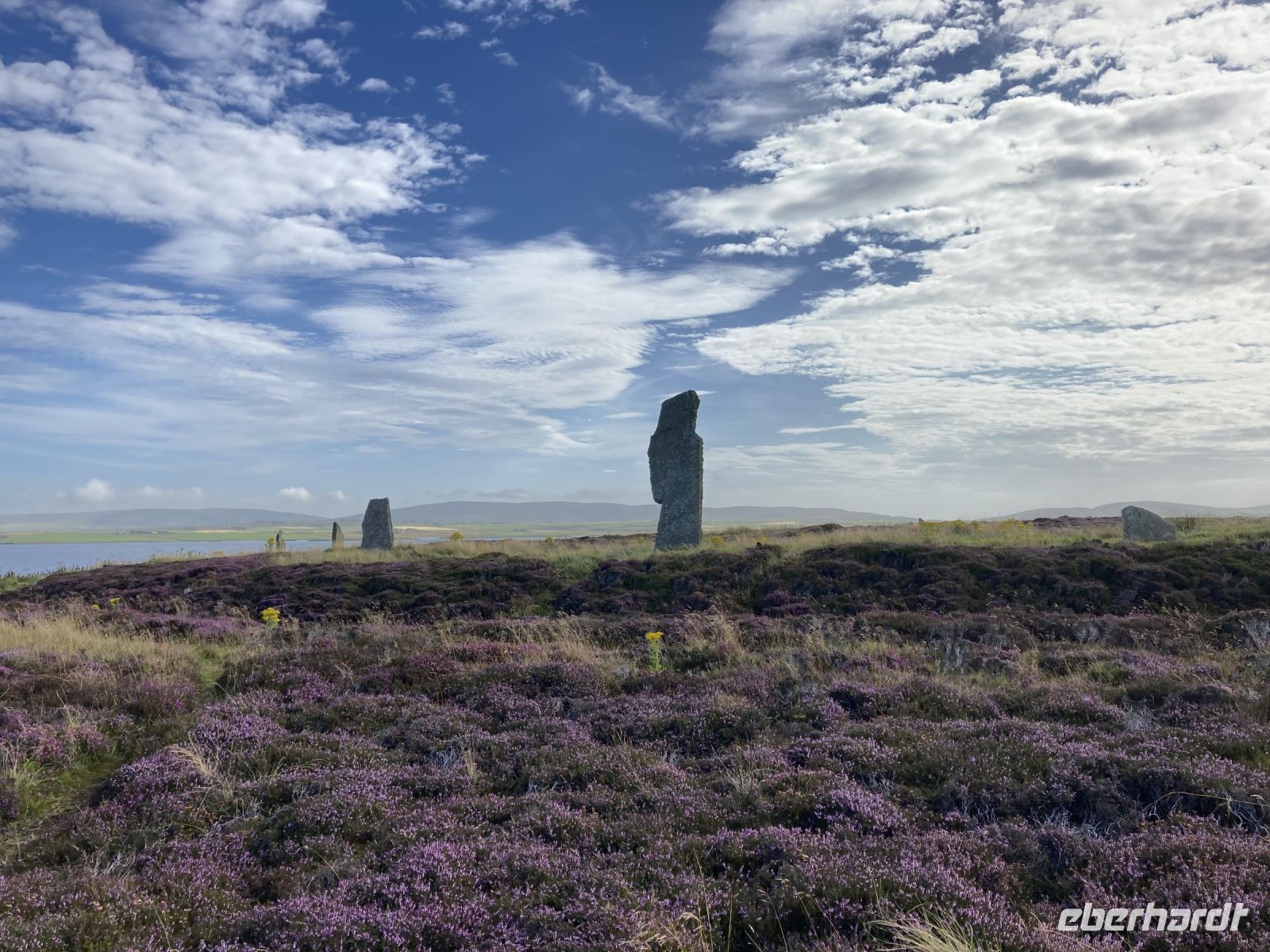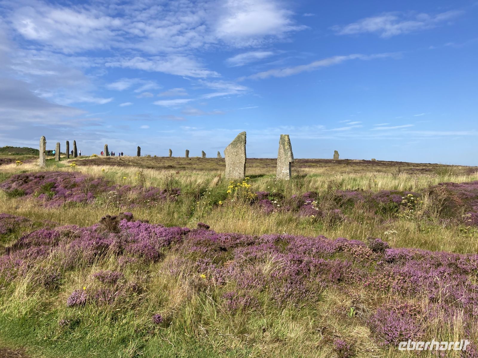 Nach der eindrucksvollen Überfahrt am gestrigen Tag sind wir schon sehr gespannt auf den heutigen Tag auf den Orkney-Inseln. Am Anfang steht ein sehr gutes Frühstücksbuffet im Stromness Hotel – und das macht gleich Freude auf mehr. Die Entfernungen sind zum Glück heute überschaubar, weshalb wir relativ schnell am ersten Ausflugsziel stehen, nämlich den Standing Stones of Stennes. Auch auf die Gefahr hin, 200 Jahre in der Vergangenheit zu landen, schauen wir uns den Steinkreis aus der Nähe an. Noch wesentlich größer und damit beeindruckender ist der Ring of Brodgar, den wir bei einem kleinen Spaziergang umrunden. Dank des tollen Himmels und Lichts sind auch hier wieder wunderschöne Fotos möglich. Beide Steinkreise gehören zum UNESCO-Weltkulturerbe „Heart of Neolithic Orkney“, dessen Zentrum das Steinzeitdorf Skara Brae bildet, in dem wohl auch die Erbauer der Kreise lebten. Bettkasten, Schrankwand, Wohnungstüren – gab es damals alles schon, wie wir uns während unseres Besuchs vergewissern, nur eben aus Stein. Da fühlen wir uns ein bisschen an Familie Feuerstein erinnert. Das benachbarte Skaill House, Wohnsitz der Lairds of Orkney, dürfen wir mit unserem Ticket ebenfalls besichtigen. Es bildet einen harten Kontrast zu den beengten Hütten aus der Jungsteinzeit, holt uns gleichzeitig aber langsam wieder in die Gegenwart zurück. Wir bleiben noch ein bisschen an der Westküste der Hauptinsel Mainland. Aufgrund des herrlichen Sonnenscheins mache ich mit meinen Gästen einen Überraschungsspaziergang zu den Klippen und Felsnadeln von Yesnaby. Auch Neil holt seine Kamera raus und kommt uns begeistert hinterher. Stundenlang könnten wir trotz des stürmischen Windes hier sitzen und zusehen, wie sich die Wellen an den Felsen brechen, doch die Orkneys haben noch viel mehr zu bieten! In Kirkwall, der Hauptstadt, machen wir eine späte Mittagspause im Stadtzentrum, die wir auch für einen Bummel durch die kleine Fußgängerzone mit hübschen Cafés und kleinen Geschäften nutzen können. Vor der großen St.-Magnus-Kathedrale treffen wir uns alle wieder und werfen einen Blick hinein in das „Licht des Nordens“. Die Gebeine des Heiligen, dem die Kirche geweiht ist, sollen sich sogar in einem Pfeiler neben dem Altar befinden. Am Nachmittag steht noch eine Panoramafahrt zu den Churchill Barriers auf dem Programm. Sie wurden während des 2. Weltkriegs auf Befehl Churchills erbaut, nachdem ein deutsches U-Boot in die Bucht von Skapa Flow eingedrungen war und dort die Royal Oak versenkt hatte, deren Schiffglocke wir übrigens eben erst in der Kathedrale gesehen haben. Heute stellen die Dämme eine wichtige Straßenverbindung zu den südlichen Inseln dar. Ganz unabhängig von der historischen Bedeutung gibt es in dieser Ecke der Inseln schöne Buchten und Strände. Mit der Ankündigung eines weiteren Fotostopps in einer Parkbucht auf leicht erhöhter Position mit Blick auf die Bucht von Skapa Flow locke ich meine Gäste aus dem Bus und zücke dann eine Flasche Highland Park Whisky, um mit ihnen unser Bergfest zu feiern, denn die Hälfte der Reise ist leider – wirklich leider – schon um. Anschließend beziehen wir unsere Zimmer im Orkney Hotel unweit der Kathedrale in Kirkwall, sodass wir uns von hier aus vor oder nach dem Dinner auch gut noch einmal die Beine vertreten können. Das Abendessen im Hotel ist wieder mal sehr gut, auch wenn das von mir als Hauptgericht gewählte Curry für meinen Geschmack etwas zu scharf geraten ist, was auch meine Gäste bemerken ...
