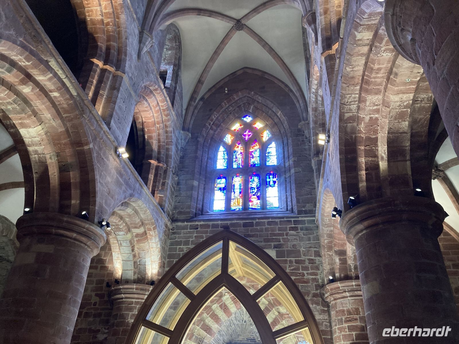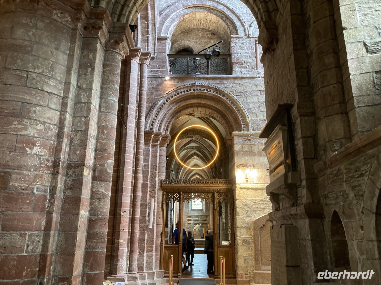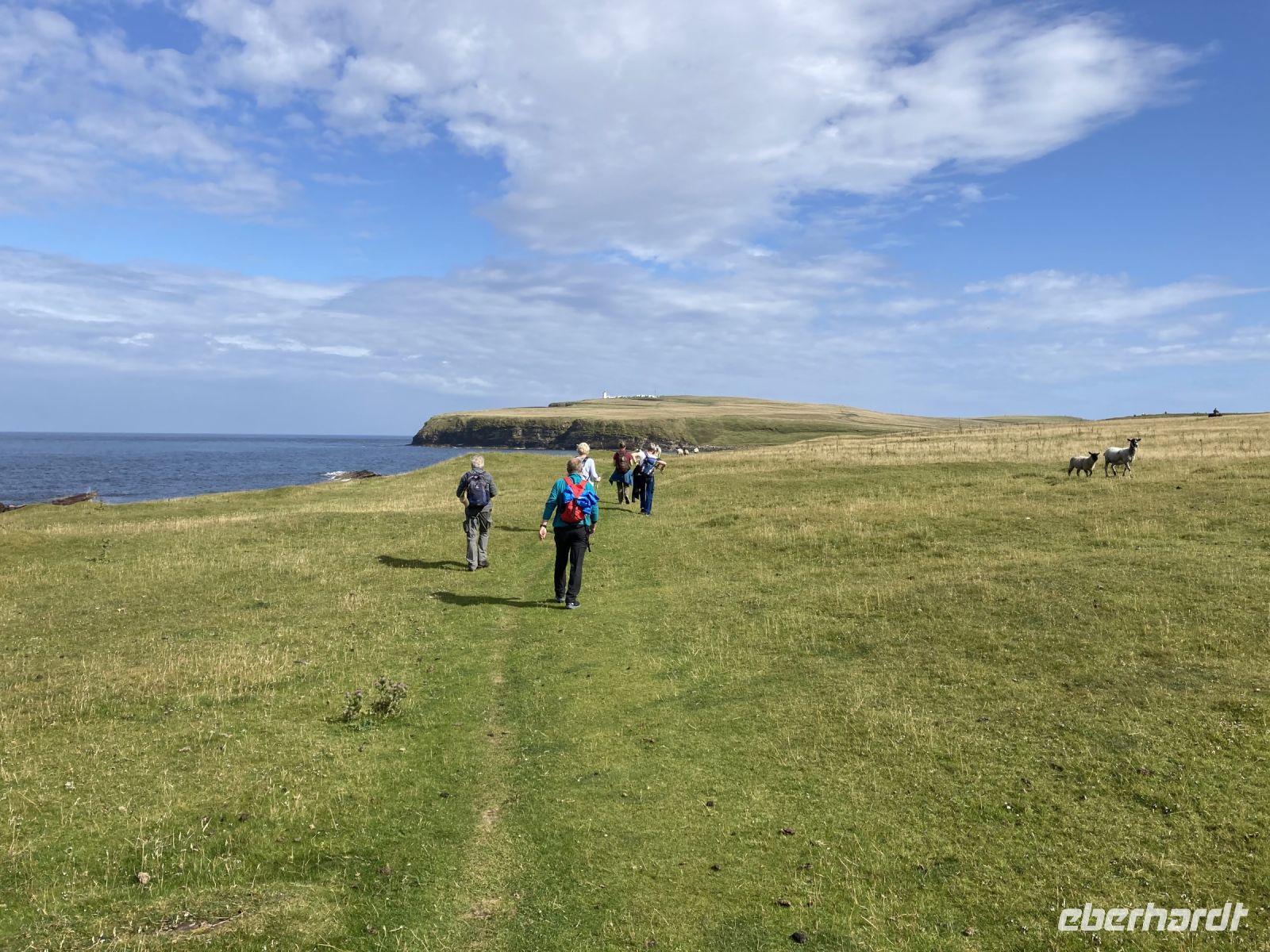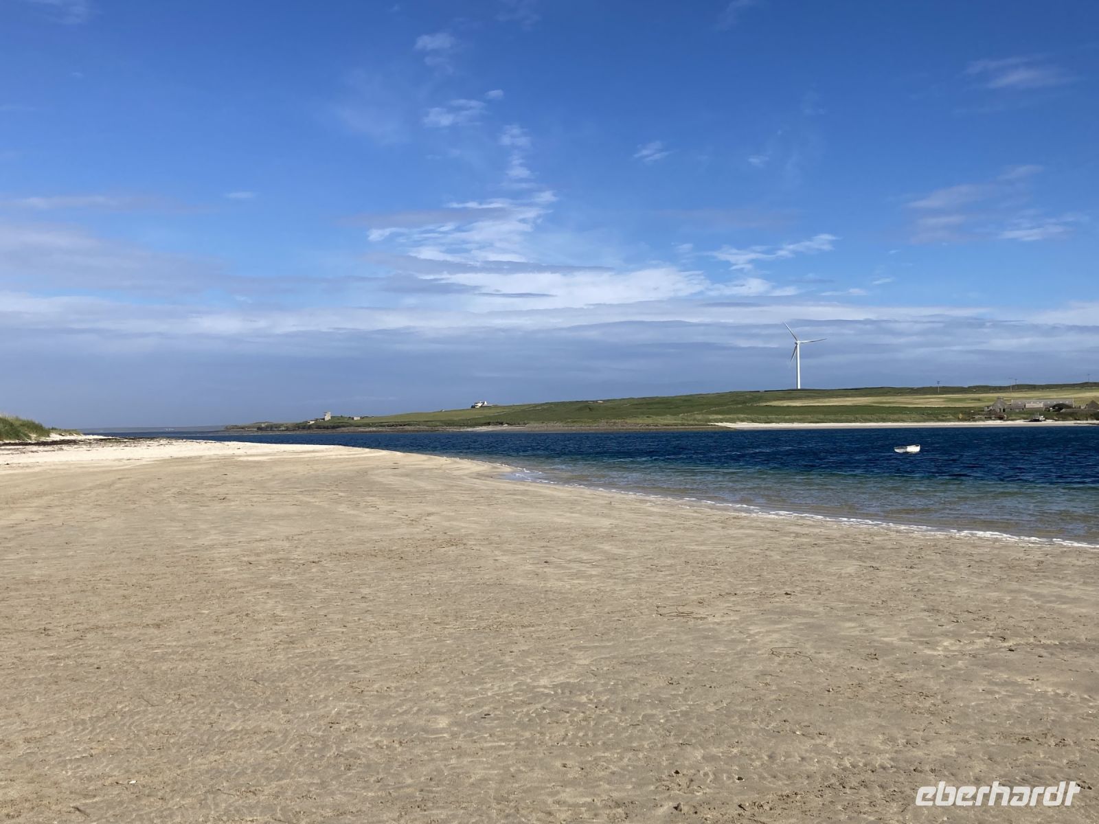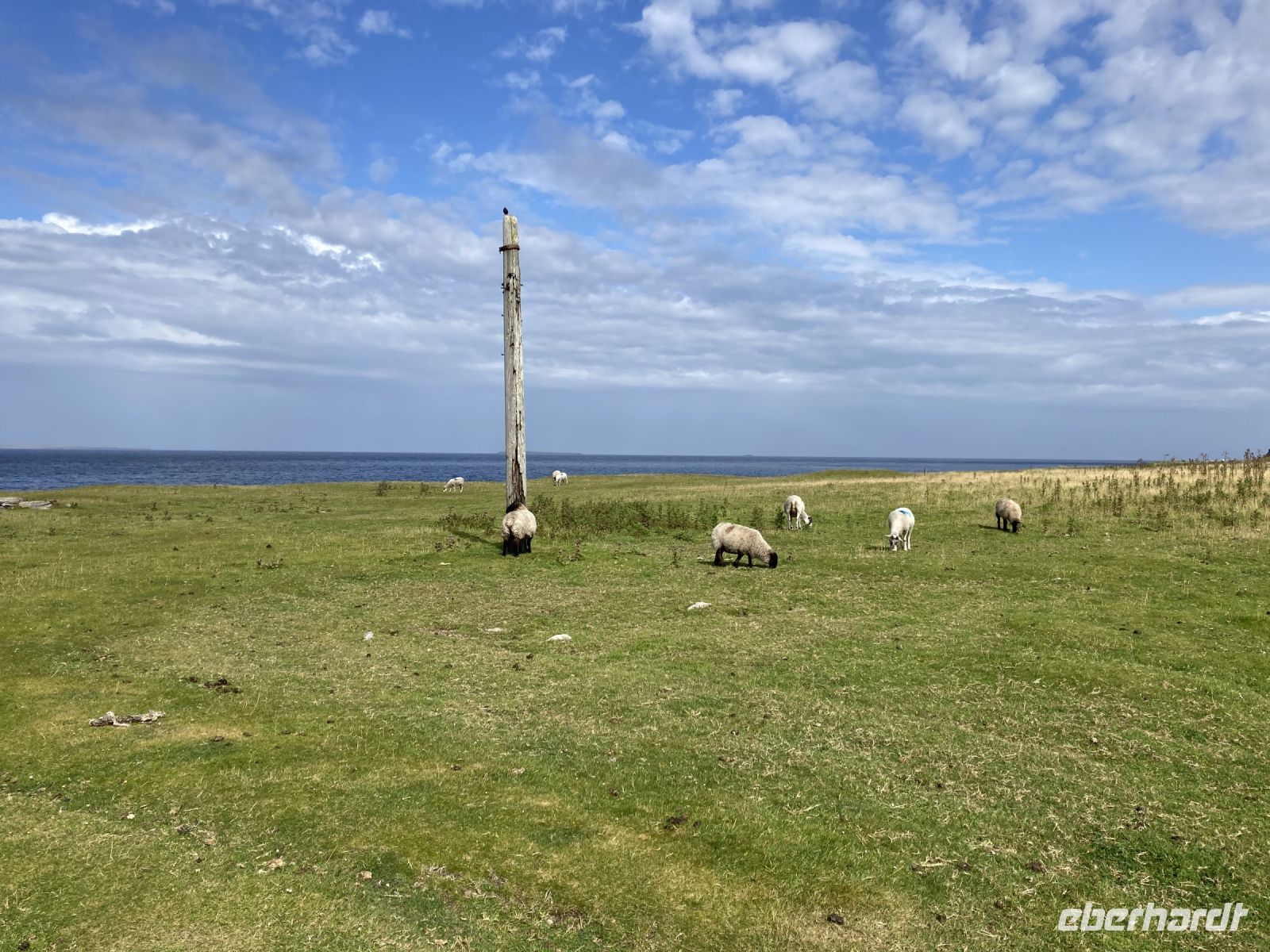 Nach der eindrucksvollen Überfahrt am gestrigen Tag sind wir schon sehr gespannt auf den heutigen Tag auf den Orkney-Inseln. Am Anfang steht ein sehr gutes Frühstücksbuffet im Stromness Hotel – und das macht gleich Freude auf mehr. Die Entfernungen sind zum Glück heute überschaubar, weshalb wir relativ schnell am ersten Ausflugsziel stehen, nämlich den Standing Stones of Stennes. Auch auf die Gefahr hin, 200 Jahre in der Vergangenheit zu landen, schauen wir uns den Steinkreis aus der Nähe an. Noch wesentlich größer und damit beeindruckender ist der Ring of Brodgar, den wir bei einem kleinen Spaziergang umrunden. Dank des tollen Himmels und Lichts sind auch hier wieder wunderschöne Fotos möglich. Beide Steinkreise gehören zum UNESCO-Weltkulturerbe „Heart of Neolithic Orkney“, dessen Zentrum das Steinzeitdorf Skara Brae bildet, in dem wohl auch die Erbauer der Kreise lebten. Bettkasten, Schrankwand, Wohnungstüren – gab es damals alles schon, wie wir uns während unseres Besuchs vergewissern, nur eben aus Stein. Da fühlen wir uns ein bisschen an Familie Feuerstein erinnert. Das benachbarte Skaill House, Wohnsitz der Lairds of Orkney, dürfen wir mit unserem Ticket ebenfalls besichtigen. Es bildet einen harten Kontrast zu den beengten Hütten aus der Jungsteinzeit, holt uns gleichzeitig aber langsam wieder in die Gegenwart zurück. Wir bleiben noch ein bisschen an der Westküste der Hauptinsel Mainland. Aufgrund des herrlichen Sonnenscheins mache ich mit meinen Gästen einen Überraschungsspaziergang zu den Klippen und Felsnadeln von Yesnaby. Auch Neil holt seine Kamera raus und kommt uns begeistert hinterher. Stundenlang könnten wir trotz des stürmischen Windes hier sitzen und zusehen, wie sich die Wellen an den Felsen brechen, doch die Orkneys haben noch viel mehr zu bieten! In Kirkwall, der Hauptstadt, machen wir eine späte Mittagspause im Stadtzentrum, die wir auch für einen Bummel durch die kleine Fußgängerzone mit hübschen Cafés und kleinen Geschäften nutzen können. Vor der großen St.-Magnus-Kathedrale treffen wir uns alle wieder und werfen einen Blick hinein in das „Licht des Nordens“. Die Gebeine des Heiligen, dem die Kirche geweiht ist, sollen sich sogar in einem Pfeiler neben dem Altar befinden. Am Nachmittag steht noch eine Panoramafahrt zu den Churchill Barriers auf dem Programm. Sie wurden während des 2. Weltkriegs auf Befehl Churchills erbaut, nachdem ein deutsches U-Boot in die Bucht von Skapa Flow eingedrungen war und dort die Royal Oak versenkt hatte, deren Schiffglocke wir übrigens eben erst in der Kathedrale gesehen haben. Heute stellen die Dämme eine wichtige Straßenverbindung zu den südlichen Inseln dar. Ganz unabhängig von der historischen Bedeutung gibt es in dieser Ecke der Inseln schöne Buchten und Strände. Mit der Ankündigung eines weiteren Fotostopps in einer Parkbucht auf leicht erhöhter Position mit Blick auf die Bucht von Skapa Flow locke ich meine Gäste aus dem Bus und zücke dann eine Flasche Highland Park Whisky, um mit ihnen unser Bergfest zu feiern, denn die Hälfte der Reise ist leider – wirklich leider – schon um. Anschließend beziehen wir unsere Zimmer im Orkney Hotel unweit der Kathedrale in Kirkwall, sodass wir uns von hier aus vor oder nach dem Dinner auch gut noch einmal die Beine vertreten können. Das Abendessen im Hotel ist wieder mal sehr gut, auch wenn das von mir als Hauptgericht gewählte Curry für meinen Geschmack etwas zu scharf geraten ist, was auch meine Gäste bemerken ...