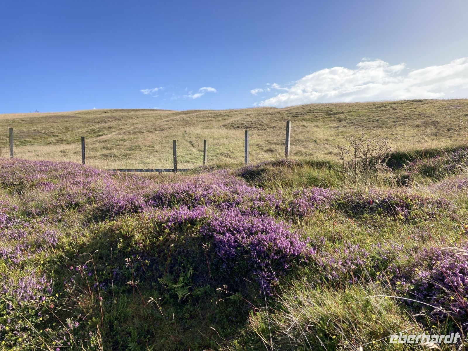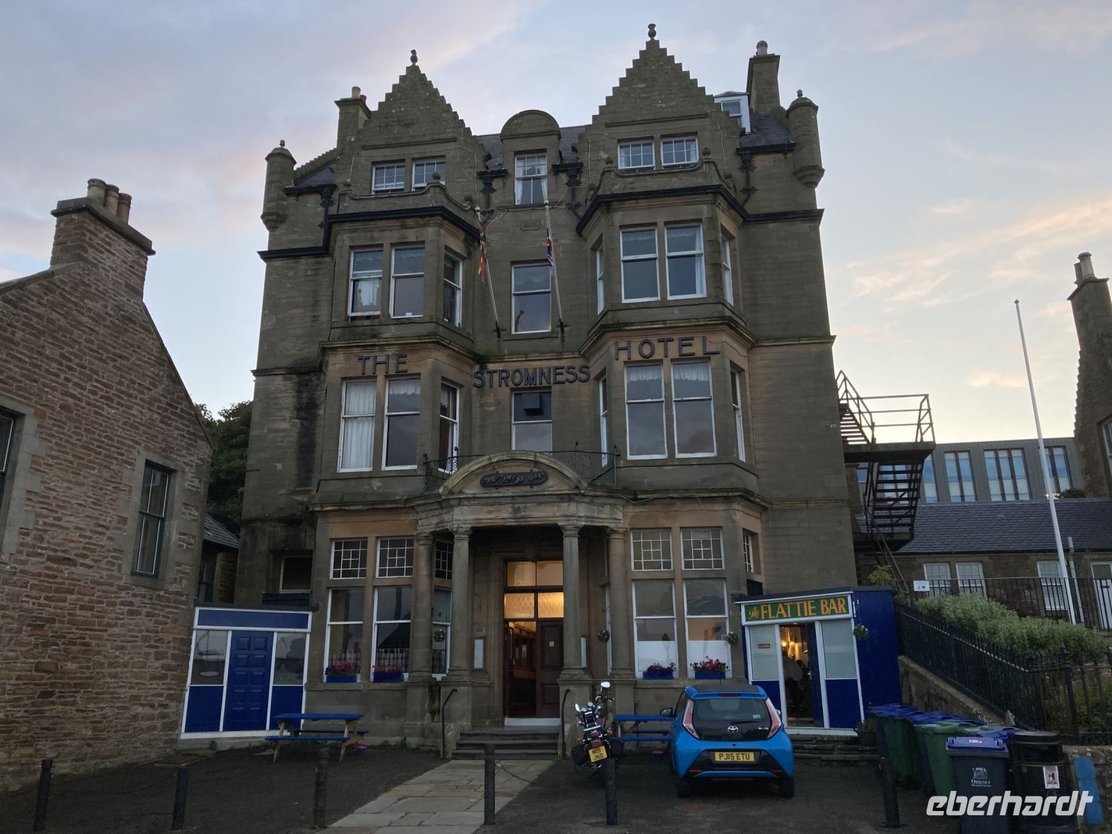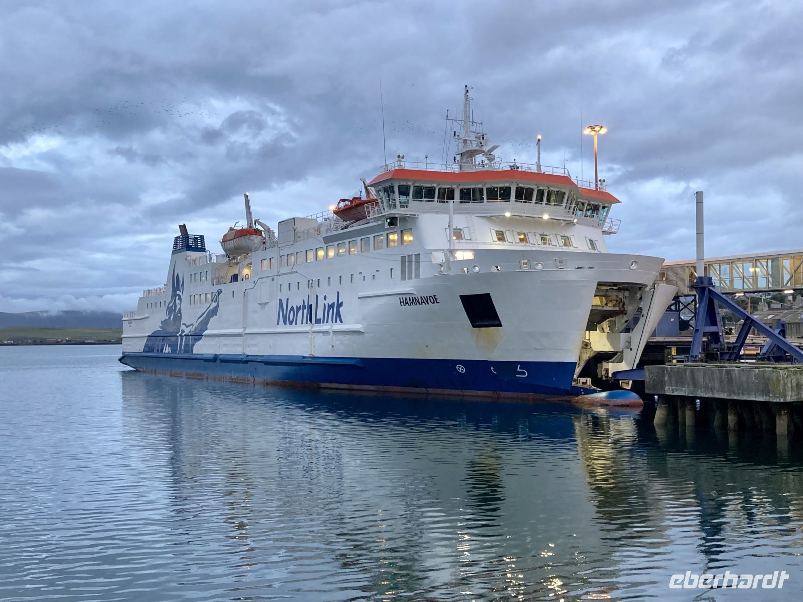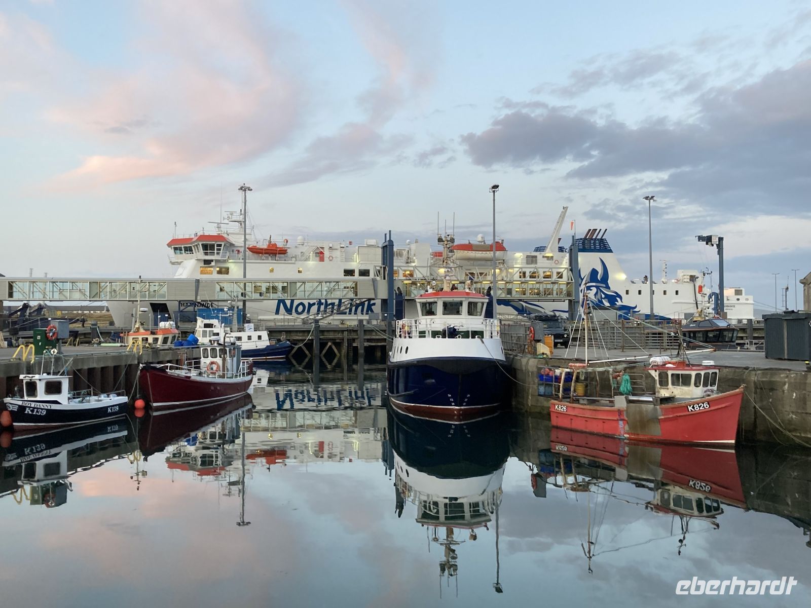 Ausschlafen, Whisky verkosten, eine kleine Klippenwanderung beim nördlichsten Ort Großbritanniens und ein 3-Gänge-Menü auf der Fähre zu den Orkney-Inseln? Klingt nach einem herrlichen Urlaubstag für meine Gäste! Jetzt muss nur noch das Wetter mitspielen … Und das soll heute relativ wechselhaft werden. Wir brauchen also ein bisschen Glück. Aber bis jetzt schien uns das Glück ja sehr hold zu sein. Wir brechen also nach einem guten und ruhigen Frühstück (die große andere deutsche Reisegruppe muss schon 8:10 (!) abfahren) auf in den Norden und ereichen nach aufgerundet einer Stunde Fahrt — auch durch einen Regenschauer — die berühmte Glenmorangie Distillery. Bevor wir aber das kostbare Wasser des Lebens verkosten dürfen, müssen wir natürlich an einer Führung durch die Produktions- und Lagerhallen teilnehmen, sonst können wir das Ergebnis (und auf das fertige Produkt muss man hier mindestens 10 Jahre geduldig warten!) ja gar nicht angemessen würdigen. Nachdem wir die große Halle mit den höchsten Brennblasen Schottlands und das historische Lagerhaus mit seinen vielen Fässern gesehen haben, dürfen wir im Verkostungsraum jeweils hinter zwei Gläsern mit einer goldenen Flüssigkeit Platz nehmen. Und es sind zwei ganz besondere Wässerchen, die uns vorgesetzt wurden, Sondereditionen, die sich jeweils durch einen besonderen Twist vom Standardprodukt (immerhin auch schon ein 10-jähriger Single Malt) abheben. Einfach lecker! Auf dem weiteren Weg in den Norden führt die Straße meist parallel zur Nordseeküste, wodurch wir fast immer das Meer sehen können. Wir sehen unsere bevorstehende Küstenwanderung unterwegs auf der Höhe von Wick schon ins Wasser fallen, denn der Himmel verdunkelt sich immer mehr und dann geht der Regen auch wieder los. Doch pünktlich bei unserer Ankunft in John o‘Groats ist die Wolkenfront vorübergezogen. Mit dem unterwegs gekauften Proviant stärken wir uns für den kleinen Aufstieg zum Stevenson-Leuchtturm am Duncansby Head. Grasende Schafe, das türkisblaue Meer und ein feiner weißer Sandstrand säumen den Pfad über die Wiese. Nun geht es etwas bergauf bis zum Leuchtturm. Schon bis hierhin hat sich der Weg gelohnt. Aber das beste kommt ja erst noch! Kurz haben wir sie bereits rechts von uns gesehen, nun laufen wir direkt darauf zu: die Stacks of Duncansby. Was haben wir wieder für ein Glück! So schönes Wetter und so ein toller Himmel! Perfekt für tolle Fotos! Die Felsnadeln vor den Klippen an der Küste sind auch wirklich beeindruckend. Auf dem Rückweg nach John o‘Groats können wir uns außerdem am blühenden Heidekraut kaum sattsehen. Das Wetterglück bleibt uns auch am Abend treu. Beim Einstieg in die Fähre zu den Orkneys prasselt wieder ein Regenschauer auf die Hamnavoe nieder. Da schaut der aufgemalte stolze Wikinger ganz schön bedröppelt. Doch kaum haben wir uns mit drei Gängen vom Buffet (mehr als) gesättigt, hört der Regen wieder rechtzeitig auf und macht die Bühne frei für das bestmögliche Spektakel während dieser Überfahrt: die Abendsonne, die die hoch aufragenden Klippen der Insel Hoy wie ein riesiger Scheinwerfer anstrahlt. Mitten im Rampenlicht steht der einsame Wächter, der Old Man of Hoy, und genießt sichtlich die Bewunderung. Bei der Ankunft in Stromness geht gerade die Sonne hinter der Landzunge unter und sendet einen letzten Gruß über den Hügel. Unser Hotel liegt nur wenige Schritte vom Terminal entfernt und auch eine (Hafen-)Kneipe liegt gleich um die Ecke — perfekt, um den Abend gemütlich ausklingen zu lassen.