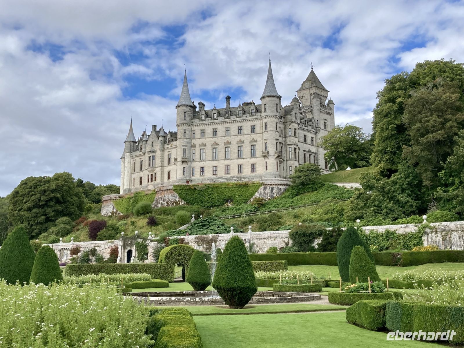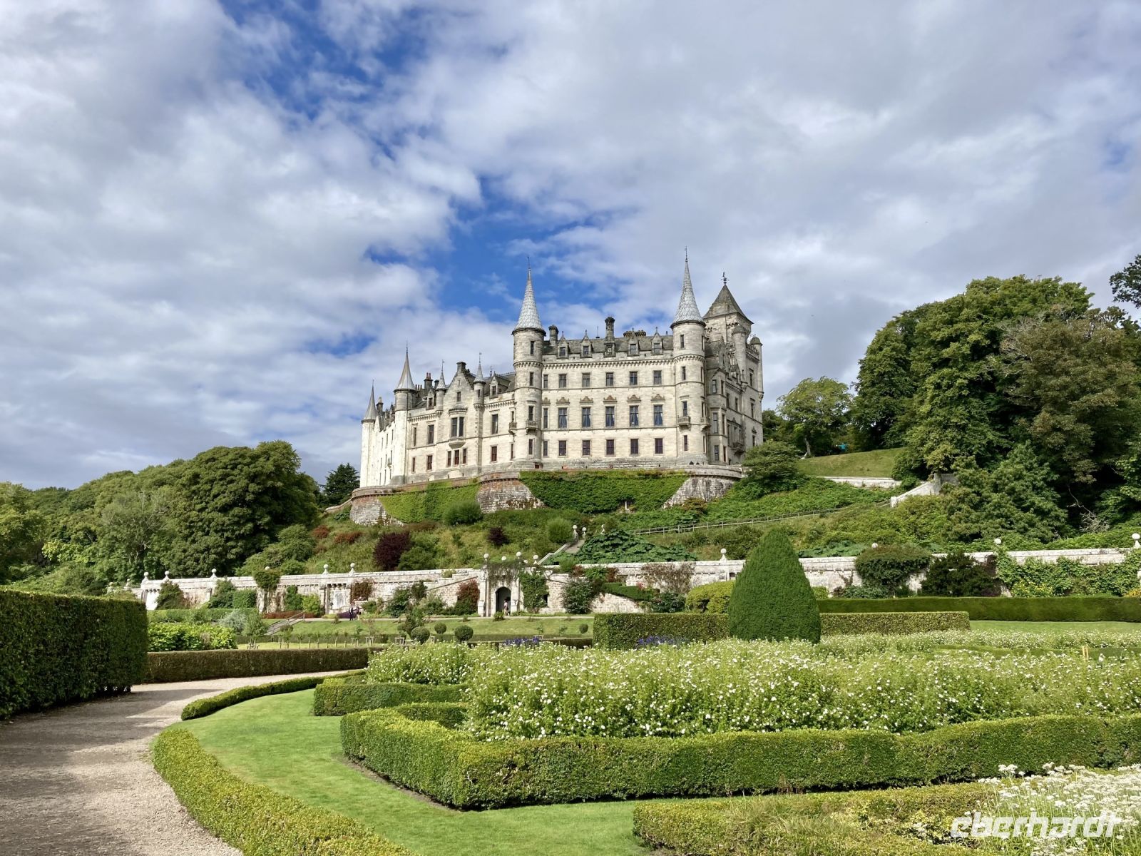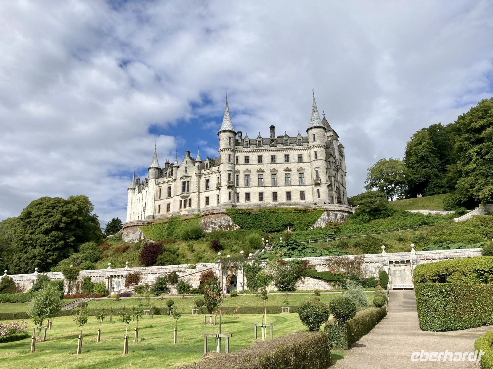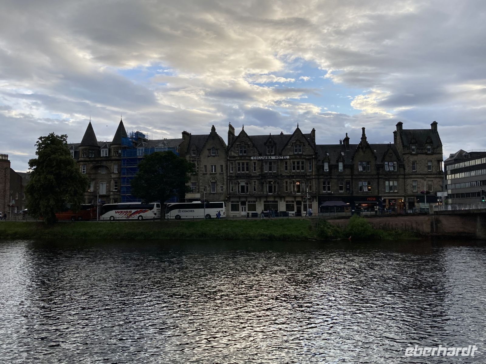Das Rollen unserer Koffer hallt durch das nächtliche Kirkwall, dessen meiste Bewohner noch tief und fest schlafen. Reisen bedeutet manchmal leider auch ein zeitiges Aufstehen, was gar nicht am bösen Willen des Reiseleiters liegt, sondern an der Abfahrtszeit unserer Fähre zurück nach Scrapster. Und die ist heute leider schon um 06:30 Uhr ab Stromness. Dafür ist das Frühstück an Bord des Schiffes; wir können uns wieder vom Buffet bedienen und haben 1,5 Stunden dafür Zeit. Das ist doch auch mal schön entspannend! Währenddessen tuckert die Hamnavoe — begleitet von einigen Seehunden — aus dem Hafen von Stromness und wieder an den mächtigen Klippen von Hoy vorbei. Die anschließende Fahrt von Scrapster nach Golspie können wir nutzen, um etwas Schlaf nachzuholen – mit Ausnahme von Neil natürlich. Der darf dafür die Augen zumachen, während wir das majestätische Dunrobin Castle mit seinen 189 Zimmern besichtigen (wovon allerdings nur ein Teil öffentlich zugänglich ist). Während der Garten unterhalb dem Vorbild Versailles nachempfunden ist, scheint das Schloss selbst eher einem Disney-Film entsprungen zu sein. Ein bisschen Neid auf die herrliche Aussicht kommt schon auf, als wir aus dem großen Wohnzimmer oder der holzvertäfelten Bibliothek auf den Garten und das Meer blicken. Die prognostizierten hohen Heiz- und Personalkosten schrecken uns dann aber doch vom Erwerb der Immobilie ab; da soll sich der Clan Sutherland doch bitte schon selbst mit rumschlagen. Apropos schlagen: Vernichtend ge-schlagen wurden die Jakobiten unter Bonnie Prince Charlie 1746 auf dem Schlachtfeld von Culloden, trotz anfänglicher Erfolge in ihrer Kampagne. Da viele Highland-Clans Anhänger der Stuart-Monarchie waren, nimmt die Schlacht nach wie vor einen wichtigen Platz in ihrer Erinnerungskultur ein. Deshalb kann das Schlachtfeld auch heute noch besichtigt werden, einschließlich eines gut konzipierten Museums und vieler Gedenksteine der einzelnen Clans. Natürlich hat auch hier die Outlander-Saga für ein erhöhtes Besucheraufkommen gesorgt. Das Wetter wird nun etwas wechselhafter, bleibt aber trocken. So können wir tatsächlich nach dem erneuten Einchecken im Royal Highland Hotel in Inverness und unserem obligatorischen 3-Gänge-Menü den geplanten kleinen Abendspaziergang am River Ness zu den Ness Islands unternehmen und noch einmal nach Nessie (oder einem neuen Zweitwohnsitz in einem der schicken Häuschen entlang des Flusses) Ausschau halten.