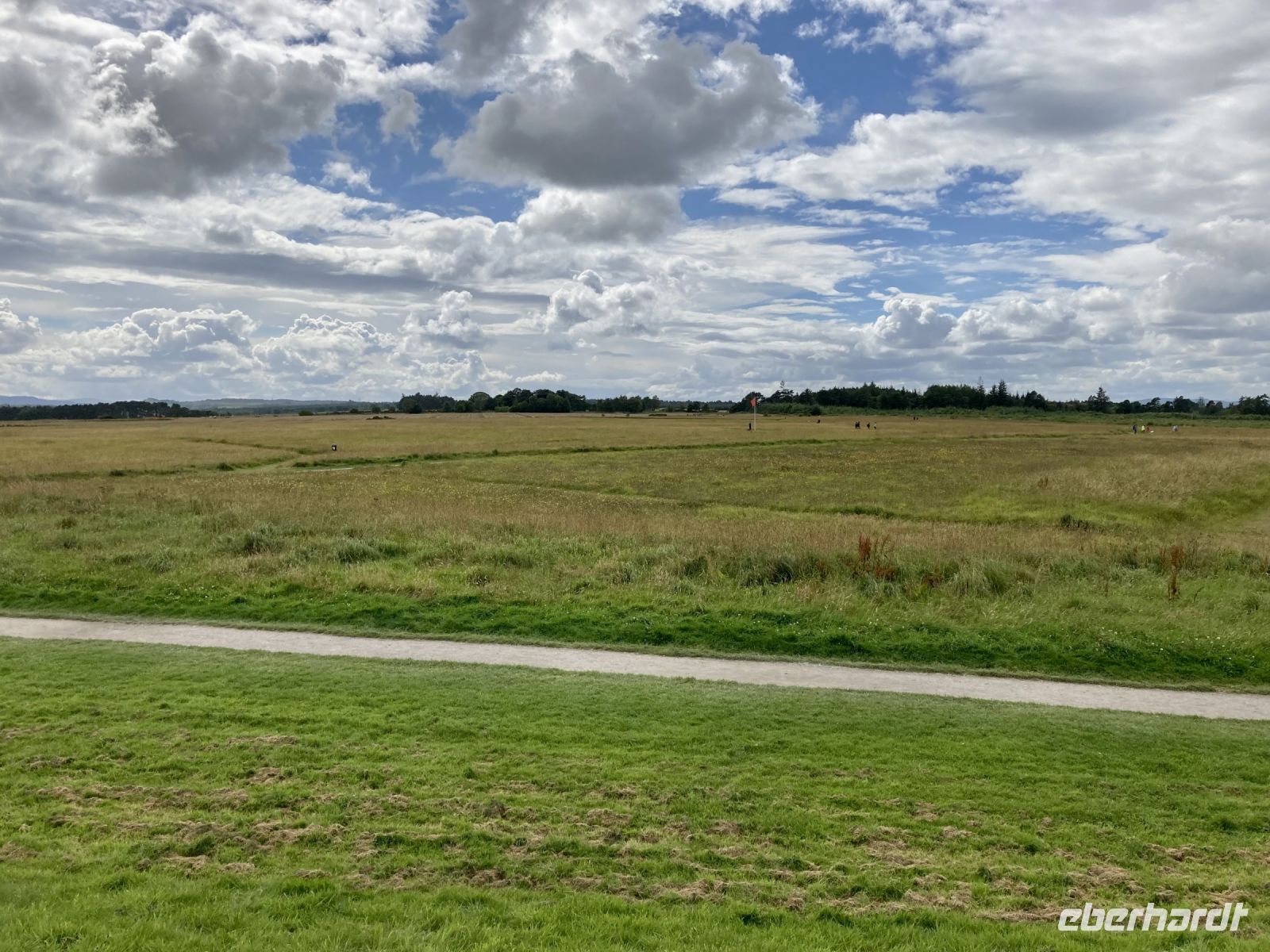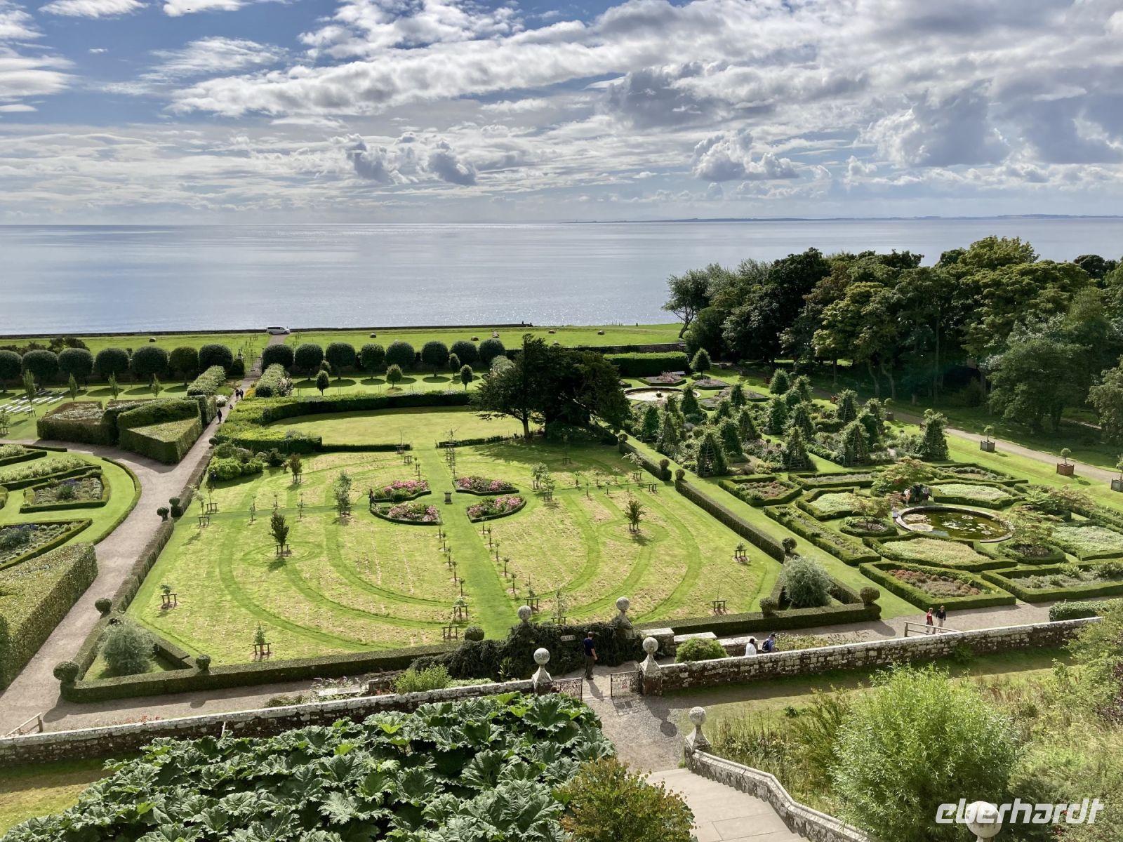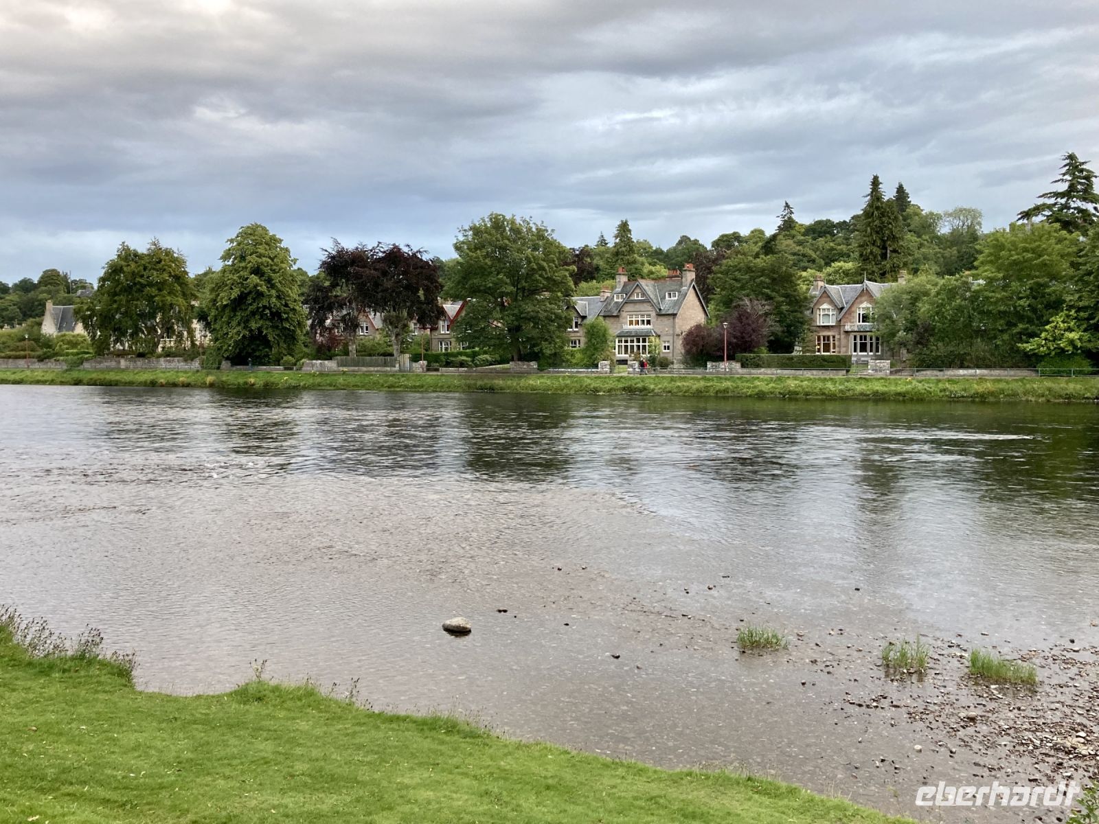 Das Rollen unserer Koffer hallt durch das nächtliche Kirkwall, dessen meiste Bewohner noch tief und fest schlafen. Reisen bedeutet manchmal leider auch ein zeitiges Aufstehen, was gar nicht am bösen Willen des Reiseleiters liegt, sondern an der Abfahrtszeit unserer Fähre zurück nach Scrapster. Und die ist heute leider schon um 06:30 Uhr ab Stromness. Dafür ist das Frühstück an Bord des Schiffes; wir können uns wieder vom Buffet bedienen und haben 1,5 Stunden dafür Zeit. Das ist doch auch mal schön entspannend! Währenddessen tuckert die Hamnavoe — begleitet von einigen Seehunden — aus dem Hafen von Stromness und wieder an den mächtigen Klippen von Hoy vorbei. Die anschließende Fahrt von Scrapster nach Golspie können wir nutzen, um etwas Schlaf nachzuholen – mit Ausnahme von Neil natürlich. Der darf dafür die Augen zumachen, während wir das majestätische Dunrobin Castle mit seinen 189 Zimmern besichtigen (wovon allerdings nur ein Teil öffentlich zugänglich ist). Während der Garten unterhalb dem Vorbild Versailles nachempfunden ist, scheint das Schloss selbst eher einem Disney-Film entsprungen zu sein. Ein bisschen Neid auf die herrliche Aussicht kommt schon auf, als wir aus dem großen Wohnzimmer oder der holzvertäfelten Bibliothek auf den Garten und das Meer blicken. Die prognostizierten hohen Heiz- und Personalkosten schrecken uns dann aber doch vom Erwerb der Immobilie ab; da soll sich der Clan Sutherland doch bitte schon selbst mit rumschlagen. Apropos schlagen: Vernichtend ge-schlagen wurden die Jakobiten unter Bonnie Prince Charlie 1746 auf dem Schlachtfeld von Culloden, trotz anfänglicher Erfolge in ihrer Kampagne. Da viele Highland-Clans Anhänger der Stuart-Monarchie waren, nimmt die Schlacht nach wie vor einen wichtigen Platz in ihrer Erinnerungskultur ein. Deshalb kann das Schlachtfeld auch heute noch besichtigt werden, einschließlich eines gut konzipierten Museums und vieler Gedenksteine der einzelnen Clans. Natürlich hat auch hier die Outlander-Saga für ein erhöhtes Besucheraufkommen gesorgt. Das Wetter wird nun etwas wechselhafter, bleibt aber trocken. So können wir tatsächlich nach dem erneuten Einchecken im Royal Highland Hotel in Inverness und unserem obligatorischen 3-Gänge-Menü den geplanten kleinen Abendspaziergang am River Ness zu den Ness Islands unternehmen und noch einmal nach Nessie (oder einem neuen Zweitwohnsitz in einem der schicken Häuschen entlang des Flusses) Ausschau halten.