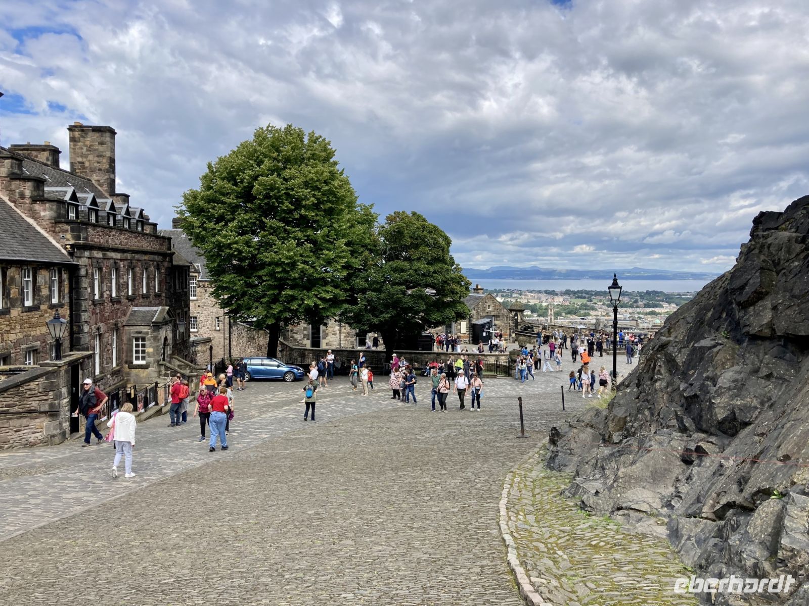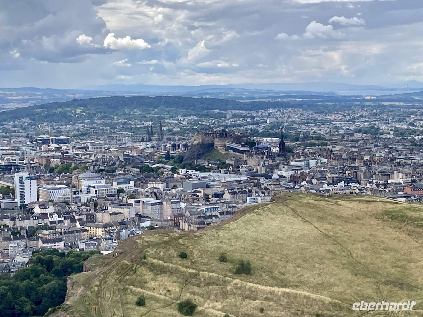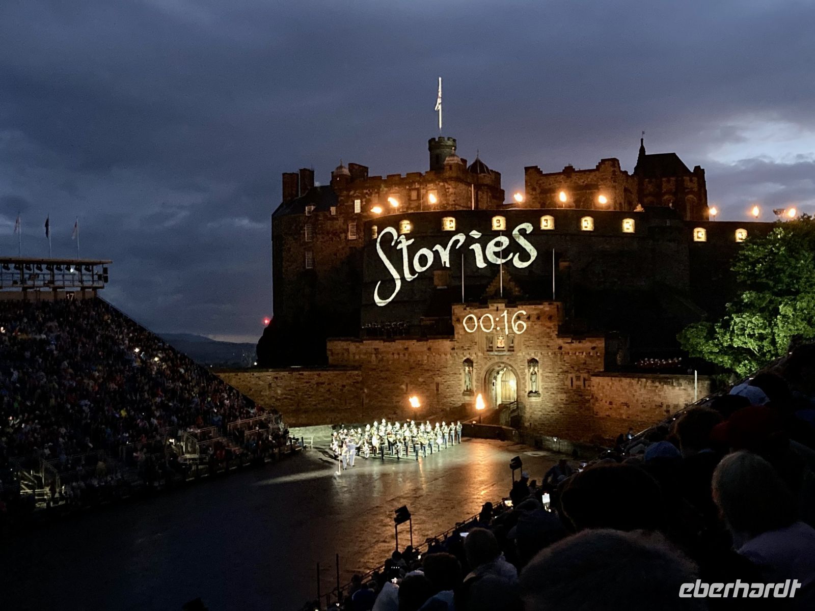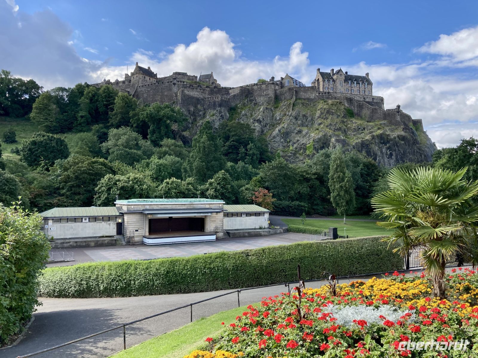 Mit unserem neuen Chauffeur Les und unserer Stadtführerin Meriel stürzen wir uns mutig ins Getümmel in der Innenstadt. Während wir uns langsam dem Castle auf seinem Hügel nähern — es ist schon von weitem sichtbar — wirken die Straßen um uns herum zunächst noch recht ruhig und verschlafen. Wir widmen uns zunächst der Ende des 18. Jahrhunderts errichteten Neustadt, betrachten vom Bus aus die georgianischen Wohn- und Geschäftshäuser aus Sandstein sowie die grünen Privatgärten dazwischen. Hier wohnten berühmte Persönlichkeiten wie David Hume und Robert Louis Stevenson; heute residiert am Charlotte Square der schottische First Minister. Schön ruhig ist es auch noch in den Princes Street Gardens unterhalb der Burg, in denen wir mit Meriel eine kleine Runde drehen und das Castle fotografieren. Von hier unten im Graben aus erscheint es oben auf dem Vulkanfelsen noch gewaltiger und bedrohlicher. Während der Rundfahrt durch die Altstadt sehen wir dann schon deutlich (!) mehr Menschen auf den Straßen, vor allem entlang der Royal Mile, und vor und im Castle herrscht ein ganz schönes Gewusel. Der August ist Festival-Zeit in Edinburgh: Fringe Festival, Edinburgh Festival und natürlich Military Tattoo. Meriel lenkt uns geschickt durch die Massen und erläutert uns die wichtigsten Gebäude und historischen Eckpunkte. Dann entlässt sie uns vor der großen Halle in die Freiheit bzw. Freizeit. Wir danken ihr herzlich für die informative und abwechslungsreiche Stadtführung, bevor wir uns verstreuen und auf eigene Faust die schottischen Kronjuwelen und/oder anderen Sehenswürdigkeiten im Castle besichtigen. Einen großen Teil meiner Gruppe sehe ich am Nachmittag dann tatsächlich zur Besteigung des Arthur‘s Seat wieder. Ich bewundere den Enthusiasmus dieser Gruppe! Na gut, dann wollen wir uns mal schön gemütlich den Hausberg Edinburghs hinaufquä- … äh -begeben. Auch hier sind noch einige Leute unterwegs, aber natürlich deutlich weniger als auf der Royal Mile, obwohl das Wetter nahezu ideal für den Aufstieg ist. Und natürlich werden wir oben mit einer herrlichen Aussicht über die ganze Stadt und Umgebung belohnt; deshalb haben wir ja die Anstrengung überhaupt auf uns genommen. Nach dem Aufstieg ist vor dem Abstieg, der zwar schneller geht, aber durchaus auch Vorsicht erfordert, zumal während der ersten Hälfte auch ein paar Regentropfen vom Himmel fallen. Da wir sehr gut in der Zeit liegen, können wir uns unten im Café am Holyrood Palace mit einem Kaffee, Tee oder einer heißen Schokolade für die erfolgreiche Bewältigung auch dieser Wanderung belohnen. Derweil trudelt vor dem Parlament der Rest der Gruppe ein. Zum Duschen, Umziehen und Abendessen fährt uns Les (fast) alle zurück zum Hotel in Leith. Erfrischt und gestärkt werden wir anschließend für das Abendprogramm mit Taxis wieder vor das Castle gefahren — alle meine Gäste haben (zum Glück) Tickets für das Royal Edinburgh Military Tattoo gebucht, diesmal unter dem Leitmotiv „Stories“. Dieses herrliche Spektakel sollte man sich wirklich nicht entgehen lassen! Die über 800 aus vielen Ländern angereisten Musiker, Sänger und Tänzer erschaffen gemeinsam eine abwechslungsreiche, wunderbare Show, die zum Song „The Story“ von Runrig in einem emotionalen und mitreißenden Finale mündet. Traditionell beendet der einsame Dudelsackspieler auf der Burgmauer das Event, bevor alle Mitwirkenden aus der Arena ziehen. Ganz begeistert und — im positiven Sinne – emotional aufgewühlt geht es zurück ims Hotel, doch es soll noch eine Weile dauern, bevor wir innerlich zur Ruhe kommen. Auch mir geht die Musik eine ganze Weile nicht aus dem Kopf und ich schaue mir wieder und wieder meine Fotos an.
