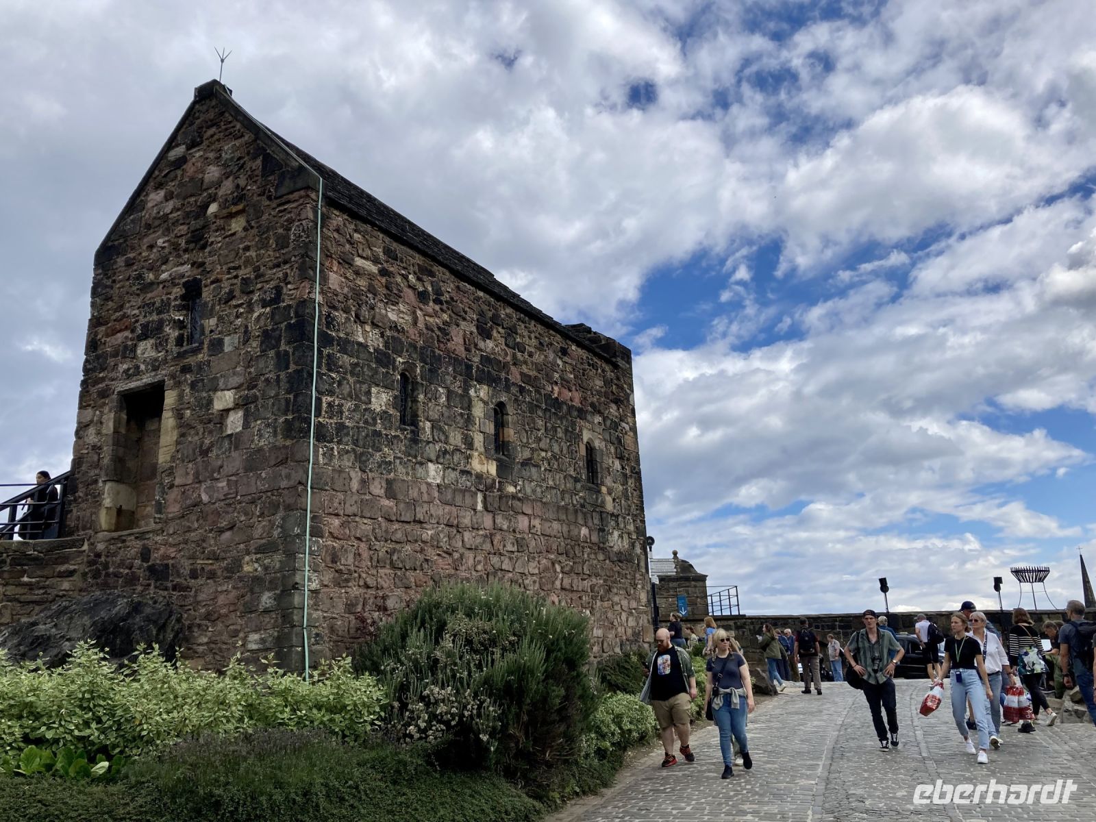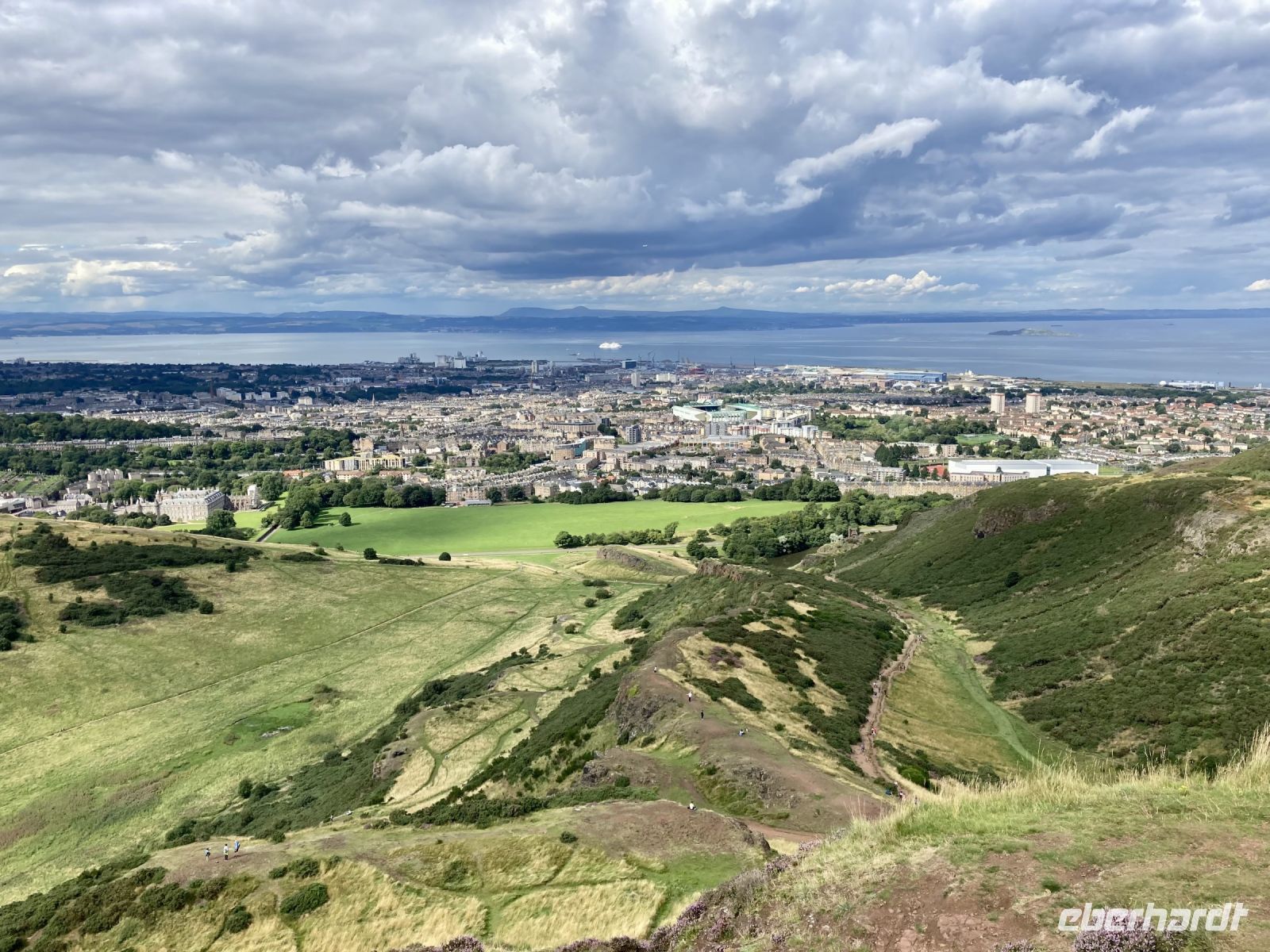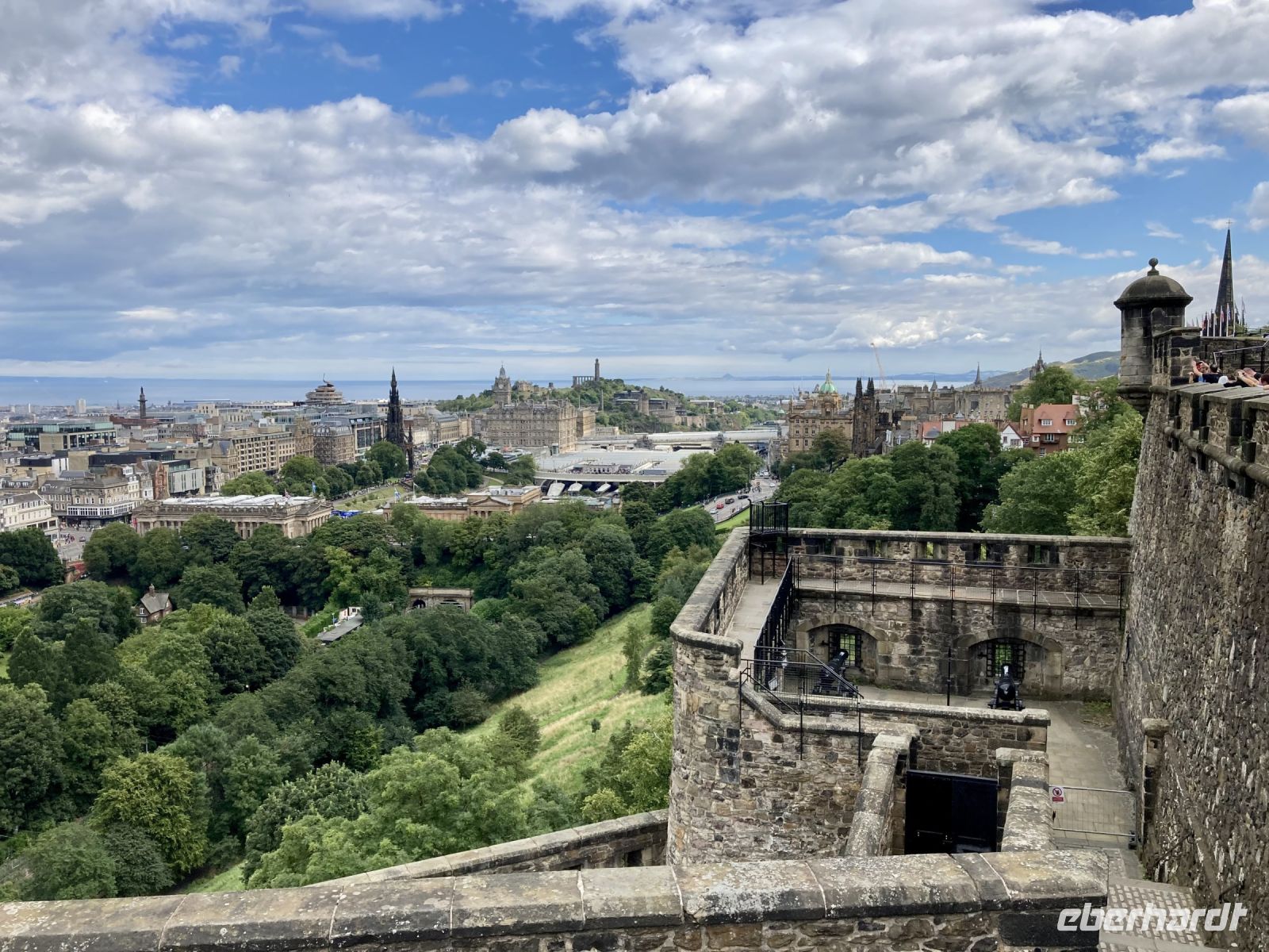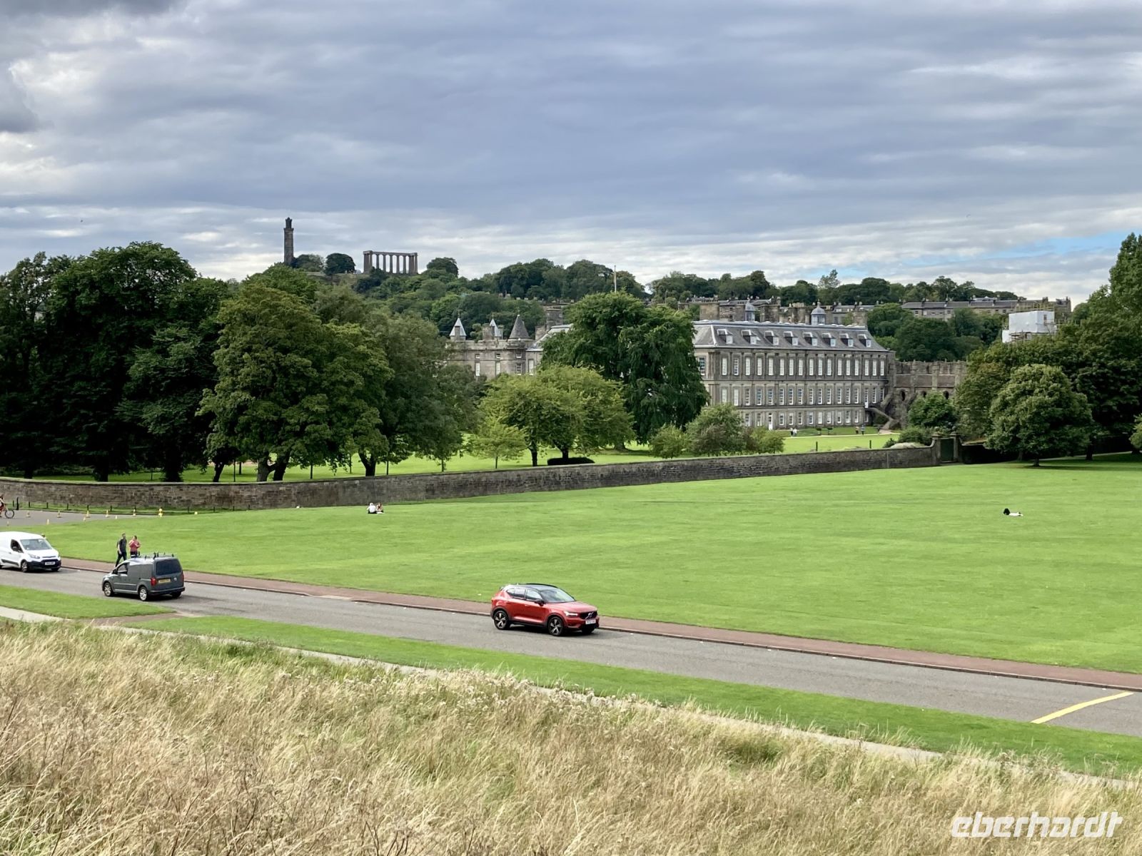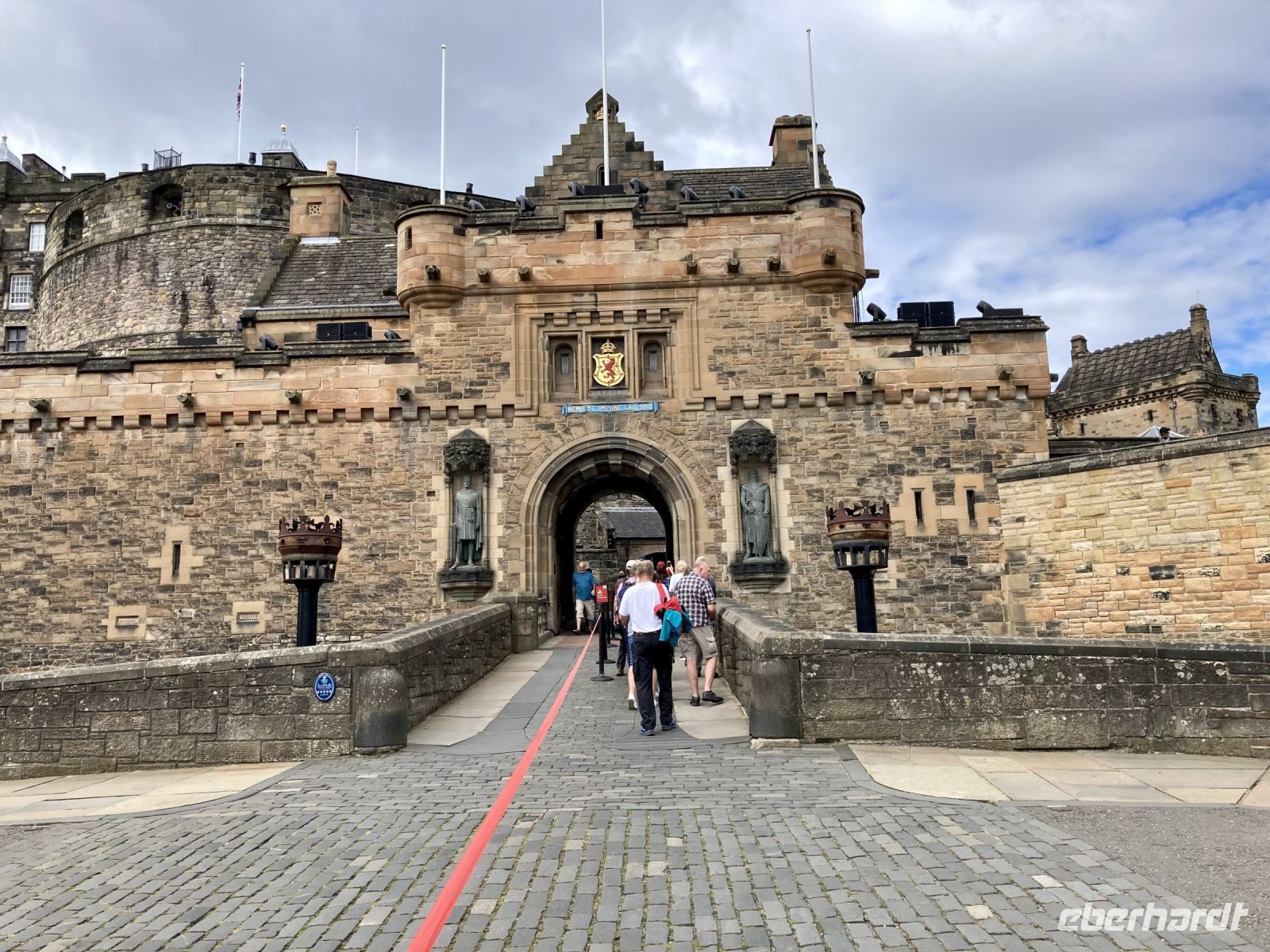 Mit unserem neuen Chauffeur Les und unserer Stadtführerin Meriel stürzen wir uns mutig ins Getümmel in der Innenstadt. Während wir uns langsam dem Castle auf seinem Hügel nähern — es ist schon von weitem sichtbar — wirken die Straßen um uns herum zunächst noch recht ruhig und verschlafen. Wir widmen uns zunächst der Ende des 18. Jahrhunderts errichteten Neustadt, betrachten vom Bus aus die georgianischen Wohn- und Geschäftshäuser aus Sandstein sowie die grünen Privatgärten dazwischen. Hier wohnten berühmte Persönlichkeiten wie David Hume und Robert Louis Stevenson; heute residiert am Charlotte Square der schottische First Minister. Schön ruhig ist es auch noch in den Princes Street Gardens unterhalb der Burg, in denen wir mit Meriel eine kleine Runde drehen und das Castle fotografieren. Von hier unten im Graben aus erscheint es oben auf dem Vulkanfelsen noch gewaltiger und bedrohlicher. Während der Rundfahrt durch die Altstadt sehen wir dann schon deutlich (!) mehr Menschen auf den Straßen, vor allem entlang der Royal Mile, und vor und im Castle herrscht ein ganz schönes Gewusel. Der August ist Festival-Zeit in Edinburgh: Fringe Festival, Edinburgh Festival und natürlich Military Tattoo. Meriel lenkt uns geschickt durch die Massen und erläutert uns die wichtigsten Gebäude und historischen Eckpunkte. Dann entlässt sie uns vor der großen Halle in die Freiheit bzw. Freizeit. Wir danken ihr herzlich für die informative und abwechslungsreiche Stadtführung, bevor wir uns verstreuen und auf eigene Faust die schottischen Kronjuwelen und/oder anderen Sehenswürdigkeiten im Castle besichtigen. Einen großen Teil meiner Gruppe sehe ich am Nachmittag dann tatsächlich zur Besteigung des Arthur‘s Seat wieder. Ich bewundere den Enthusiasmus dieser Gruppe! Na gut, dann wollen wir uns mal schön gemütlich den Hausberg Edinburghs hinaufquä- … äh -begeben. Auch hier sind noch einige Leute unterwegs, aber natürlich deutlich weniger als auf der Royal Mile, obwohl das Wetter nahezu ideal für den Aufstieg ist. Und natürlich werden wir oben mit einer herrlichen Aussicht über die ganze Stadt und Umgebung belohnt; deshalb haben wir ja die Anstrengung überhaupt auf uns genommen. Nach dem Aufstieg ist vor dem Abstieg, der zwar schneller geht, aber durchaus auch Vorsicht erfordert, zumal während der ersten Hälfte auch ein paar Regentropfen vom Himmel fallen. Da wir sehr gut in der Zeit liegen, können wir uns unten im Café am Holyrood Palace mit einem Kaffee, Tee oder einer heißen Schokolade für die erfolgreiche Bewältigung auch dieser Wanderung belohnen. Derweil trudelt vor dem Parlament der Rest der Gruppe ein. Zum Duschen, Umziehen und Abendessen fährt uns Les (fast) alle zurück zum Hotel in Leith. Erfrischt und gestärkt werden wir anschließend für das Abendprogramm mit Taxis wieder vor das Castle gefahren — alle meine Gäste haben (zum Glück) Tickets für das Royal Edinburgh Military Tattoo gebucht, diesmal unter dem Leitmotiv „Stories“. Dieses herrliche Spektakel sollte man sich wirklich nicht entgehen lassen! Die über 800 aus vielen Ländern angereisten Musiker, Sänger und Tänzer erschaffen gemeinsam eine abwechslungsreiche, wunderbare Show, die zum Song „The Story“ von Runrig in einem emotionalen und mitreißenden Finale mündet. Traditionell beendet der einsame Dudelsackspieler auf der Burgmauer das Event, bevor alle Mitwirkenden aus der Arena ziehen. Ganz begeistert und — im positiven Sinne – emotional aufgewühlt geht es zurück ims Hotel, doch es soll noch eine Weile dauern, bevor wir innerlich zur Ruhe kommen. Auch mir geht die Musik eine ganze Weile nicht aus dem Kopf und ich schaue mir wieder und wieder meine Fotos an.