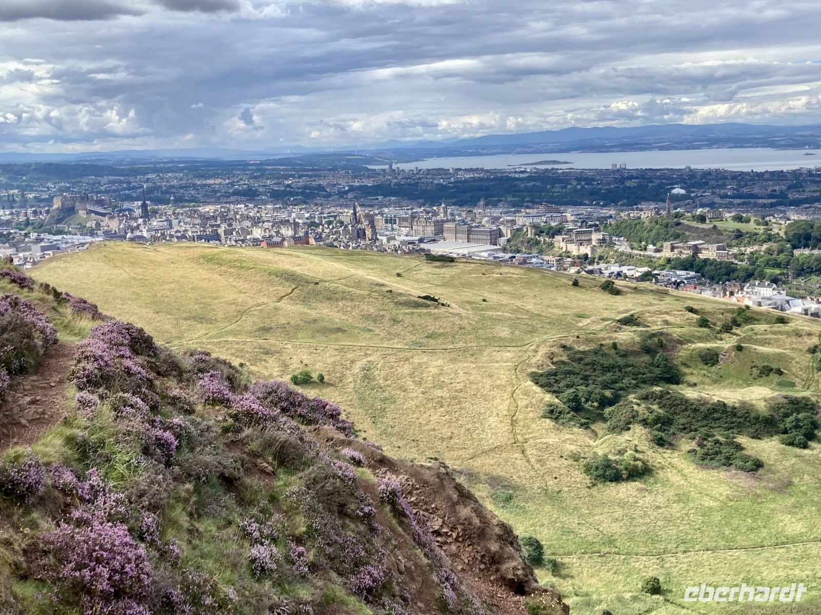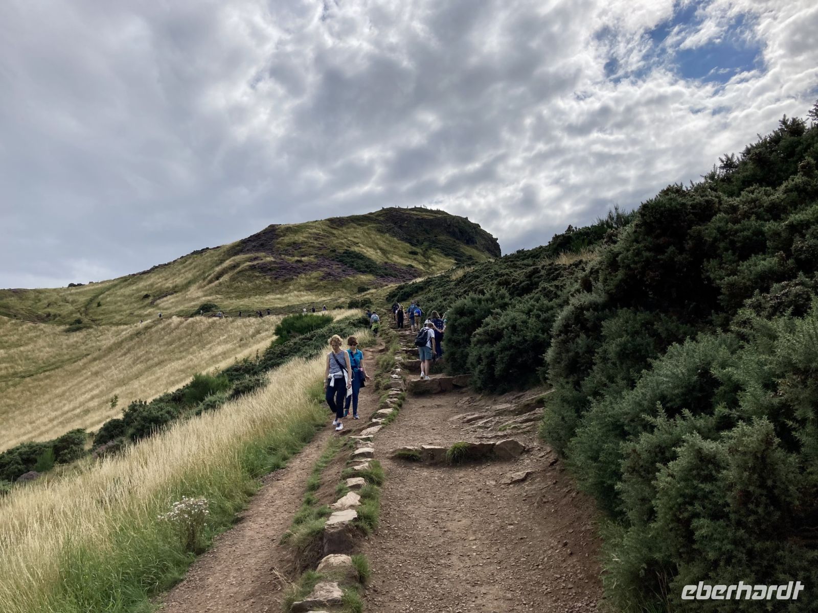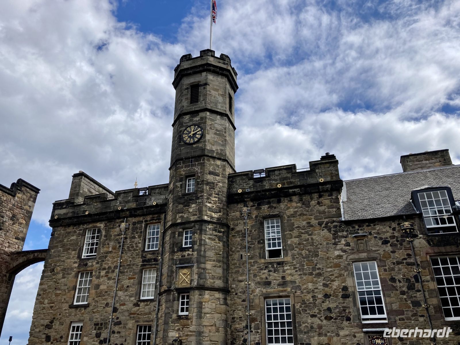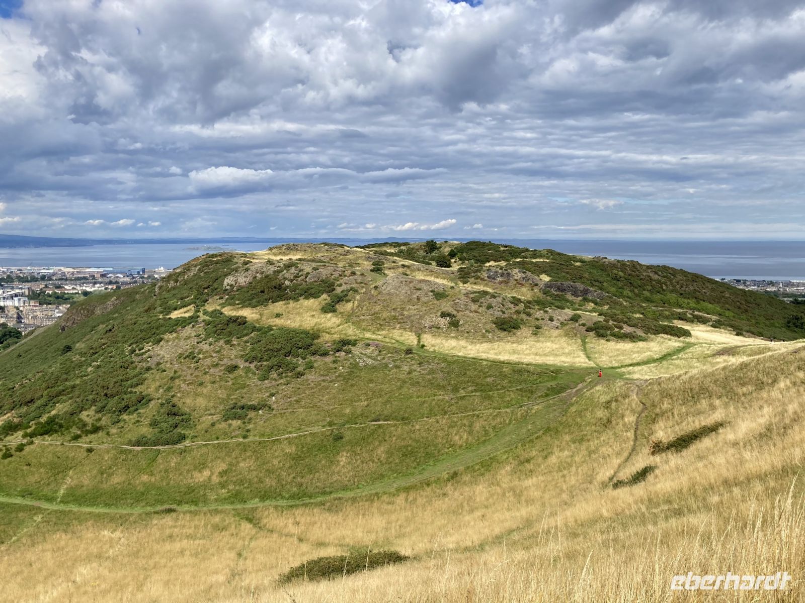 Mit unserem neuen Chauffeur Les und unserer Stadtführerin Meriel stürzen wir uns mutig ins Getümmel in der Innenstadt. Während wir uns langsam dem Castle auf seinem Hügel nähern — es ist schon von weitem sichtbar — wirken die Straßen um uns herum zunächst noch recht ruhig und verschlafen. Wir widmen uns zunächst der Ende des 18. Jahrhunderts errichteten Neustadt, betrachten vom Bus aus die georgianischen Wohn- und Geschäftshäuser aus Sandstein sowie die grünen Privatgärten dazwischen. Hier wohnten berühmte Persönlichkeiten wie David Hume und Robert Louis Stevenson; heute residiert am Charlotte Square der schottische First Minister. Schön ruhig ist es auch noch in den Princes Street Gardens unterhalb der Burg, in denen wir mit Meriel eine kleine Runde drehen und das Castle fotografieren. Von hier unten im Graben aus erscheint es oben auf dem Vulkanfelsen noch gewaltiger und bedrohlicher. Während der Rundfahrt durch die Altstadt sehen wir dann schon deutlich (!) mehr Menschen auf den Straßen, vor allem entlang der Royal Mile, und vor und im Castle herrscht ein ganz schönes Gewusel. Der August ist Festival-Zeit in Edinburgh: Fringe Festival, Edinburgh Festival und natürlich Military Tattoo. Meriel lenkt uns geschickt durch die Massen und erläutert uns die wichtigsten Gebäude und historischen Eckpunkte. Dann entlässt sie uns vor der großen Halle in die Freiheit bzw. Freizeit. Wir danken ihr herzlich für die informative und abwechslungsreiche Stadtführung, bevor wir uns verstreuen und auf eigene Faust die schottischen Kronjuwelen und/oder anderen Sehenswürdigkeiten im Castle besichtigen. Einen großen Teil meiner Gruppe sehe ich am Nachmittag dann tatsächlich zur Besteigung des Arthur‘s Seat wieder. Ich bewundere den Enthusiasmus dieser Gruppe! Na gut, dann wollen wir uns mal schön gemütlich den Hausberg Edinburghs hinaufquä- … äh -begeben. Auch hier sind noch einige Leute unterwegs, aber natürlich deutlich weniger als auf der Royal Mile, obwohl das Wetter nahezu ideal für den Aufstieg ist. Und natürlich werden wir oben mit einer herrlichen Aussicht über die ganze Stadt und Umgebung belohnt; deshalb haben wir ja die Anstrengung überhaupt auf uns genommen. Nach dem Aufstieg ist vor dem Abstieg, der zwar schneller geht, aber durchaus auch Vorsicht erfordert, zumal während der ersten Hälfte auch ein paar Regentropfen vom Himmel fallen. Da wir sehr gut in der Zeit liegen, können wir uns unten im Café am Holyrood Palace mit einem Kaffee, Tee oder einer heißen Schokolade für die erfolgreiche Bewältigung auch dieser Wanderung belohnen. Derweil trudelt vor dem Parlament der Rest der Gruppe ein. Zum Duschen, Umziehen und Abendessen fährt uns Les (fast) alle zurück zum Hotel in Leith. Erfrischt und gestärkt werden wir anschließend für das Abendprogramm mit Taxis wieder vor das Castle gefahren — alle meine Gäste haben (zum Glück) Tickets für das Royal Edinburgh Military Tattoo gebucht, diesmal unter dem Leitmotiv „Stories“. Dieses herrliche Spektakel sollte man sich wirklich nicht entgehen lassen! Die über 800 aus vielen Ländern angereisten Musiker, Sänger und Tänzer erschaffen gemeinsam eine abwechslungsreiche, wunderbare Show, die zum Song „The Story“ von Runrig in einem emotionalen und mitreißenden Finale mündet. Traditionell beendet der einsame Dudelsackspieler auf der Burgmauer das Event, bevor alle Mitwirkenden aus der Arena ziehen. Ganz begeistert und — im positiven Sinne – emotional aufgewühlt geht es zurück ims Hotel, doch es soll noch eine Weile dauern, bevor wir innerlich zur Ruhe kommen. Auch mir geht die Musik eine ganze Weile nicht aus dem Kopf und ich schaue mir wieder und wieder meine Fotos an.