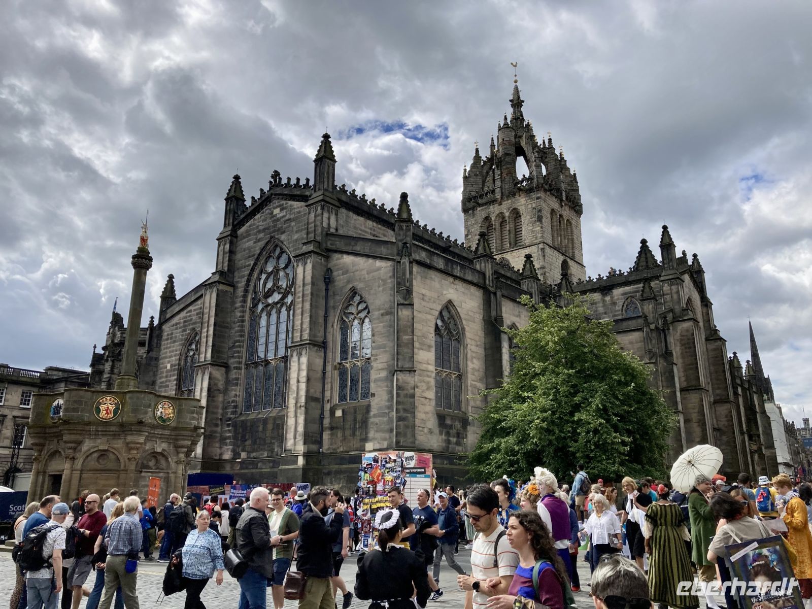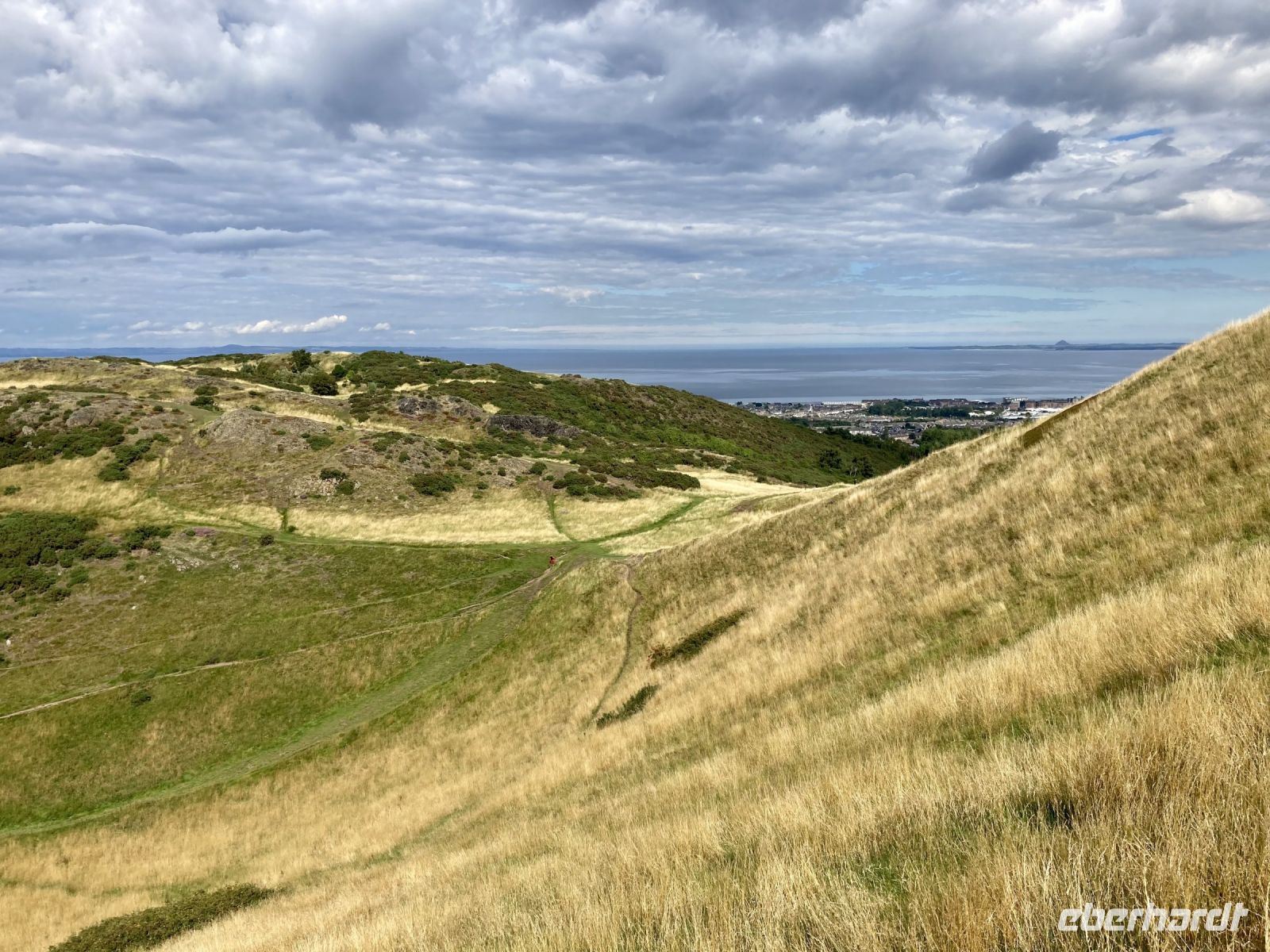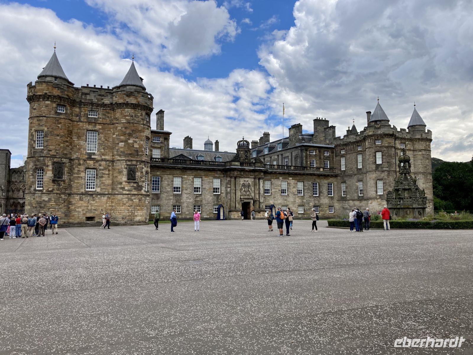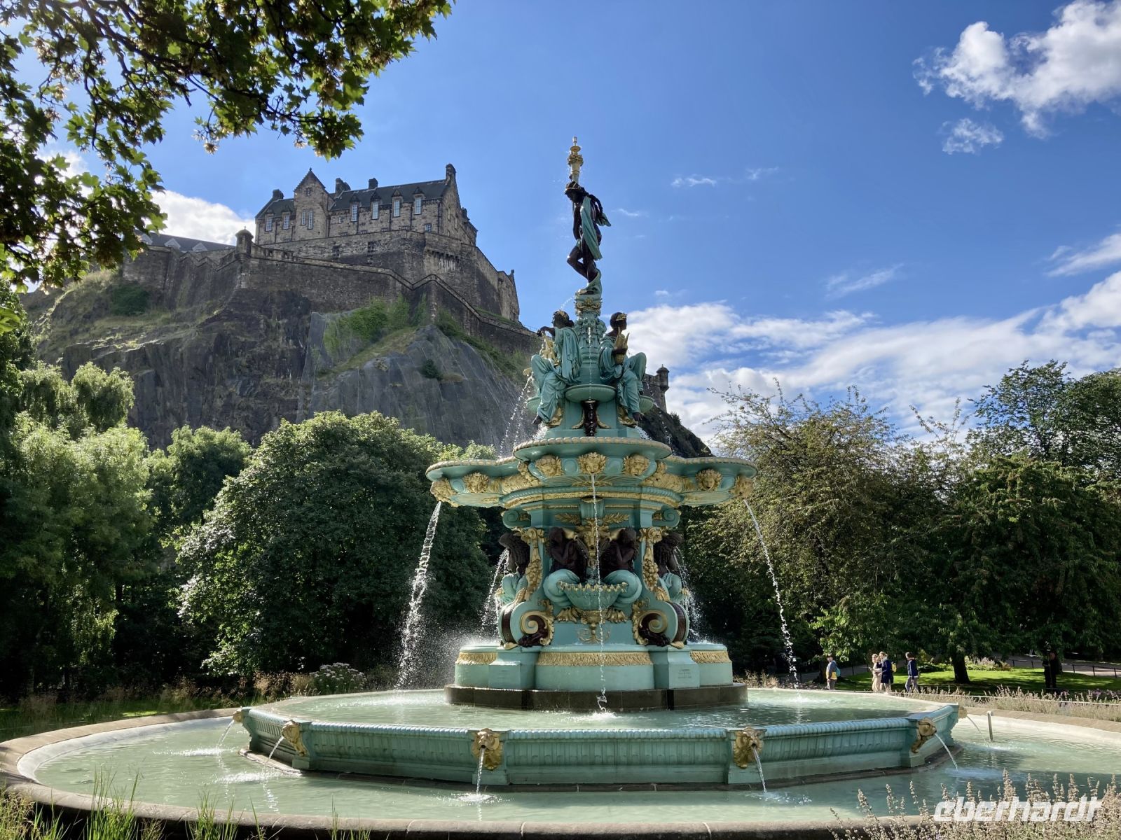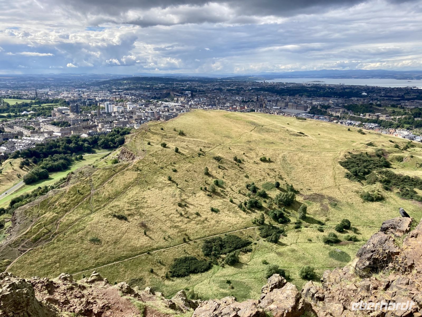 Mit unserem neuen Chauffeur Les und unserer Stadtführerin Meriel stürzen wir uns mutig ins Getümmel in der Innenstadt. Während wir uns langsam dem Castle auf seinem Hügel nähern — es ist schon von weitem sichtbar — wirken die Straßen um uns herum zunächst noch recht ruhig und verschlafen. Wir widmen uns zunächst der Ende des 18. Jahrhunderts errichteten Neustadt, betrachten vom Bus aus die georgianischen Wohn- und Geschäftshäuser aus Sandstein sowie die grünen Privatgärten dazwischen. Hier wohnten berühmte Persönlichkeiten wie David Hume und Robert Louis Stevenson; heute residiert am Charlotte Square der schottische First Minister. Schön ruhig ist es auch noch in den Princes Street Gardens unterhalb der Burg, in denen wir mit Meriel eine kleine Runde drehen und das Castle fotografieren. Von hier unten im Graben aus erscheint es oben auf dem Vulkanfelsen noch gewaltiger und bedrohlicher. Während der Rundfahrt durch die Altstadt sehen wir dann schon deutlich (!) mehr Menschen auf den Straßen, vor allem entlang der Royal Mile, und vor und im Castle herrscht ein ganz schönes Gewusel. Der August ist Festival-Zeit in Edinburgh: Fringe Festival, Edinburgh Festival und natürlich Military Tattoo. Meriel lenkt uns geschickt durch die Massen und erläutert uns die wichtigsten Gebäude und historischen Eckpunkte. Dann entlässt sie uns vor der großen Halle in die Freiheit bzw. Freizeit. Wir danken ihr herzlich für die informative und abwechslungsreiche Stadtführung, bevor wir uns verstreuen und auf eigene Faust die schottischen Kronjuwelen und/oder anderen Sehenswürdigkeiten im Castle besichtigen. Einen großen Teil meiner Gruppe sehe ich am Nachmittag dann tatsächlich zur Besteigung des Arthur‘s Seat wieder. Ich bewundere den Enthusiasmus dieser Gruppe! Na gut, dann wollen wir uns mal schön gemütlich den Hausberg Edinburghs hinaufquä- … äh -begeben. Auch hier sind noch einige Leute unterwegs, aber natürlich deutlich weniger als auf der Royal Mile, obwohl das Wetter nahezu ideal für den Aufstieg ist. Und natürlich werden wir oben mit einer herrlichen Aussicht über die ganze Stadt und Umgebung belohnt; deshalb haben wir ja die Anstrengung überhaupt auf uns genommen. Nach dem Aufstieg ist vor dem Abstieg, der zwar schneller geht, aber durchaus auch Vorsicht erfordert, zumal während der ersten Hälfte auch ein paar Regentropfen vom Himmel fallen. Da wir sehr gut in der Zeit liegen, können wir uns unten im Café am Holyrood Palace mit einem Kaffee, Tee oder einer heißen Schokolade für die erfolgreiche Bewältigung auch dieser Wanderung belohnen. Derweil trudelt vor dem Parlament der Rest der Gruppe ein. Zum Duschen, Umziehen und Abendessen fährt uns Les (fast) alle zurück zum Hotel in Leith. Erfrischt und gestärkt werden wir anschließend für das Abendprogramm mit Taxis wieder vor das Castle gefahren — alle meine Gäste haben (zum Glück) Tickets für das Royal Edinburgh Military Tattoo gebucht, diesmal unter dem Leitmotiv „Stories“. Dieses herrliche Spektakel sollte man sich wirklich nicht entgehen lassen! Die über 800 aus vielen Ländern angereisten Musiker, Sänger und Tänzer erschaffen gemeinsam eine abwechslungsreiche, wunderbare Show, die zum Song „The Story“ von Runrig in einem emotionalen und mitreißenden Finale mündet. Traditionell beendet der einsame Dudelsackspieler auf der Burgmauer das Event, bevor alle Mitwirkenden aus der Arena ziehen. Ganz begeistert und — im positiven Sinne – emotional aufgewühlt geht es zurück ims Hotel, doch es soll noch eine Weile dauern, bevor wir innerlich zur Ruhe kommen. Auch mir geht die Musik eine ganze Weile nicht aus dem Kopf und ich schaue mir wieder und wieder meine Fotos an.