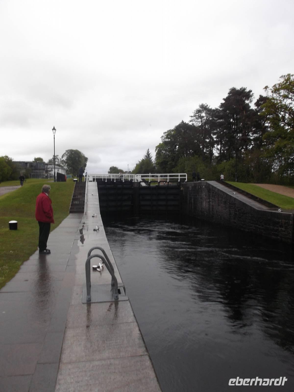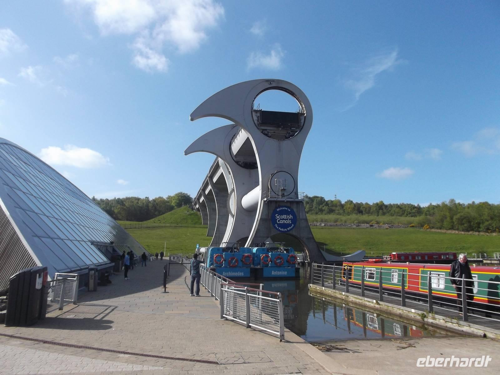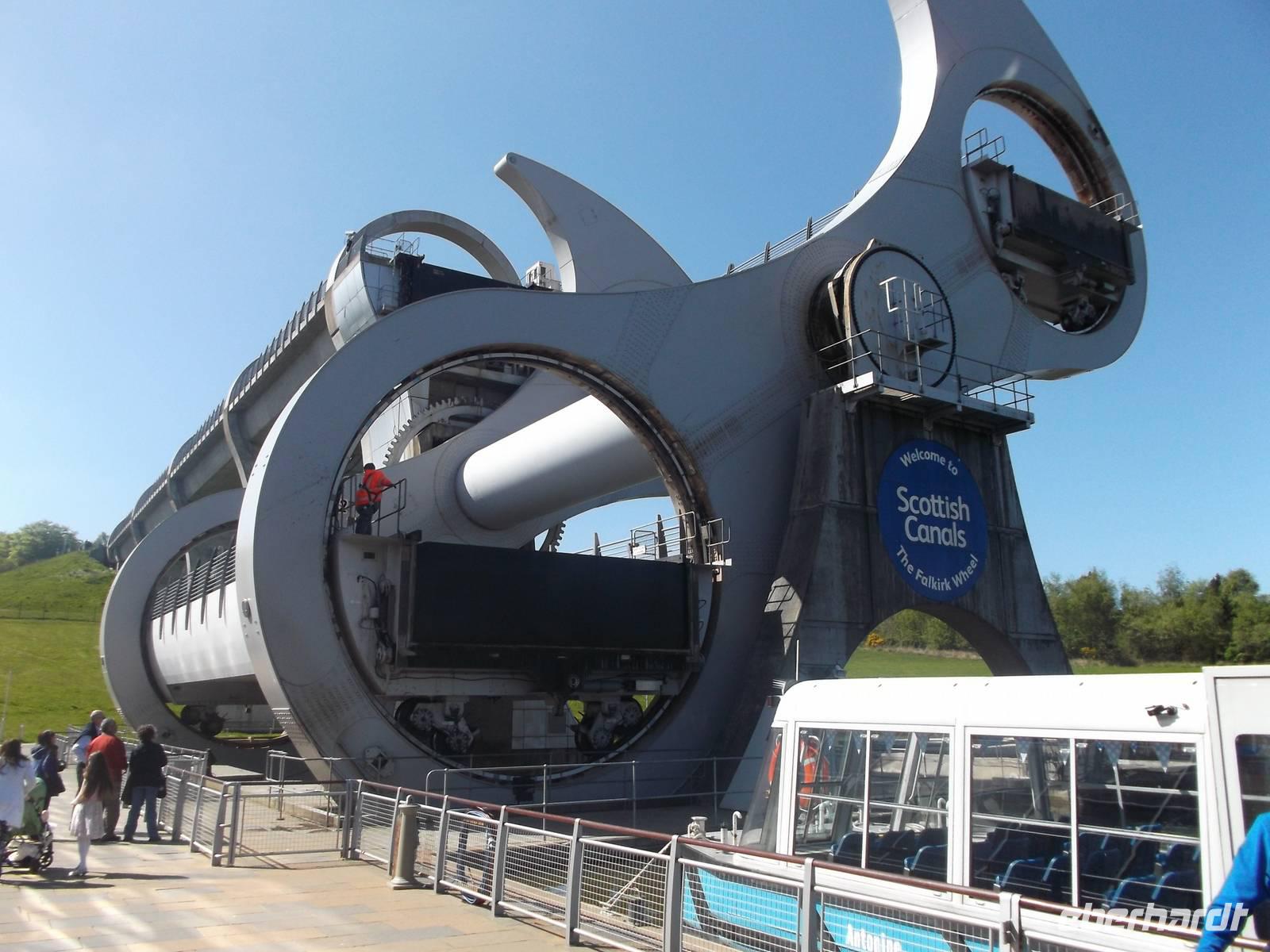 Unser erstes Ziel heute war das Falkirk Wheel, das 2002 eröffnete modernste Schiffshebewerk Schottlands und das einzige in Form eines Riesenrades Wir erreichten dieses Wunderwerk der Technik recht früh - das Besucherzentrum war noch gar nicht offen, so dass wir in Ruhe erst einmal die riesigen, an einer Radnabe angebrachten Gondeln von außen fotografieren konnten, in deren Wassertrögen schmale Schiffe gehoben und gesenkt werden. Zwei Kanalsysteme, heute ausschließlich von Freizeitkapitänen genutzt, verbindet das riesige Rad mit seinen 35 m Durchmesser und überwindet dabei einen Höhenunterschied von 24 m. Pünktlich zur Eröffnung des Besucherzentrums konnten wir eines der „Narrowboats" besteigen, fuhren in den unteren Hebewerkstrog und wurden innerhalb von vier Minuten mit dem gesamten Boot zum oberen Kanal emporgehoben. Ein Angestellter gab technische Erläuterungen, während unser Boot den nunmehr oben befindlichen Trog verließ und den oberen Kanal entlang durch einen Schiffstunnel zu einer Wendeschleife fuhr. Von hier kehrten wir zurück, wurden im nächsten Gang gesenkt und hatten nach ein paar Minuten wieder den Ausgangspunkt erreicht - ein insgesamt sehr beeindruckendes Erlebnis bei der Vorführung einer technischen Sensation. .