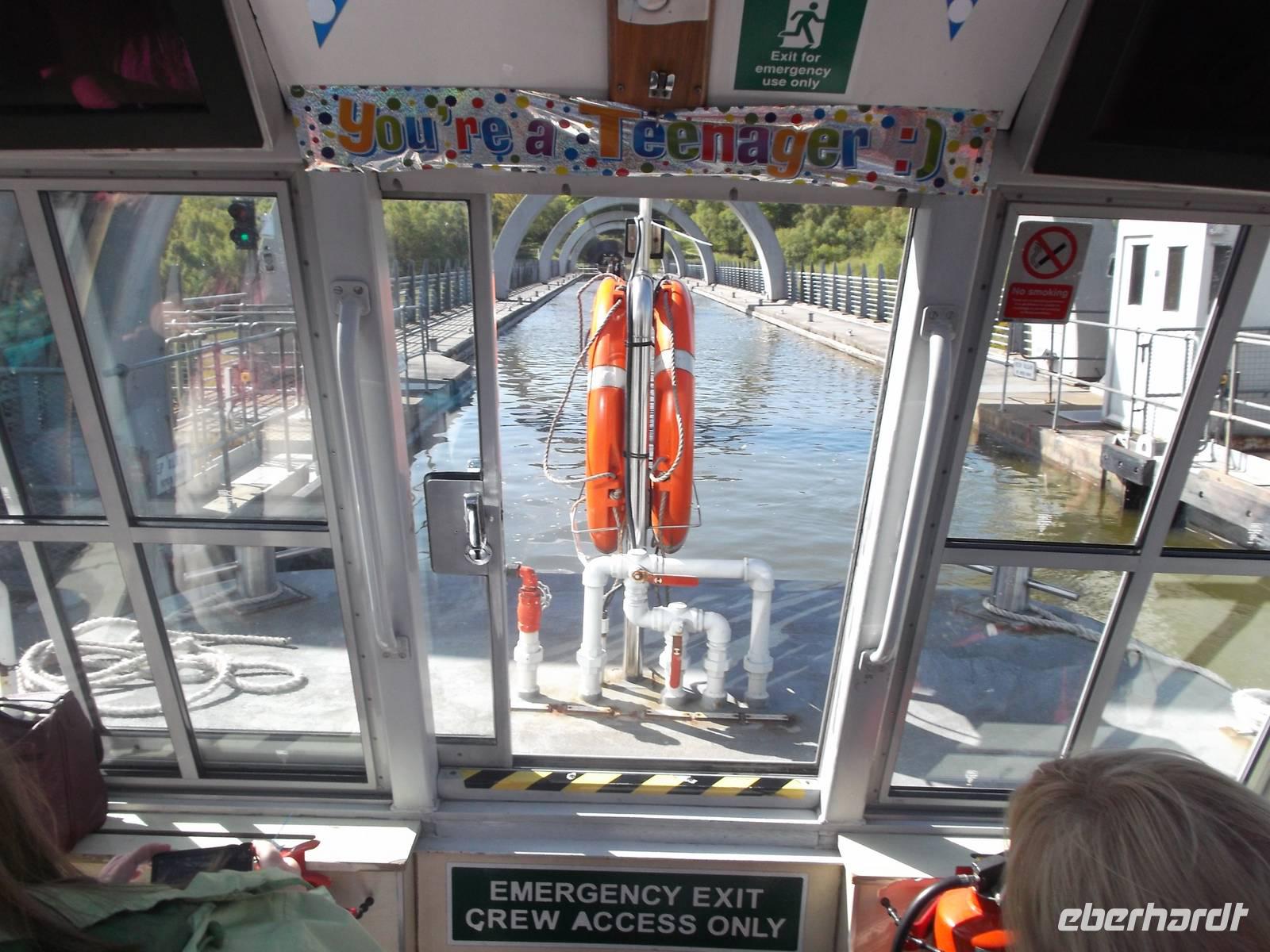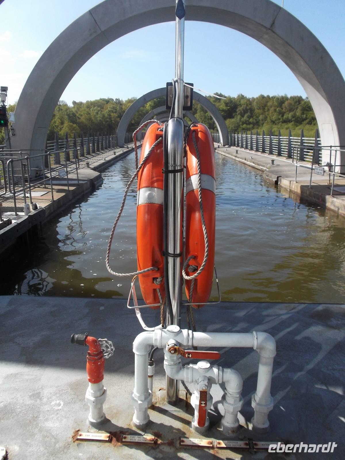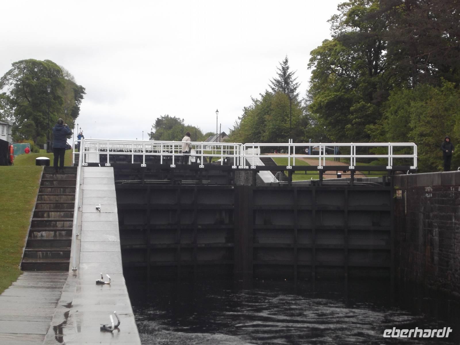 Unser erstes Ziel heute war das Falkirk Wheel, das 2002 eröffnete modernste Schiffshebewerk Schottlands und das einzige in Form eines Riesenrades Wir erreichten dieses Wunderwerk der Technik recht früh - das Besucherzentrum war noch gar nicht offen, so dass wir in Ruhe erst einmal die riesigen, an einer Radnabe angebrachten Gondeln von außen fotografieren konnten, in deren Wassertrögen schmale Schiffe gehoben und gesenkt werden. Zwei Kanalsysteme, heute ausschließlich von Freizeitkapitänen genutzt, verbindet das riesige Rad mit seinen 35 m Durchmesser und überwindet dabei einen Höhenunterschied von 24 m. Pünktlich zur Eröffnung des Besucherzentrums konnten wir eines der „Narrowboats" besteigen, fuhren in den unteren Hebewerkstrog und wurden innerhalb von vier Minuten mit dem gesamten Boot zum oberen Kanal emporgehoben. Ein Angestellter gab technische Erläuterungen, während unser Boot den nunmehr oben befindlichen Trog verließ und den oberen Kanal entlang durch einen Schiffstunnel zu einer Wendeschleife fuhr. Von hier kehrten wir zurück, wurden im nächsten Gang gesenkt und hatten nach ein paar Minuten wieder den Ausgangspunkt erreicht - ein insgesamt sehr beeindruckendes Erlebnis bei der Vorführung einer technischen Sensation. .