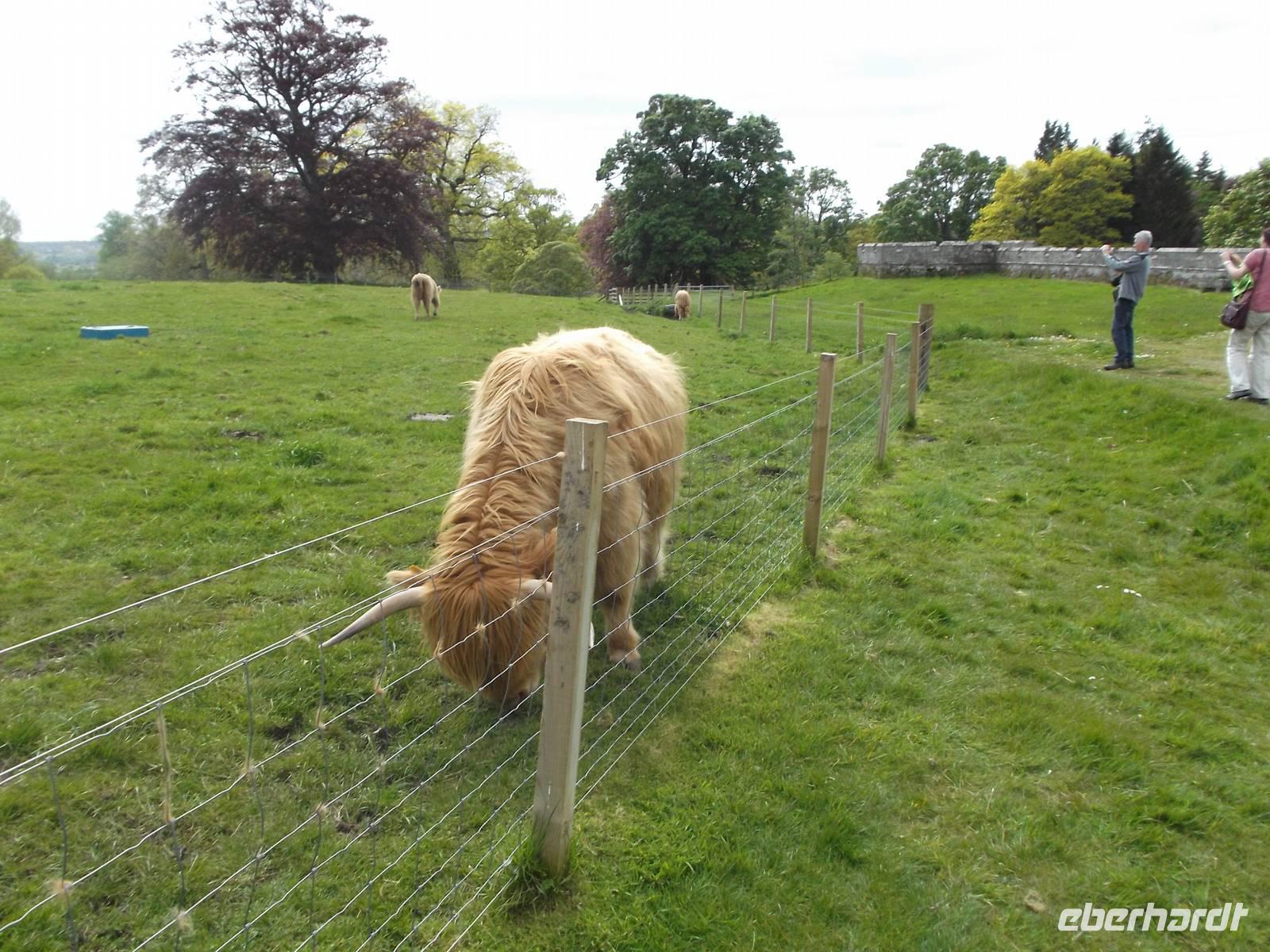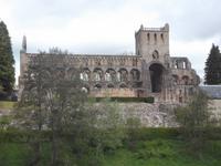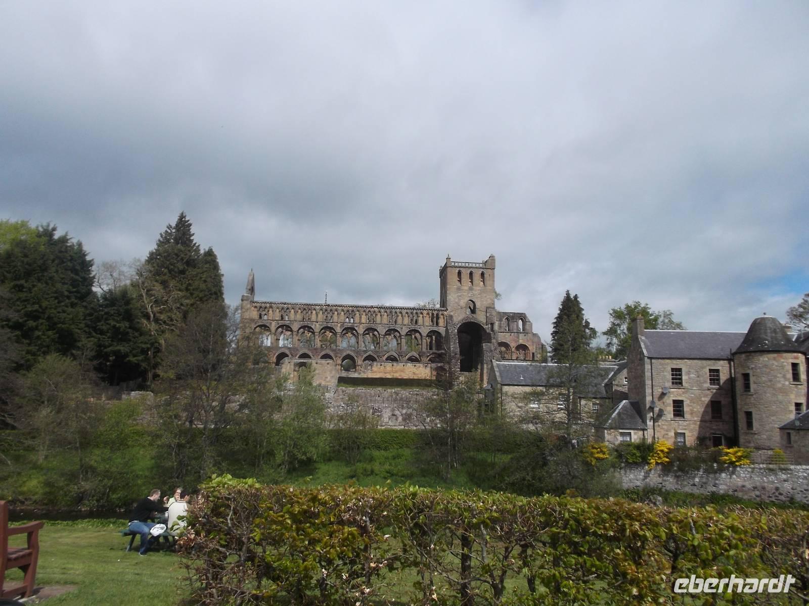 Wie immer dauerte die britische Grenzkontrolle vor allem für den Bus einige Zeit und erst gegen 10.20 Uhr konnten wir den Fährhafen Newcastle verlassen. Unser Weg führte durch die englisch-schottischen „Borders" eine interessante hügelige Landschaft, deren kulturelle Höhepunkte auf schottischer Seite unter anderem mehrere alte Abteien aus dem 12. Jahrhundert bilden. Den ersten Stopp legten wir natürlich in Carter Bar ein, wo der große Grenzstein zwischen England und Schottland steht und wo zumeist - auch dieses Mal wieder - ein uniformierter Dudelsackspieler die Gäste auf keltischem Gebiet begrüßt. Der deutsche Dichter Theodor Fontane, der als Berichterstatter in Schottland geweilt und ein Buch über den Norden der britischen Insel verfasst hatte, war von dieser Gegend und ihren Abteien besonders angetan. Unser erster richtiger Stopp in Schottland zeigte uns Jedburgh, deren Wahrzeichen, Blickfang und wichtigste Sehenswürdigkeit die gewaltige Abteiruine ist, die sich wuchtig und stolz und vornehm seit Jahrhunderten als über dem Fluß erhebt. Wir hatten Gelegenheit für Fotos und konnten sogar noch einen kleinen Stadtrundgang und etwas Freizeit in der Jedburgher Altstadt einbauen, die u.a. mit einem altem Gefängnis, und einem historischem Marktkreuz aufwartet.