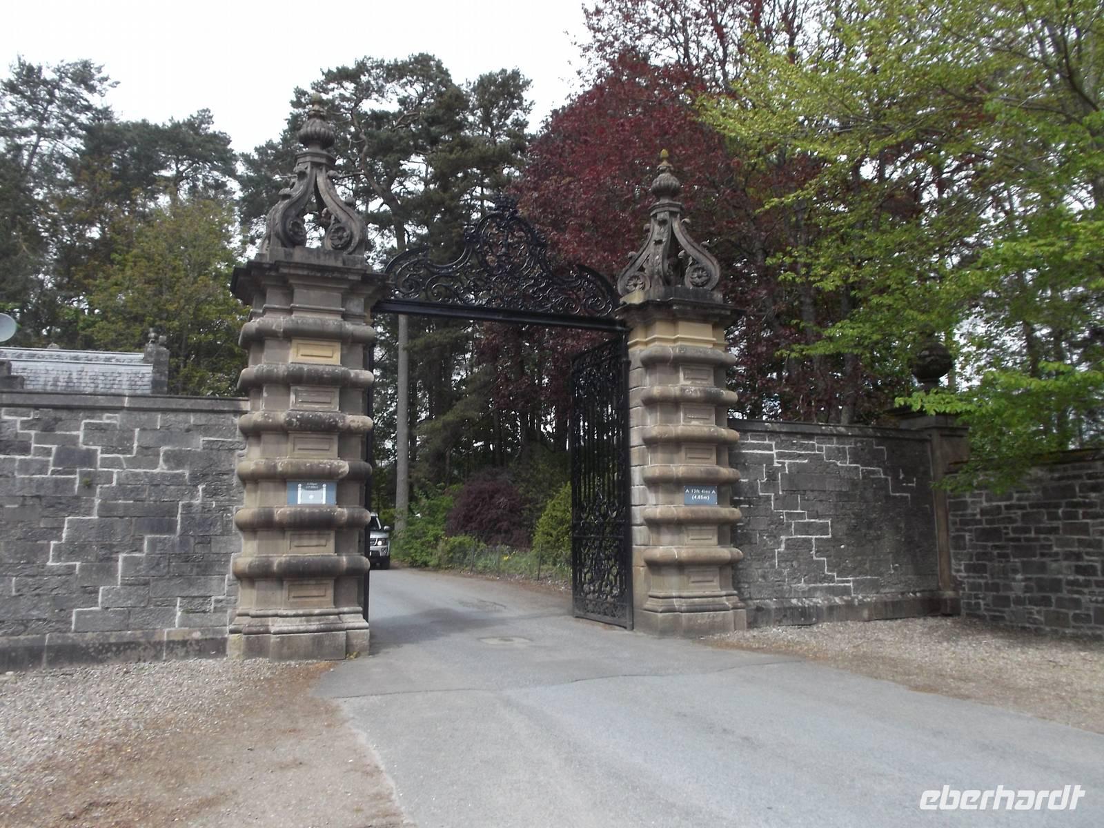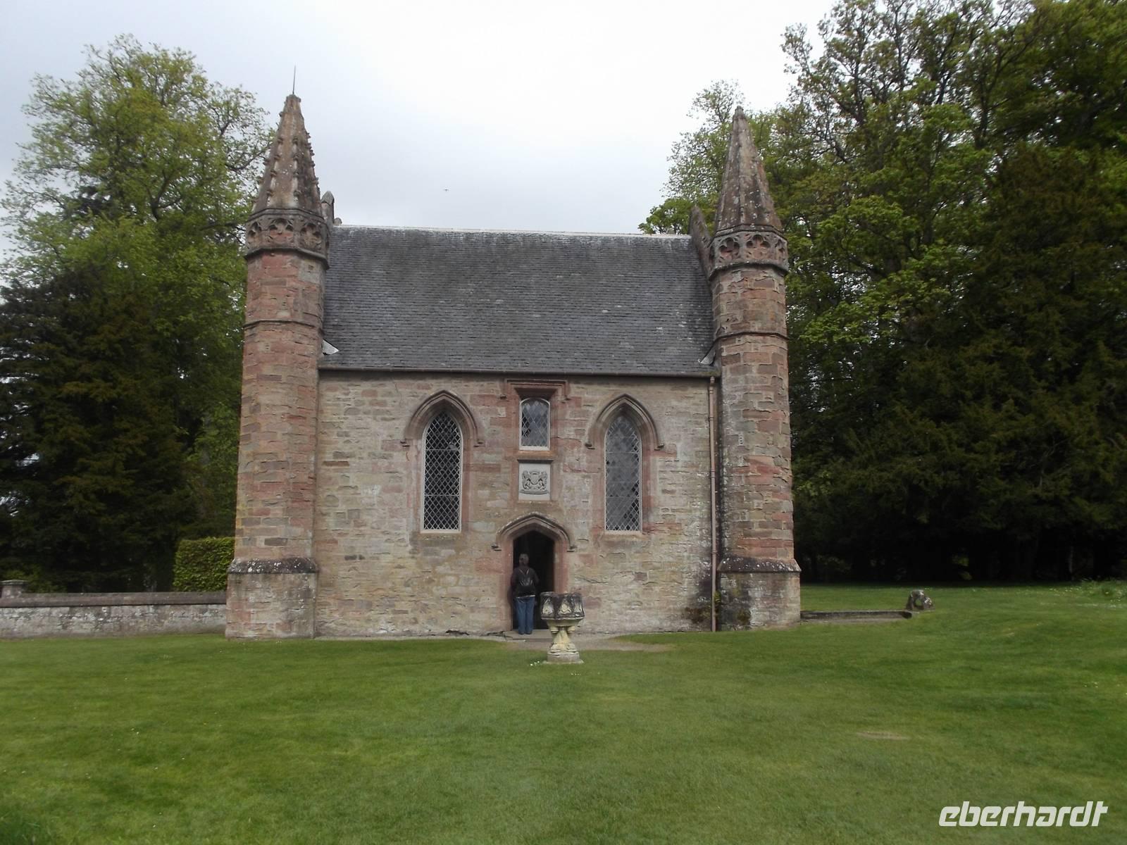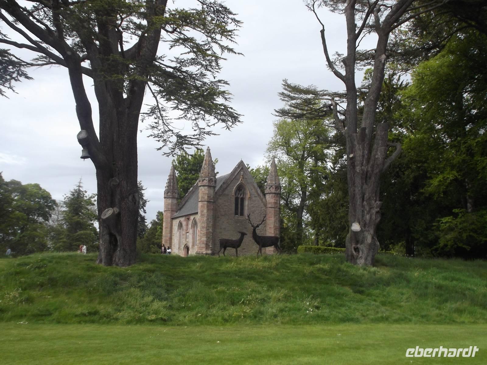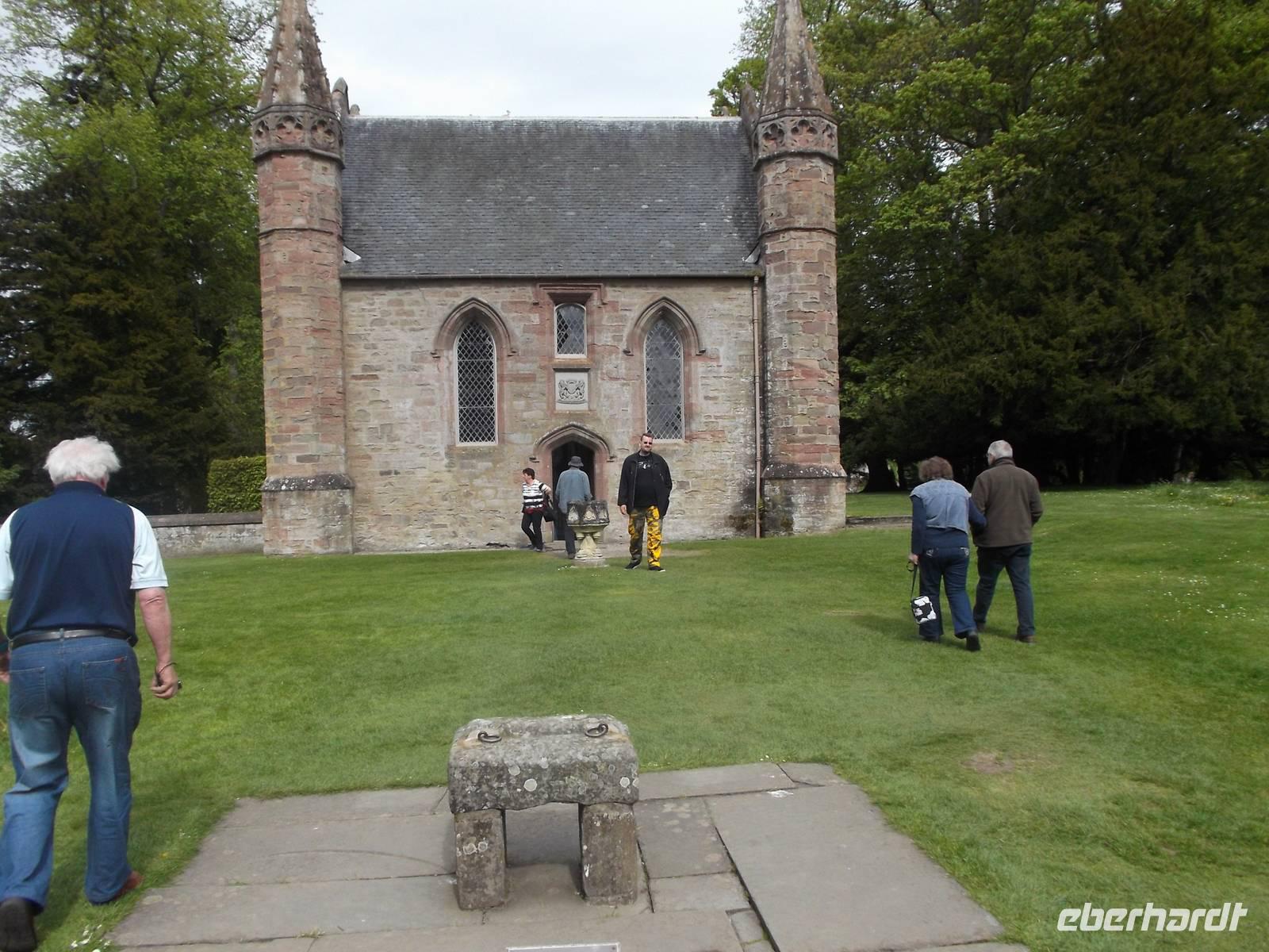 Später ging es dann bei einem ungeplanten Abstecher ganz im Sinne des „Richtig Reisen!" Mottos von Eberhardt TRAVEL zum Besuch bei einer Legende: Scone Palace ist der Ort, auf dessen Gelände der sagenhafte Krönungsstein der schottischen Könige aufbewahrt wurde und wird heute beherrscht von einem neogotischen Palast, erbaut auf den Ruinen einer alten Abtei zu Beginn des 19. Jahrhunderts unter Leitung des Architekten William Atkinson. Zwar hatten wir nicht genug Zeit für eine ausführliches Besichtigung dieses Palastes, aber für einen ausgedehnten Fotostopp und den Besuch des berühmten schottischen Krönungssteins reichte es: von piktischen und schottischen Clans wurde das schottische Königreich durch Kenneth I. McAlpin 846 n.Chr. gegründet und der legendäre „Stein des Schicksals" hierher gebracht. Auf dem Gelände von Scone entstand die neue (Haupt)stadt Celtic Abertha und hier wurden die Könige gekrönt, indem der vom Schicksal auserwählte wahre König von dem Stein bestimmt wurde, der einen Ton erklingen ließ, wenn sich der rechtmäßige Kandidat auf ihn setzte. Diese Zeremonie fand bis 1296 hier statt, als Eduard I. von England den Stein stehlen und zum Zeichen seines Anspruchs auf Schottland nach London bringen ließ. Erst im 20 Jh. gab man den Stein nach Schottland zurück. Immer weiter wurden jedoch Schottlands Könige hier am Ort gekrönt, indem man an dieser Stelle einen Krönungsstuhl mit Stein aufbaute - 1745 wurde der Anführer des letzten Schotten-Aufstandes Bonnie Prince Charlie aus der Stuart-Dynastie hier als Letzter zum König gekrönt. Dieser Stuhl steht auf dem Moot Hill, einer weiteren Legende, dominiert von einer Kapelle. Um nach schottischem Recht dem König hier Ehrerbietung zu erweisen und dennoch auf ihrem eigenen Grund und Boden Treue schwören zu können, mussten die Clanchefs für den Treue-Eid hier in der Hauptstadt Heimaterde in ihren Stiefeln mitbringen. Danach wurde die Erde ausgeschüttet und so entstand der Moot Hill...