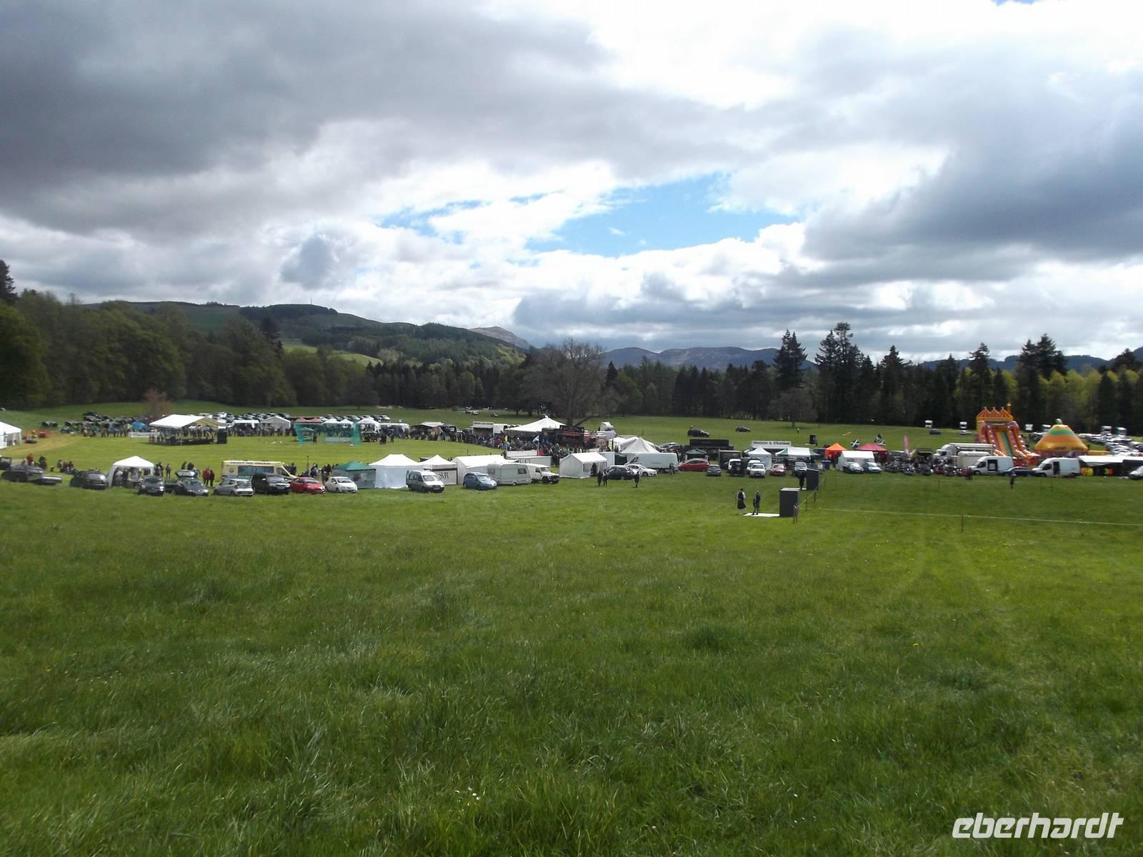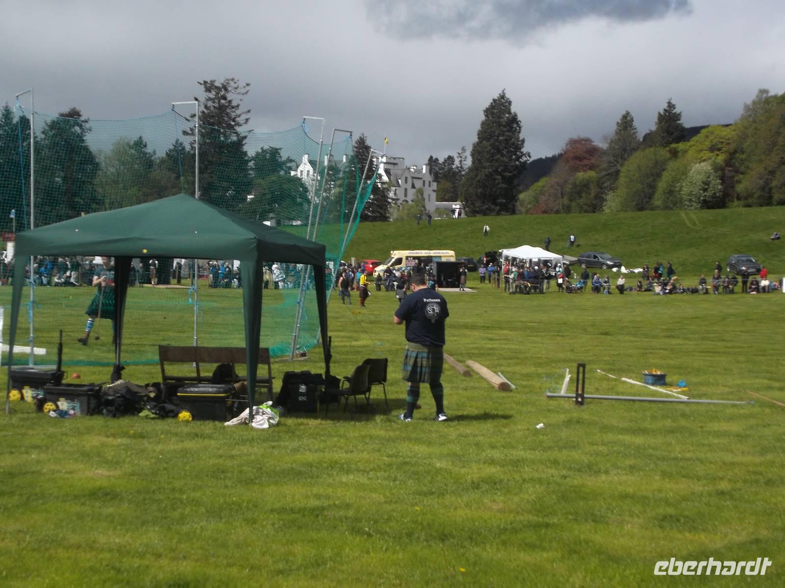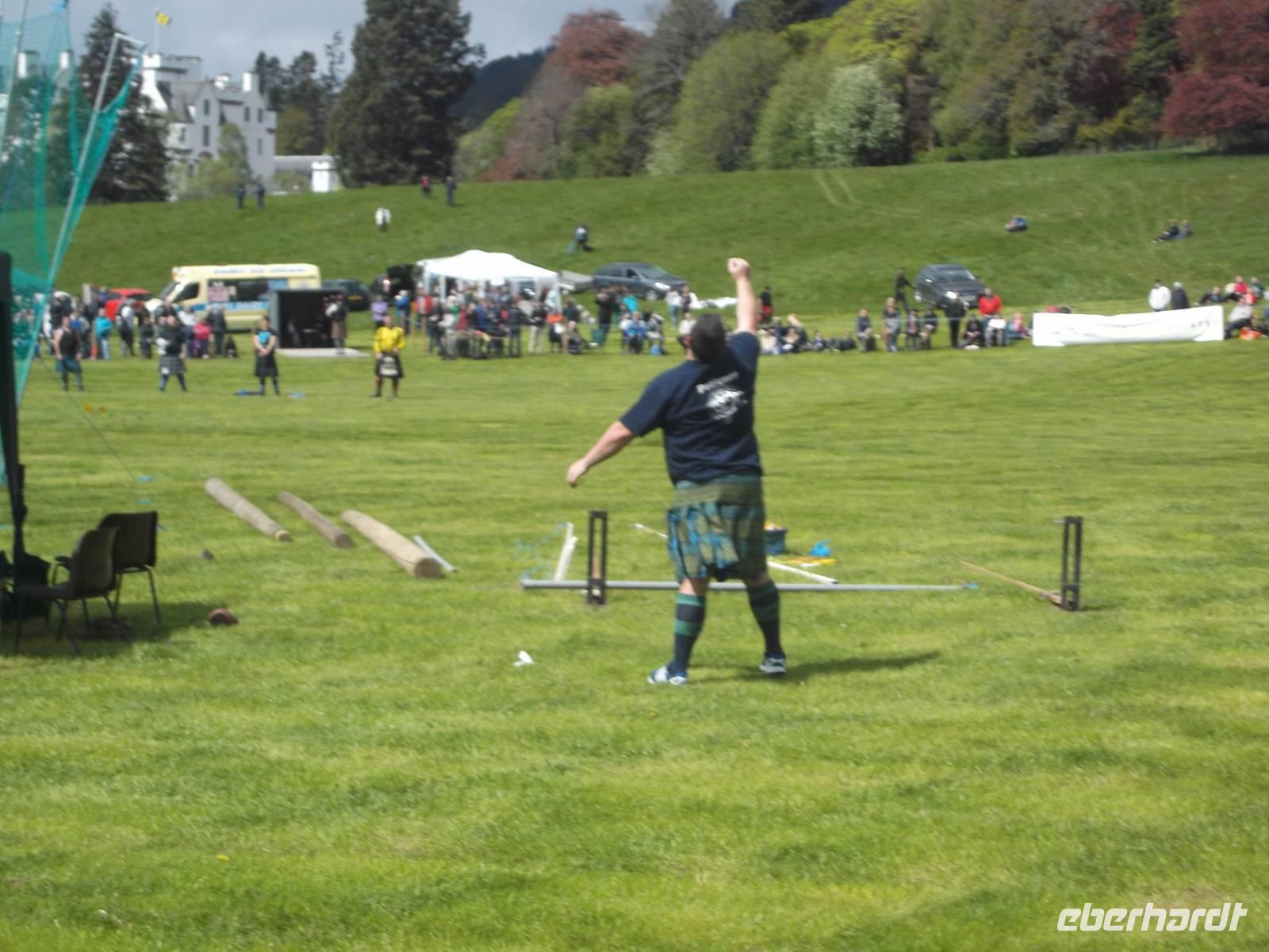 Nach Erreichen des Busparkplatzes neben Blair Castle war rasch der Eintritt entrichtet und wir konnten das Flair der Hochlandspiele genießen. Die von Blair Atholl finden sehr früh - am letzten Maiwochenende - statt, locken aber schon erstaunlich viele Menschen an. Dennoch war auch das Angebot an Souvenirständen, Kaffee-Bars und Ständen mit traditionellem schottischem Essen recht gut, so dass kaum Andrang entstand. Wie meist bei den Higland-Games war das Hauptgeschehen im Zentrum des Festplatzes konzentriert und übersichtlich angeordnet. So konnten wir umherbummeln und uns für Zusehen und Fotografieren an den unterschiedlichsten Wettkampforten entscheiden: als wir ankamen waren gerade die Qualifikationen für Schwerathleten beim Wurf des „Schottischen Hammers" mit langem Stiel im Gange und später fand auch der vielleicht spektakulärste Wettkampf statt: das Baumstammwerfen. Der Athlet muss dabei einen schweren, telefonmastgroßen Stamm nach oben werfen, damit er über seine Längsachse kippt und möglichst gerade landet. Bei vielen der urwüchsigen Wettbewerbe war es ganz erstaunlich, wie die Schwergewichtler im Schottenrock sie meisterten.