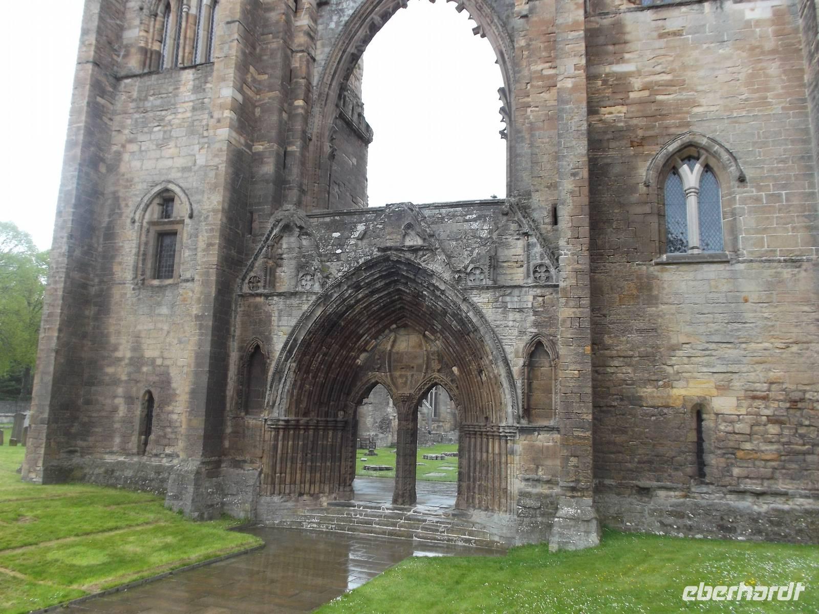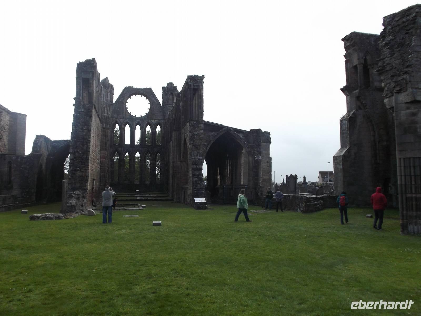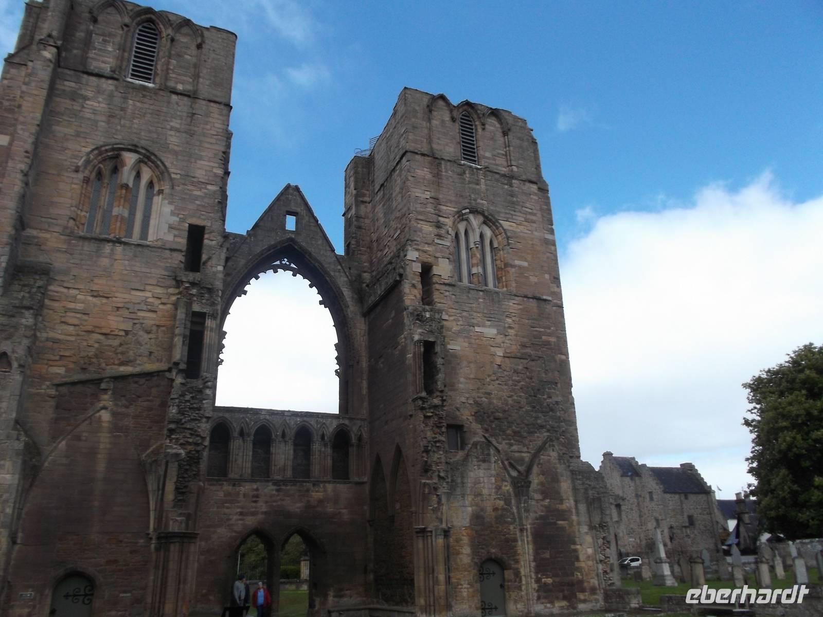 Unser erstes heutiges Ziel war die Stadt Elgin, einst bedeutender Bischofssitz der historischen Landschaft Moray und heute noch deren größte Stadt. Besonders bedeutsam ist die Ruine der hier seit 1224 errichteten Kathedrale. Zu ihrer Zeit war sie der größte Kirchenbau Schottlands und wurde „die Leuchte des Nordens" genannt. Nach einer ersten Zerstörung Ende des 14. Jh. wurde die Kirche endgültig in den Wirren der schottischen Reformation zur Ruine. Dennoch ist viel von dem grandiosen Bauwerk erhalten: wuchtig steht noch die Doppelturmfront und bedeutende Reste des Chorhauses, auch Teile der Seitenfronten sind erhalten. Das immer noch imponierende Westportal und reichverzierte Säulen und Fassadenteile zeigen die Formen der Früh- und Hochgotik, die man hierzulande „Early English" und „Decorated" nennt. Für die Geschichte der Region und auch für die ganz Schottlands war das Gotteshaus von überragender Bedeutung. Noch heute ist die überlebensgroße Bischofsstatue, die stark an eine der uralten in Schottland gefundenen Schachfiguren erinnert und die vermutlich einst unter dem Vierungsturm stand, eine der Hauptattraktionen der häufig besuchten Ruine.