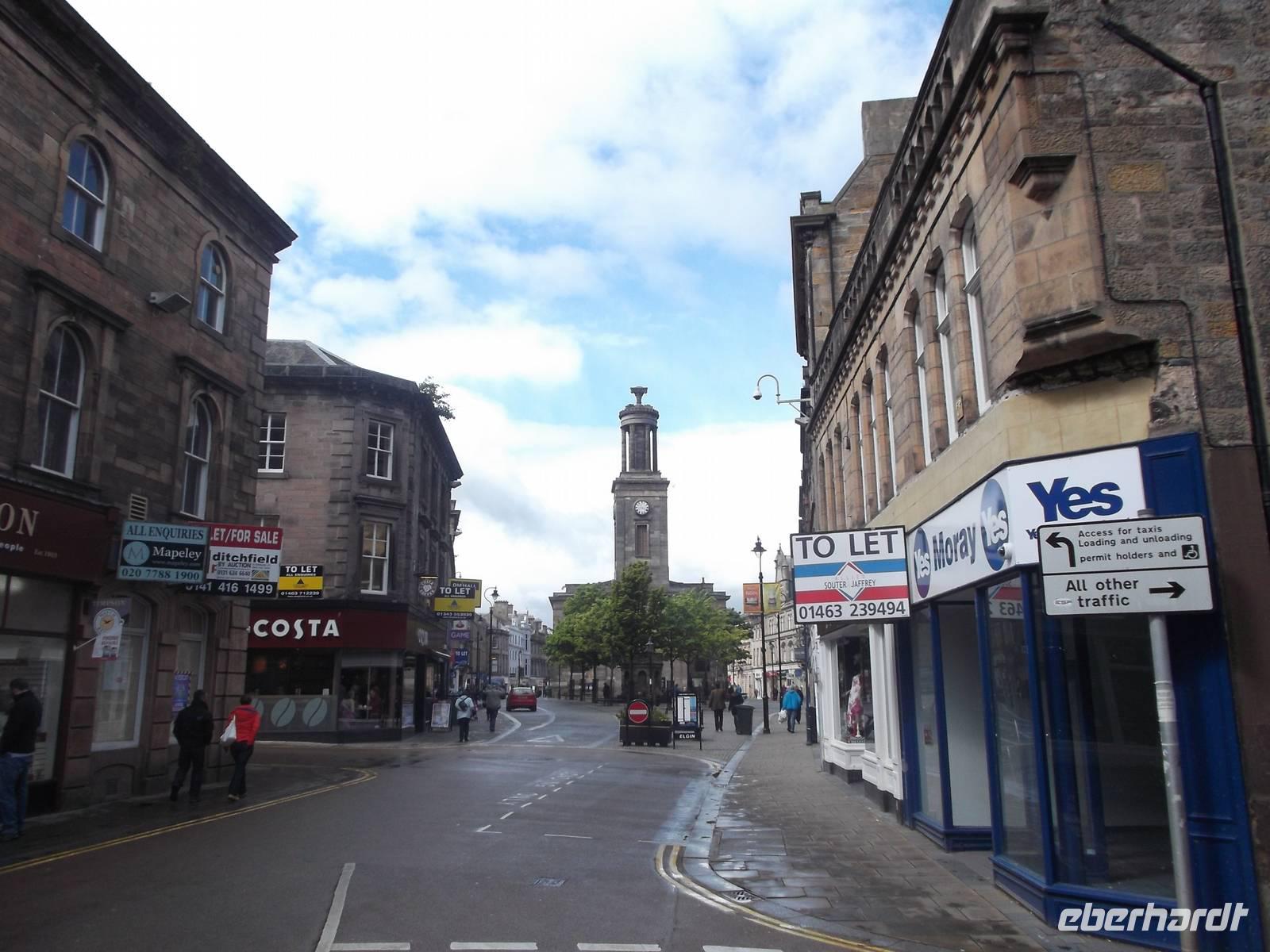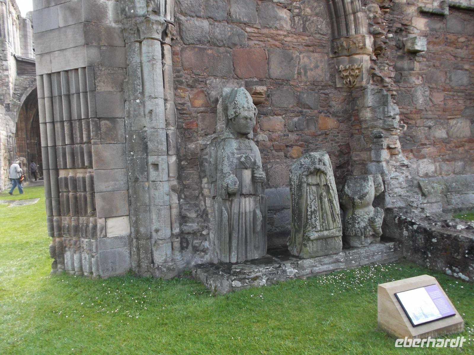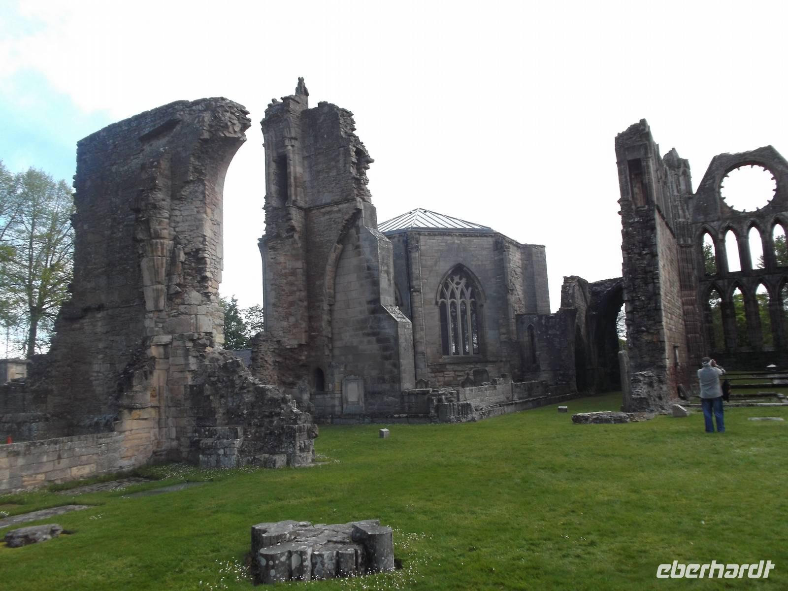 Unser erstes heutiges Ziel war die Stadt Elgin, einst bedeutender Bischofssitz der historischen Landschaft Moray und heute noch deren größte Stadt. Besonders bedeutsam ist die Ruine der hier seit 1224 errichteten Kathedrale. Zu ihrer Zeit war sie der größte Kirchenbau Schottlands und wurde „die Leuchte des Nordens" genannt. Nach einer ersten Zerstörung Ende des 14. Jh. wurde die Kirche endgültig in den Wirren der schottischen Reformation zur Ruine. Dennoch ist viel von dem grandiosen Bauwerk erhalten: wuchtig steht noch die Doppelturmfront und bedeutende Reste des Chorhauses, auch Teile der Seitenfronten sind erhalten. Das immer noch imponierende Westportal und reichverzierte Säulen und Fassadenteile zeigen die Formen der Früh- und Hochgotik, die man hierzulande „Early English" und „Decorated" nennt. Für die Geschichte der Region und auch für die ganz Schottlands war das Gotteshaus von überragender Bedeutung. Noch heute ist die überlebensgroße Bischofsstatue, die stark an eine der uralten in Schottland gefundenen Schachfiguren erinnert und die vermutlich einst unter dem Vierungsturm stand, eine der Hauptattraktionen der häufig besuchten Ruine.