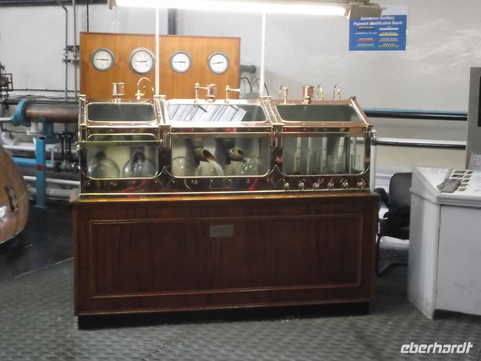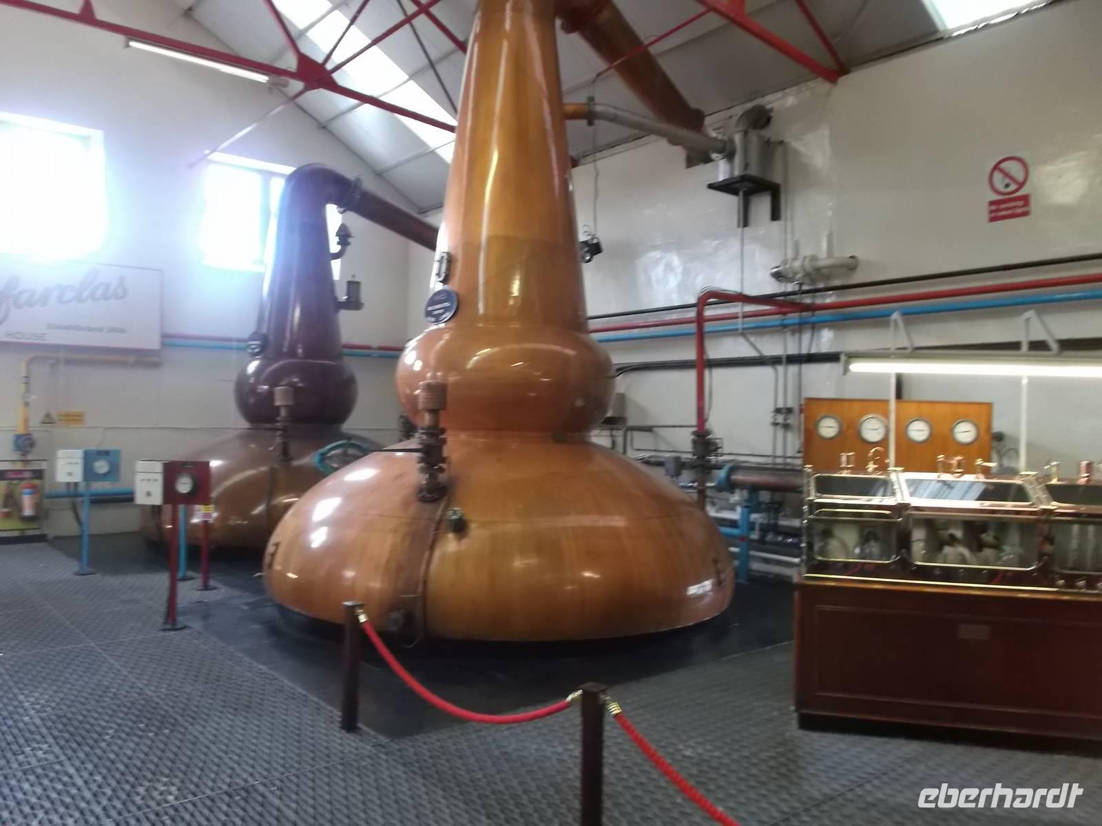 Nach dem Besuch der Glenlivet-Destillery folgte gleich die nächste: Glenfarclas ist fast die einzige der schottischen Brennereien, die noch nicht zu einem multinationalen Getränkekonzern gehört. Seit 1865 ist sie im Besitz der Familie Grant. Die Besonderheiten dieser Destille sind, dass die Brennblasen nicht wie in den anderen Destillen mit Dampf, sondern direkt mit Gas befeuert werden, um die Temperatur exakter regulieren zu können und dass die Lagerung fast ausschließlich in ehemaligen Sherryfässern der Marke „Oloroso" erfolgt. In Glenfarclas werden mehr „Jahrgänge" als in anderen Destillen produziert - von 10 bis zu 40 Jahre gelagertem Whisky reicht die Angebotspalette.
