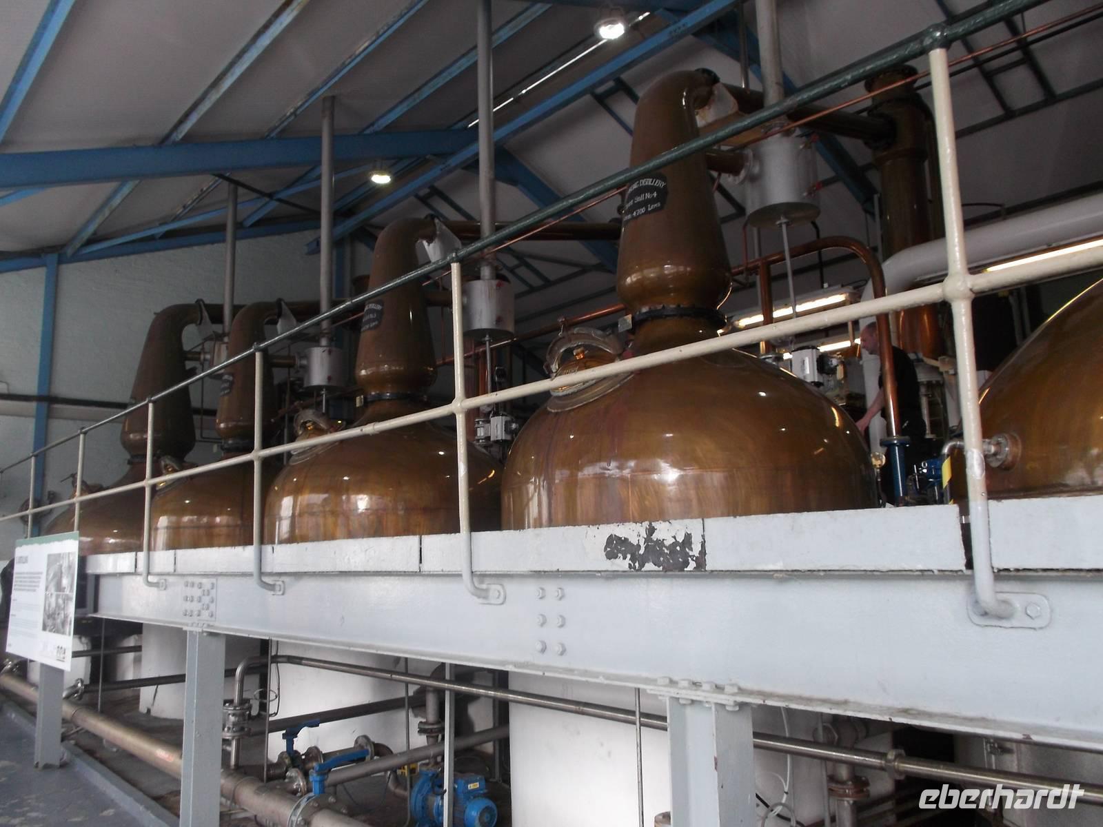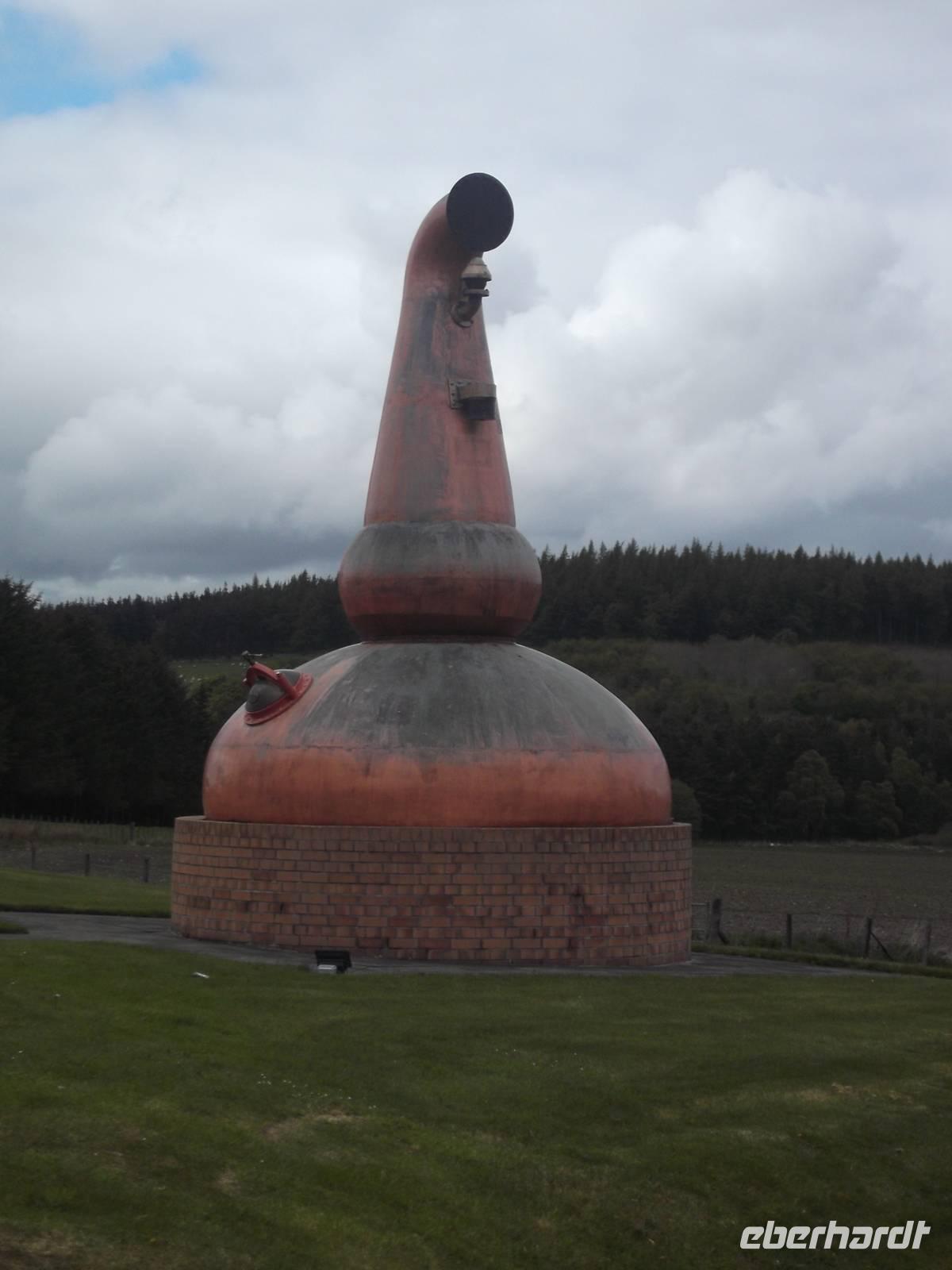 Von hier ging es zur Brennerei von Glenlivet. 1824 gegründet ist sie zwar eigentlich nicht die älteste Brennerei in Schottland, aber die erste des Landes, die legal, d.h. mit königlicher Lizenz Whisky herstellte. Bis dahin wurde Whisky meist schwarz gebrannt und man sagt, dass der Gründer George Smith sich als Gesetzestreuer so unbeliebt machte, dass er meist mit einer geladenen Pistole herumlief ... Fast ungebrochen und immer noch nach alter Methode ist die Brenntradition hier über die wir bei einer Führung mit anschließender Verkostung aufgeklärt wurden. Die Herstellung von „uisghe beatha" („Lebenswasser") beginnt mit dem Malzen, dem Ankeimen von Gerste, um im Getreide enthaltenen Zucker und Stärke freizusetzen. Nach Stoppen des Vorganges - das mit starkem Erhitzen oder Räuchern über Torfrauch vor sich geht - wird die Gerste gemahlen und danach der im Schrot freigesetzte Zucker durch heißes Wasser ausgespült. Das Zuckerwasser wird abgekühlt und mit Hefe versetzt - es setzt eine mehrtägige Gärung ein, die eine Art Gerstenbier erzeugt. Das wird später in einer Brennblase über den Siedepunkt von Alkohol aber unter dem von Wasser erhitzt, wobei der Alkohol verdampft und danach wieder in einer vorbereiteten kupfernen wassergekühlten Destillier-Schlange kondensiert. Nach einer zweiten Destillation erhält man eine klare reine Flüssigkeit mit bis zu 70 % Alkohol. Die wird in gebrauchte Bourbon- oder Sherryfässer abgefüllt und muss zunächst mindestens drei Jahre in Schottland im Fass lagern. Erst dann darf sich der Whisky „Scotch" nennen. Durch die Form der Destillierkolben und die Art und Länge der Lagerung in bisher für Sherry oder Bourbon verwendeten Eichenfässern erhält letztlich jeder Whisky seinen unverkennbaren Geschmack eines „Single Malt".