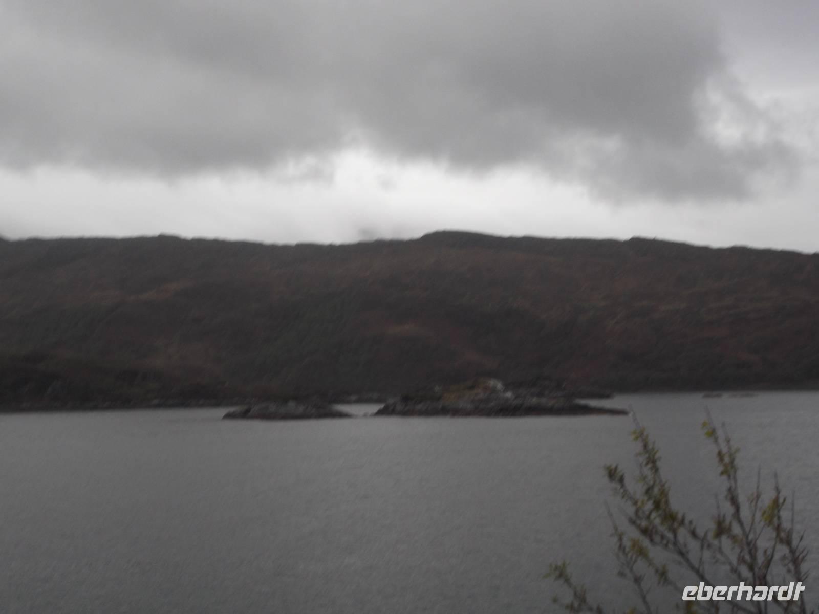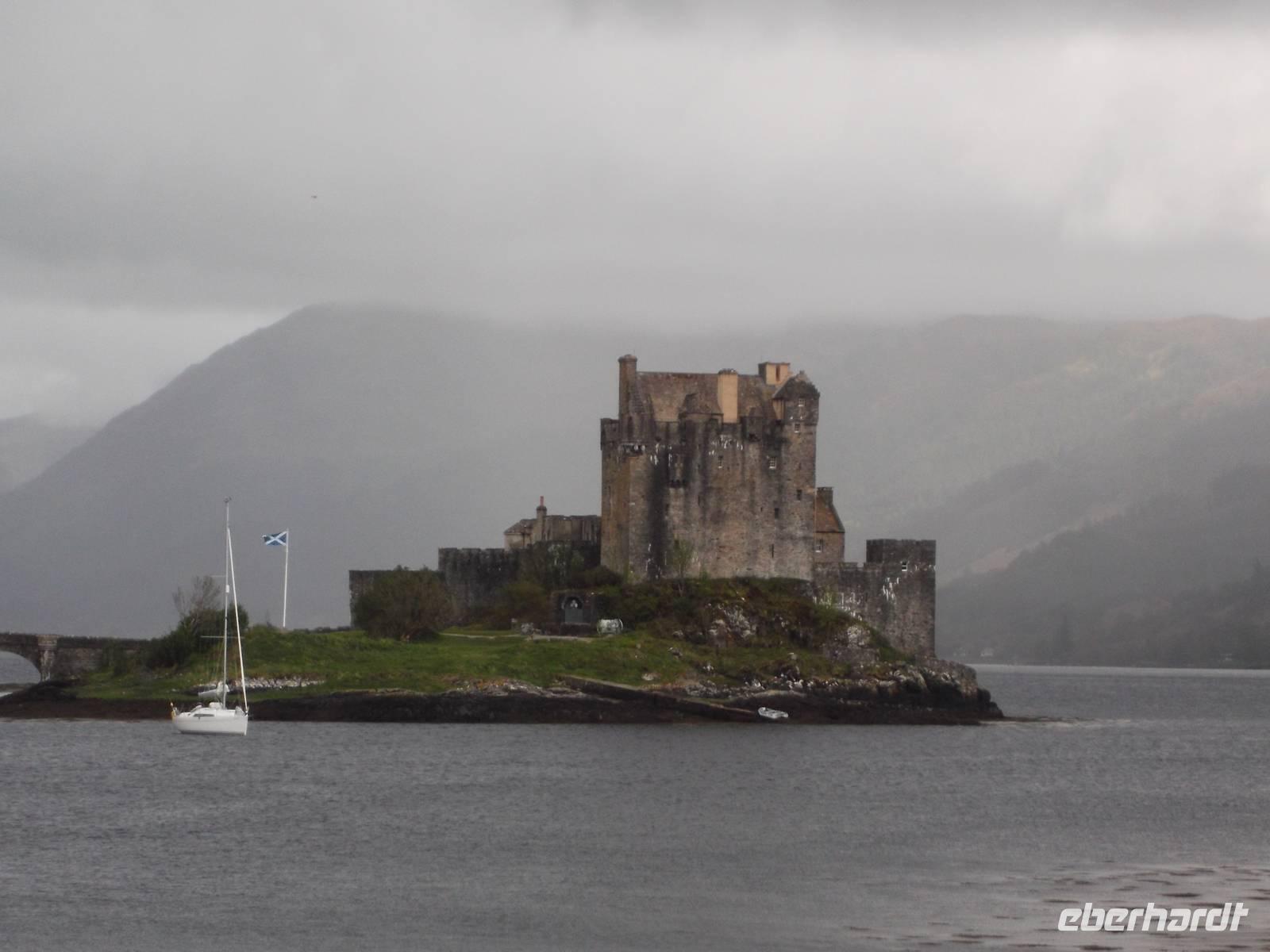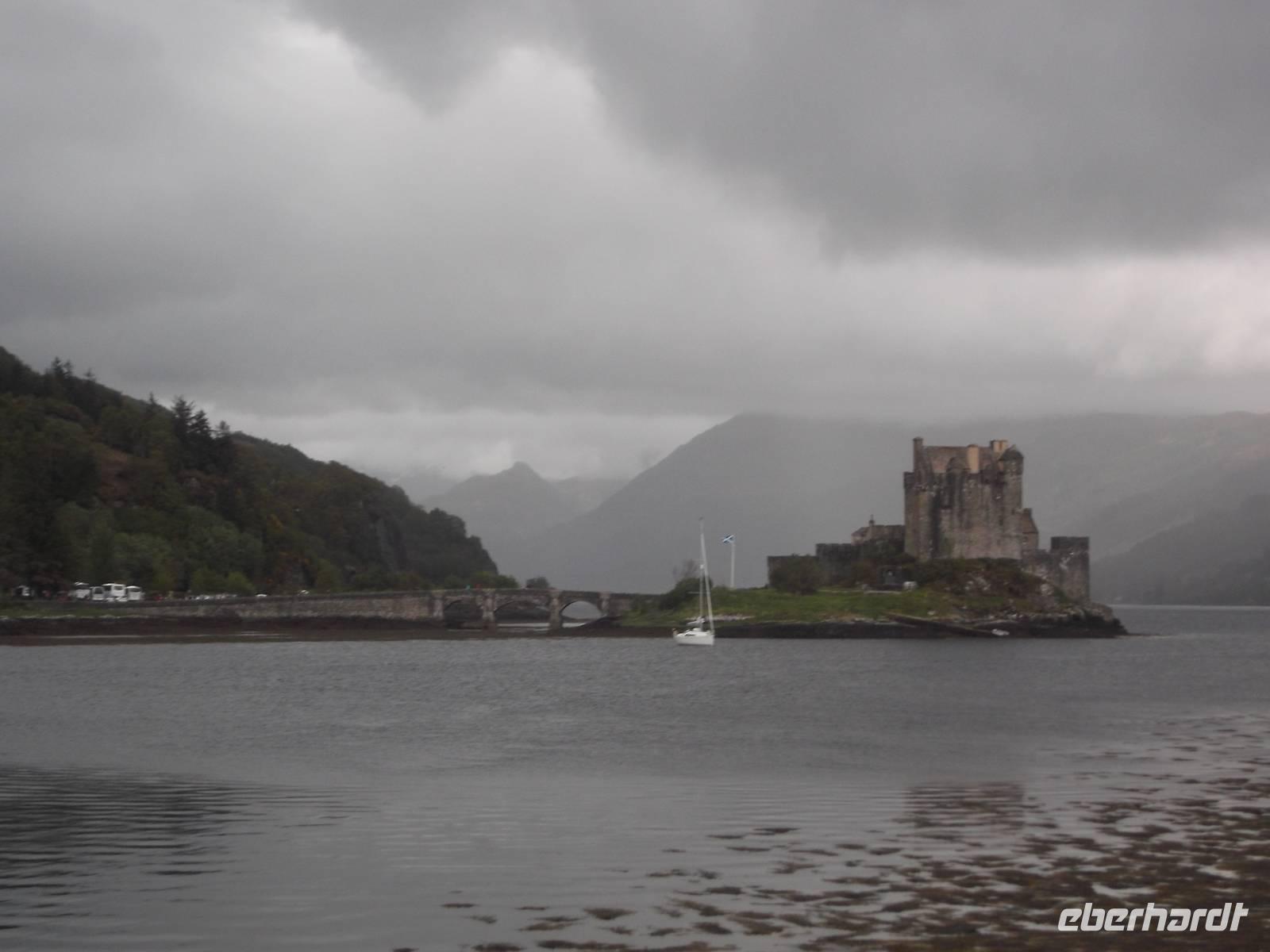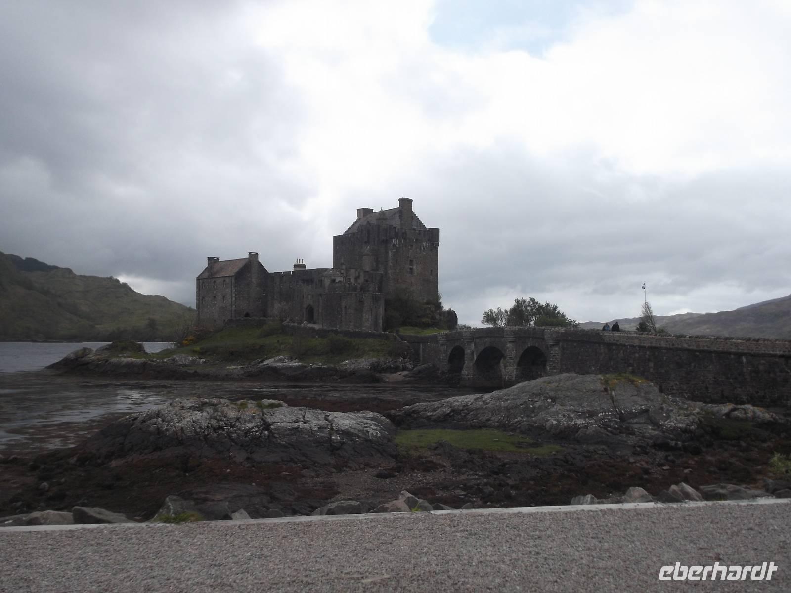 Die landschaftliche Schönheit, trotz rauhen Wetters nicht zu übersehen, findet ihre architektonische Krönung in der „typischen" schottischen Burganlage des Eilean Donan Castle. Mit Sicherheit eine der malerischsten Burgen Schottlands, diente sie sehr häufig als Filmkulisse: hier wurden u.a. „Highlander" (Hauptrolle Christopher Lambert) gedreht, sie tauchte in Mel Gibsons „Braveheart" auf und in der James-Bond-Verfilmung „Die Welt ist nicht genug" diente sie als schottisches Hauptquartier des MI 6. Erst im 20 Jh. wurde die bis dahin nur als Ruine bekannte Burg restauriert, strahlt aber die klassische Romantik schottischer Clansitze aus. Bis heute ist sie noch im Familienbesitz des Clans der McRaes. Bei einer Führung sahen wir die Innenräume samt Bankett- und Zeremoniensaal.