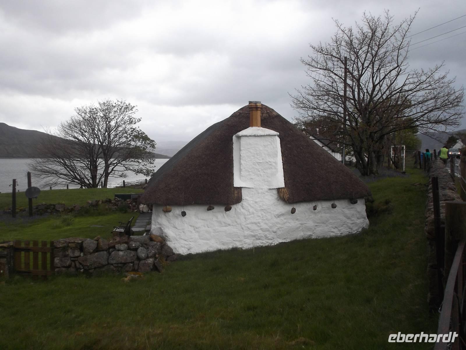 Nach kurzem Stopp in Broadford und Fahrt durch die schöne, wenn auch verregnete Landschaft erreichten wir nach einem Fotostopp an einem typischen, sehr gut restaurierten Cottage die berühmte Talisker- Destille. Sie gilt als eine klassische Brennerei, in der ursprünglich noch dreimal destilliert und die Brennblasen mit Kohle beheizt wurden. In neuerer Zeit auf das übliche zweimal Destillieren und Dampfbefeuerung umgestellt, erzeugt die Destille einen seit fast zweihundert Jahren für ihren torfigen Geschmack bekannten Single Malt. Das über Torfrauch behandelte Malz erhält sie von der „Schwesterbrennerei" Glen Ord, die wir gestern besucht hatten. Wie diese gehört auch Talisker zum weltweit größten Spirituosenkonzern Diageo, der allein in Schottland 27 Whiskydestillen betreibt. Bei der Verkostung genossen wir erstmals wirklich torfigen Whisky, wobei wir erfuhren, dass neben der Torfräucherung des Malzes auch die Verwendung von über Torf fließendem Wasser beim Maischen und Destillieren zum Geschmack beiträgt.