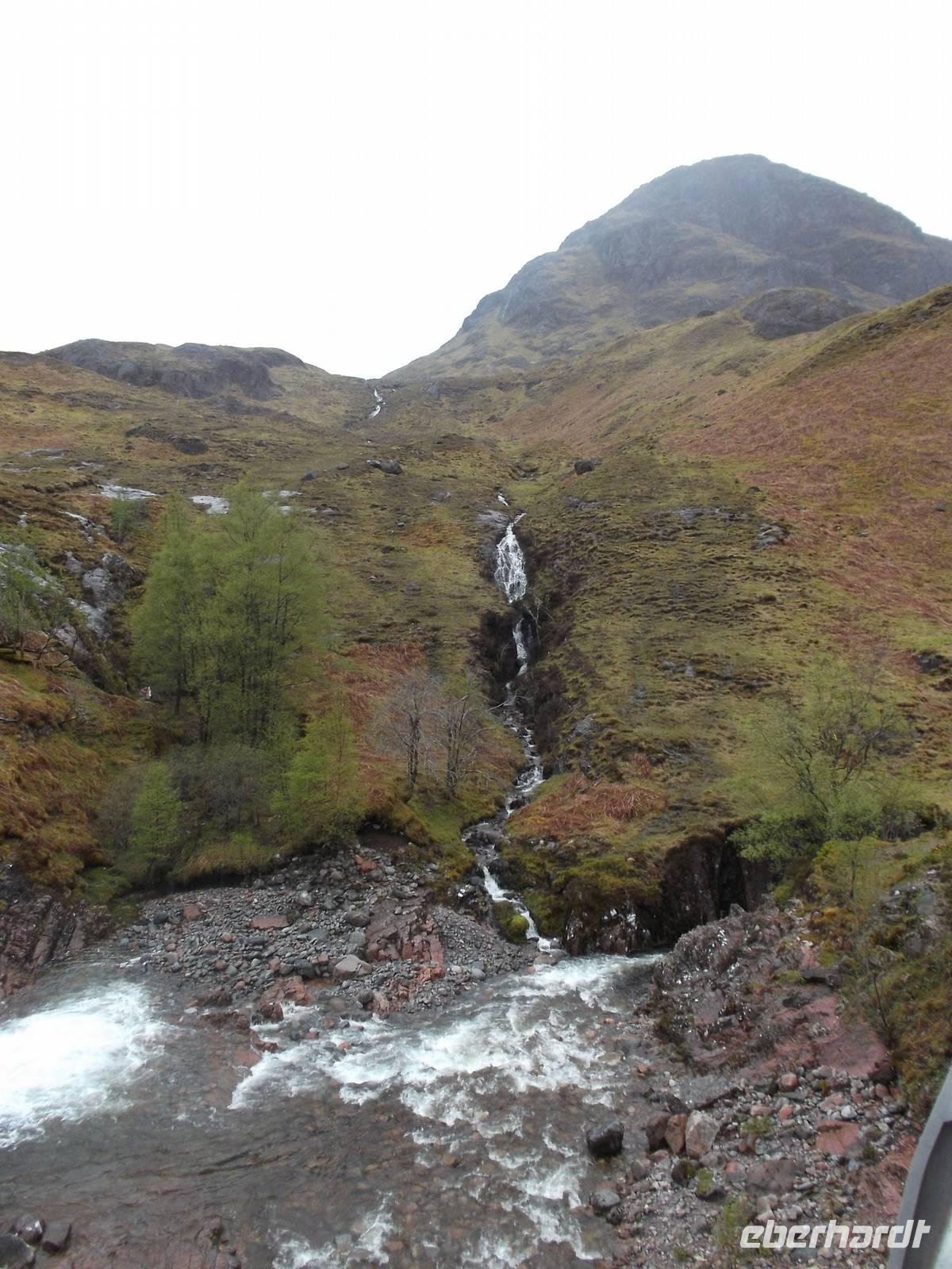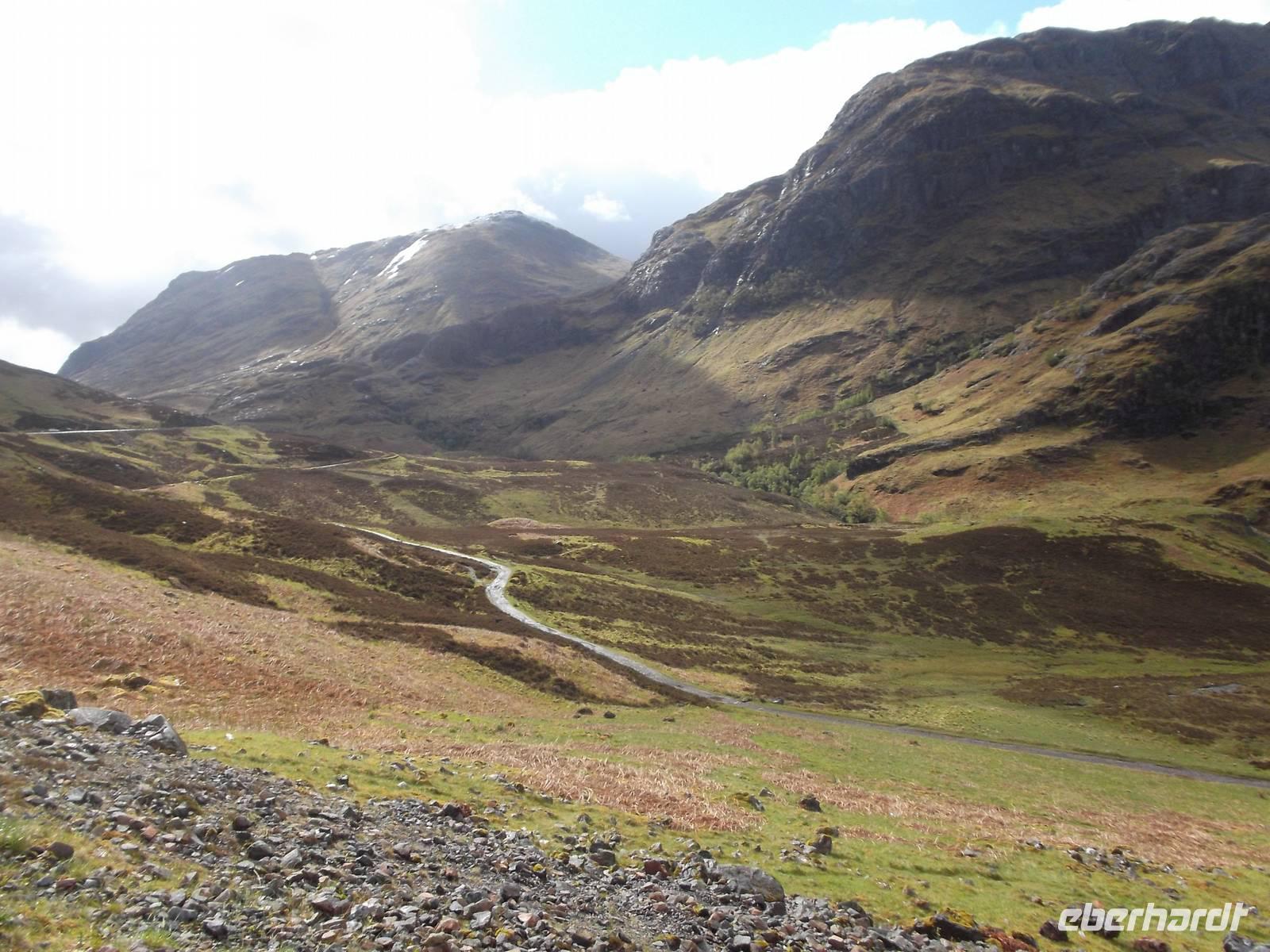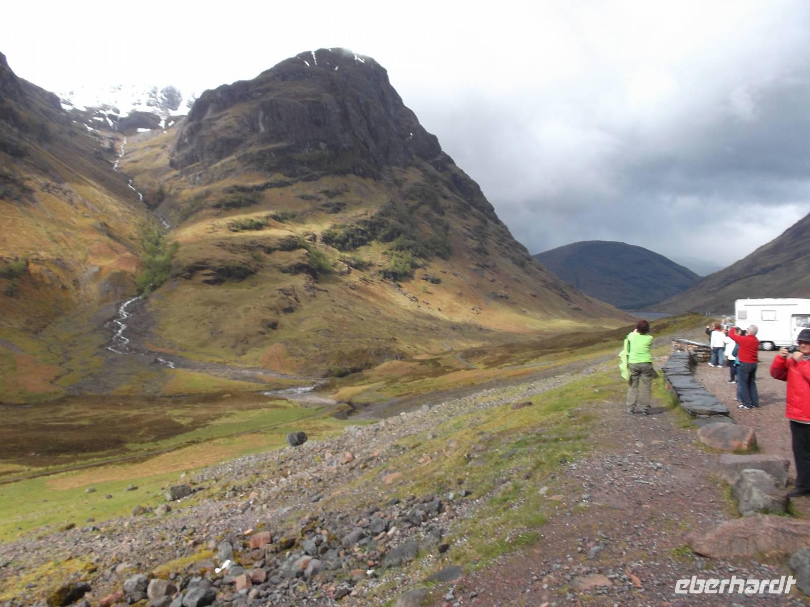 Weniger verregnet als gestern war das Wetter heute zumindest „durchwachsen", aber mit vielen schönen sonnigen Momenten. Deshalb konnten wir auch - die vorhandene Zeit bis zur nächsten zeitlich festgelegten Besichtigung nutzend, einen Abstecher nach der Eberhardt „Richtig Reisen!" Philosophie einbauen: wir machten einen Umweg zum Sammeln voin echten Highland-Eindrücken im Tal von Glencoe. Das Wetter war mit uns blauer Himmel war zu sehen und die gewaltigen Berge, oft noch in den ursprünglichen Formen der Vulkankegel, die sie einst waren, konnte man entweder ganz oder zumindest „fast ganz" bedeckt mit Wolken- und Nebelfetzen sehen. Eine herrliche Gegend mit Berggipfeln, gerundeten Trogtälern mit spärlichem Waldbewuchs und Heidekraut, bewachsene Hängen und bachdurchflossenen, leicht sumpfigen Talsohlen, die wir bei einem Fotostopp erlebten und dann auch Gelegenheit hatten, den hübschen Wasserfall am Talende zu fotografieren. Doch Glencoe, eines der schönsten Hochlandtäler Schottlands, steht leider auch für eines der tragischsten Ereignisse aus der schottischen Geschichte. Im Februar 1693 war hier der Schauplatz eines von englischen Truppen im Auftrag des englischen Königs am schottischen McDonald-Clan verübten Massenmordes. Bis heute ist das „Massaker von Glencoe" eines der blutigsten Ereignisse in der Geschichte der beiden Nachbarn und hat lange das Verhältnis der Schotten zu den Engländern belastet. Vielbesungen in verschiedenen Balladen, hörten auch wir das bekannte Lied „the massacre of Glencoe" über die CD-Bordanlage an.