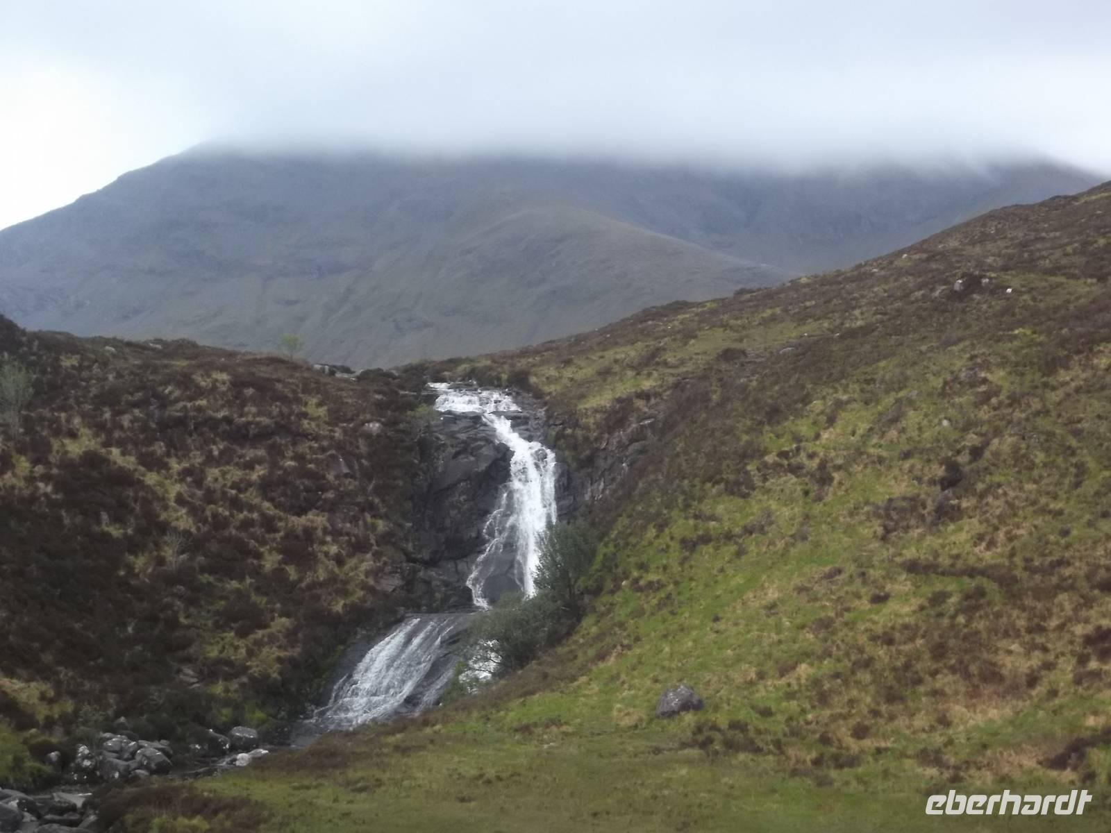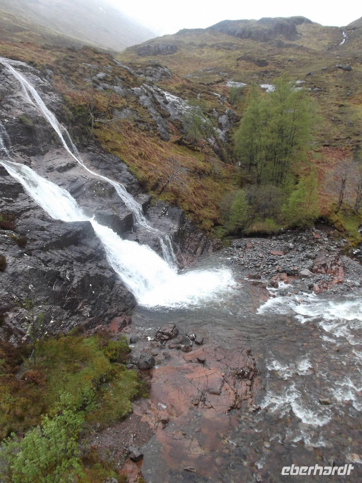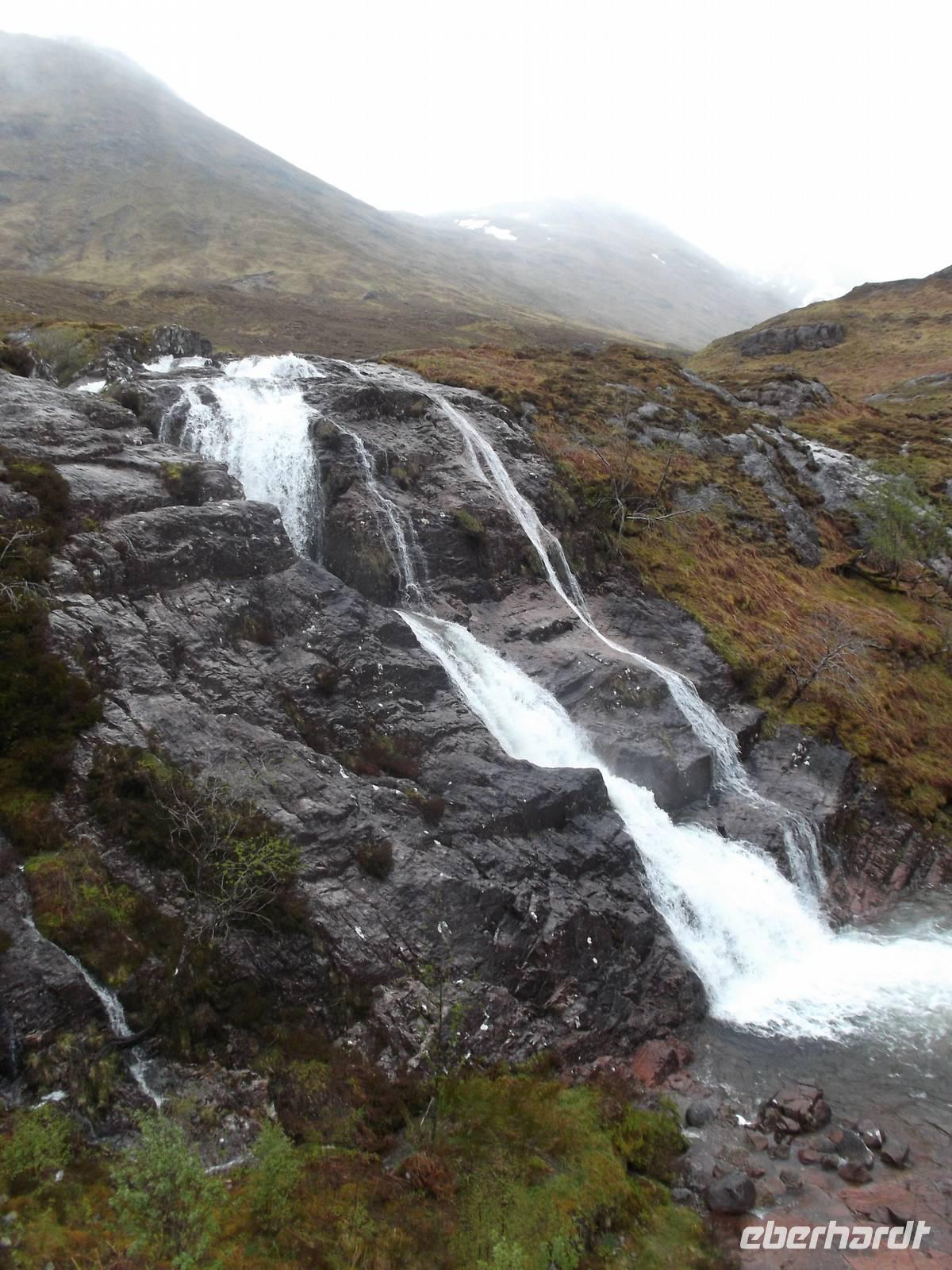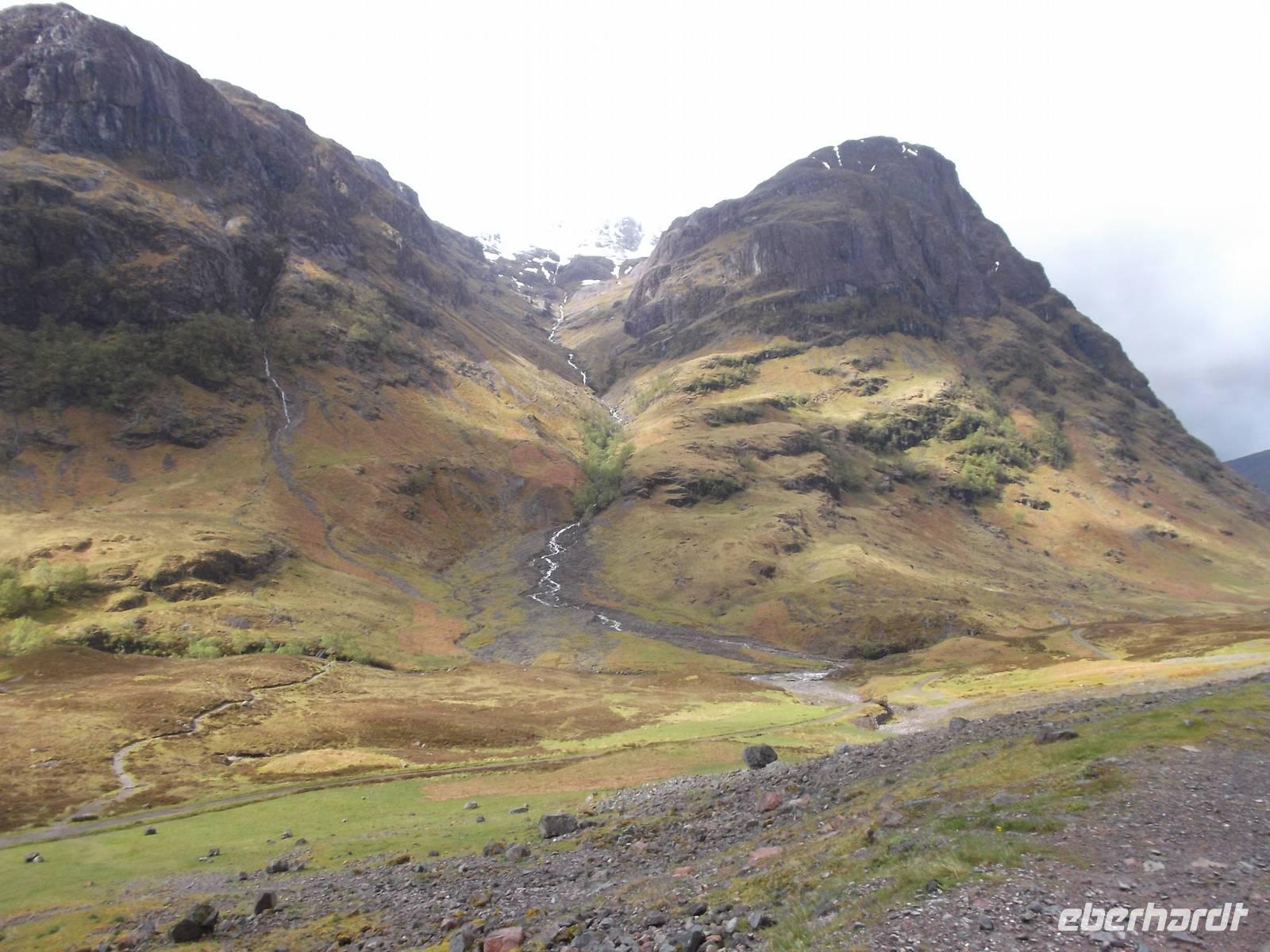 Weniger verregnet als gestern war das Wetter heute zumindest „durchwachsen", aber mit vielen schönen sonnigen Momenten. Deshalb konnten wir auch - die vorhandene Zeit bis zur nächsten zeitlich festgelegten Besichtigung nutzend, einen Abstecher nach der Eberhardt „Richtig Reisen!" Philosophie einbauen: wir machten einen Umweg zum Sammeln voin echten Highland-Eindrücken im Tal von Glencoe. Das Wetter war mit uns blauer Himmel war zu sehen und die gewaltigen Berge, oft noch in den ursprünglichen Formen der Vulkankegel, die sie einst waren, konnte man entweder ganz oder zumindest „fast ganz" bedeckt mit Wolken- und Nebelfetzen sehen. Eine herrliche Gegend mit Berggipfeln, gerundeten Trogtälern mit spärlichem Waldbewuchs und Heidekraut, bewachsene Hängen und bachdurchflossenen, leicht sumpfigen Talsohlen, die wir bei einem Fotostopp erlebten und dann auch Gelegenheit hatten, den hübschen Wasserfall am Talende zu fotografieren. Doch Glencoe, eines der schönsten Hochlandtäler Schottlands, steht leider auch für eines der tragischsten Ereignisse aus der schottischen Geschichte. Im Februar 1693 war hier der Schauplatz eines von englischen Truppen im Auftrag des englischen Königs am schottischen McDonald-Clan verübten Massenmordes. Bis heute ist das „Massaker von Glencoe" eines der blutigsten Ereignisse in der Geschichte der beiden Nachbarn und hat lange das Verhältnis der Schotten zu den Engländern belastet. Vielbesungen in verschiedenen Balladen, hörten auch wir das bekannte Lied „the massacre of Glencoe" über die CD-Bordanlage an.